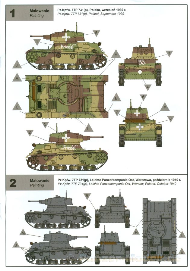 Das Original Der 7TP war ein leichter Panzer der polnischen Armee zu Beginn des 2. Weltkrieges. Er basierte auf dem britischen Vickers 6-ton (Vickers Mark E) und sieht ihm in vielen Bereichen recht ähnlich. Das Hauptunterscheidungsmerkmal ist der stark erhöhte Motorraum, um genügend Platz für den, den Otto-Motor des Vickers ersetzenden, Dieselmotor zu haben. Es gab ihn mit 2 MG-Türmen (Bezeichnung: 7TPdw) oder einem Turm (Bezeichnung: 7TPjw) mit 37mm Kanone. Sein 110 PS (81 kW) Motor ermöglichte ihm Geschwindigkeiten bis zu 32 km/h. Die 3-Mann Besatzung bestand aus dem Kommandanten, Richt-/Ladeschütze und Fahrer. 1939 wurden 132 7TPjw in der Verteidigung Polens eingesetzt. Viele gingen durch Beschuss oder technische Defekte verloren. Die deutsche Wehrmacht eroberte etliche und setzte sie unter der Bezeichnung PzKpfw 7TP 731(p) 1940 in Norwegen und Frankreich und zu Polizeizwecken in Polen ein.