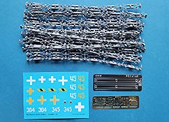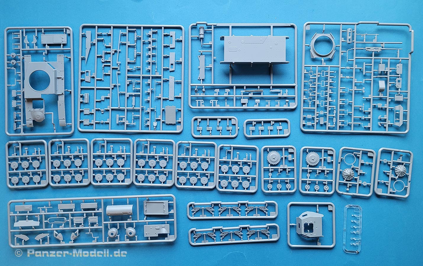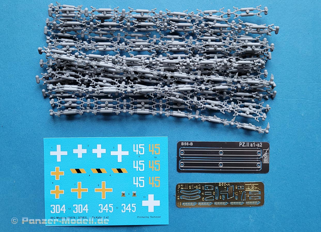 Im Karton finden wir 20 graue Spritzlinge, einen transparenten Spritzling, 20 Reihen Kettenspritzlinge, zwei PE Platinen und einen Decalbogen.