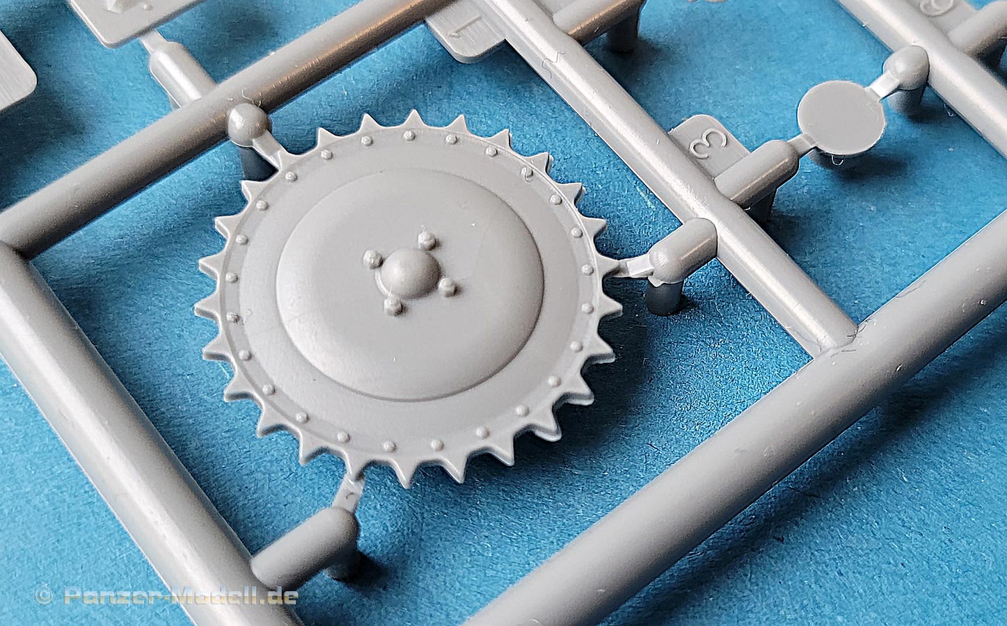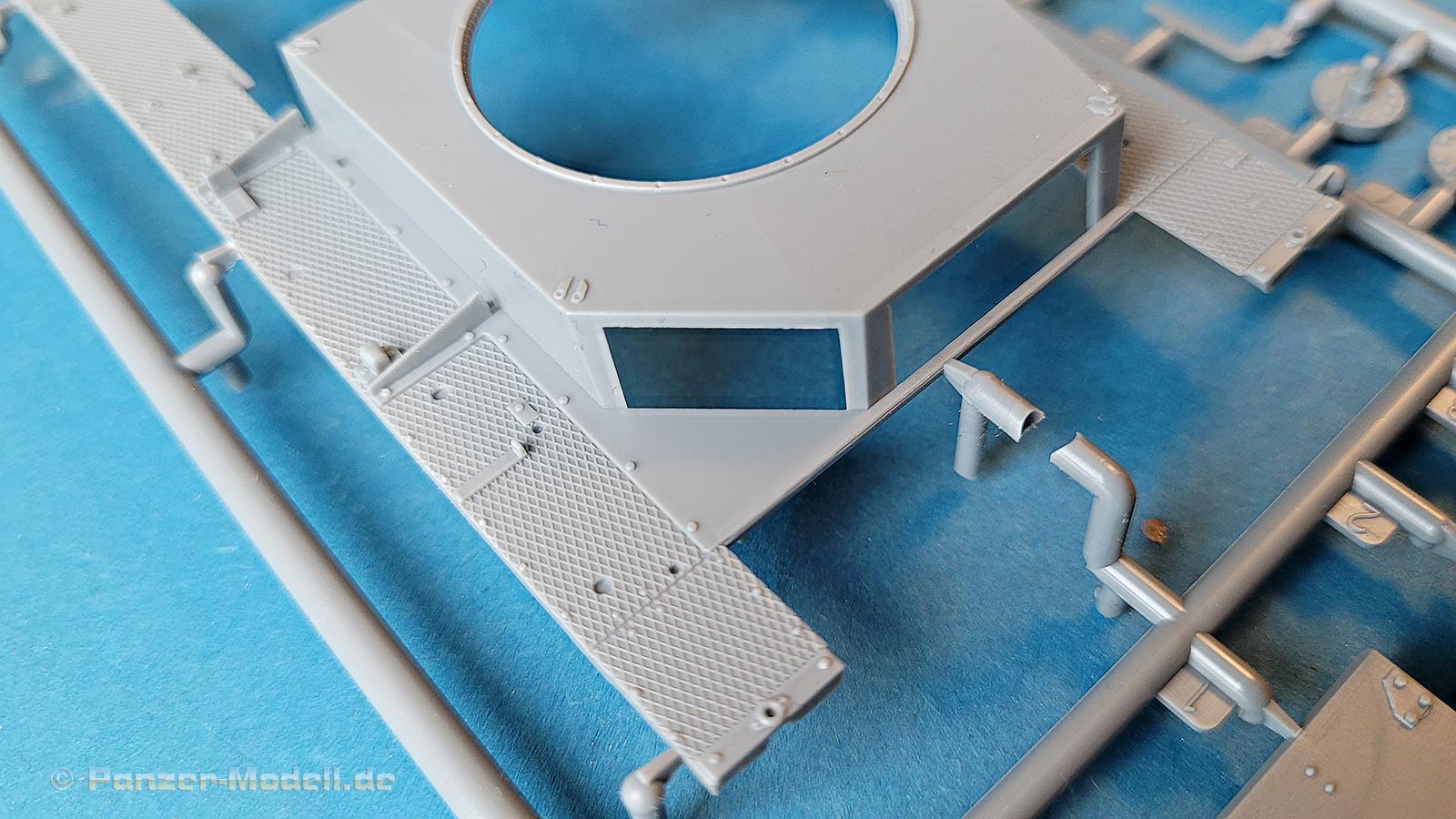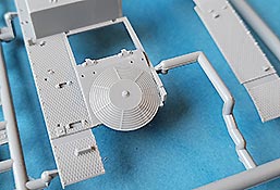 Die Kettenbleche sind ebenfalls direkt mit an die Oberwanne mit angespritzt, was den Bau erleichtert und die Detaillierung mit dem Rautenriffelblechmuster ist wirklich sehr schön und sauber dargestellt. Für alle aufzubringenden Details wie Werkzeug oder auch die Lagerung der Antenne sind entsprechende Markierungen und Aussparungen im Riffelmuster bereits angebracht.