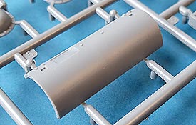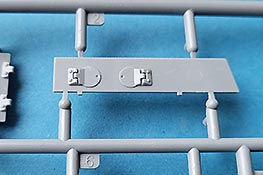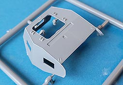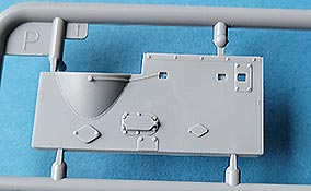 Die Unterwanne ist im Grund einteilig gespritzt, was den Zusammenbau erleichtert. Front und Heckwand werden separat eingesetzt und man hat hier die Auswahl zwischen zwei verschiedenen Heckwänden in früher oder später Auslegung. Die Darstellung er Wannenteile, gerade an der gerundeten Frontplatte und der Heckwand mit der gerundeten Ausbuchtung für den Motorlüfter sind sehr schön ausgeführt und erfreuen mit Nieten und Schweißnahtdetails.