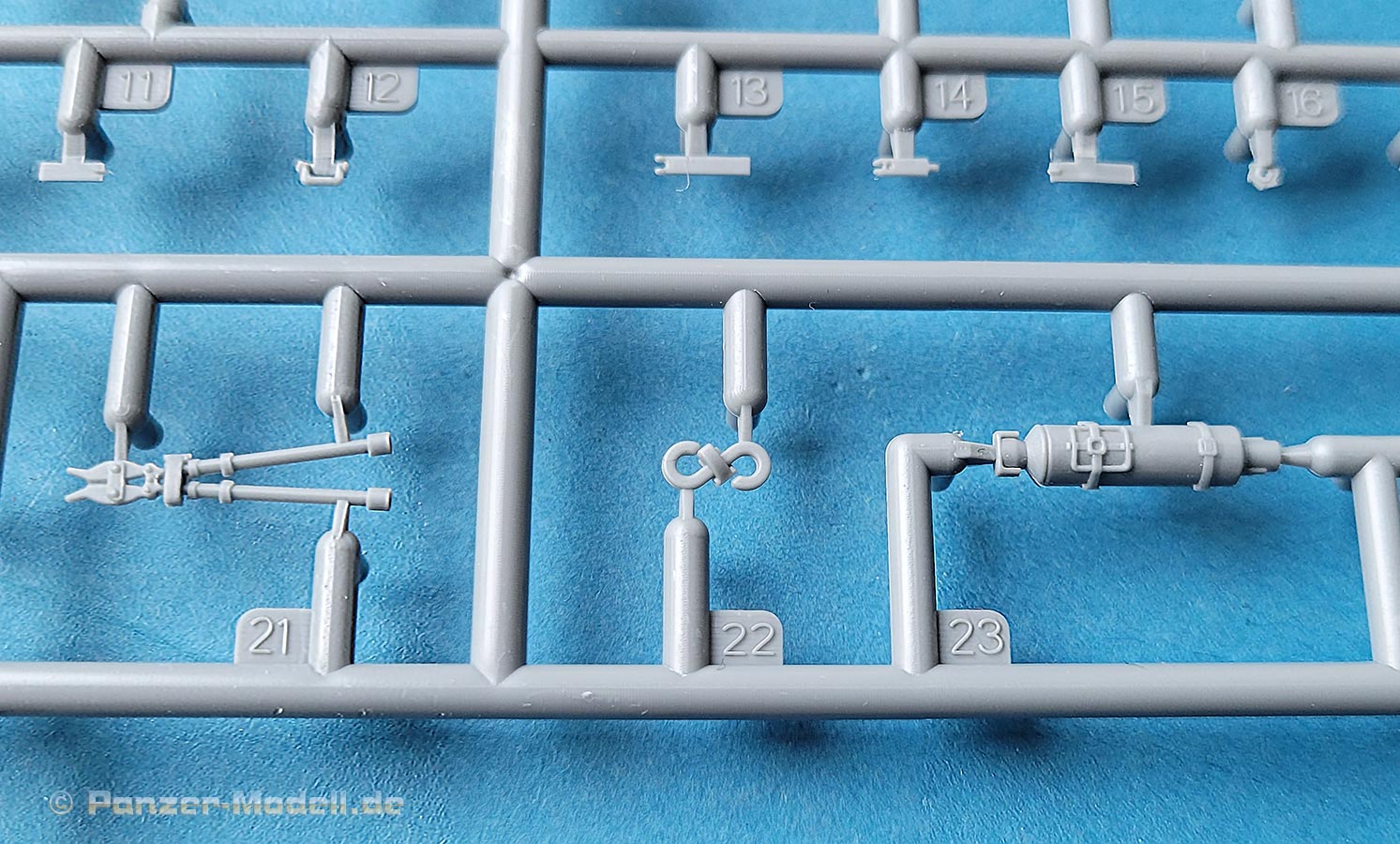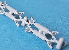 Und wo wir gerade bei der Kette sind - die wirklich kleinen und filigranen Glieder sind sehr schön und sauber gespritzt - sie sitzen in Spritzlingsreihen aneinandergespritzt mit je 3 Angüssen pro Glied. Das macht in der Gesamtheit bei insgesamt 214 benötigten Gliedern eine Menge Versäuberungsaufwand, aber wer das ordentlich macht, wird mit feinen Panzer II Ketten belohnt, die sich ineinanderklicken lassen. Und wer dabei etwas sorgsam zu Werke geht, bekommt tatsächlich erstaunlich stabile, bewegliche Ketten.