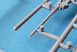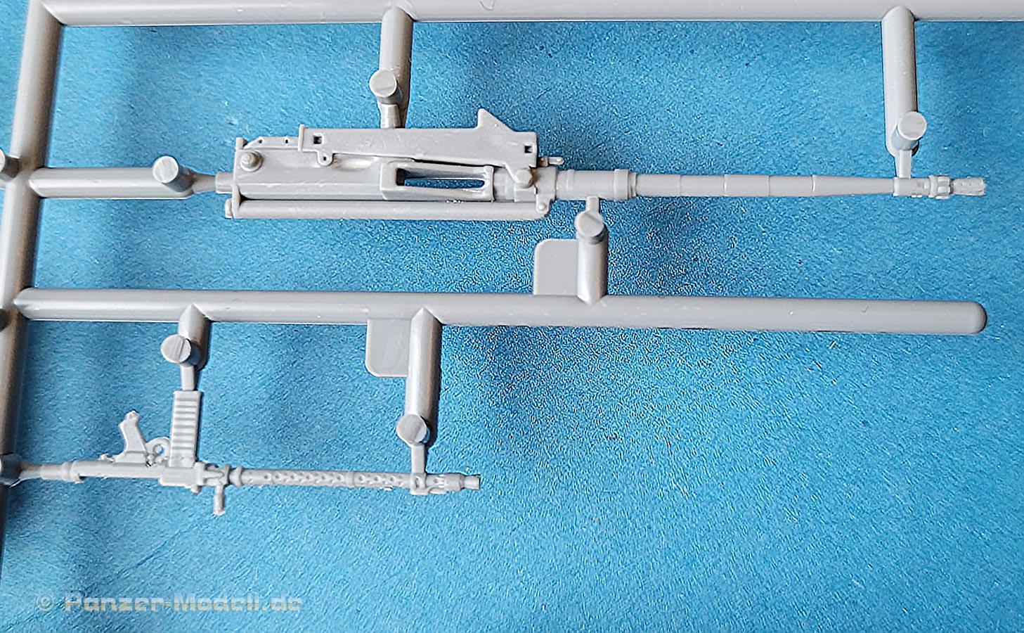 Die 2cm KwK30 wie auch das MG34 sind erstaunlicherweise in einem Stück mit Rohr und Waffenkörper gespritzt und sehen (gerade mit der zylindrischen Mündungsbremse der 2cm) für Spritzguss ganz annehmbar aus. In der limited Edition dieses Bausatzes (35083L) liegen dem Bausatz diese Waffen als gedrehte Rohre mit 3D Druckteilen bei.