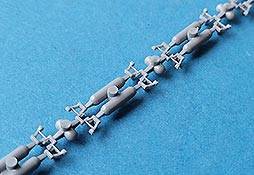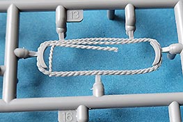 Das Abschleppseil an m Wannenbug ist aus Spritzguss einteilig mit den Halterungen gemacht,w as zum einen den Bau erleichtert, aber andererseits nicht die Möglichkeit bietet dieses wegzulassen und nur die Halterungen zu verbauen. Die Seilkauschen müssen allerdings noch einzeln angefügt werden.