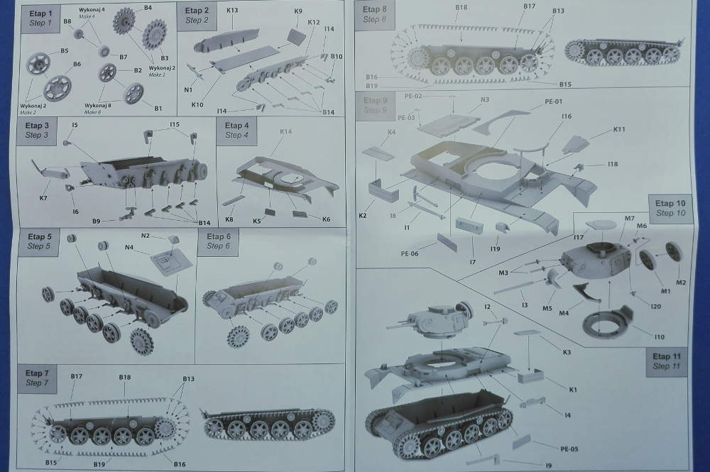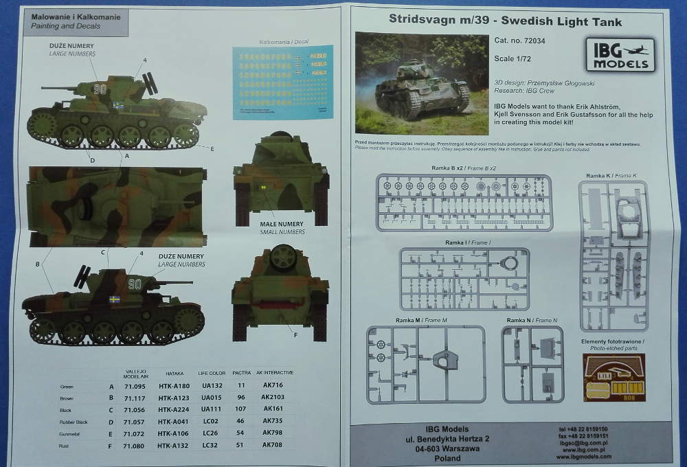 Auch von diesem Modell bin angenehm überrascht. Bislang habe ich diese 1:72 Bausätze immer leicht belächelt. Alles was kleiner ist als 1:35 war für mich nicht wirklich ein Modellbausatz. Doch nun wurde ich eines besseren belehrt. Das Bausatz besticht für mich mit einem hohen Grad der Detaillierung und Filigranität. Jedoch artet diese wirklich feine Darstellung nicht zu einem Bauteil Wahnsinn mit etlichen Klein- und Kleinstteilen für einzelne Baugruppen aus. Man beachte: Dem Bausatz liegt eine Spritzgusskette mit Einzelgliedern und Segmenten bei. IBG Models hat hier genau das richtige Maß gefunden um ein hohes Maß an Detailfülle zu erreichen und die Bauteile dennoch in einer übersichtlichen Anzahl zu halten. Die Bauanleitung führt in 11 Schritten zum fertigen Modell. Gezeigt werden die Baustufen in gelungenen und übersichtlichen CAD Zeichnungen. Die Bemalungsanleitung bietet in einer Fünf-Seiten-Ansicht ein schwedisches Fahrzeug in dunkelgrün mit schwarzen und brauenen Tarnflecken. Hinweise zu Einsatzort und / oder Einsatzzeitraum finden sich jedoch nicht. Die Farbangaben der Anleitung beziehen sich auf die Sortimente von Vallejo Model Air, Hataka, Pactra, Life Color und AK-Interactive. Insgesamt würde ich dieses Modell als durchaus empfehlenswert einstufen. Das Preis-Leistungsverhältnis stimmt absolut und die gelieferte Qualität ist ebenfalls in Ordnung. Die wenigen PE-Teile dürften auch Anfängern keine großen Probleme bereiten.