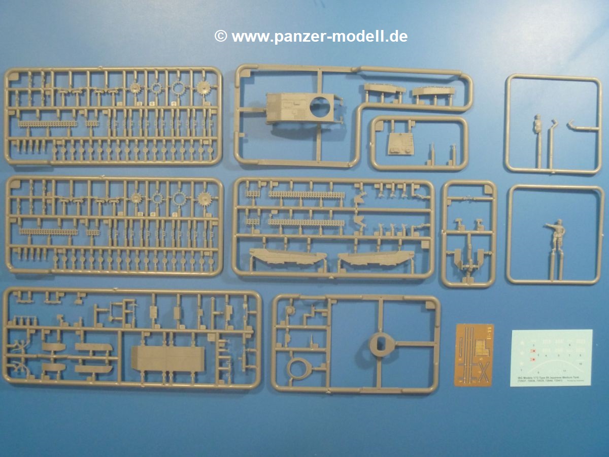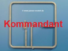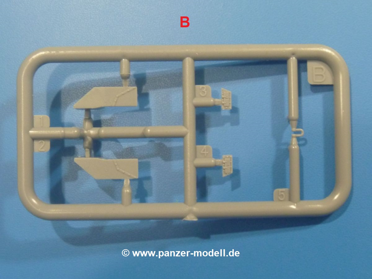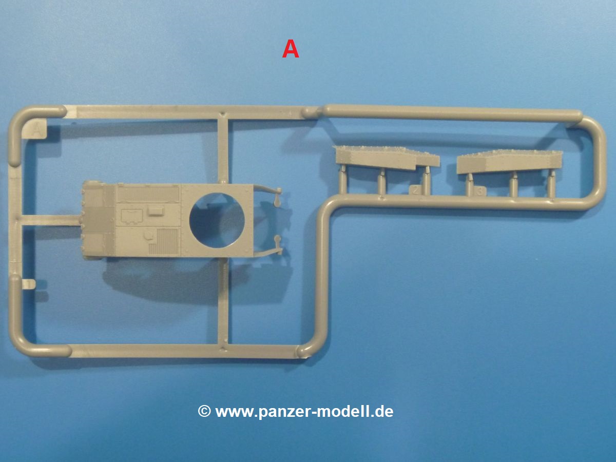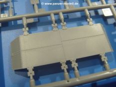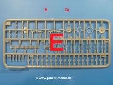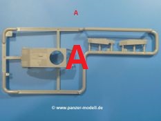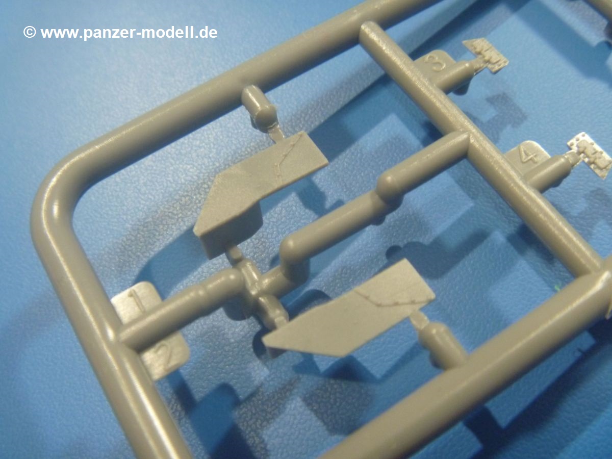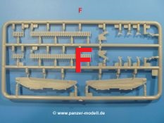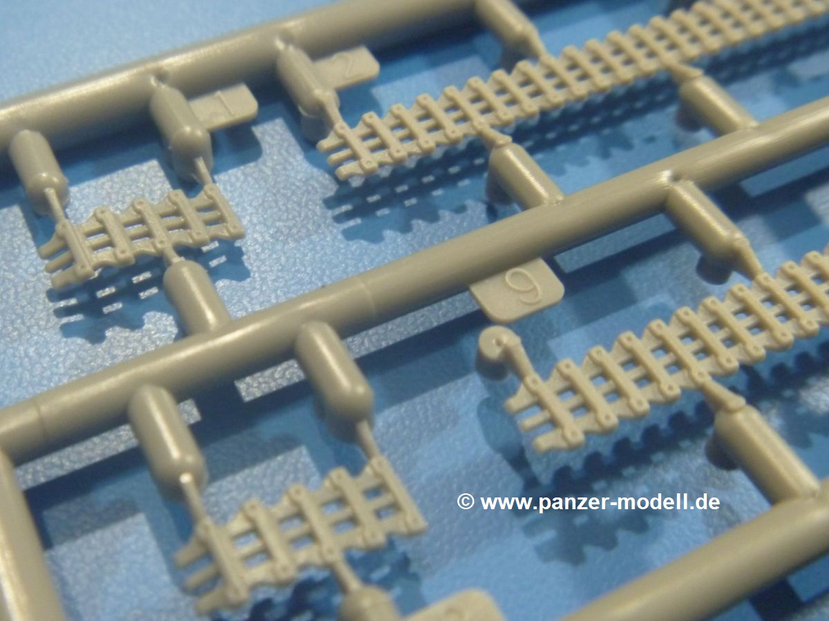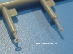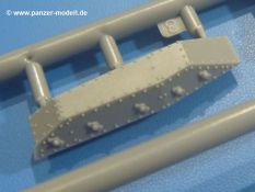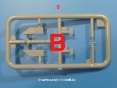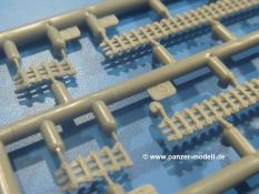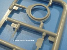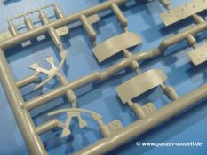 Weitere Teile wie Kettenabdeckungen, Auspuff, Werkzeuge, Fahrscheinwerfer, Heckstaukasten fallen da kaum noch ins Gewicht. Für das Auspuffgitter hat man die Wahl zwischen Plastik- und PE-Teilen. Natürliche sind die PE-Teile wesentlich ansprechender, aber ein Anfänger wird vielleicht über die Plastikgitter froh sein. Der Grabenschwanz setzt sich aus 9 Plastik- und 2 PE-Teilen zusammen.
