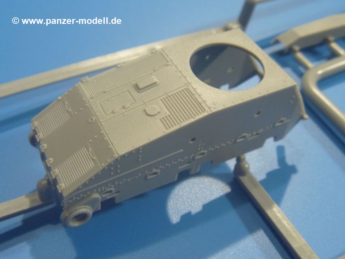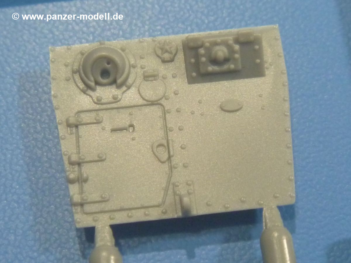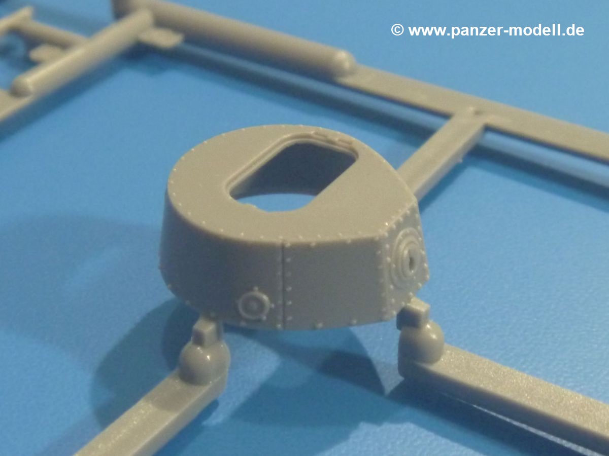 Es gibt nur wenige Teile für den Turm, welches aber keinen negativen Einfluss auf die Detaillierung hat. Nieten, Blechstöße und Scharniere sind schön dargestellt. Die zweigeteilte Kommandantenluke kann geöffnet oder geschlossen gebaut werden. Das Kanonenrohr ist aufgebohrt.