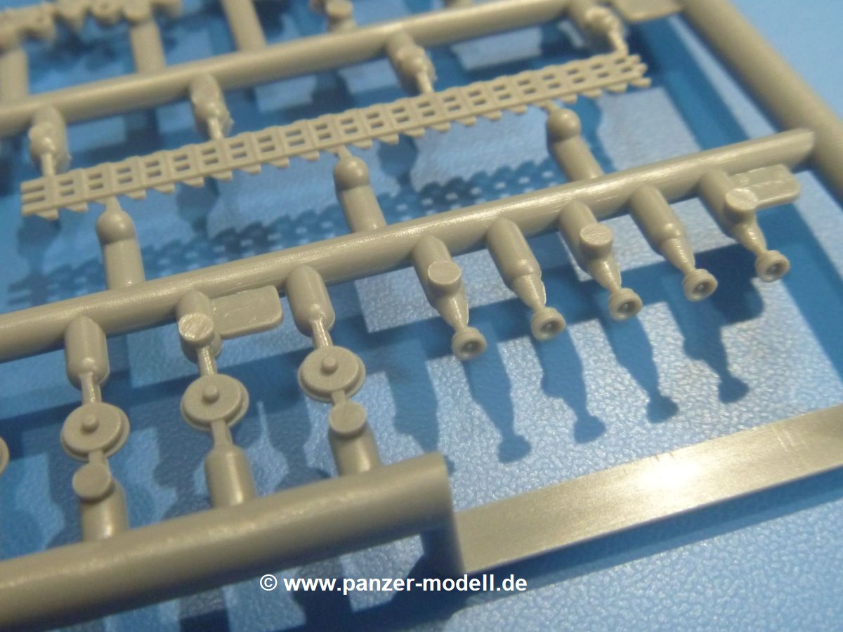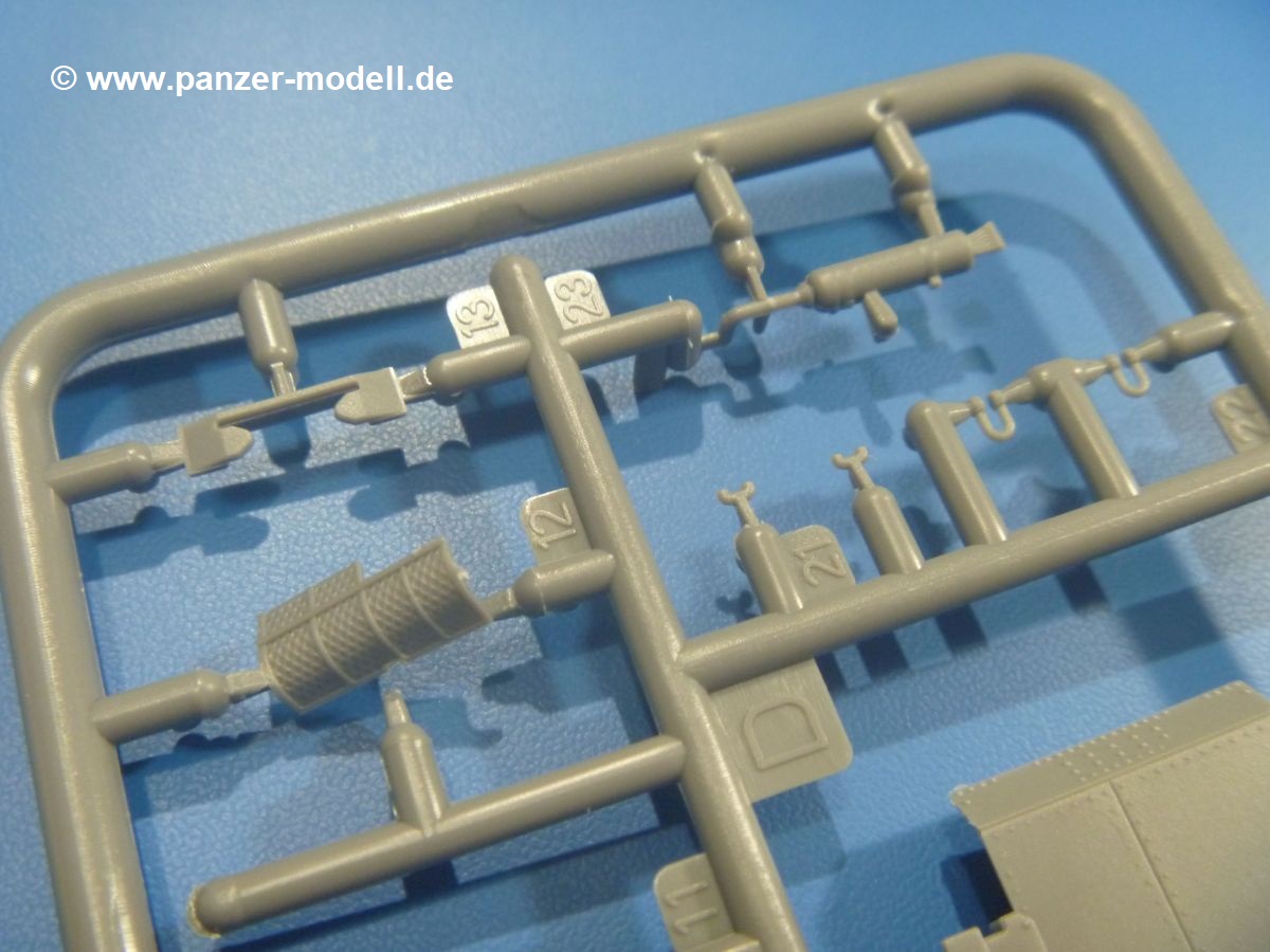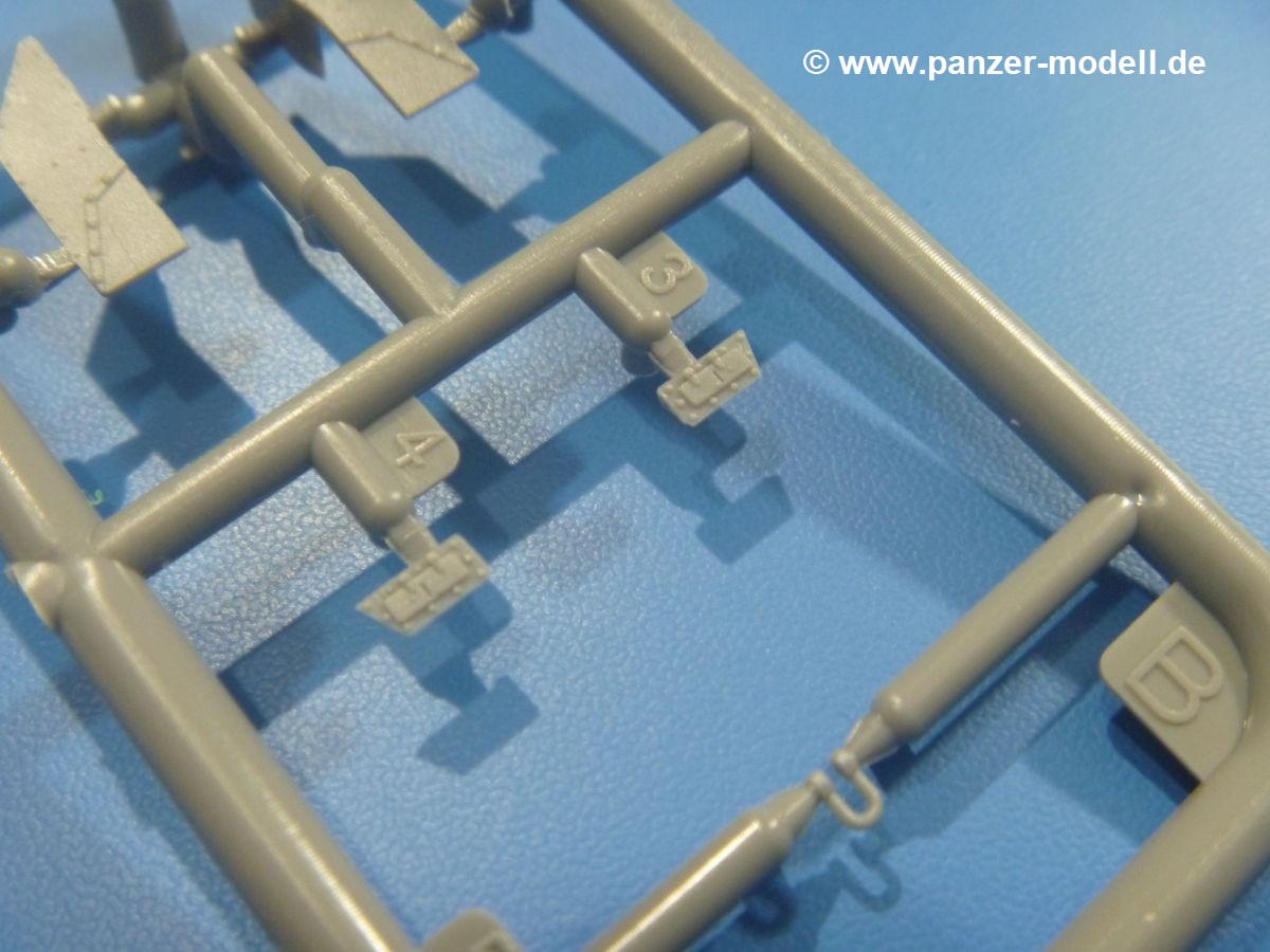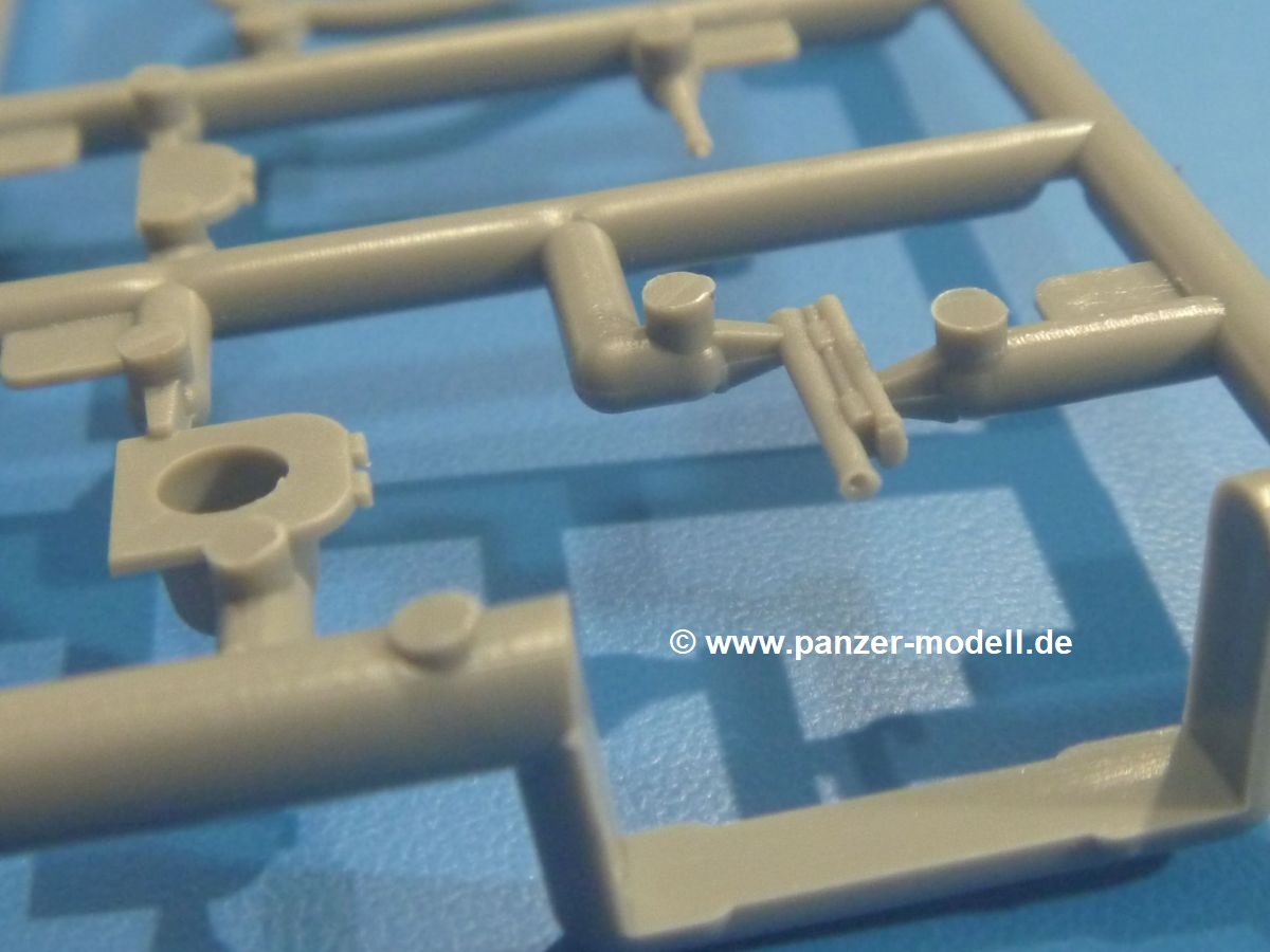 Die Teile aus mittelgrauem Plastik sind sauber ausgespritzt, mit minimalstem Grat und ohne Versatz. Die Auswerfer sind meist auf den Spritzrahmen platziert. Wir entdecken feine Details.