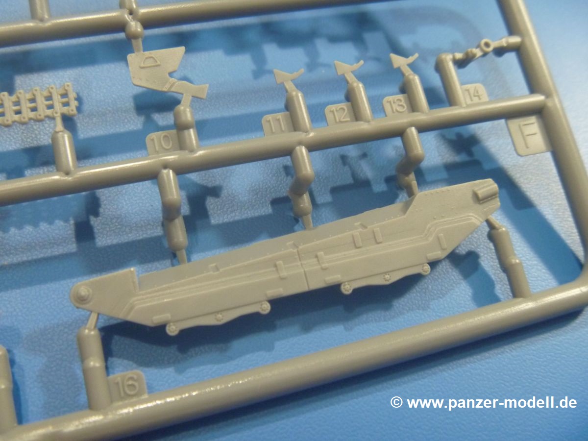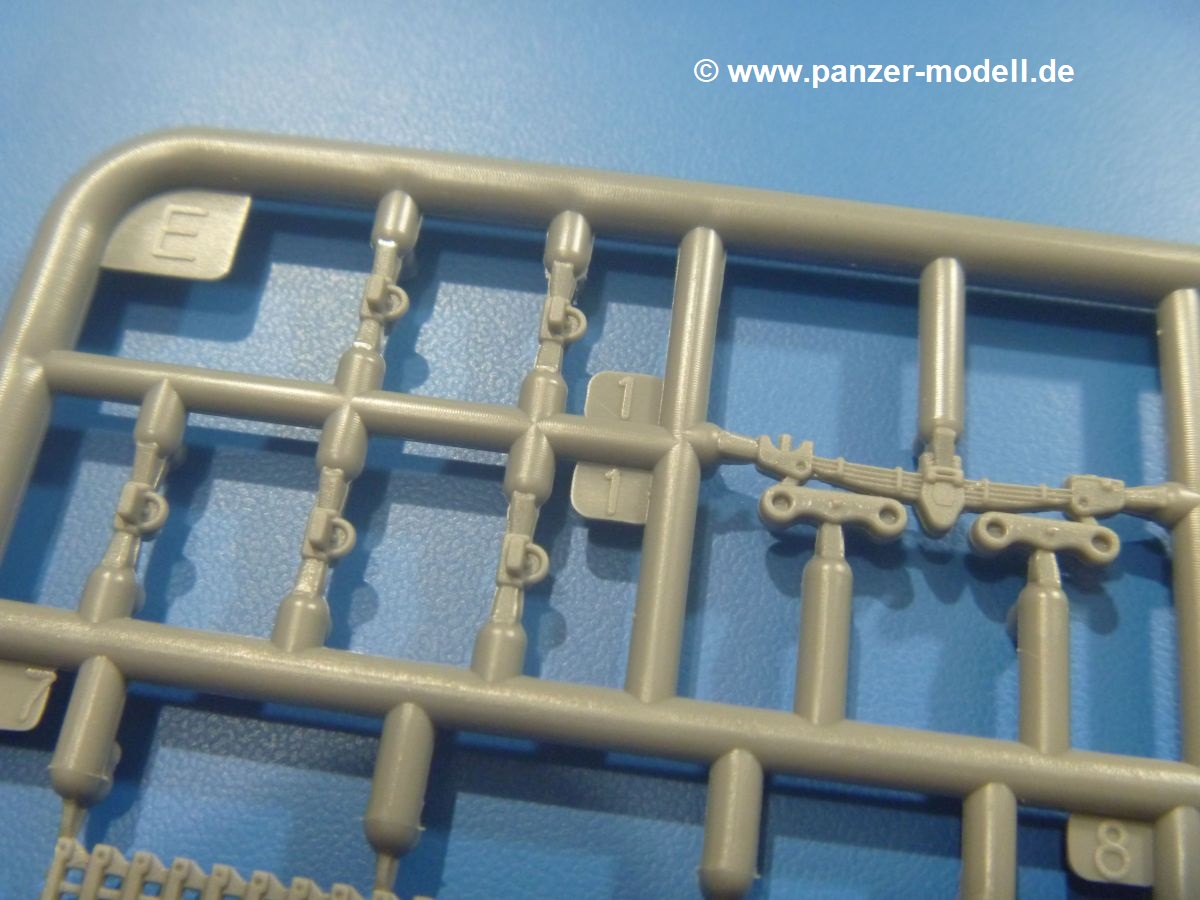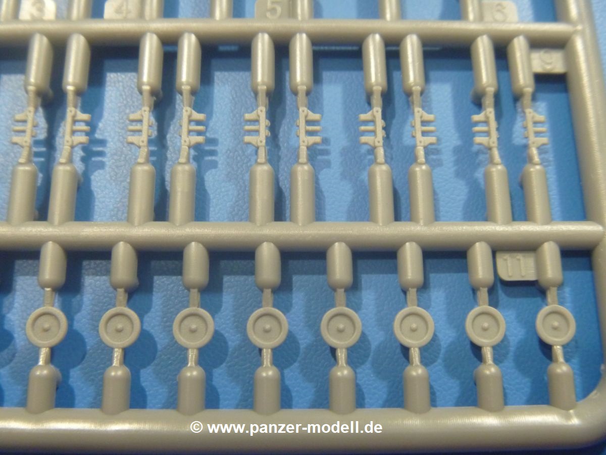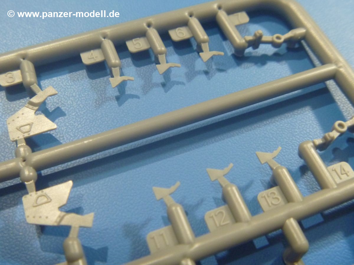 Die Teile aus mittelgrauem Plastik sind sauber ausgespritzt, mit minimalstem Grat und ohne Versatz. Die Auswerfer sind meist auf den Spritzrahmen platziert. Wir entdecken feine Details.