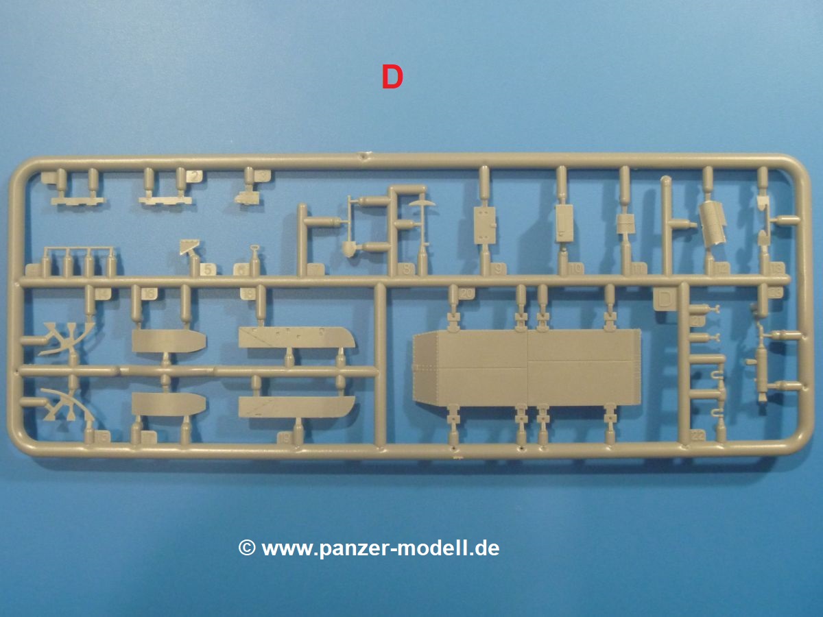 - D (1x): Bodenplatte, Werkzeug, hintere Kettenabdeckungen, Heckstaukasten, Griffe, Grabenschwanz, Auspuff, Auspuffabdeckung
