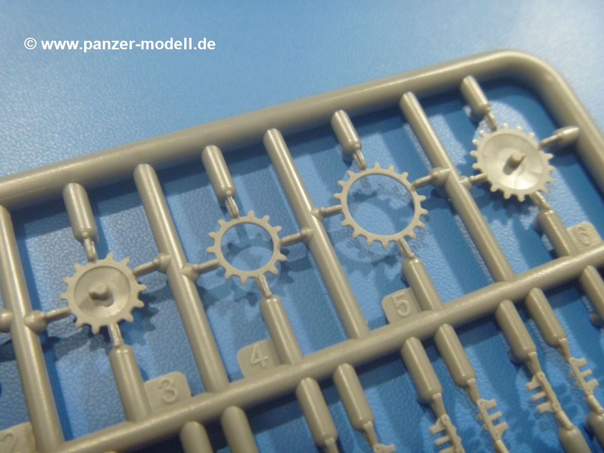 Die Wanne besteht nur aus Oberwanne, Boden- und gerader Bugplatte mit einem kleinen Fahrererker, also anders als beim Bausatz 72037. Das Laufwerk besteht auch hier aus jeder Menge Teile. 4 Rollenwagen, jeder mit 8 Laufrollen, 10 Stützrollenlager mit 10 Stützrollen, 2 Laufwerksabdeckungen mit je 3 Stützrollengegenlagern, 2 Antriebszahnräder, 2 Leitzahnräder mit Lagerung, 2 vordere Laufrollenböcke mit je 2 Laufrollen, 2 PE-Stützrollenstreben, 8 Kettensegmente und 22 winzige Einzelglieder wollen erst einmal zusammengefügt werden.