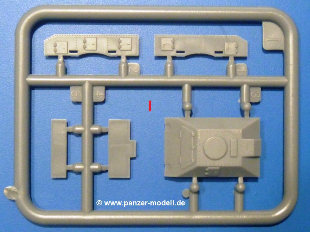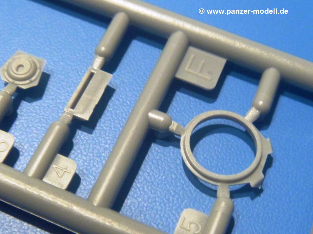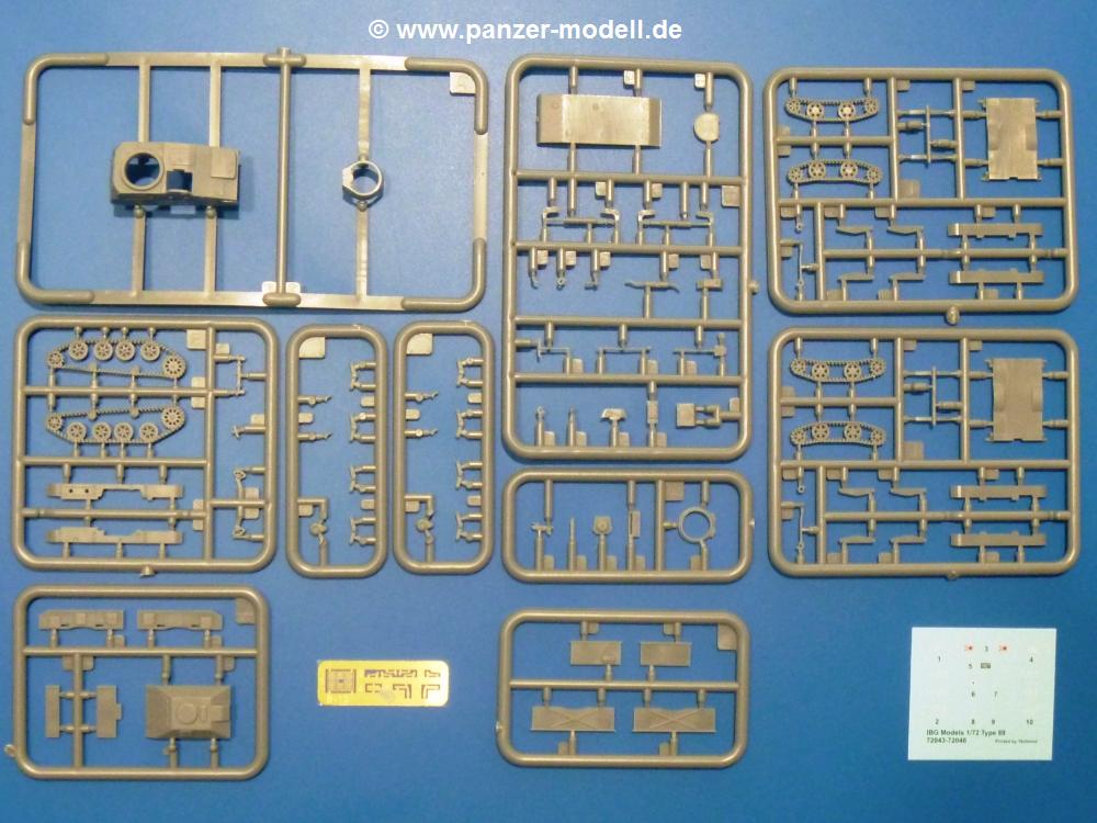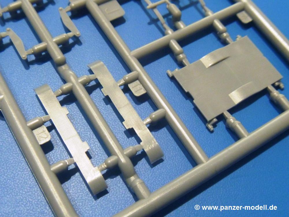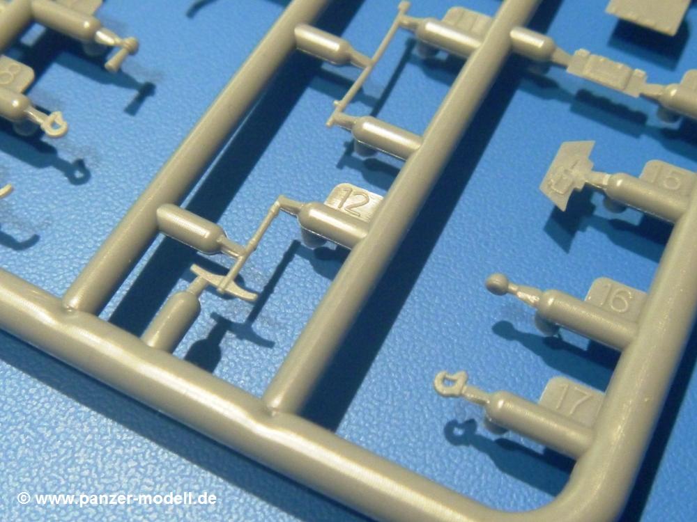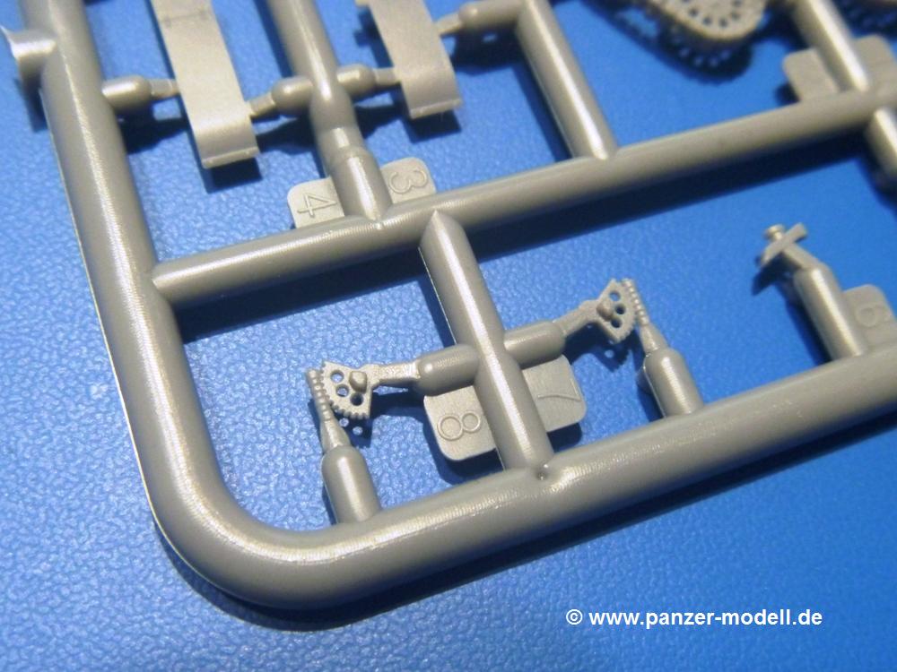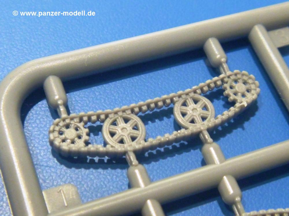 Die Teile aus hellgrauem Plastik sind sauber ausgespritzt, ohne Grat und Versatz. Die Auswerfer sind unsichtbar platziert. Auch die Angüsse sind klein, aber bei manchen Winzlingsteilen bleibt doch ein wenig zu versäubern.Auch wenn Lauf-, Leit-, Antriebs-, Stützrollen und Ketten aus einem Guss sind, tut dies der Detaillierung keinen Abbruch. Man muss nur noch die Federung, Vorgelegeabdeckungen, Kettenspanner, Stützrollenlager an der Wanne anbringen, die Laufrollenwagenbügel an den Rädern montieren und fertig ist das Fahrgestell. Beim Kettenspanner ist das Schneckengewinde ausreichend angedeutet, die Zähne der Stellscheibe gut erkennbar. Die gut geformte Wanne wird mit der Bodenplatte verschlossen und schon kann man an den restlichen Außendetails weiterarbeiten.Bei den Kettenabdeckungen und der Anhängeblattfeder gibt es eine kleine Unstimmigkeit. In der Anleitung werden die Teile mit D1 und D10 bezeichnet, aber es gibt keinen Spritzling D. Die benötigten Teile finden sich am Spritzling E. Linke Kettenabdeckung = E3, rechte Kettenabdeckung = E4 und die Anhängeblattfeder = E5. Die Kettenabdeckungen erhalten Halterungen aus PE Teilen. Auch der Auspufftopf auf der linken Kettenabdeckung bekommt ein feines PE-Gitter, das entsprechend gebogen werden muss. Weitere separat anzubringende Details sind die Hupe, Spitzhacke, Schaufel, Brechstange, Auspufftopfhalter und Scheinwerfer. Der Rückleuchtenhalter am Heck ist gleichzeitig die Aufnahme für das Nummerschild aus PE.Der Turm ist aus 6 Teilen schnell fertig gestellt. Man kann das Turmluk auch offen anbringen, so dass man die Innendetails des MGs sehen kann.Mit den vorhandenen Teilen kann man 2 verschiedene Anhänger bauen - einen offenen Transportanhänger und einen, offensichtlichen, Tankanhänger. Spritzling J mit dem Fahrgestell ist 2x im Bausatz, in der Anleitung nur einmal aufgeführt.Kette, Lauf- und Leitrollen sind wie bei der Tankette in einem Stück ausgeführt. Man setzt also nur die Achse unter die Bodenplatte, verbindet die Laufrollen mit den Bügeln und kann schon das Fahrgestell an der Bodenplatte anbringen, denn die Leitrollenlager sind an der Bodenplatte angegossen. Ans Heck noch die Anhängekupplung, vorn die Zugstange. An der Zugstange ist die Anhängekupplung der Tankette mit angegossen. Das Ganze macht man 2x, dann kann man sich an den Aufbau machen. Für den offenen Transportanhänger braucht man nur noch die 4 Seitenwände an der Bodenplatte anbringen. Beim Tankanhänger sind es 4 Seitenteile und das Oberteil. Dazu kommen noch die Kettenabdeckungen, die der Transportanhänger nicht hat.Die Decals sind wie üblich seidenmatt und ohne Trägerrand gedruckt. Sie reichen für ein Fahrzeug der 2nd Independent Light Armored Car Company, eingesetzt 1937 in China. Für die Anhänger gibt es keine Decals.Die 4-seitige Bauanleitung im meist schwarz-weißen A4 Format enthält kurze Beschreibungen oder Anleitungen in Polnisch und in Englisch. Auf der ersten Seite finden wir die Spritzlingübersicht. Die Angaben der Farbnummern für Valejo Model Color, Hataka, Life Color, MR Hobby und AK Interactive und die Anbringung der Decals wird auf der letzten Seite gezeigt. Der Zusammenbau der Tankette wird in 7 Schritten erklärt, der der Anhänger in einem.Auch wenn es am Ende nur ein Däumling ist, ist hier jede Menge an Details vorhanden. Die Zugabe der zwei Anhänger sind ein weiteres Plus. Der Preis liegt bei im deutschen Handel bei um die 10,- EUR!