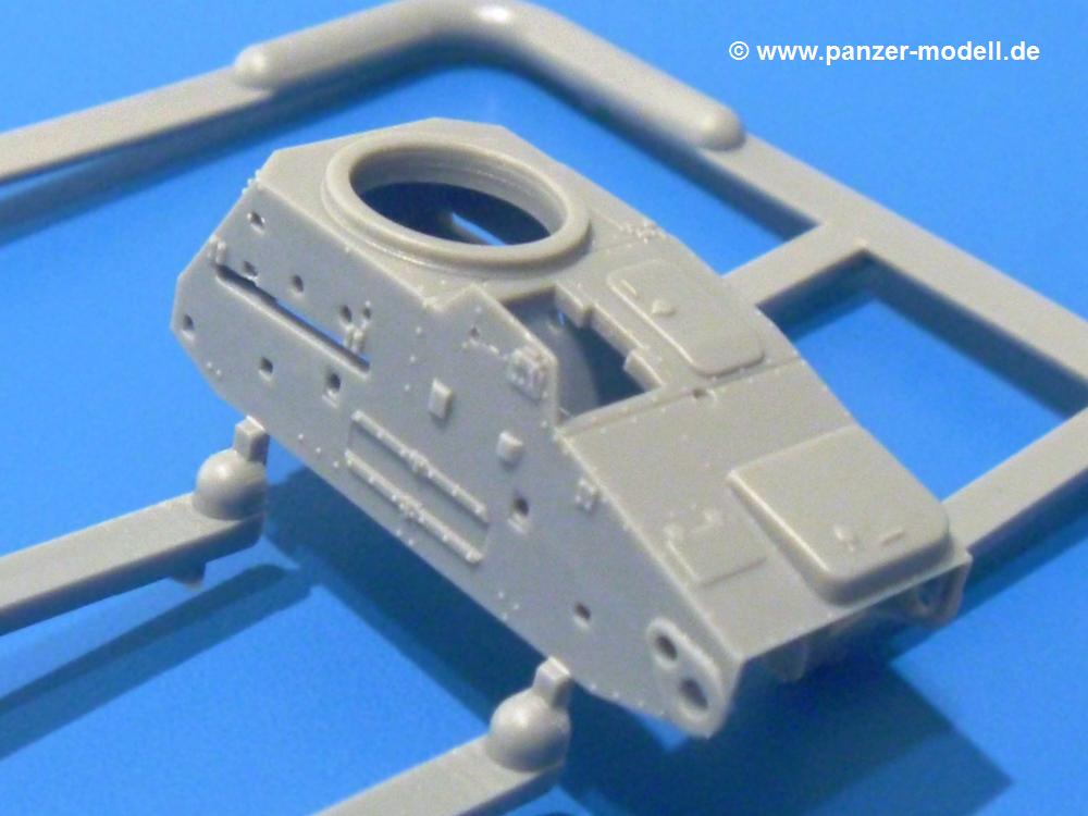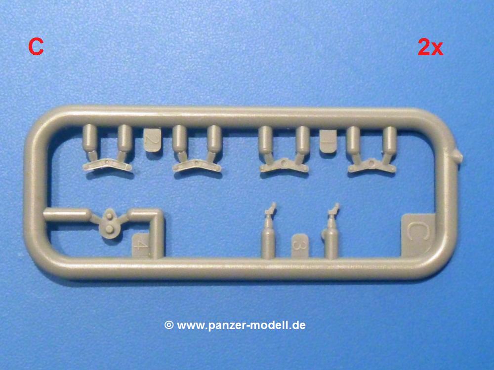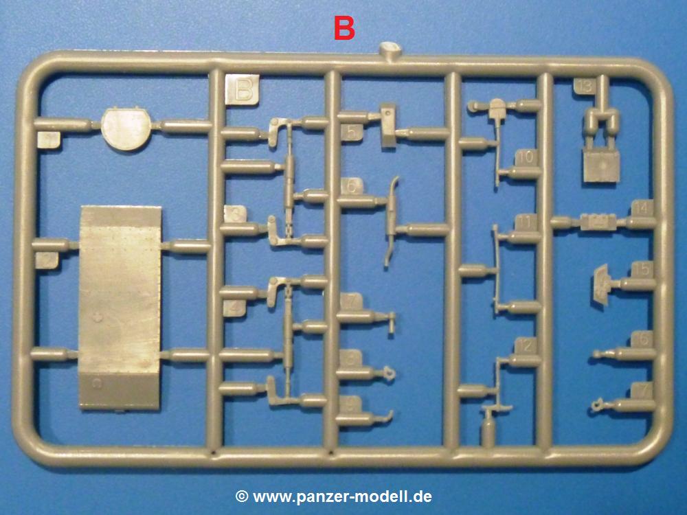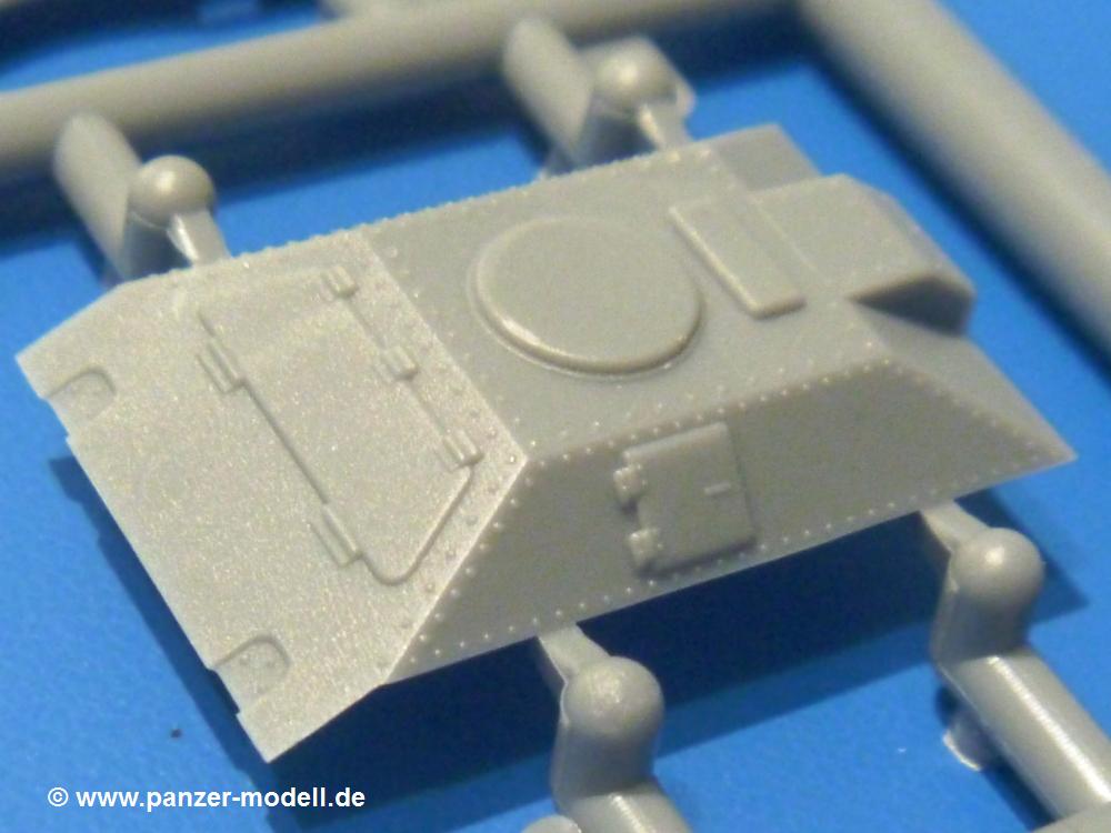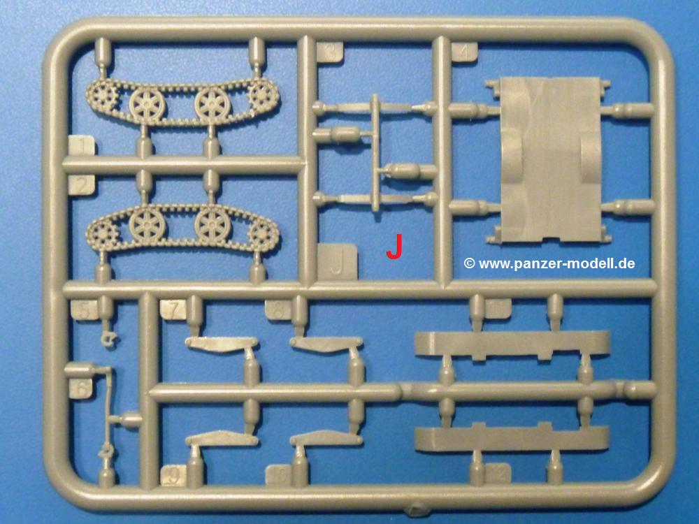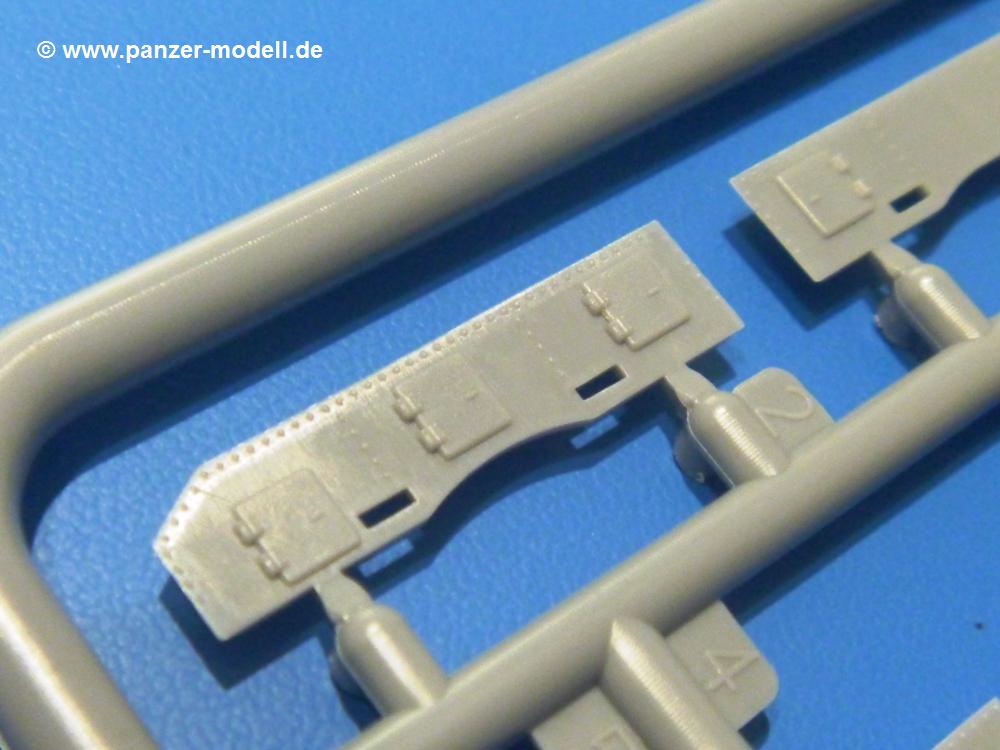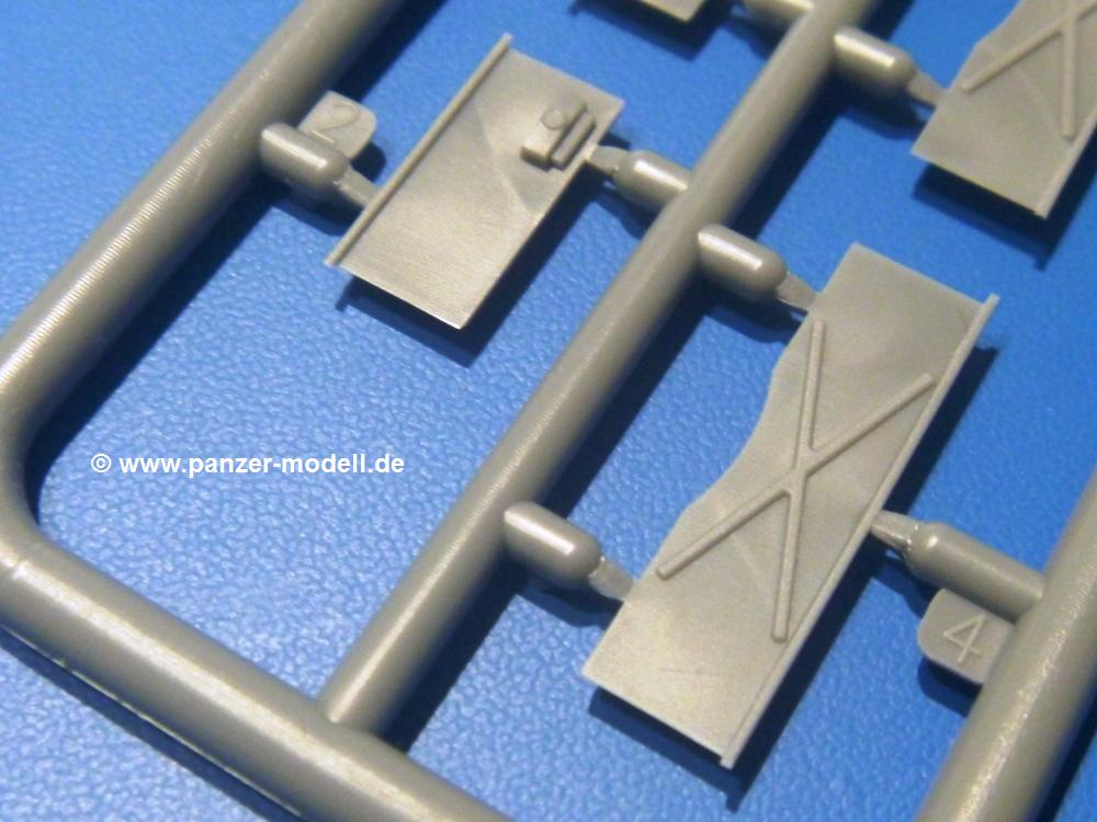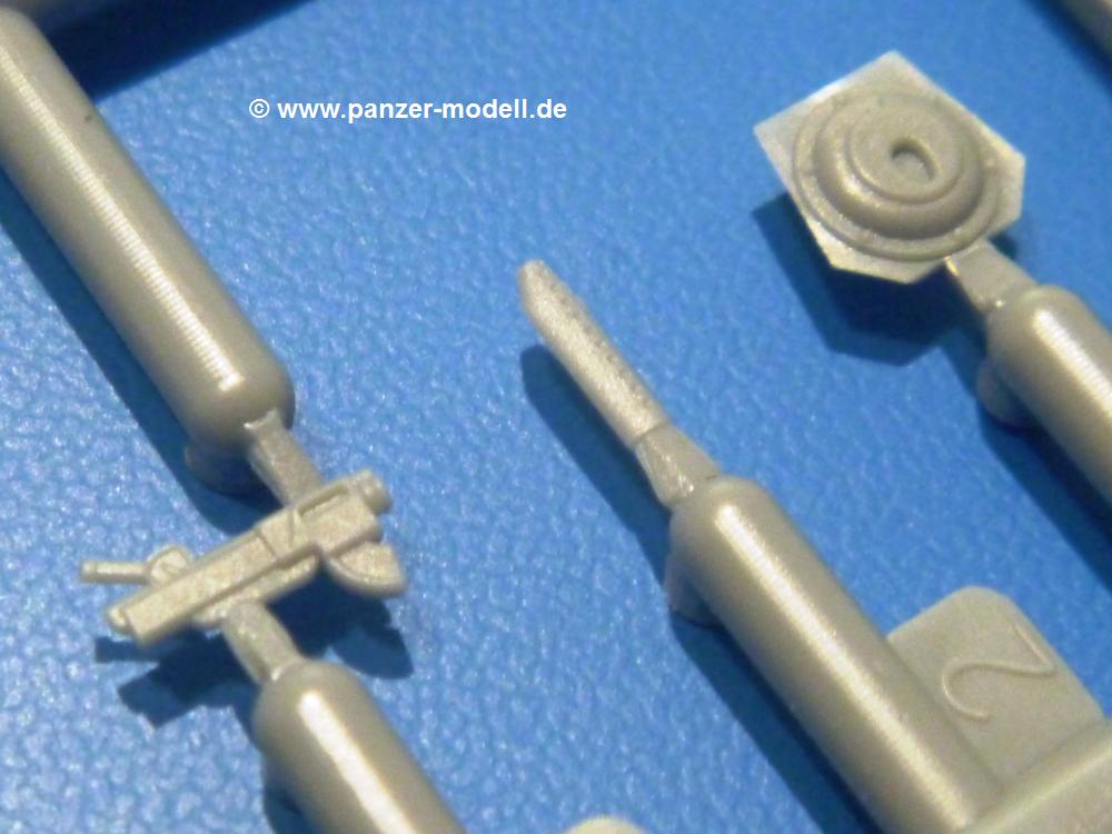 Die Teile aus hellgrauem Plastik sind sauber ausgespritzt, ohne Grat und Versatz. Die Auswerfer sind unsichtbar platziert. Auch die Angüsse sind klein, aber bei manchen Winzlingsteilen bleibt doch ein wenig zu versäubern.Auch wenn Lauf-, Leit-, Antriebs-, Stützrollen und Ketten aus einem Guss sind, tut dies der Detaillierung keinen Abbruch. Man muss nur noch die Federung, Vorgelegeabdeckungen, Kettenspanner, Stützrollenlager an der Wanne anbringen, die Laufrollenwagenbügel an den Rädern montieren und fertig ist das Fahrgestell. Beim Kettenspanner ist das Schneckengewinde ausreichend angedeutet, die Zähne der Stellscheibe gut erkennbar. Die gut geformte Wanne wird mit der Bodenplatte verschlossen und schon kann man an den restlichen Außendetails weiterarbeiten.Bei den Kettenabdeckungen und der Anhängeblattfeder gibt es eine kleine Unstimmigkeit. In der Anleitung werden die Teile mit D1 und D10 bezeichnet, aber es gibt keinen Spritzling D. Die benötigten Teile finden sich am Spritzling E. Linke Kettenabdeckung = E3, rechte Kettenabdeckung = E4 und die Anhängeblattfeder = E5. Die Kettenabdeckungen erhalten Halterungen aus PE Teilen. Auch der Auspufftopf auf der linken Kettenabdeckung bekommt ein feines PE-Gitter, das entsprechend gebogen werden muss. Weitere separat anzubringende Details sind die Hupe, Spitzhacke, Schaufel, Brechstange, Auspufftopfhalter und Scheinwerfer. Der Rückleuchtenhalter am Heck ist gleichzeitig die Aufnahme für das Nummerschild aus PE.Der Turm ist aus 6 Teilen schnell fertig gestellt. Man kann das Turmluk auch offen anbringen, so dass man die Innendetails des MGs sehen kann.Mit den vorhandenen Teilen kann man 2 verschiedene Anhänger bauen - einen offenen Transportanhänger und einen, offensichtlichen, Tankanhänger. Spritzling J mit dem Fahrgestell ist 2x im Bausatz, in der Anleitung nur einmal aufgeführt.Kette, Lauf- und Leitrollen sind wie bei der Tankette in einem Stück ausgeführt. Man setzt also nur die Achse unter die Bodenplatte, verbindet die Laufrollen mit den Bügeln und kann schon das Fahrgestell an der Bodenplatte anbringen, denn die Leitrollenlager sind an der Bodenplatte angegossen. Ans Heck noch die Anhängekupplung, vorn die Zugstange. An der Zugstange ist die Anhängekupplung der Tankette mit angegossen. Das Ganze macht man 2x, dann kann man sich an den Aufbau machen. Für den offenen Transportanhänger braucht man nur noch die 4 Seitenwände an der Bodenplatte anbringen. Beim Tankanhänger sind es 4 Seitenteile und das Oberteil. Dazu kommen noch die Kettenabdeckungen, die der Transportanhänger nicht hat.Die Decals sind wie üblich seidenmatt und ohne Trägerrand gedruckt. Sie reichen für ein Fahrzeug der 2nd Independent Light Armored Car Company, eingesetzt 1937 in China. Für die Anhänger gibt es keine Decals.Die 4-seitige Bauanleitung im meist schwarz-weißen A4 Format enthält kurze Beschreibungen oder Anleitungen in Polnisch und in Englisch. Auf der ersten Seite finden wir die Spritzlingübersicht. Die Angaben der Farbnummern für Valejo Model Color, Hataka, Life Color, MR Hobby und AK Interactive und die Anbringung der Decals wird auf der letzten Seite gezeigt. Der Zusammenbau der Tankette wird in 7 Schritten erklärt, der der Anhänger in einem.Auch wenn es am Ende nur ein Däumling ist, ist hier jede Menge an Details vorhanden. Die Zugabe der zwei Anhänger sind ein weiteres Plus. Der Preis liegt bei im deutschen Handel bei um die 10,- EUR!