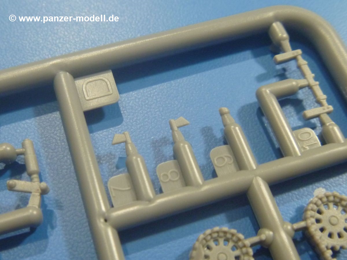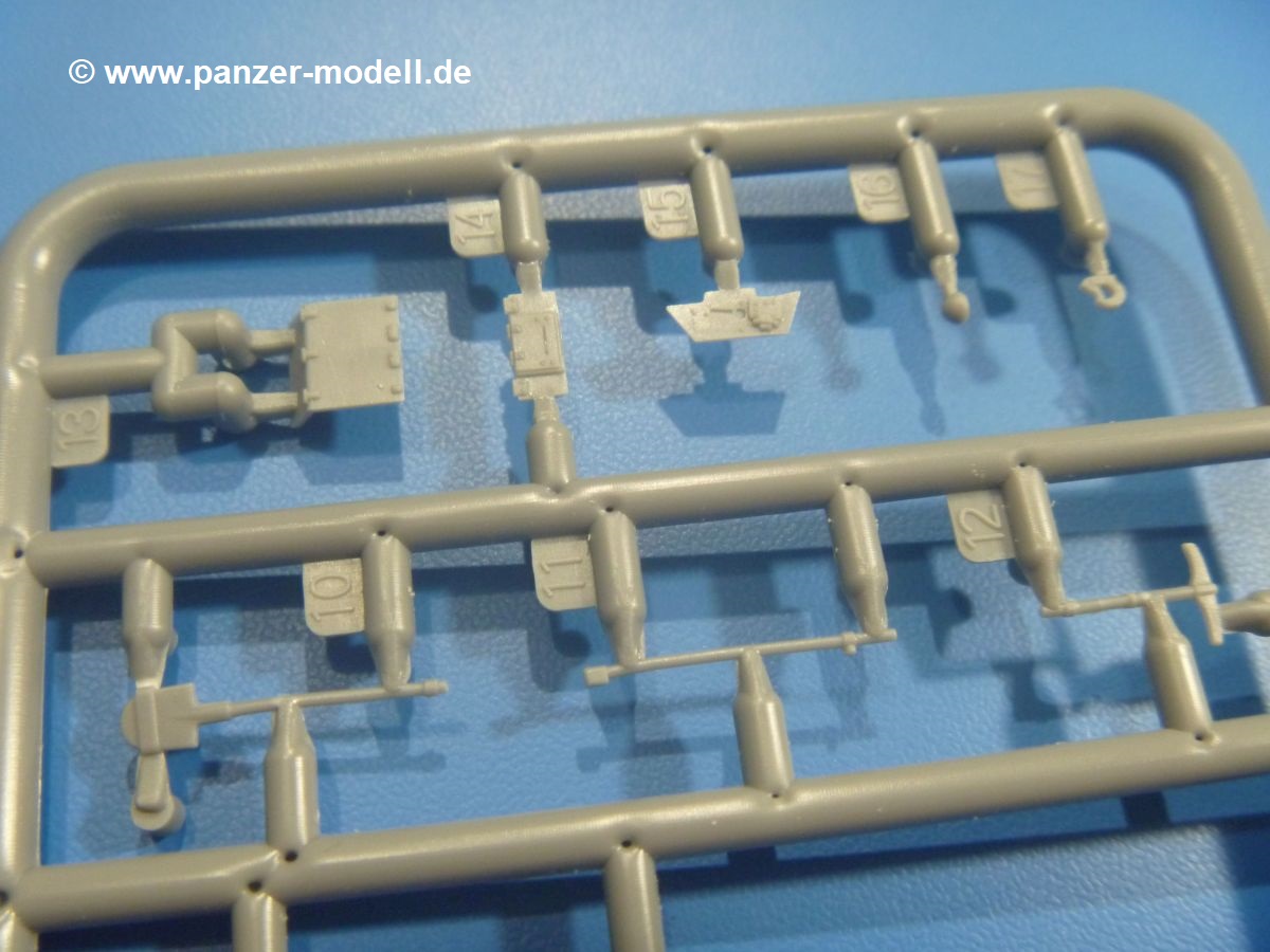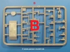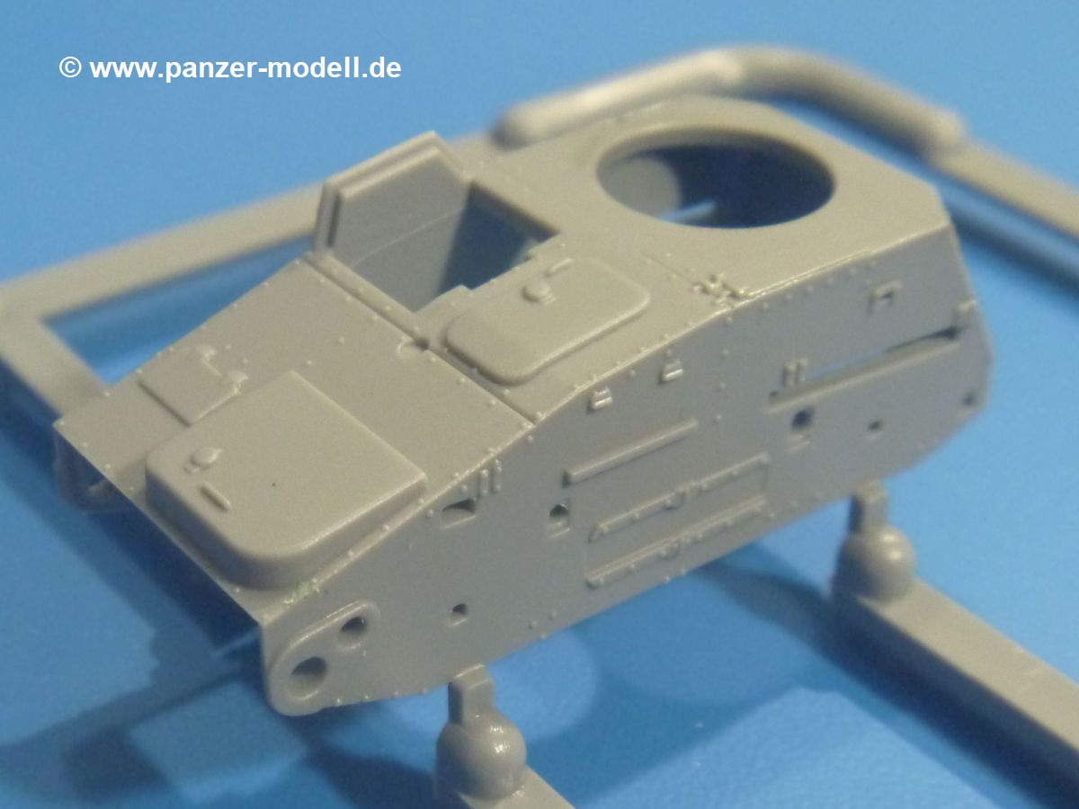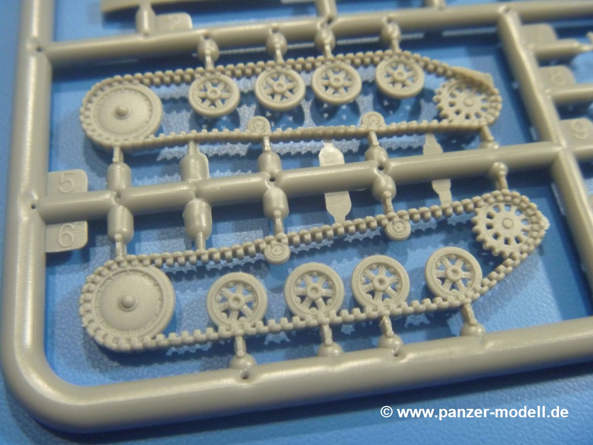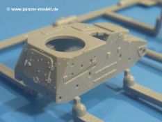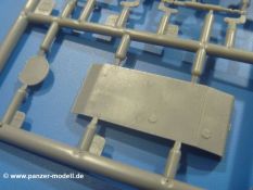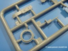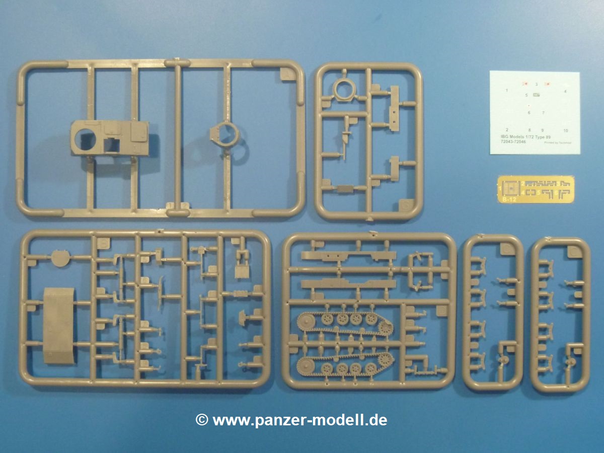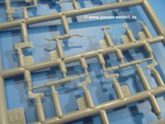 Die Tankette zeichnet sich nicht durch ihre Größe aus. Der Karton hätte auch für 4 Bausätze gereicht. Die mangelnde Masse wird aber durch gute Qualität ausgeglichen. Die Teile aus mittelgrauem Plastik sind sauber ausgespritzt mit schönen Details. Man findet wenig Grat und keinen Formversatz. Die Auswerfer sind meist auf den Spritzrahmen platziert.Wie auch bei den Vorgängerbausätzen besteht das Laufwerk ohne Einbußen an Details aus einem Stück, also Kette, Lauf-, Stütz-, Antriebs- und Leitrollen sind zusammengegossen. Man muss nur noch die Laufrollenträger befestigen. An der Wanne müssen nur noch die Vorgelegedeckel, Stützrollenachsen, Laufwerksfederung und Leitradschwingarme angebracht werden. Die Wanne, die nur noch mit dem Bodenblech geschlossen werden muss, zeigt uns schöne Details wie Wartungs- und Lukendeckel, Blechstöße und Verschraubungen/Nieten. Am Fahrererker entdecken wir feine Scharniere und Sichtklappen. Da es sich um einen Prototyp handelt, ist die linke Seite etwas abgewandelt. Hier befindet sich ein großes Zuluftgräting, welches eine Teilung der Kettenabdeckung erforderlich machte. Die Halterungen der Kettenabdeckungen bestehen aus kleinen PE Teilen. Auch für den Auspufftopf gibt es ein sehr feines PE Schutzgitter. Auch wenn das „Panzerchen“ grad mal so groß wird wie ein Daumenglied, hat man doch an Details wie Hupe, Scheinwerfer und Außenbordwerkzeuge (Schaufel, Brechstange, Spitzhacke) gedacht. Nach dem Vorbild der britischen Tanketten hat die Type 74 am Heck eine Blattfeder für die Anhängekupplung. Der Turm mit der 37mm Kanone ist aus 4 Teilen (Turmboden, Turm, Kanone, Lukendeckel) schnell zusammengesetzt.Aus dem kleinen Decalbogen für die Bausätze 72043 bis 72046 wird nur das schwarze Kennzeichen benötigt.Die 4-seitige Bauanleitung im A4 Format enthält kurze Beschreibungen oder Anleitungen in Polnisch und in Englisch. Auf der ersten Seite ist die Spritzlingübersicht, der 7 übersichtliche Bauschritte folgen. Die Angaben für Farbnummern von Tamiya-, Valejo Model Air-, Hataka-, Life Color- und AK Interactive-Farben finden wir am Schluss zusammen mit dem Bemalungsvorschlag für einen Prototyp der japanischen Armee.Der Preis liegt im deutschen Handel bei unter 10,- EUR!