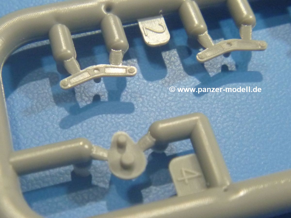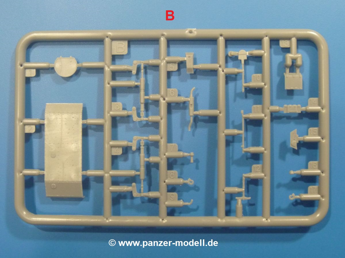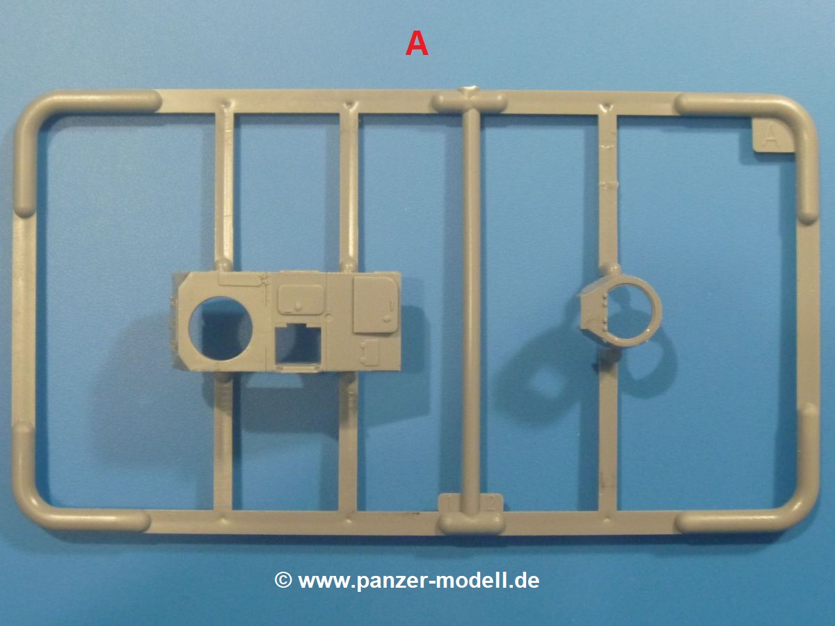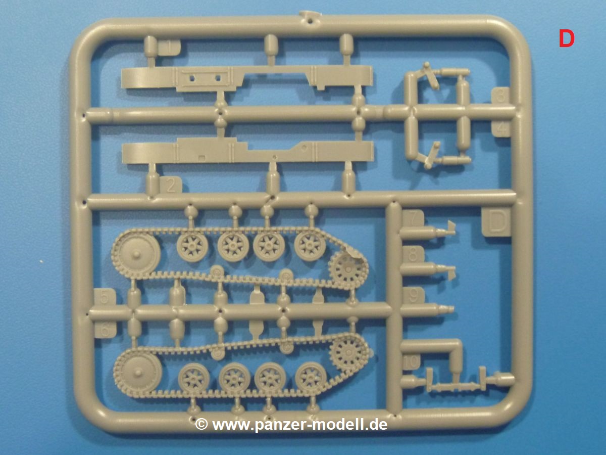 Die Tankette zeichnet sich nicht durch ihre Größe aus. Der Karton hätte auch für 4 Bausätze gereicht. Die mangelnde Masse wird aber durch gute Qualität ausgeglichen. Die Teile aus mittelgrauem Plastik sind sauber ausgespritzt mit schönen Details. Man findet wenig Grat und keinen Formversatz. Die Auswerfer sind meist auf den Spritzrahmen platziert.Wie auch bei den Vorgängerbausätzen besteht das Laufwerk ohne Einbußen an Details aus einem Stück, also Kette, Lauf-, Stütz-, Antriebs- und Leitrollen sind zusammengegossen. Man muss nur noch die Laufrollenträger befestigen. An der Wanne müssen nur noch die Vorgelegedeckel, Stützrollenachsen, Laufwerksfederung und Leitradschwingarme angebracht werden. Die Wanne, die nur noch mit dem Bodenblech geschlossen werden muss, zeigt uns schöne Details wie Wartungs- und Lukendeckel, Blechstöße und Verschraubungen/Nieten. Am Fahrererker entdecken wir feine Scharniere und Sichtklappen. Da es sich um einen Prototyp handelt, ist die linke Seite etwas abgewandelt. Hier befindet sich ein großes Zuluftgräting, welches eine Teilung der Kettenabdeckung erforderlich machte. Die Halterungen der Kettenabdeckungen bestehen aus kleinen PE Teilen. Auch für den Auspufftopf gibt es ein sehr feines PE Schutzgitter. Auch wenn das „Panzerchen“ grad mal so groß wird wie ein Daumenglied, hat man doch an Details wie Hupe, Scheinwerfer und Außenbordwerkzeuge (Schaufel, Brechstange, Spitzhacke) gedacht. Nach dem Vorbild der britischen Tanketten hat die Type 74 am Heck eine Blattfeder für die Anhängekupplung. Der Turm mit der 37mm Kanone ist aus 4 Teilen (Turmboden, Turm, Kanone, Lukendeckel) schnell zusammengesetzt.Aus dem kleinen Decalbogen für die Bausätze 72043 bis 72046 wird nur das schwarze Kennzeichen benötigt.Die 4-seitige Bauanleitung im A4 Format enthält kurze Beschreibungen oder Anleitungen in Polnisch und in Englisch. Auf der ersten Seite ist die Spritzlingübersicht, der 7 übersichtliche Bauschritte folgen. Die Angaben für Farbnummern von Tamiya-, Valejo Model Air-, Hataka-, Life Color- und AK Interactive-Farben finden wir am Schluss zusammen mit dem Bemalungsvorschlag für einen Prototyp der japanischen Armee.Der Preis liegt im deutschen Handel bei unter 10,- EUR!