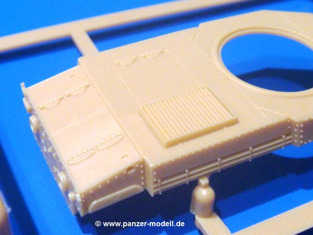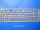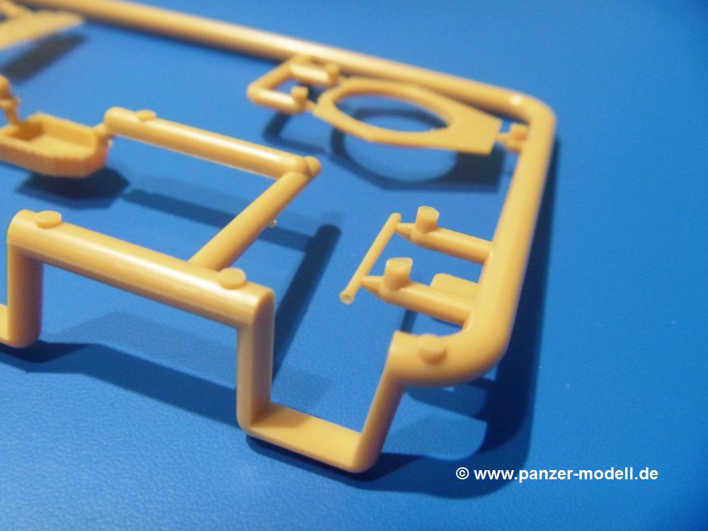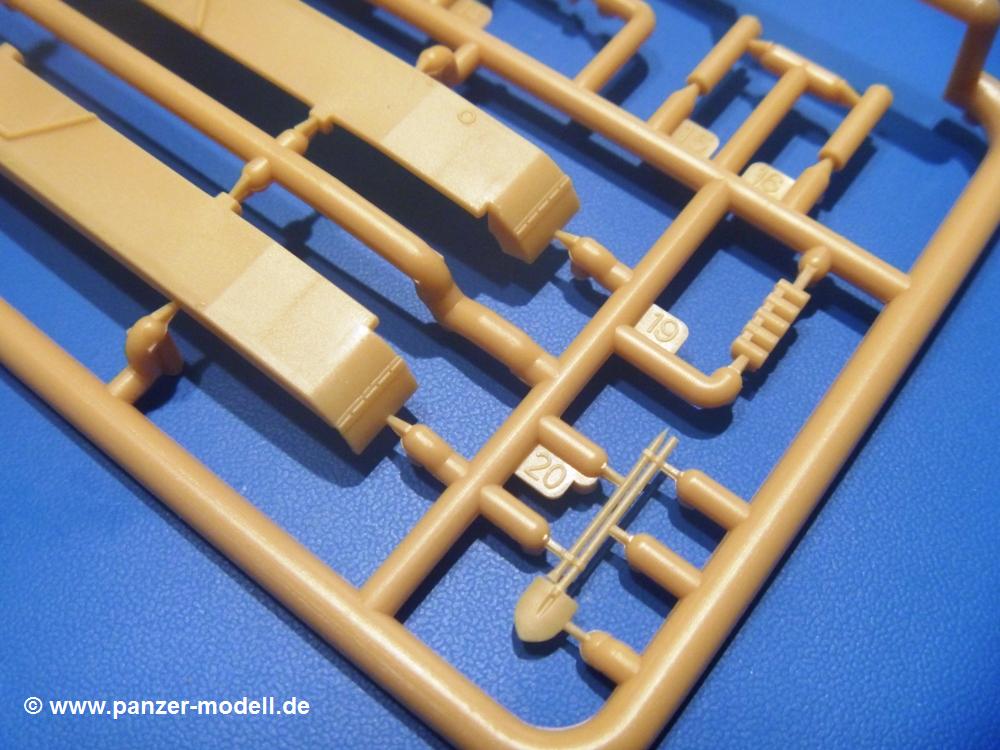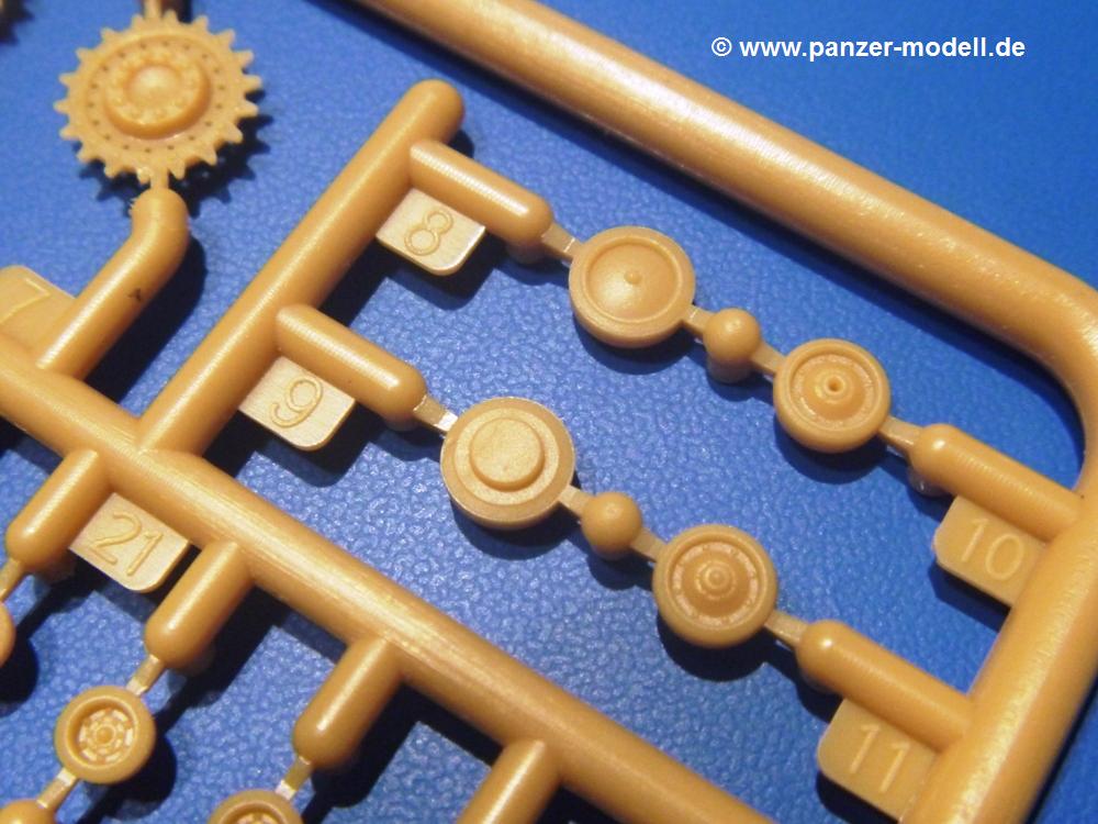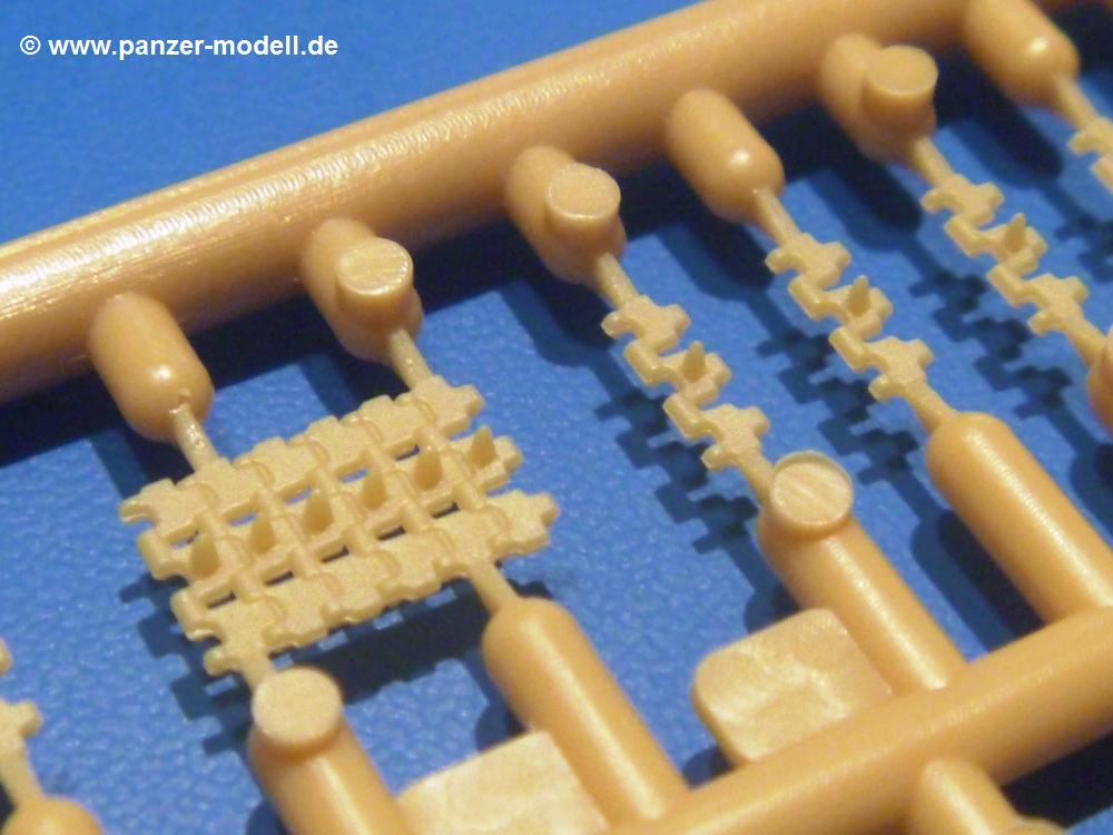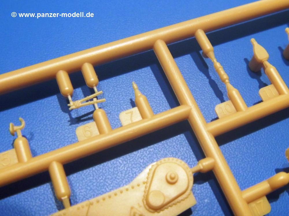Die Teile aus sandgelbem Plastik sind sauber ausgespritzt, ohne Grat und Versatz. Die Auswerfer sind meist auf den Spritzrahmen platziert. Feine Details treten scharf hervor. Angüsse sind sehr fein und pfiffig gesetzt, so dass das Abtrennen der Teile keine Probleme bereiten wird.Die Wanne ist mehrteilig in Boden-, Bugplatte und Seitenwänden ausgeführt. Das, im Original eigentlich aufwendige, Fahrgestell des Turan besteht aus 3 Hauptteilen, ohne an Detail zu verlieren. Die äußeren Rollenwagen mit den Blattfedern bestehen aus 1 Stück, die inneren aus 2 Teilen. Alle 32 Laufrollen, 4 vordere Stützlaufrollen, 20 Stützrollen, sowie die 8 Zahnräder sind separat vorhanden. Die Ketten bestehen sowohl aus Segmenten als auch aus feinen Einzelgliedern.Die Oberwanne besteht aus einem großen Teil, an das die Kettenabdeckungen angebaut werden. Hier finden wir feine Details wie Nietenreihen, Wartungsklappen, Luftein- und Auslassgrätings. Werkzeuge wie Bolzenschneider, Schaufel, Brechstange und Wagenheber beleben das Fahrzeug. Die Fahrerluke ist geschlossen an der Wanne angegossen. Die Bugplatte mit der Fahrersichtklappe erhält noch das Bug-MG, dessen Lauf andeutungsweise offen dargestellt ist. Offen sind auch die Endrohre der Aufpufftöpfe. Am Heck finden 2 Laufrollenpaare, ein paar Schlepphaken und die Nebeltöpfe ihren Platz.Der Turm besteht Unter-, Oberteil und der Kommandantenkuppel mit geschlossener Luke. Die Seitenluken sind angegossen, trotzdem aber sehr schön detailliert. Auch das 40mm Rohr und das Turm-MG zeigen offene Mündungen.Die Decals sind seidenmatt ohne Trägerrand gedruckt und sind für 1 Fahrzeug der 1. Kavalleriedivision im Frühjahr 1944 vorgesehen.Die 8-seitige Bauanleitung im meist schwarz-weißen A4 Format enthält kurze Beschreibungen oder Anleitungen in Polnisch und in Englisch. Auf der ersten Seite finden wir die Angaben der Farbnummern für Vallejo Model Color, Hataka, Life Color, MR Hobby und AK Interactive. Die 2. Seite zeigt uns die Spritzlingübersicht. Auf 4 weiteren Seiten wird der Bau in 13 Schritten leicht verständlich gezeigt. Die Anbringung der Decals wird auf der letzten Seite gezeigt.Wieder ein toller Bausatz von IBG. Der Preis liegt bei im deutschen Handel bei um die 11,- EUR!
