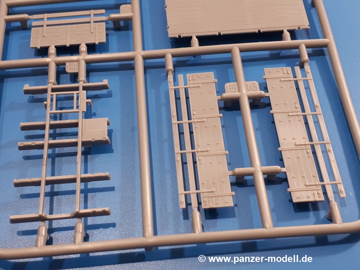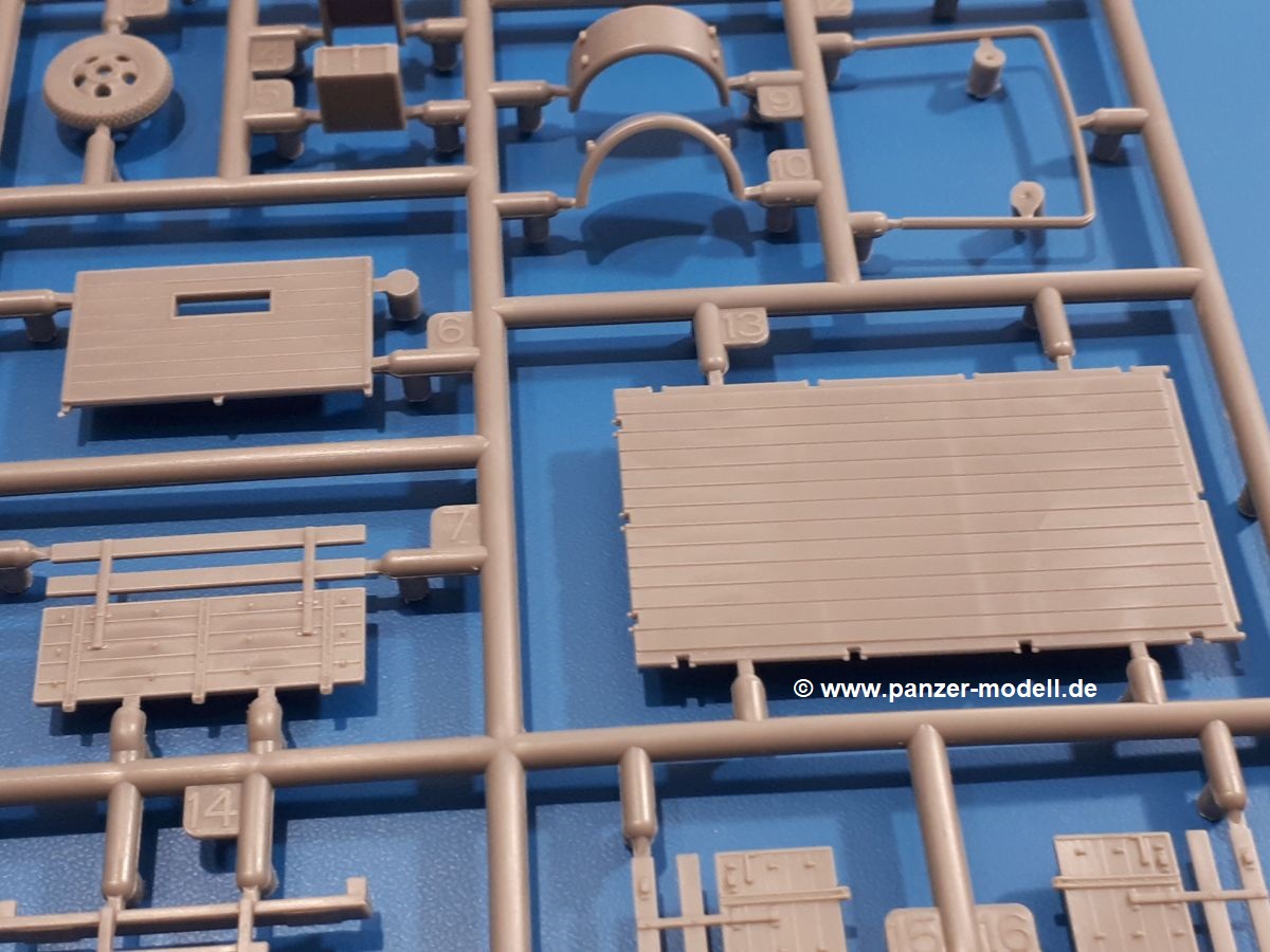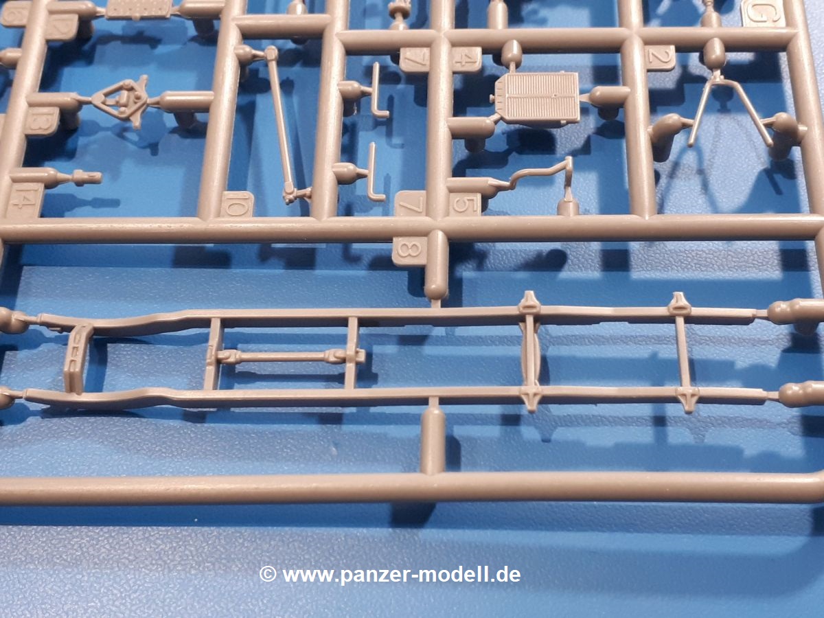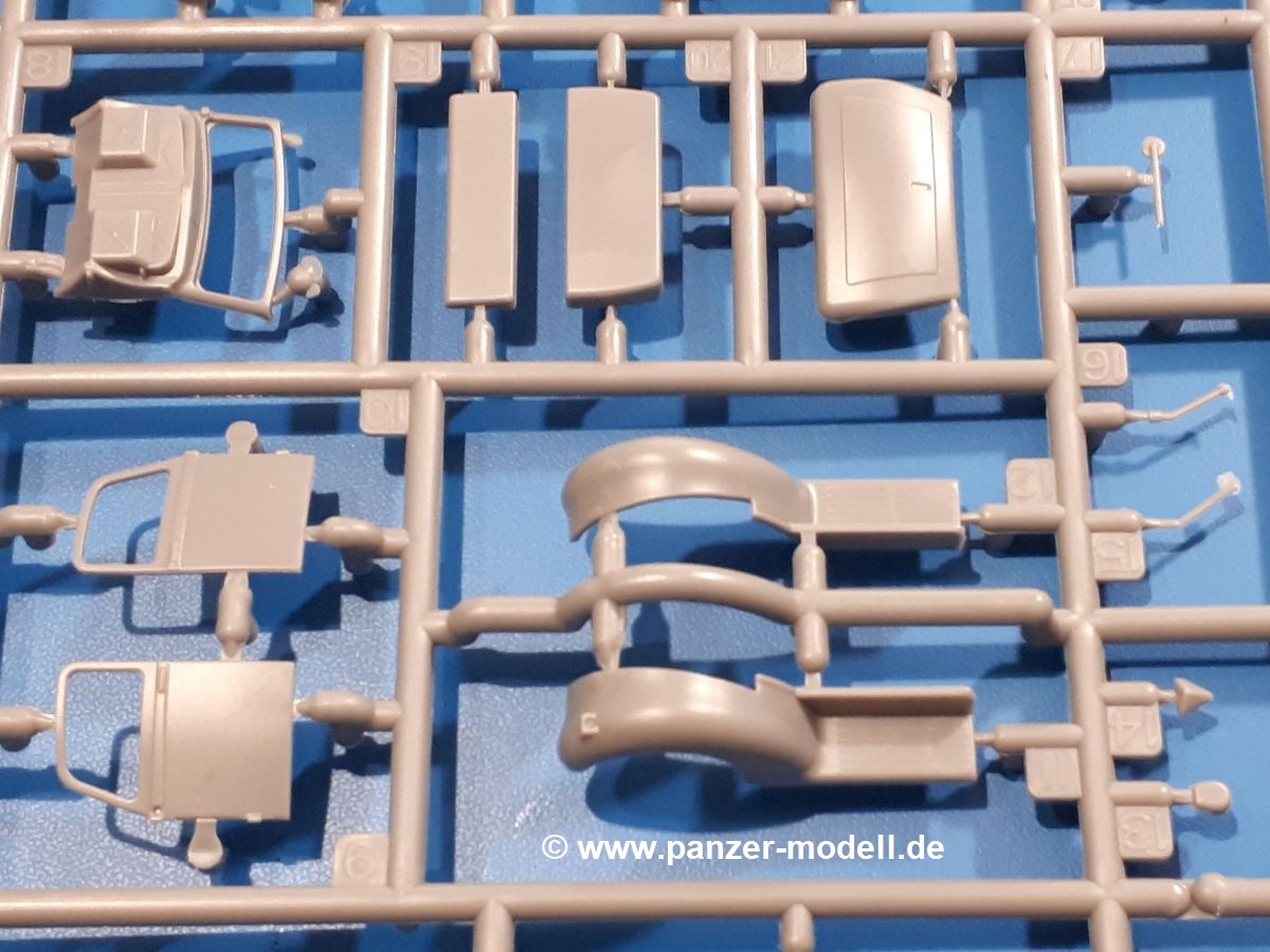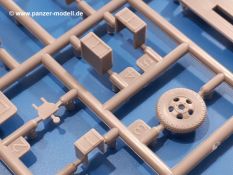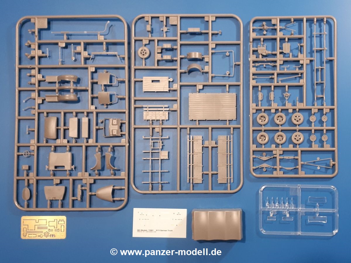 Beim Blick in den Karton gibt es keine unangenehmen Überraschungen. Die Teile aus hellgrauem Plastik sind sauber ausgespritzt, ohne Grat und Versatz. Die Auswerfer sind meist auf den Spritzrahmen platziert. Kleine Angüsse erleichtern das Abtrennen der Teile.IBG geizt nicht mit Details. Das beginnt schon bei dem V8 Motor mit Luftfilter, Lichtmaschine, Anlasser, Riemenscheiben mit Keilriemen, Kühlerpropeller aus PE, Kühlmittelleitungen und schönen Zylinderköpfen inklusive Abgaskrümmern. Der Kühler selbst zeigt allseitig schöne Details.Der Fahrzeugrahmen besteht zusammengegossenen Längs- und Querträgern. Es muss nur noch der hintere Querträger und die Anhängekupplung, vorn die Stoßstange mit den Peilstangen ergänzt werden. Schlepp/Zurrhaken aus PE werden sowohl vorne als auch hinten angebracht. Die Vorderachse wird an dem querliegenden Blattfederpaket befestigt und mit dem Querlenker und Stabilisator vervollständigt. Doppelblattfederpakete nehmen die Hinterachse auf, die noch die Bremstrommeln, Stabilisator und Kardanwelle erhält. Die Räder zeigen ein sehr schönes Profil für den kleinen Maßstab. Nach dem Einbau des Motors muss noch der Auspuff am Rahmen angebracht werden.Auch die Fahrerkabine kann mit schönen Details aufwarten. Die Pedale sind bereits angegossen. Das Armaturenbrett weist alle Instrumente und Bedienknöpfe auf. Lenkstange und Lenkrad werden separat angebaut. Die separat anzubauenden Türen (die man also auch offen anbauen kann) haben eine Innenverkleidung. Sogar an die Drehkurbeln der Seitenfenster wurde gedacht. Der 917t besitzt eine einteilige Sitzbank mit einer durchgehenden Rückenlehne. Auf dem Dach wird die Lastzugkennung in abgeklapptem Zustand angebracht (weil ja kein Anhänger angehängt ist). Die Fahrertür bekommt noch einen Außenspiegel, beim Beifahrer findet ein Suchscheinwerfer seinen Platz.An das Fahrerhaus werden dann noch die Motorverkleidung, Motorhaube, Kühlergrill und Kotflügel mit Trittbrettern angebracht. (Ich würde die Motorhaube nur auflegen oder offen anbauen, so dass man den Motor sehen kann.) Weitere Anbauteile sind die Fahrscheinwerfer, das Noteklicht, Schaufel, Spitzhacke und eine PE Kanisterhalterung mit dem 20l Kanister.Bei der Pritsche kann man zwischen auf- und abgeplant wählen. Pritschenrahmen, -boden, Ersatzrad und Heckklappe sind bei beiden gleich. Dann setzt man entweder die sehr schön detaillierte Plane mit naturgetreuem Durchhang, hochgerollter Heckplane und Seitenklappen auf oder baut Front- und Seitenwände an und hängt die Spriegel in die Halterung an der Frontwand. Die Unterseite ist für beide Versionen wieder gleich und wird mit etlichen Staukästen und den Schmutzfängern für die Hinterräder ergänzt. Ein offener Staukasten aus PE kommt noch dazu.Die Decals sind seidenmatt mit geringem Trägerrand gedruckt. Man kann damit 2 verschiedene Lkw darstellen: