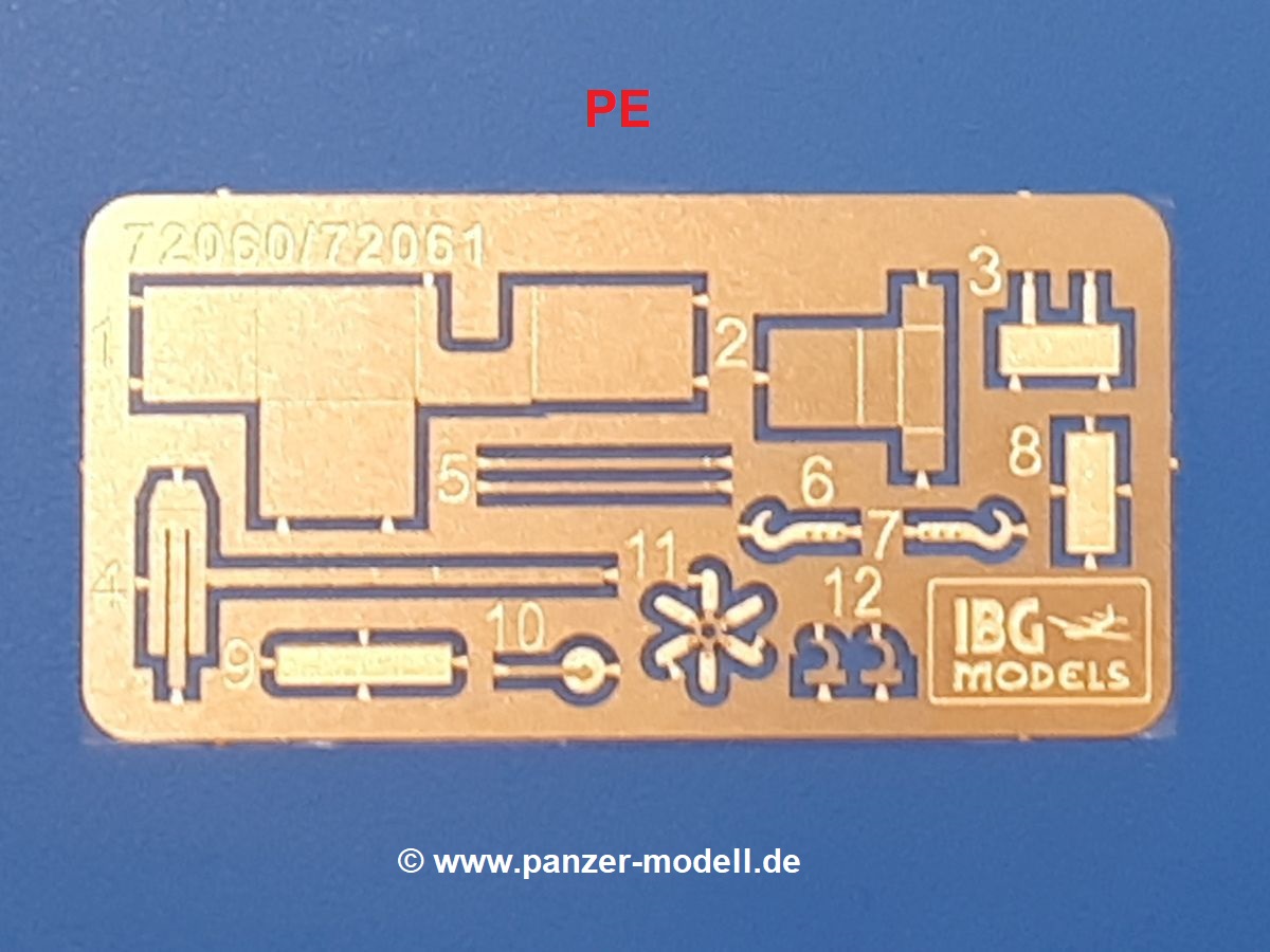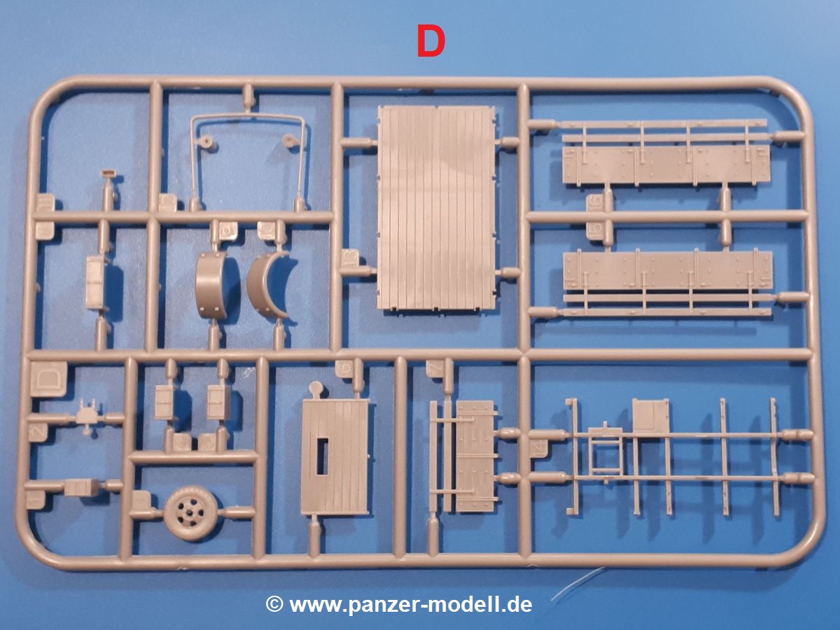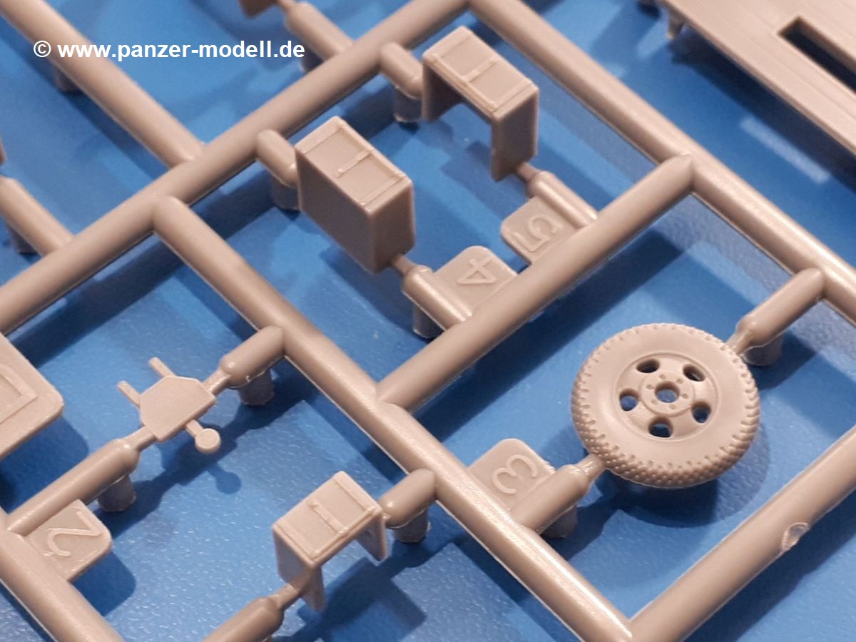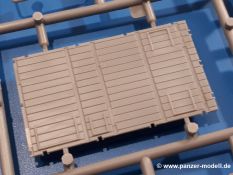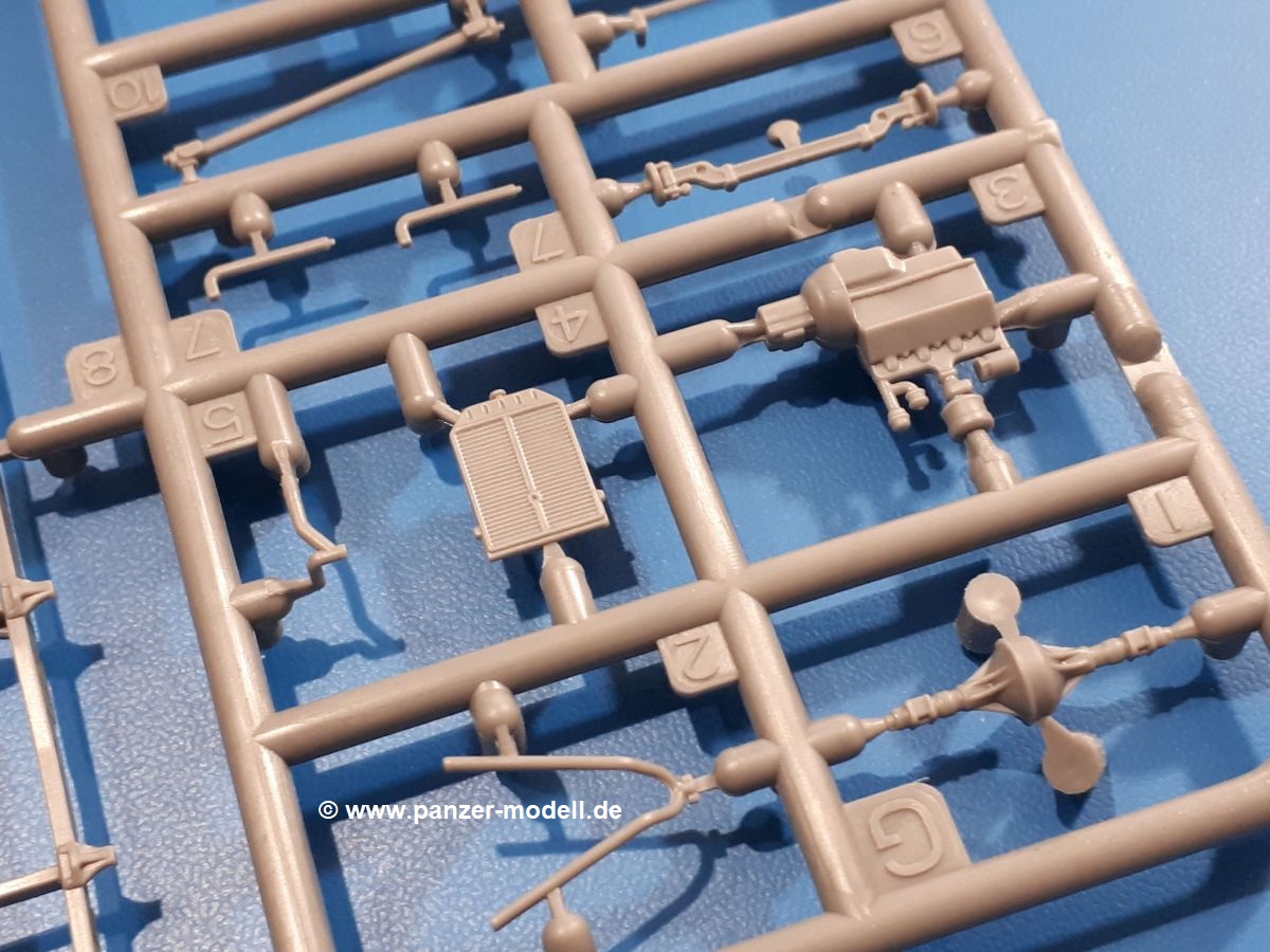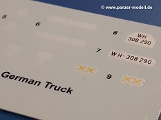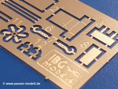 Beim Blick in den Karton gibt es keine unangenehmen Überraschungen. Die Teile aus hellgrauem Plastik sind sauber ausgespritzt, ohne Grat und Versatz. Die Auswerfer sind meist auf den Spritzrahmen platziert. Kleine Angüsse erleichtern das Abtrennen der Teile.IBG geizt nicht mit Details. Das beginnt schon bei dem V8 Motor mit Luftfilter, Lichtmaschine, Anlasser, Riemenscheiben mit Keilriemen, Kühlerpropeller aus PE, Kühlmittelleitungen und schönen Zylinderköpfen inklusive Abgaskrümmern. Der Kühler selbst zeigt allseitig schöne Details.Der Fahrzeugrahmen besteht zusammengegossenen Längs- und Querträgern. Es muss nur noch der hintere Querträger und die Anhängekupplung, vorn die Stoßstange mit den Peilstangen ergänzt werden. Schlepp/Zurrhaken aus PE werden sowohl vorne als auch hinten angebracht. Die Vorderachse wird an dem querliegenden Blattfederpaket befestigt und mit dem Querlenker und Stabilisator vervollständigt. Doppelblattfederpakete nehmen die Hinterachse auf, die noch die Bremstrommeln, Stabilisator und Kardanwelle erhält. Die Räder zeigen ein sehr schönes Profil für den kleinen Maßstab. Nach dem Einbau des Motors muss noch der Auspuff am Rahmen angebracht werden.Auch die Fahrerkabine kann mit schönen Details aufwarten. Die Pedale sind bereits angegossen. Das Armaturenbrett weist alle Instrumente und Bedienknöpfe auf. Lenkstange und Lenkrad werden separat angebaut. Die separat anzubauenden Türen (die man also auch offen anbauen kann) haben eine Innenverkleidung. Sogar an die Drehkurbeln der Seitenfenster wurde gedacht. Der 917t besitzt eine einteilige Sitzbank mit einer durchgehenden Rückenlehne. Auf dem Dach wird die Lastzugkennung in abgeklapptem Zustand angebracht (weil ja kein Anhänger angehängt ist). Die Fahrertür bekommt noch einen Außenspiegel, beim Beifahrer findet ein Suchscheinwerfer seinen Platz.An das Fahrerhaus werden dann noch die Motorverkleidung, Motorhaube, Kühlergrill und Kotflügel mit Trittbrettern angebracht. (Ich würde die Motorhaube nur auflegen oder offen anbauen, so dass man den Motor sehen kann.) Weitere Anbauteile sind die Fahrscheinwerfer, das Noteklicht, Schaufel, Spitzhacke und eine PE Kanisterhalterung mit dem 20l Kanister.Bei der Pritsche kann man zwischen auf- und abgeplant wählen. Pritschenrahmen, -boden, Ersatzrad und Heckklappe sind bei beiden gleich. Dann setzt man entweder die sehr schön detaillierte Plane mit naturgetreuem Durchhang, hochgerollter Heckplane und Seitenklappen auf oder baut Front- und Seitenwände an und hängt die Spriegel in die Halterung an der Frontwand. Die Unterseite ist für beide Versionen wieder gleich und wird mit etlichen Staukästen und den Schmutzfängern für die Hinterräder ergänzt. Ein offener Staukasten aus PE kommt noch dazu.Die Decals sind seidenmatt mit geringem Trägerrand gedruckt. Man kann damit 2 verschiedene Lkw darstellen: