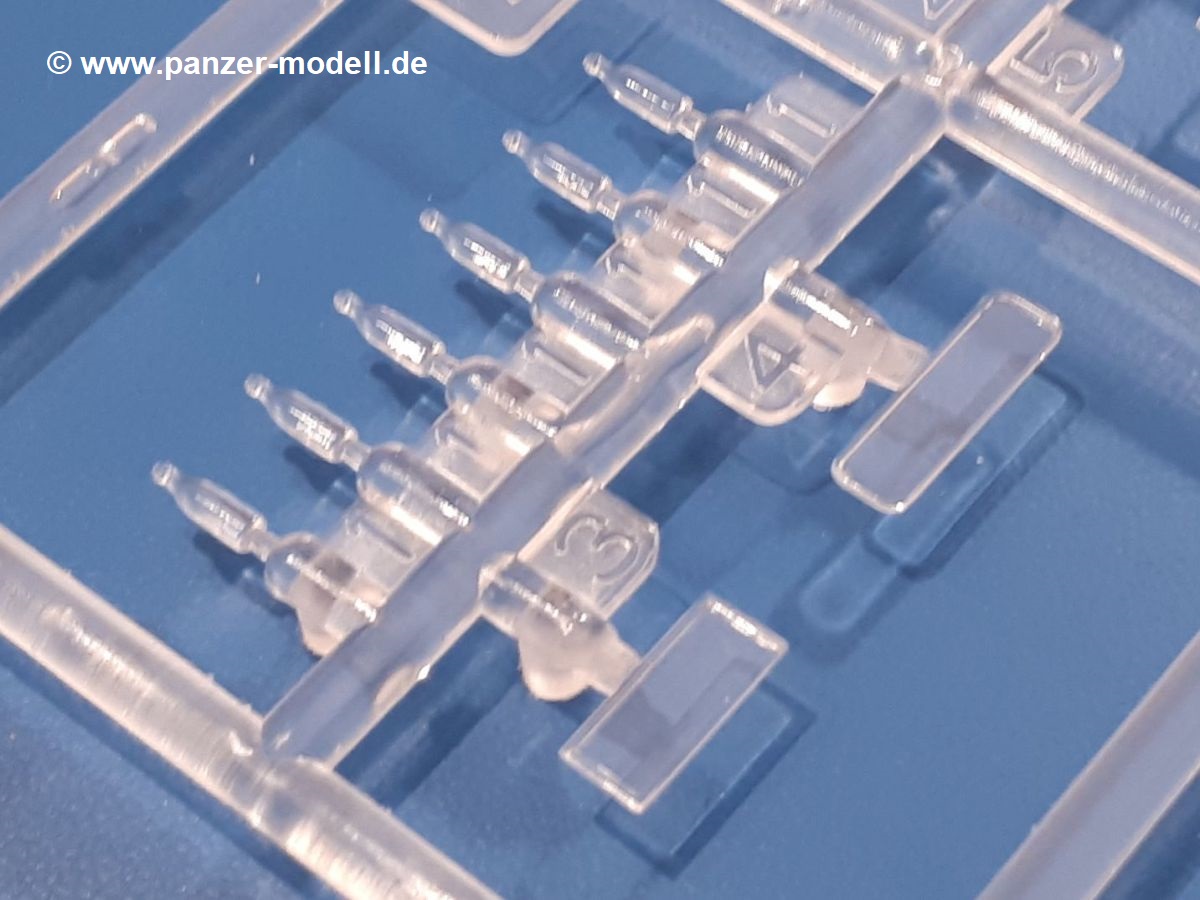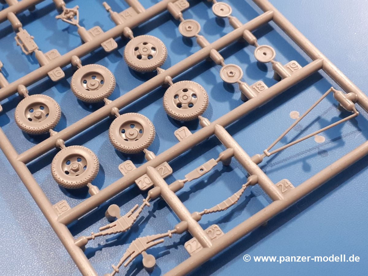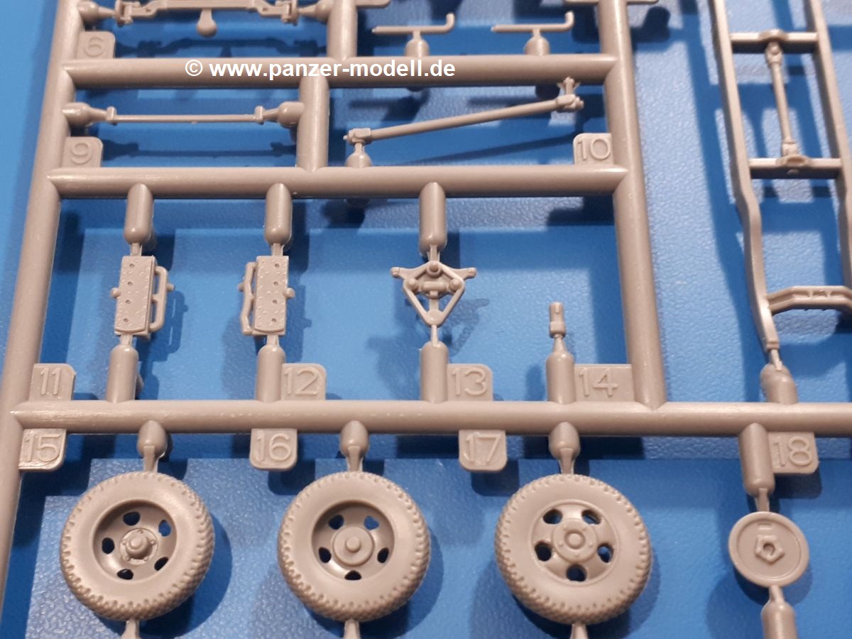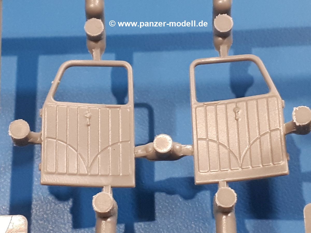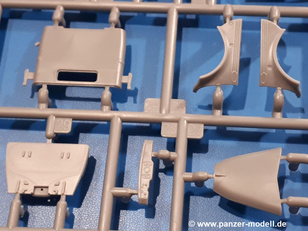 Beim Blick in den Karton gibt es keine unangenehmen Überraschungen. Die Teile aus hellgrauem Plastik sind sauber ausgespritzt, ohne Grat und Versatz. Die Auswerfer sind meist auf den Spritzrahmen platziert. Kleine Angüsse erleichtern das Abtrennen der Teile.IBG geizt nicht mit Details. Das beginnt schon bei dem V8 Motor mit Luftfilter, Lichtmaschine, Anlasser, Riemenscheiben mit Keilriemen, Kühlerpropeller aus PE, Kühlmittelleitungen und schönen Zylinderköpfen inklusive Abgaskrümmern. Der Kühler selbst zeigt allseitig schöne Details.Der Fahrzeugrahmen besteht zusammengegossenen Längs- und Querträgern. Es muss nur noch der hintere Querträger und die Anhängekupplung, vorn die Stoßstange mit den Peilstangen ergänzt werden. Schlepp/Zurrhaken aus PE werden sowohl vorne als auch hinten angebracht. Die Vorderachse wird an dem querliegenden Blattfederpaket befestigt und mit dem Querlenker und Stabilisator vervollständigt. Doppelblattfederpakete nehmen die Hinterachse auf, die noch die Bremstrommeln, Stabilisator und Kardanwelle erhält. Die Räder zeigen ein sehr schönes Profil für den kleinen Maßstab. Nach dem Einbau des Motors muss noch der Auspuff am Rahmen angebracht werden.Auch die Fahrerkabine kann mit schönen Details aufwarten. Die Pedale sind bereits angegossen. Das Armaturenbrett weist alle Instrumente und Bedienknöpfe auf. Lenkstange und Lenkrad werden separat angebaut. Die separat anzubauenden Türen (die man also auch offen anbauen kann) haben eine Innenverkleidung. Sogar an die Drehkurbeln der Seitenfenster wurde gedacht. Der 917t besitzt eine einteilige Sitzbank mit einer durchgehenden Rückenlehne. Auf dem Dach wird die Lastzugkennung in abgeklapptem Zustand angebracht (weil ja kein Anhänger angehängt ist). Die Fahrertür bekommt noch einen Außenspiegel, beim Beifahrer findet ein Suchscheinwerfer seinen Platz.An das Fahrerhaus werden dann noch die Motorverkleidung, Motorhaube, Kühlergrill und Kotflügel mit Trittbrettern angebracht. (Ich würde die Motorhaube nur auflegen oder offen anbauen, so dass man den Motor sehen kann.) Weitere Anbauteile sind die Fahrscheinwerfer, das Noteklicht, Schaufel, Spitzhacke und eine PE Kanisterhalterung mit dem 20l Kanister.Bei der Pritsche kann man zwischen auf- und abgeplant wählen. Pritschenrahmen, -boden, Ersatzrad und Heckklappe sind bei beiden gleich. Dann setzt man entweder die sehr schön detaillierte Plane mit naturgetreuem Durchhang, hochgerollter Heckplane und Seitenklappen auf oder baut Front- und Seitenwände an und hängt die Spriegel in die Halterung an der Frontwand. Die Unterseite ist für beide Versionen wieder gleich und wird mit etlichen Staukästen und den Schmutzfängern für die Hinterräder ergänzt. Ein offener Staukasten aus PE kommt noch dazu.Die Decals sind seidenmatt mit geringem Trägerrand gedruckt. Man kann damit 2 verschiedene Lkw darstellen: