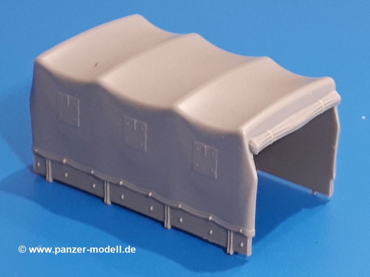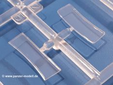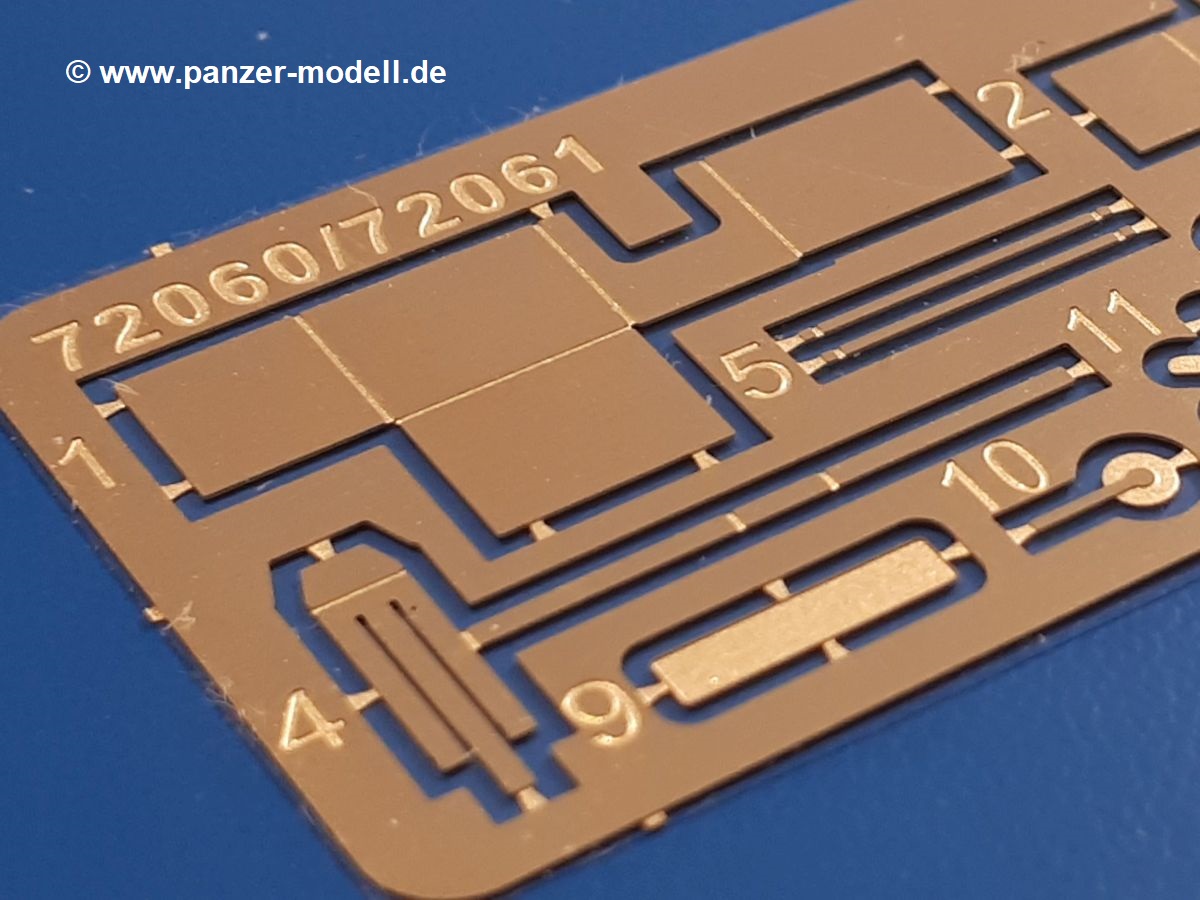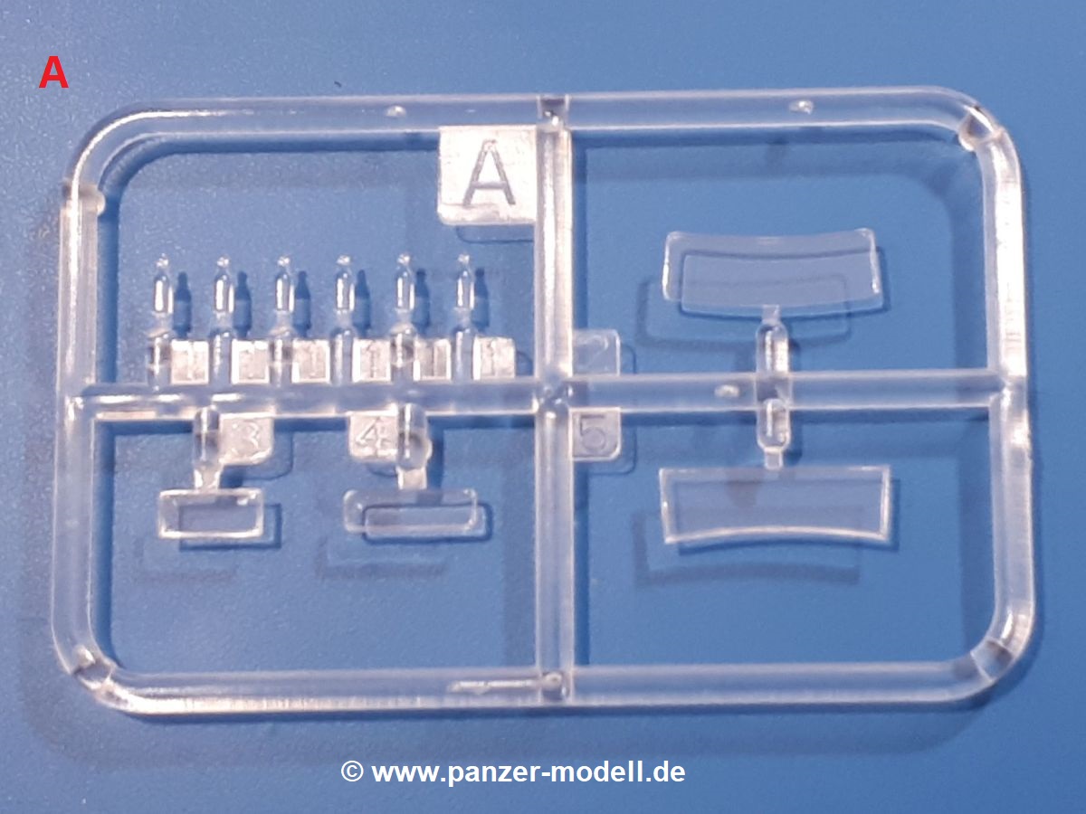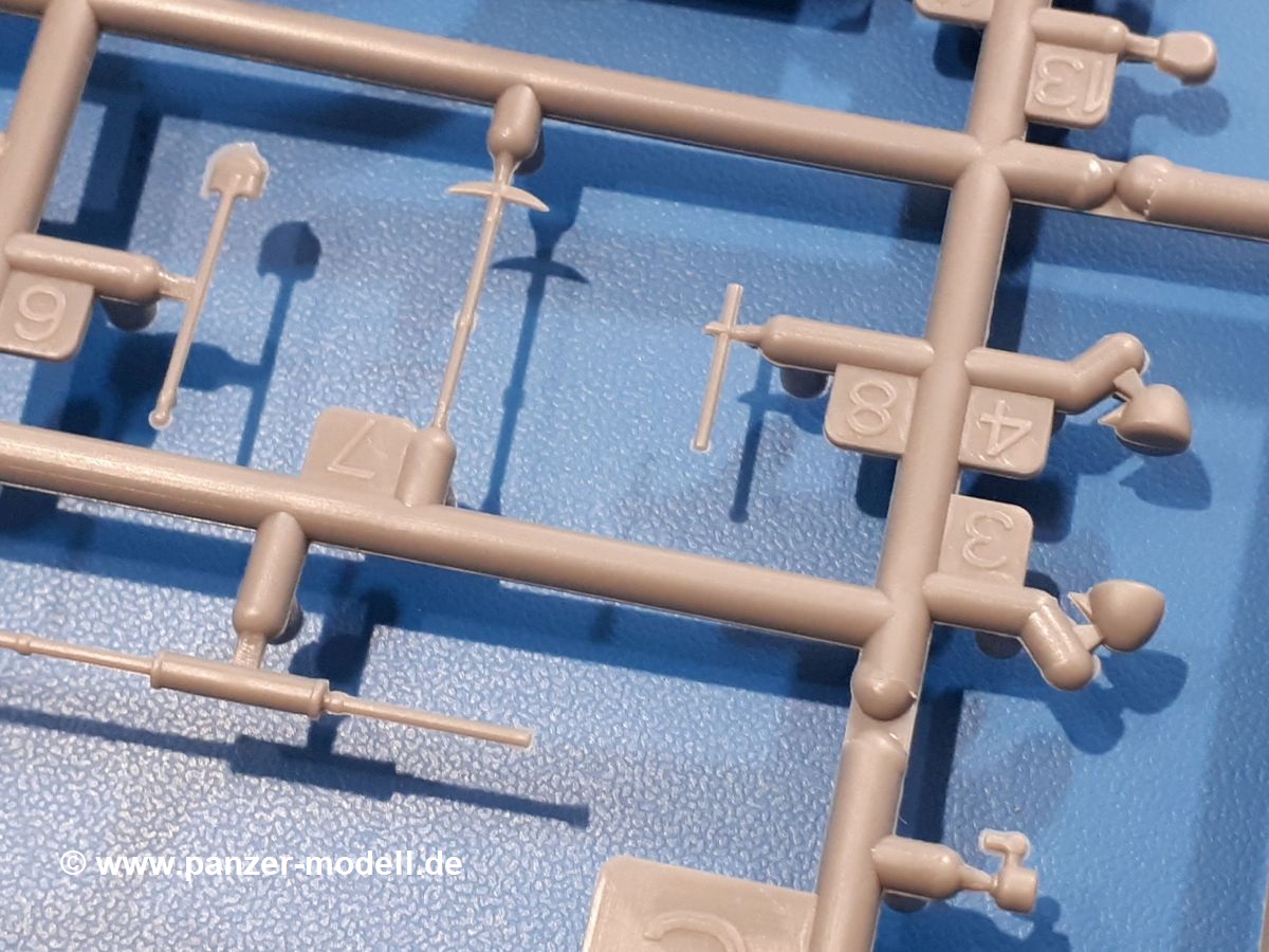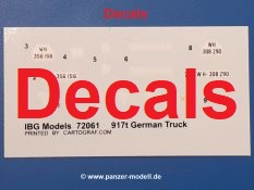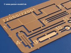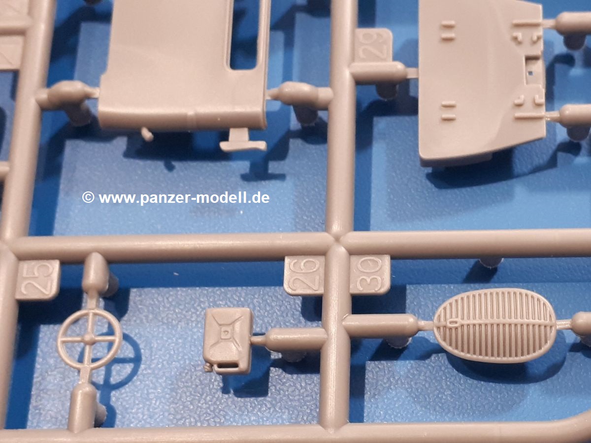 Beim Blick in den Karton gibt es keine unangenehmen Überraschungen. Die Teile aus hellgrauem Plastik sind sauber ausgespritzt, ohne Grat und Versatz. Die Auswerfer sind meist auf den Spritzrahmen platziert. Kleine Angüsse erleichtern das Abtrennen der Teile.IBG geizt nicht mit Details. Das beginnt schon bei dem V8 Motor mit Luftfilter, Lichtmaschine, Anlasser, Riemenscheiben mit Keilriemen, Kühlerpropeller aus PE, Kühlmittelleitungen und schönen Zylinderköpfen inklusive Abgaskrümmern. Der Kühler selbst zeigt allseitig schöne Details.Der Fahrzeugrahmen besteht zusammengegossenen Längs- und Querträgern. Es muss nur noch der hintere Querträger und die Anhängekupplung, vorn die Stoßstange mit den Peilstangen ergänzt werden. Schlepp/Zurrhaken aus PE werden sowohl vorne als auch hinten angebracht. Die Vorderachse wird an dem querliegenden Blattfederpaket befestigt und mit dem Querlenker und Stabilisator vervollständigt. Doppelblattfederpakete nehmen die Hinterachse auf, die noch die Bremstrommeln, Stabilisator und Kardanwelle erhält. Die Räder zeigen ein sehr schönes Profil für den kleinen Maßstab. Nach dem Einbau des Motors muss noch der Auspuff am Rahmen angebracht werden.Auch die Fahrerkabine kann mit schönen Details aufwarten. Die Pedale sind bereits angegossen. Das Armaturenbrett weist alle Instrumente und Bedienknöpfe auf. Lenkstange und Lenkrad werden separat angebaut. Die separat anzubauenden Türen (die man also auch offen anbauen kann) haben eine Innenverkleidung. Sogar an die Drehkurbeln der Seitenfenster wurde gedacht. Der 917t besitzt eine einteilige Sitzbank mit einer durchgehenden Rückenlehne. Auf dem Dach wird die Lastzugkennung in abgeklapptem Zustand angebracht (weil ja kein Anhänger angehängt ist). Die Fahrertür bekommt noch einen Außenspiegel, beim Beifahrer findet ein Suchscheinwerfer seinen Platz.An das Fahrerhaus werden dann noch die Motorverkleidung, Motorhaube, Kühlergrill und Kotflügel mit Trittbrettern angebracht. (Ich würde die Motorhaube nur auflegen oder offen anbauen, so dass man den Motor sehen kann.) Weitere Anbauteile sind die Fahrscheinwerfer, das Noteklicht, Schaufel, Spitzhacke und eine PE Kanisterhalterung mit dem 20l Kanister.Bei der Pritsche kann man zwischen auf- und abgeplant wählen. Pritschenrahmen, -boden, Ersatzrad und Heckklappe sind bei beiden gleich. Dann setzt man entweder die sehr schön detaillierte Plane mit naturgetreuem Durchhang, hochgerollter Heckplane und Seitenklappen auf oder baut Front- und Seitenwände an und hängt die Spriegel in die Halterung an der Frontwand. Die Unterseite ist für beide Versionen wieder gleich und wird mit etlichen Staukästen und den Schmutzfängern für die Hinterräder ergänzt. Ein offener Staukasten aus PE kommt noch dazu.Die Decals sind seidenmatt mit geringem Trägerrand gedruckt. Man kann damit 2 verschiedene Lkw darstellen: