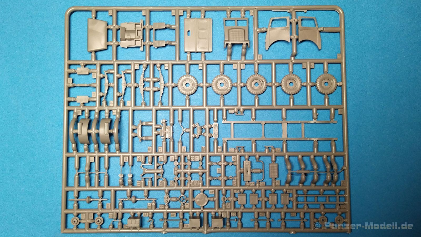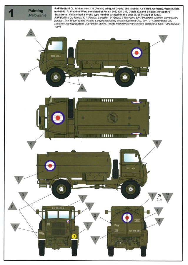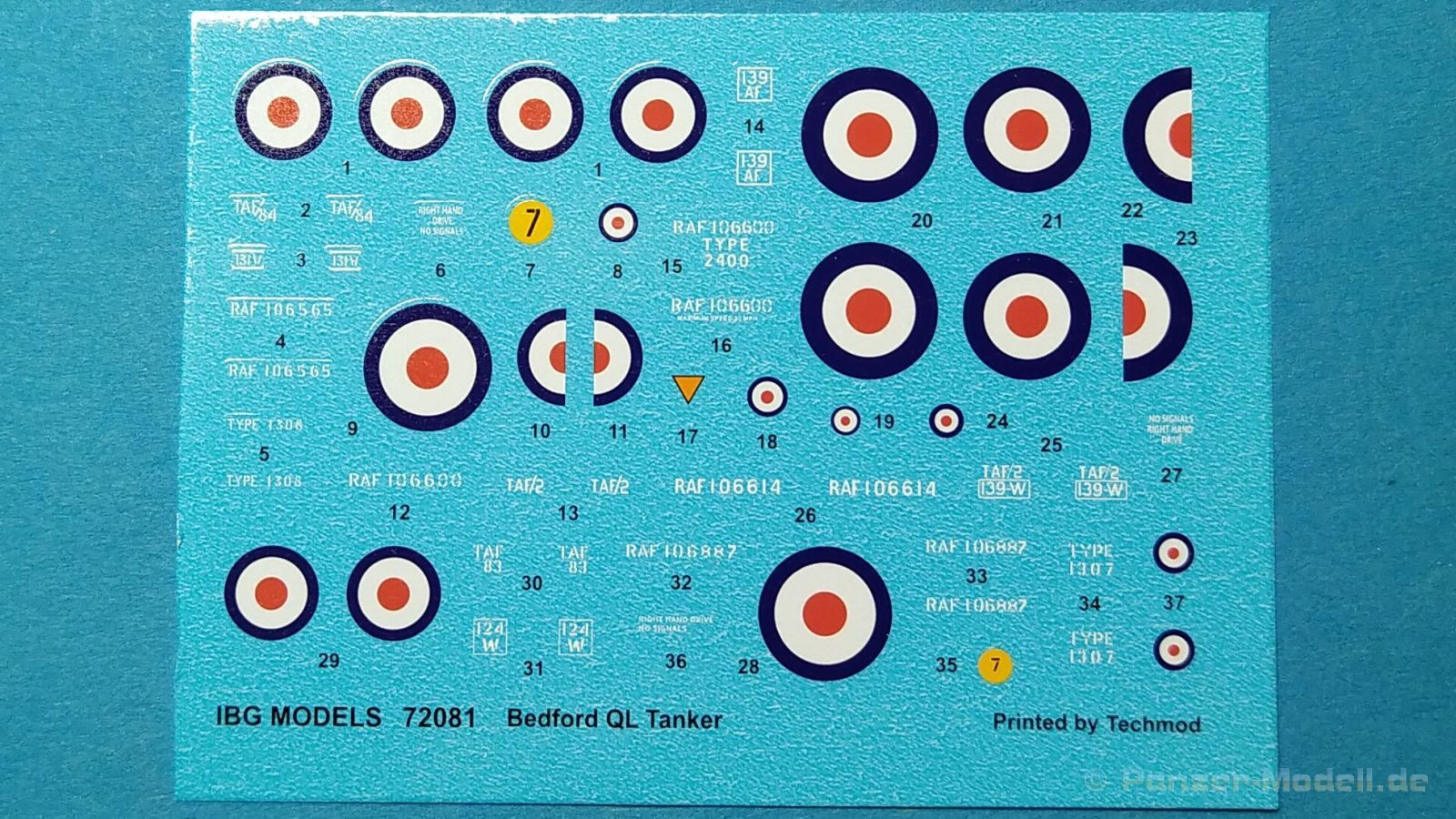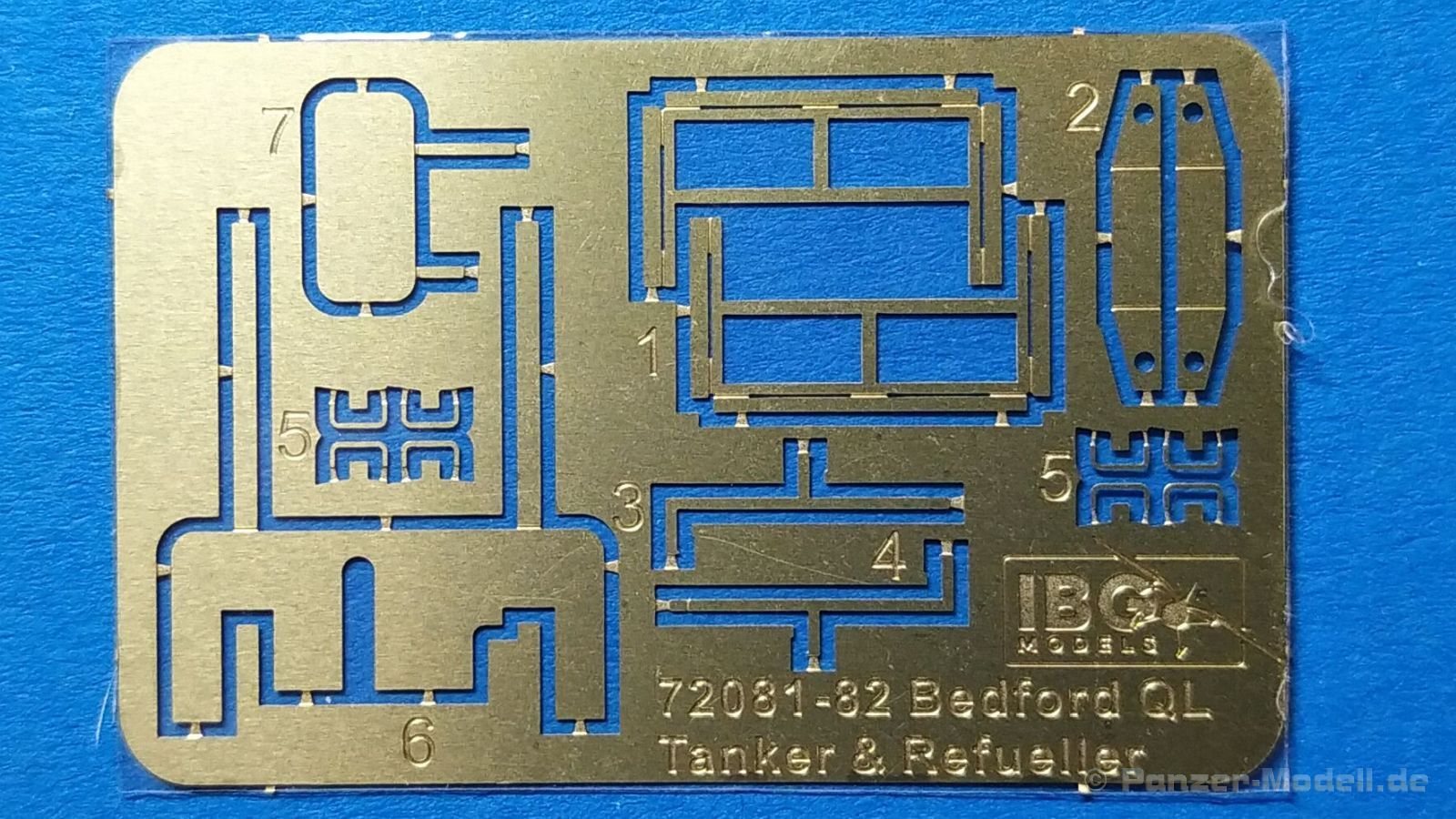 Der erste Bausatz dieses Lkw erschien bereits 2008 unter der Bausatznummer 72001 bei diesem Hersteller. Es folgten weitere Varianten zuletzt der Bedford QL Refueller. Und nun kommt die Version als Tanker. Basis dieses Tankwagens ist der bekannte britische Lkw Bedford QL mit Allradantrieb und 3 Tonnen Nutzlast. Zwischen 1941 und 1945 wurden insgesamt 52.000 Lkw dieser Baureihe in verschiedenen Varianten hergestellt. Die Fahrzeuge wurden von einem Bedford-Benzinmotor mit einem Hubraum von 3,5 Litern und 72 PS angetrieben. Nun aber zum Modell. Ein Blick in den Stülpkarton (30 x 20 x 4,5cm) offenbart den folgenden Inhalt: - 1 Bauanleitung mit ausführlichen Schritt-für-Schrittanleitungen in 19 Baustufen und 4 Farb- und Markierungsvarianten am Ende - 1 Spritzling (ohne Bezeichnung) in grauem Kunststoff mit Teilen für das eigentliche Fahrgestell inkl. Rädern und Kabine - 1 Spritzling (A) in grauem Kunststoff mit Teilen für den Tankaufbau - 2 Spritzling (C) in grauem Kunststoff mit Zubehörteilen für die Tankanlage wie Trichter, etc. - 2 Spritzling (D) in grauem Kunststoff mit Zubehörteilen für die Tankanlage - 1 Platine mit Fotoätzteilen - 1 Klarsichtbogen für die Fenster der Kabine - 1 Decalbogen auf blauem Papier mit 4 verschiedenen Markierungsvarianten Wie von IBG gewohnt, ist Aufbau des Bausatzes, die Detailierung und Gravierung der Teile gut umgesetzt. Die Angüsse sind so gewählt, dass man diese gut entfernen kann. Fischhäute sind nur sehr vereinzelt an den Bauteilen zu finden, lassen sich aber schnell und unproblematisch mit einem scharfen Messer entfernen. Auf den Bauteilen sind keine nennenswerten Auswerfermarken auf später sichtbaren Stellen zu sehen. Der Bau startet mit dem Rahmen, der einteilig vorliegt. Dies ist sehr modellbauerfreundlich, da hier keine mühseligen Ausrichtarbeiten vorgenommen werden müssen. Im Anschluss werden die Blattfederpakete ergänzt und dann sind wir schon bei den Starrachsen und Rädern. Auch hier liegen die Räder einteilig bei, was den Bau sehr erleichtert. Danach werden in den folgenden Baustufen Motor, Antriebswellen und Auspuff ergänzt. Den Abschluss des Fahrgestells bildet der Einbau von Kühler und Stoßstange in Baustufe 5. In den Baustufen 6 bis 10 wird das Fahrerhaus mit Inneneinrichtung komplettiert. Nach Zusammensetzen von Fahrerkabine und Fahrgestell in Baustufe 11 folgt schon ab Baustufe 12 der eigentliche Tankaufbau. In Baustufe 17 ist dieser dann fertig und wird im Folgenden auf das Fahrgestell gesetzt. Als letztes werden dann in Baustufe 19 noch einige Teile der Auspuffanlage und das Hitzeschutzblech an der Unterseite des Fahrgestells ergänzt. Ein Lenkeinschlag ist von den Bauteilen her leider nicht vorgesehen und auch das offen darstellen der Türen ist trotz Inneneinrichtung nicht möglich. Diese beiden Punkte sind aber bei dem aufgerufenen Preis völlig akzeptabel. Der Einsatz von Fotoätzteilen ist nur auf das nötigste bzw. sinnvollste beschränkt. Hier sind vor allem dünne Bleche / Rahmen als Ätzteil vorgesehen, die sehr zur feinen Detaillierung des Bausatzes beitragen. Die Bauanleitung ist zweisprachig ausgelegt. Es gibt Hinweise in polnischer und englischer Sprache. Sie ist sehr detailliert und übersichtlich aufgebaut. Zu Beginn findet man eine Übersicht der enthaltenen Decals und Fotoätzteile sowie Farbangaben für die Hersteller Vallejo, Hataka, Life Color, Mr. Hobby, und AK Interactive. Im Weiteren folgt dann eine Übersicht der enthaltenen Gießäste. Danach folgt die eigentliche Bauanleitung, die sich in 19 Baustufen gliedert. Hier wird pro Baustufe anhand von einfarbigen 3D-Zeichnungen Schritt für Schritt der Weg zum fertigen Modell dargestellt bzw. erklärt. Den Abschluss der Anleitung bilden vier verschiedene Bemalungs- und Markierungsvarianten. Folgende Markierungs- bzw. Bemalungsvarianten sind in der Bauanleitung dargestellt: - RAF Bedford QL Tanker vom 131 (Polnischen) Geschwader, 84 Gruppe, 2nd Tactical Air Force, Deutschland, Varrelbusch, Mitte 1945. Zu dieser Zeit bestand das Geschwader aus der polnischen 302, 308, 317, der niederländischen 322 und der belgischen 349 Spitfire Staffel. Farbgebung: einfarbig oliv drab - RAF Bedford QL Tanker, 139 Fluggelände (umbenannt zum 139 Geschwader am 12. Mai 1944), 2 Gruppe, 2nd Tactical Air Force, England, Dunsfold, Frühling 1944. Die Einheit bestand aus der britischen 98, 180 und niederländischen 320 Staffel, die mit Mitchell Bombern ausgestattet waren. Farbgebung: Braun mit Tarnung in Blau-Schwarz - RAF Bedford QL Tanker, 139 Geschwader, 2 Gruppe, 2nd Tactical Air Force, Belgien, Melsbroek, März 1945. Die Einheit bestand aus der britischen 98, 180 und niederländischen 320 Staffel, die mit Mitchell Bombern ausgestattet waren. Farbgebung: einfarbig Oliv drab - RAF Bedford QL Tanker, 124 Geschwader, 83 Gruppe, 2nd Tactical Air Force, Niederlande, Eindhoven, Herbst 1944. Die Einheit bestand aus der britischen 137, 181, 182 und 247 Staffel, die mit Typhoon Jagdbombern ausgestattet waren. Farbgebung: Oliv drab mit Tarnung in Blau-Schwarz Die Decals kommen auf einem hellblauen Trägerpapier daher, worauf man gut die einzelnen Elemente finden kann. Augenscheinlich fällt kein Versatz beim Druck auf. Mein Fazit: IBG bringt mit dieser weiteren Variante seiner britischen Bedford QL-Reihe wieder einmal ein schön umgesetztes Lkw Modell auf den Markt was gerade die Flugzeugmodellbauer hinsichtlich einer möglichen Dioramengestaltung erfreuen wird. Die Detaillierung und Aufteilung der Bauteile wissen zu gefallen. Sicherlich ist der Basisbausatz nicht mehr so fein detailliert wie aktuellere Bausätze desselben Herstellers, wie z.B. dem italienischen 3Ro. Dafür ist der Preis aber auch deutlich günstiger und für die dargebotene Zusammenstellung von Spritzgussteilen und Fotoätzteilen absolut in Ordnung. Der Aufbau und die Detailierung des Bausatzes lassen viel Bastelspaß erwarten und führen zu einem fein detaillierten Modell. Wenn auch der Einsatz der Fotoätz