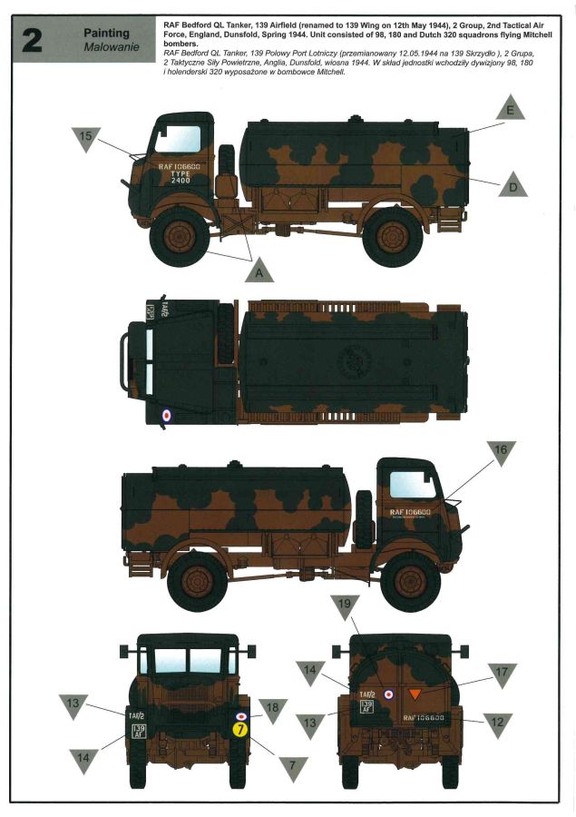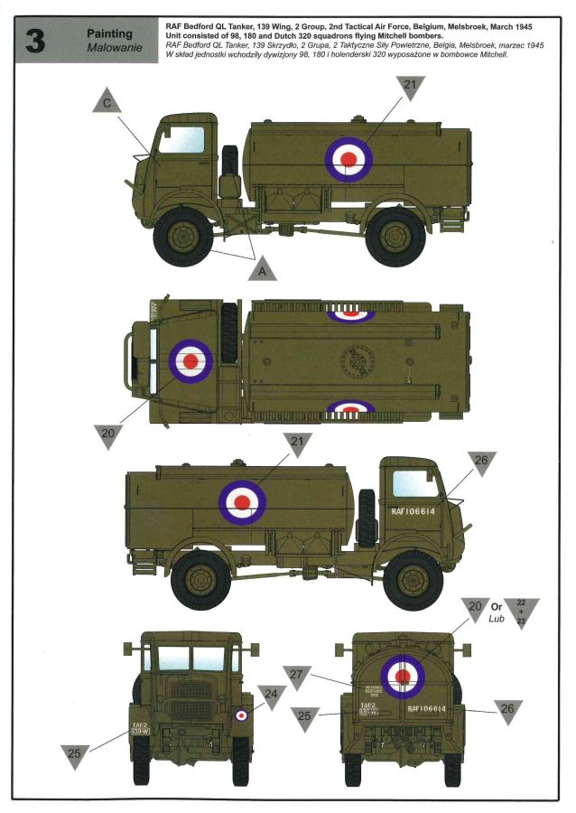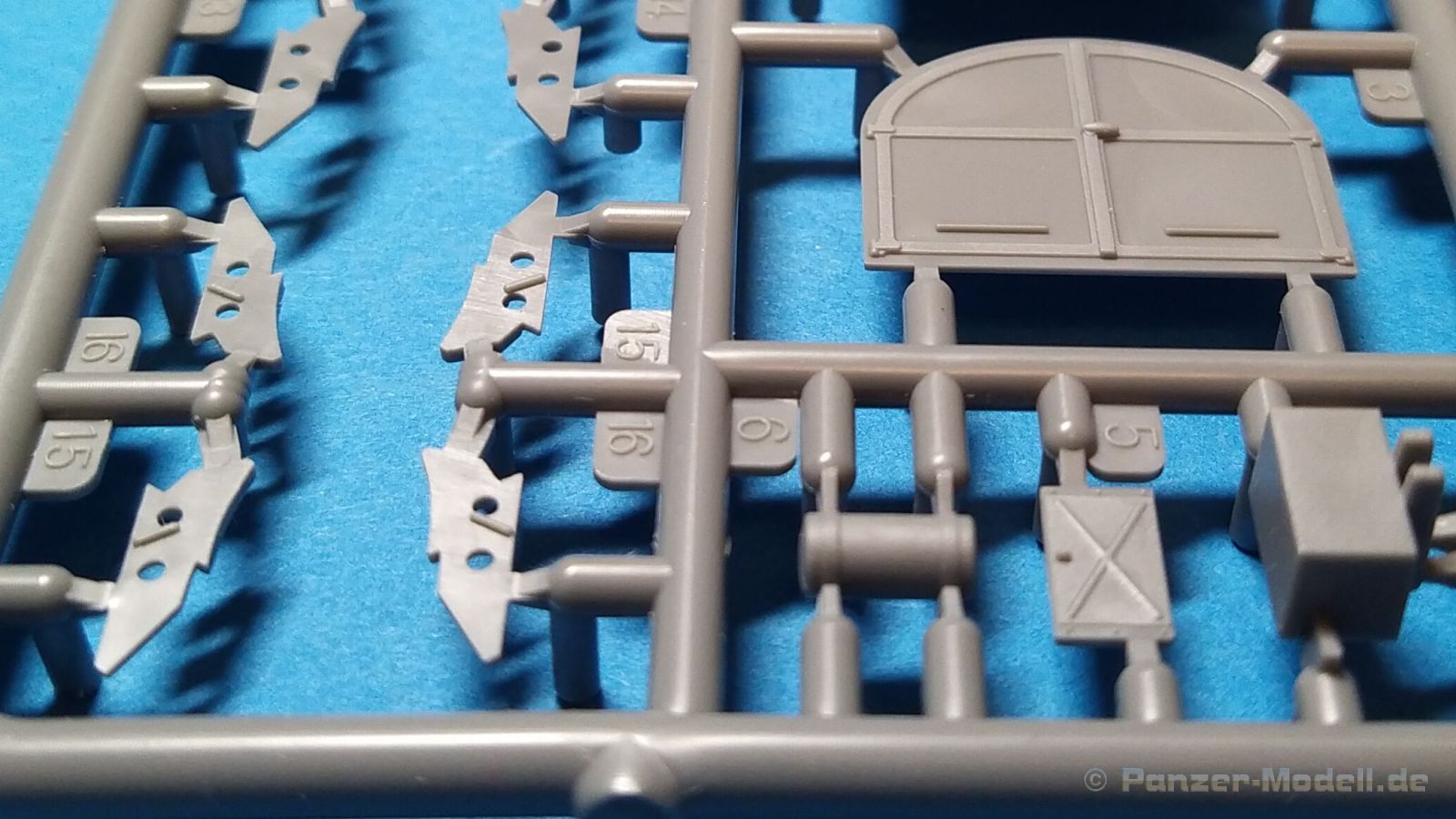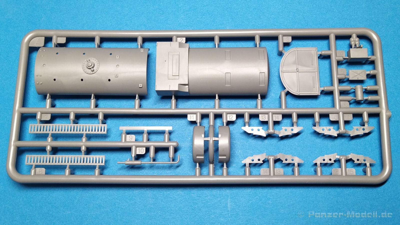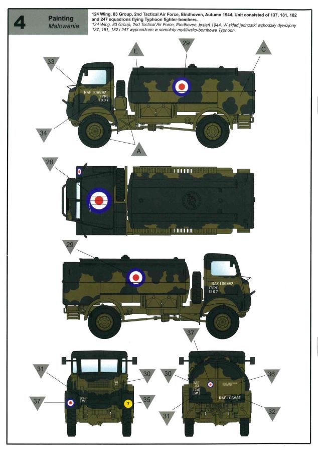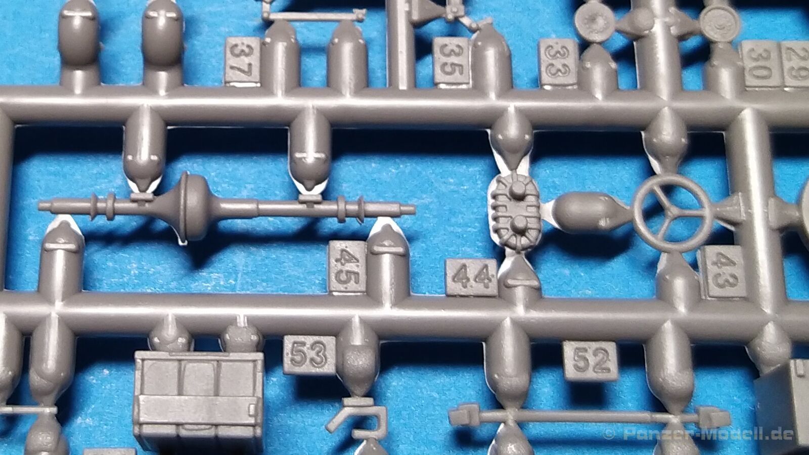 Der erste Bausatz dieses Lkw erschien bereits 2008 unter der Bausatznummer 72001 bei diesem Hersteller. Es folgten weitere Varianten zuletzt der Bedford QL Refueller. Und nun kommt die Version als Tanker. Basis dieses Tankwagens ist der bekannte britische Lkw Bedford QL mit Allradantrieb und 3 Tonnen Nutzlast. Zwischen 1941 und 1945 wurden insgesamt 52.000 Lkw dieser Baureihe in verschiedenen Varianten hergestellt. Die Fahrzeuge wurden von einem Bedford-Benzinmotor mit einem Hubraum von 3,5 Litern und 72 PS angetrieben. Nun aber zum Modell. Ein Blick in den Stülpkarton (30 x 20 x 4,5cm) offenbart den folgenden Inhalt: - 1 Bauanleitung mit ausführlichen Schritt-für-Schrittanleitungen in 19 Baustufen und 4 Farb- und Markierungsvarianten am Ende - 1 Spritzling (ohne Bezeichnung) in grauem Kunststoff mit Teilen für das eigentliche Fahrgestell inkl. Rädern und Kabine - 1 Spritzling (A) in grauem Kunststoff mit Teilen für den Tankaufbau - 2 Spritzling (C) in grauem Kunststoff mit Zubehörteilen für die Tankanlage wie Trichter, etc. - 2 Spritzling (D) in grauem Kunststoff mit Zubehörteilen für die Tankanlage - 1 Platine mit Fotoätzteilen - 1 Klarsichtbogen für die Fenster der Kabine - 1 Decalbogen auf blauem Papier mit 4 verschiedenen Markierungsvarianten Wie von IBG gewohnt, ist Aufbau des Bausatzes, die Detailierung und Gravierung der Teile gut umgesetzt. Die Angüsse sind so gewählt, dass man diese gut entfernen kann. Fischhäute sind nur sehr vereinzelt an den Bauteilen zu finden, lassen sich aber schnell und unproblematisch mit einem scharfen Messer entfernen. Auf den Bauteilen sind keine nennenswerten Auswerfermarken auf später sichtbaren Stellen zu sehen. Der Bau startet mit dem Rahmen, der einteilig vorliegt. Dies ist sehr modellbauerfreundlich, da hier keine mühseligen Ausrichtarbeiten vorgenommen werden müssen. Im Anschluss werden die Blattfederpakete ergänzt und dann sind wir schon bei den Starrachsen und Rädern. Auch hier liegen die Räder einteilig bei, was den Bau sehr erleichtert. Danach werden in den folgenden Baustufen Motor, Antriebswellen und Auspuff ergänzt. Den Abschluss des Fahrgestells bildet der Einbau von Kühler und Stoßstange in Baustufe 5. In den Baustufen 6 bis 10 wird das Fahrerhaus mit Inneneinrichtung komplettiert. Nach Zusammensetzen von Fahrerkabine und Fahrgestell in Baustufe 11 folgt schon ab Baustufe 12 der eigentliche Tankaufbau. In Baustufe 17 ist dieser dann fertig und wird im Folgenden auf das Fahrgestell gesetzt. Als letztes werden dann in Baustufe 19 noch einige Teile der Auspuffanlage und das Hitzeschutzblech an der Unterseite des Fahrgestells ergänzt. Ein Lenkeinschlag ist von den Bauteilen her leider nicht vorgesehen und auch das offen darstellen der Türen ist trotz Inneneinrichtung nicht möglich. Diese beiden Punkte sind aber bei dem aufgerufenen Preis völlig akzeptabel. Der Einsatz von Fotoätzteilen ist nur auf das nötigste bzw. sinnvollste beschränkt. Hier sind vor allem dünne Bleche / Rahmen als Ätzteil vorgesehen, die sehr zur feinen Detaillierung des Bausatzes beitragen. Die Bauanleitung ist zweisprachig ausgelegt. Es gibt Hinweise in polnischer und englischer Sprache. Sie ist sehr detailliert und übersichtlich aufgebaut. Zu Beginn findet man eine Übersicht der enthaltenen Decals und Fotoätzteile sowie Farbangaben für die Hersteller Vallejo, Hataka, Life Color, Mr. Hobby, und AK Interactive. Im Weiteren folgt dann eine Übersicht der enthaltenen Gießäste. Danach folgt die eigentliche Bauanleitung, die sich in 19 Baustufen gliedert. Hier wird pro Baustufe anhand von einfarbigen 3D-Zeichnungen Schritt für Schritt der Weg zum fertigen Modell dargestellt bzw. erklärt. Den Abschluss der Anleitung bilden vier verschiedene Bemalungs- und Markierungsvarianten. Folgende Markierungs- bzw. Bemalungsvarianten sind in der Bauanleitung dargestellt: - RAF Bedford QL Tanker vom 131 (Polnischen) Geschwader, 84 Gruppe, 2nd Tactical Air Force, Deutschland, Varrelbusch, Mitte 1945. Zu dieser Zeit bestand das Geschwader aus der polnischen 302, 308, 317, der niederländischen 322 und der belgischen 349 Spitfire Staffel. Farbgebung: einfarbig oliv drab - RAF Bedford QL Tanker, 139 Fluggelände (umbenannt zum 139 Geschwader am 12. Mai 1944), 2 Gruppe, 2nd Tactical Air Force, England, Dunsfold, Frühling 1944. Die Einheit bestand aus der britischen 98, 180 und niederländischen 320 Staffel, die mit Mitchell Bombern ausgestattet waren. Farbgebung: Braun mit Tarnung in Blau-Schwarz - RAF Bedford QL Tanker, 139 Geschwader, 2 Gruppe, 2nd Tactical Air Force, Belgien, Melsbroek, März 1945. Die Einheit bestand aus der britischen 98, 180 und niederländischen 320 Staffel, die mit Mitchell Bombern ausgestattet waren. Farbgebung: einfarbig Oliv drab - RAF Bedford QL Tanker, 124 Geschwader, 83 Gruppe, 2nd Tactical Air Force, Niederlande, Eindhoven, Herbst 1944. Die Einheit bestand aus der britischen 137, 181, 182 und 247 Staffel, die mit Typhoon Jagdbombern ausgestattet waren. Farbgebung: Oliv drab mit Tarnung in Blau-Schwarz Die Decals kommen auf einem hellblauen Trägerpapier daher, worauf man gut die einzelnen Elemente finden kann. Augenscheinlich fällt kein Versatz beim Druck auf. Mein Fazit: IBG bringt mit dieser weiteren Variante seiner britischen Bedford QL-Reihe wieder einmal ein schön umgesetztes Lkw Modell auf den Markt was gerade die Flugzeugmodellbauer hinsichtlich einer möglichen Dioramengestaltung erfreuen wird. Die Detaillierung und Aufteilung der Bauteile wissen zu gefallen. Sicherlich ist der Basisbausatz nicht mehr so fein detailliert wie aktuellere Bausätze desselben Herstellers, wie z.B. dem italienischen 3Ro. Dafür ist der Preis aber auch deutlich günstiger und für die dargebotene Zusammenstellung von Spritzgussteilen und Fotoätzteilen absolut in Ordnung. Der Aufbau und die Detailierung des Bausatzes lassen viel Bastelspaß erwarten und führen zu einem fein detaillierten Modell. Wenn auch der Einsatz der Fotoätz