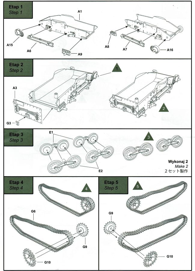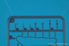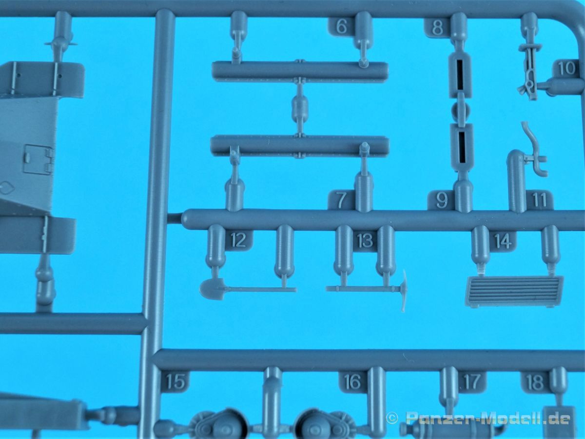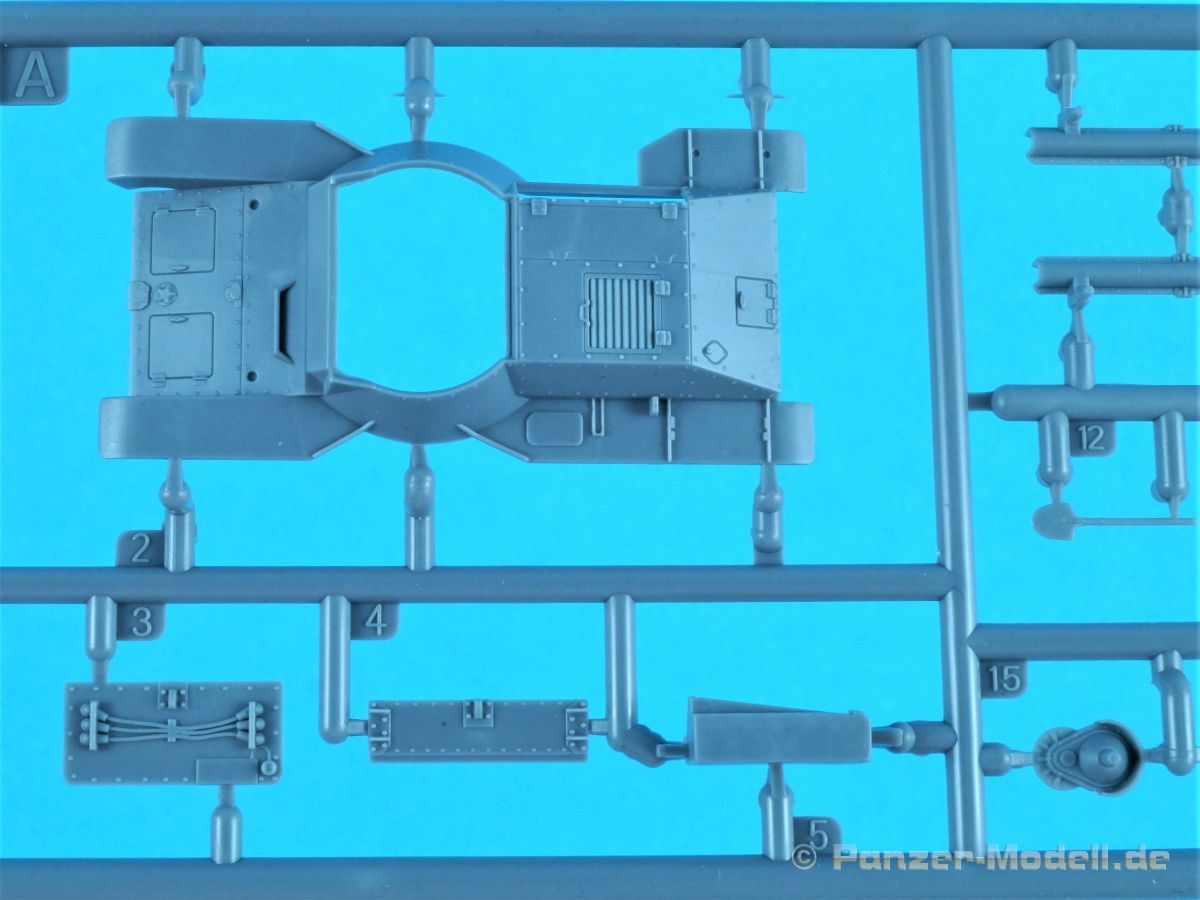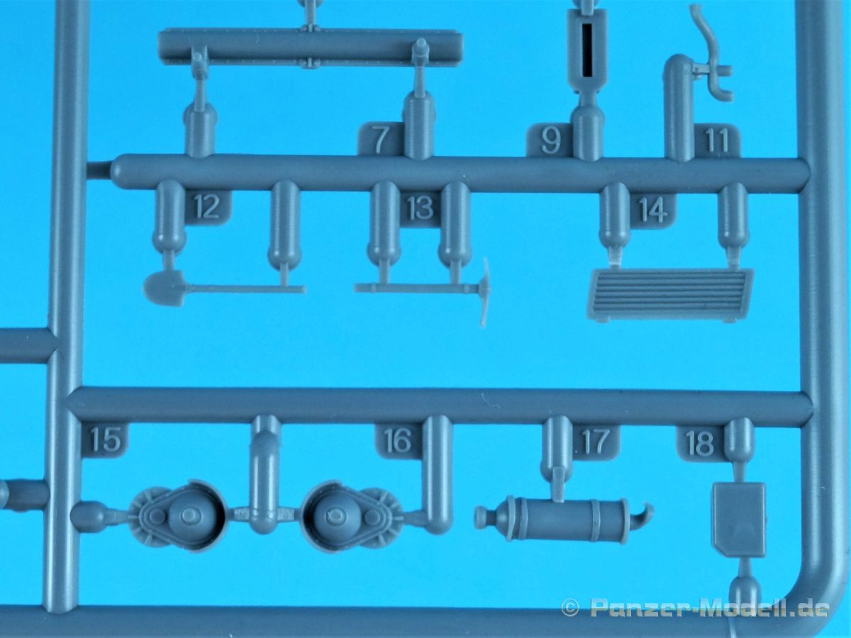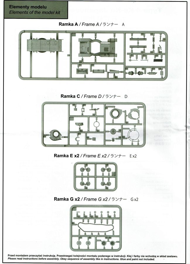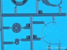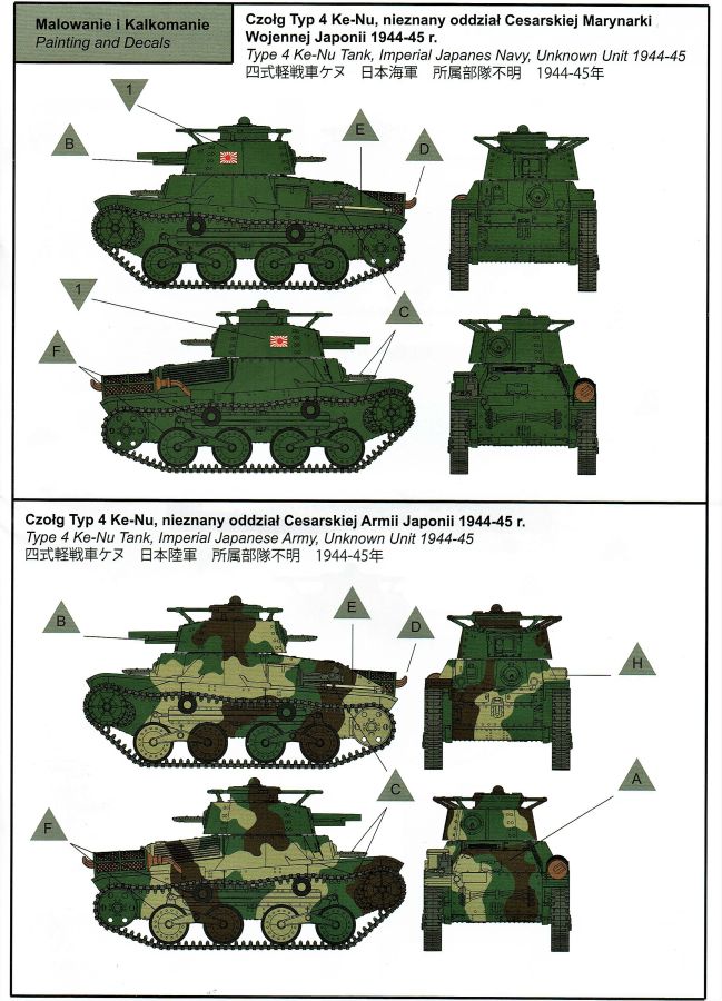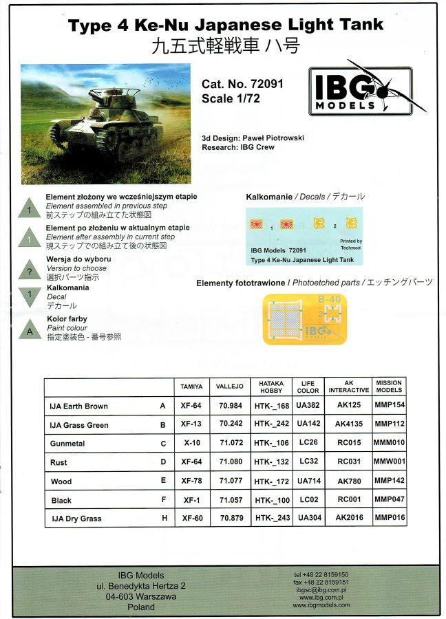 Und wieder etwas für die Freunde des kleinen Massstabs. Der Ke-Nu war eine Kombination von Wannen des Ha-Go und Türmen des Chi-Ha. Ab Ende 1944 wurden rund 100 Stück gebaut und als Type 4 Ke-Nu in Dienst gestellt. Definitiv haben wir wieder einmal einen Exoten auf dem Tisch… Der für IBG typische Stülpkarton (30 x 20 x 4,5 cm) beherbergt sechs graue Spritzlinge, eine kleine PE-Platine, Decals und die Bauanleitung. Die Teile sind wieder absolut sauber gespritzt. Grat oder Verzug findet sich nicht und die Auswerfermarkierungen sind wieder auf den Rahmen platziert. Fischhäute sucht man ebenfalls vergebens. Alles sehr filigran, wobei aber auch die Details durchaus sehr scharf und genau wiedergegeben sind. Im Rahmen A finden sich Ober- und Unterwanne des Panzers. Dazu noch Teile des Antriebs- und die Auspuffanlage. Gleichfalls verschiedene Bordwerkzeuge. Turmteile gibt es im Rahmen C zu entdecken. Hier finden sich auf den Bauteilen allerfeinste Nieten. Auch die filigrane Antenne am Turm ist sehr gut reproduziert. Die Rahmen E und G (jeweils zwei mal vorhanden) enthalten das komplette Laufwerk. Die Kette ist einteilig und die Laufrollen sind, wo möglich, bereits in einer kleinen Guppe zusammengefasst. Sehr gut umgesetzt. Seidenmatt und ohne Trägerrand kommen die winzigen Decals daher. Gemäß Anleitung sind drei Fahrzeuge darstellbar: Imperiale japanische Navy, unbekannte Einheit 1944-45, einfarbig // Imperiale japanische Armee, unbekannte Einheit 1944-45, Flecktarn // Imperiale japanische Armee, Kyushu 1945, Flecktarn. (s.a. Bilder) Die Bauanleitung erstreckt sich über acht Seiten im A4 Format. Die kurzen Beschreibungen sind wie üblich polnisch und enlisch. Dazu japanisch??? Auf der ersten Seite finden sich neben Bauhinweisen noch Angaben zu den Farbherstellern. Das sind Tamiya, Vallejo, Hataka, Lifecolor, AK Interactice und Mission Models. Ebenfalls aufgeführt sind die Decals und die PEs. Die Übersicht aller Teile gibt es auf der zweiten Seite. Ab Seite drei wird der Bau des Kits in insgesamt 15 sinnvollen Schritten beschrieben. Diesmal in übersichtlichen Zeichnungen. Das alles ist sehr gut dargestellt und sollte keine Fragen aufwerfen. Die Anbringung der Decals und die Bemalungsanleitung von den drei Fahrzeugen finden wir auf den letzten Seiten. Ein interessanter kleiner Panzer zum kleinen Preis! Und wenn ich schreibe „kleiner“ Panzer, dann trifft das auf den Ke-Nu durchaus zu. Nicht ganz sechs(!) Zentimeter misst der „Kleine“… J Hauptaugenmerk dürfte bei der Bemalung liegen, denn die Paßgenauigkeit ist bei IBG absolut in Ordnung.