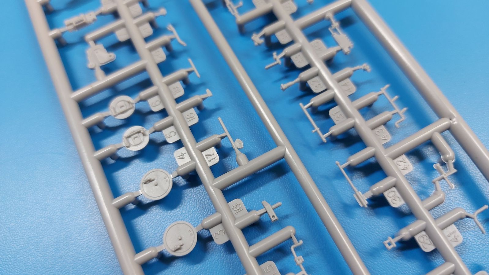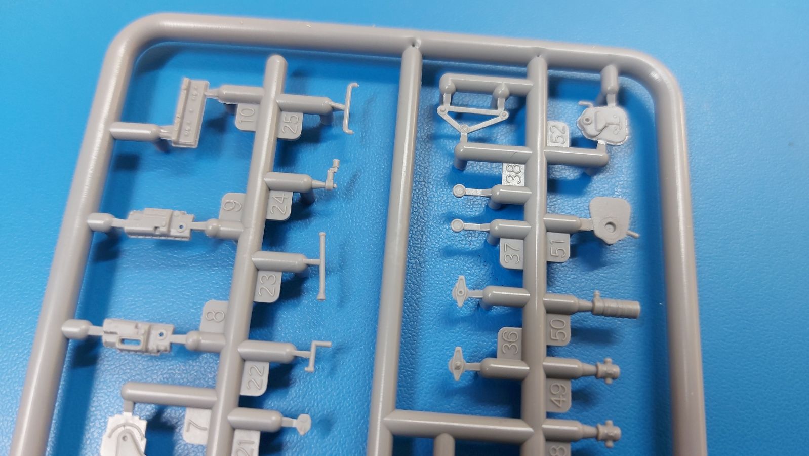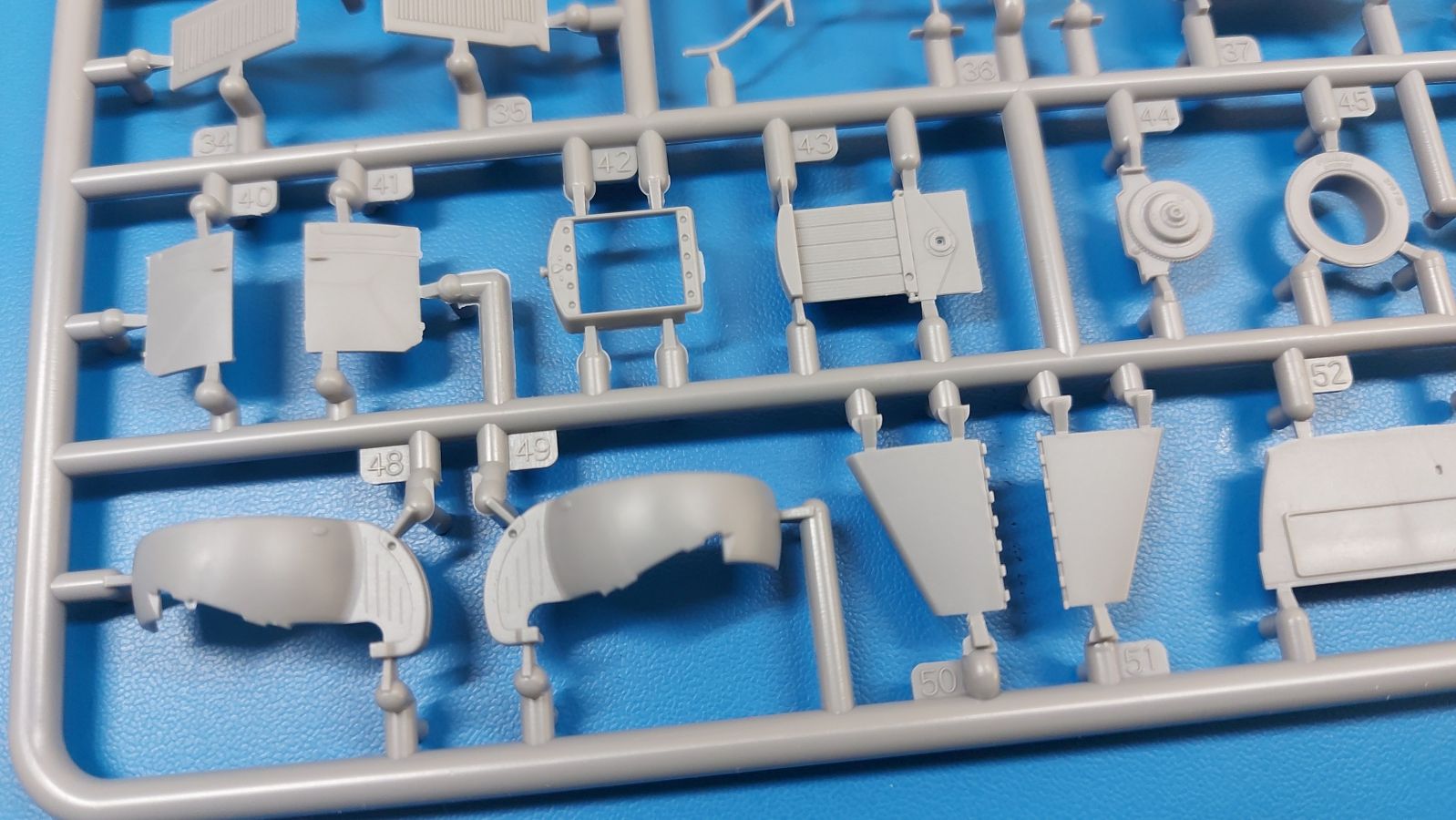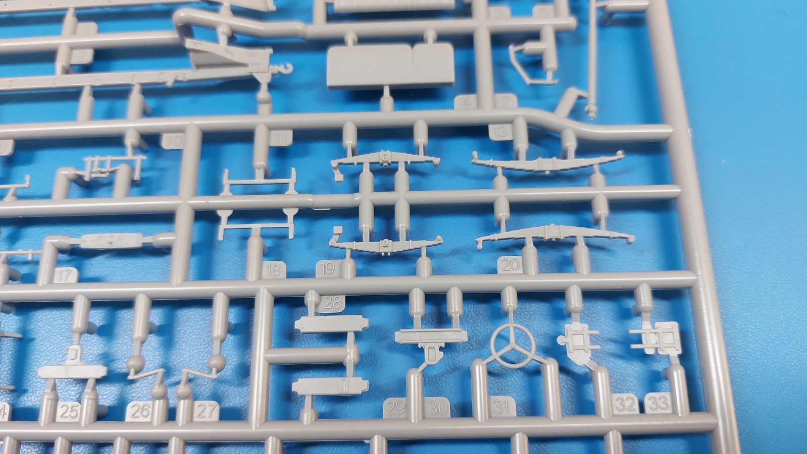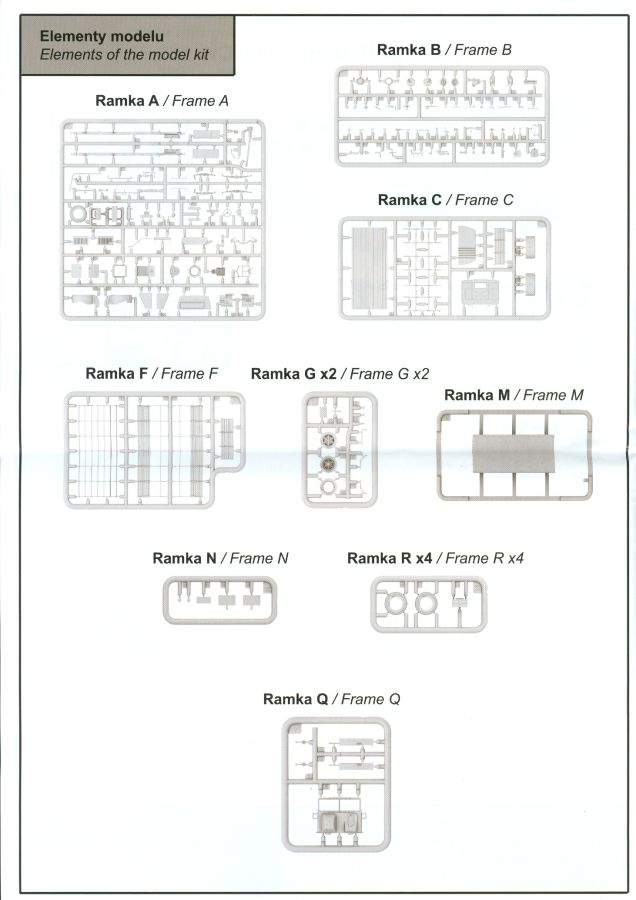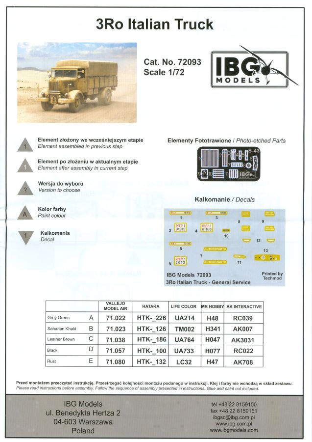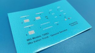 Die Decals sind wie gewohnt seidenmatt ohne Trägerrand. Ob man es glaubt oder nicht, auch für die Armaturen sind winzige Decals dabei. Zudem findet sich auch ein Typschild, nur geht die Bauanleitung nicht auf die Anbringung der Innendecals ein. Die Bauanleitung im ca. A4 Format hat 12 Seiten und ist in schwarz-weiß mit farbigen Akzenten gehalten. Kurze Beschreibungen oder Anleitungen sind in Polnisch und in Englisch gehalten. Die erste Seite startet mit Zeichenerklärungen, PE- und Decalübersicht, sowie den benötigten Farben und gibt Farbnummern für Vallejo Model Air, Hataka, Life Color, Mr. Hobby und AK Interactive an. Die Teile- und Spritzlingübersicht findet sich Seite 2. Der Bau des Fahrzeugs wird in 33 sinnvoll aufgeteilten, leicht verständlichen Schritten mit ausreichend großen Zeichnungen erklärt. Einzelne Baugruppen, die in einem späteren Bauschritt verbaut werden, erhalten eine weiße Nummer in einem Dreieck. Bei Verwendung der Baugruppe erscheint das Dreieck wieder, dann in schwarzer Schrift. Die Anbringung der Decals und die Bemalungsanleitung für die drei Fahrzeuge finden sich auf den letzten Seiten. Ich kann mich nicht des Eindrucks erwehren, dass IBG seinen hervorragenden 1:35-er 3Ro auf 1:72 herunterskaliert hat, denn die Teile- und Detailvielfalt ist dem großen Bruder sehr ähnlich. Und das ohne Qualitätseinbuße! Winzige Plastik- (z.B. Pedale und Bedienknöpfe) und PE-Teile (z.B. Scheibenwischer, Haubenriegel) erfordern Modellbauerfahrung. Ein Lkw-Modell mit Wow-Effekt, den ohne Weiteres empfehlen kann.