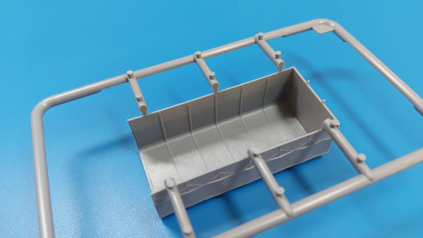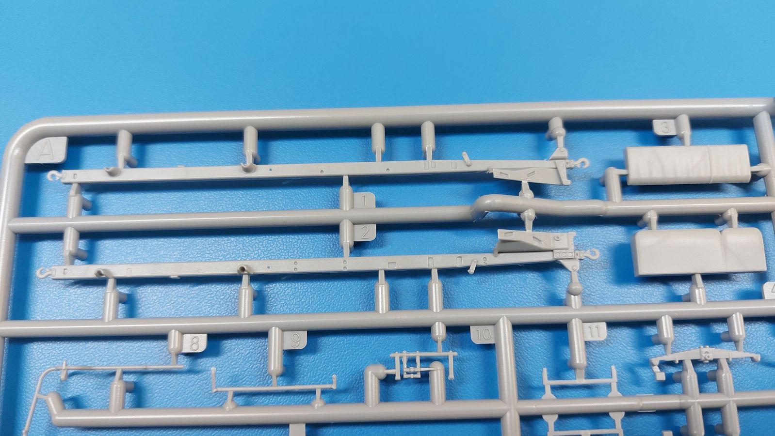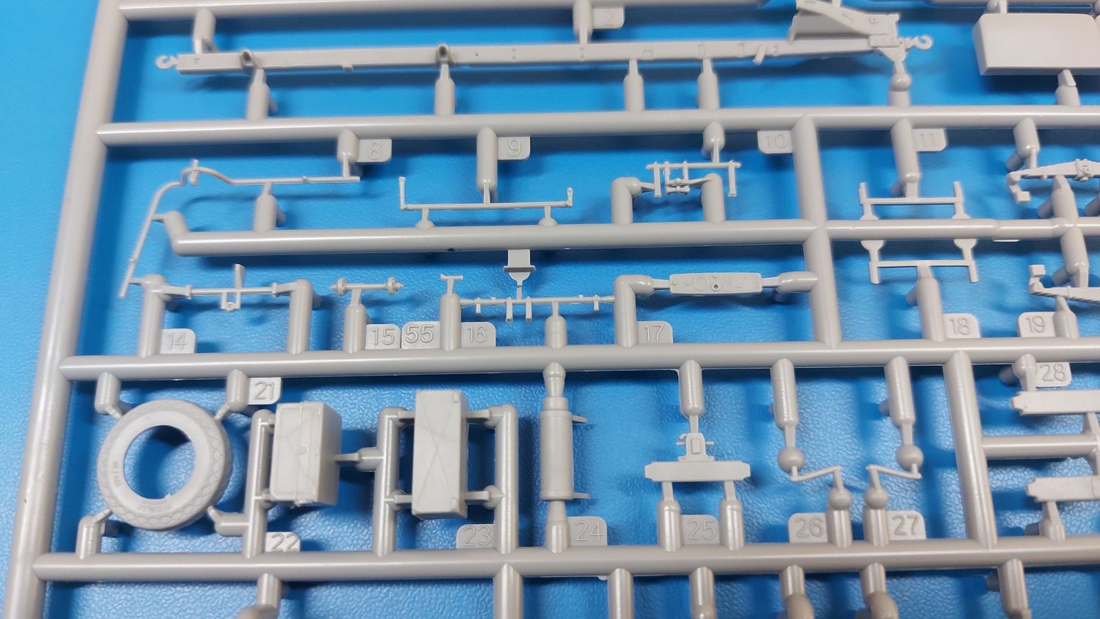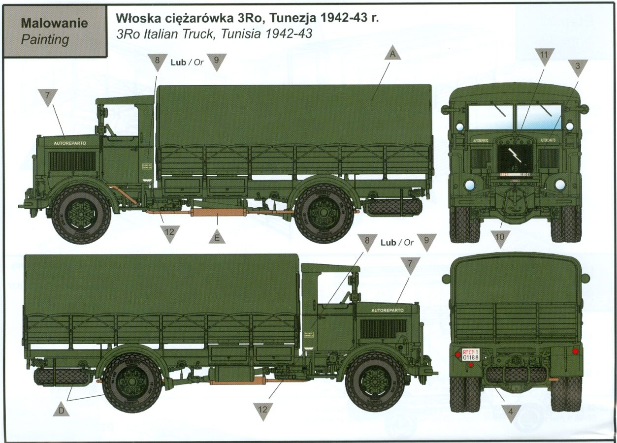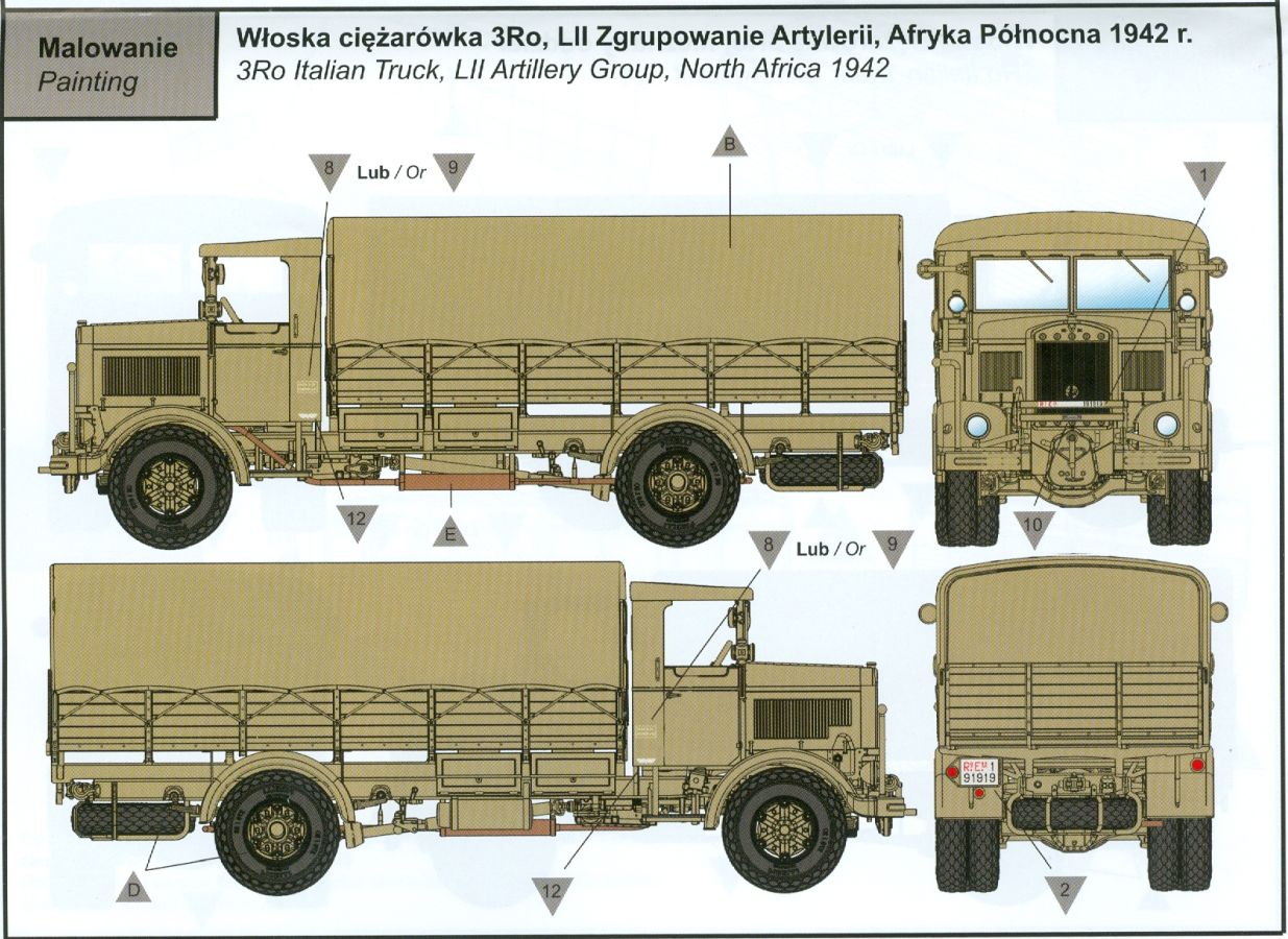 Das Original Der Lancia 3RO war ein schwerer, italienischer Lkw, basierend auf dem Lancia RO. Er wurde ab 1939 bis 1950 produziert und war bis in die 1960-er Jahre im Einsatz. Mit seinem 93 PS Motor konnte er bis zu 45 km/h erreichen. Als Truppentransporter konnte er bis zu 32 Soldaten transportieren. Es wurden aber auch Panzer und Pferde befördert. Der Lancia fand sowohl zivile als auch militärische Abnehmer. Neben der italienischen Armee nutzte ihn auch die deutsche Wehrmacht. Der Bausatz: In 1:35 hat IBG bereits mehrere Lancia 3Ro herausgebracht. Nun bekommt man ihn auch als 1:72-er Modell, das dem großen Bruder in nichts nachsteht. Der Karton mit Stülpdeckel ist 300 x 200 x 45 mm groß. Darin finden wir 12 graue, 1 klaren Spritzlinge, 1 PE-Platine, Decals und die Bauanleitung. Die Teile aus grauem Plastik sind sauber ausgespritzt, ohne Grat und Versatz. Angüsse sind so gesetzt, dass Details nicht beeinträchtigt werden. Störende Auswerferspuren sind mir so nicht aufgefallen, vielleicht nur ganz flach innerhalb der Plane. Also, alles in allem sollte man die Teile vom Spritzling ohne viel Nacharbeit trennen können. Fahrgestell: Ein eingängiges Studium der Bauanleitung kann ich nur ans Herz legen, denn der Kleine (1:72) ist dem Großen (1:35) von der Aufteilung her sehr ähnlich. Der Rahmen besteht aus separaten Längs- und Querträgern. Auch ein nicht so erfahrener Modellbauer sollte einen verwindungsfreien Rahmen hinbekommen, denn die Träger sind so geformt, dass sie nach dem Zusammenbau die entsprechende Stabilität gewährleisten. Der Kühler ist gleich im vorderen Querträger integriert. In der Vorderachse sind bereits viele Details integriert, so dass nur noch das Lenkgestänge angebaut werden müssen. Leider kann man die Räder nur in Geradeausstellung montieren. Auch die Hinterachse ist gut detailliert. Zusätzliche Spiralfedern sind bereits angegossen. Die großen Blattfedern vorn wie hinten sind sauber strukturiert. Die Räder sind gut gelungen. Das Profil ist gut getroffen. An den Seitenwänden sieht man deutlich den Herstelleraufdruck PIRELLI und die Reifengröße, das SUPERFLEX unter dem Pirelli Schriftzug erkennt man nur im Makrobereich. Die Felgen sind mit entsprechenden Durchbrüchen versehen. Das Ersatzrad besteht nur aus Felgentrommel und Lauffläche und ruht in einem 3-teiligen Gestell am Heck des Rahmens. 2 PE Gurte sichern das Rad gegen Herausrutschen. Im vorderen Drittel des Rahmens sitzt das sehr detailreiche Getriebe, ausgestattet mit Kardanwelle und Öleinfüllstutzen. Genoppte Trittbleche für das Fahrerhaus werden auch am Rahmen befestigt. Im hinteren Querträger sitzt die Anhängekupplung mit angegossenem Kupplungsbolzen. Der mehrteilige Auspuff wird im Rahmen verlegt und mit einigen PE-Teilen gesichert. Motor: Der Dieselmotor ist ein kleines Modell für sich. Der hohe Motorblock des 5-Zylinder Diesel mit seinen Einspritzdüsen im Zylinderkopf fällt ebenso ins Auge wie die als Ölkühler ausgelegte und somit mit vielen Kühlrippen versehene Ölwanne. Lichtmaschine, Einspritzpumpe, Keilriemen, Lüfterrad, Zuluft- und Kühlleitungen, Abgaskrümmer und Öleinfüllstutzen sind weitere Details. Fahrerhaus: Die Auslegung des Fahrerhauses als Rechtslenker machte mich stutzig. In Italien gab es bis in die 1920-Jahre eine regional unterschiedliche Regelung mit Rechts- und Linksverkehr, welches eine Erklärung sein könnte, allerdings wurde der Lancia 3Ro erst ab 1938 entwickelt. Das Fahrerhaus ist viele Einzelteile aufgebrochen. Die Rückwand hat außen etliche Versteifungsrippen und einen Durchbruch für das Klarsichtfenster zur Ladefläche hin. Innen wird die durchgehende Rückenlehne angebracht. Die schmalen Seitenwände haben um unteren Ende Stangen zur Aufhängung der Trittbleche. Hier sollte man beim Hantieren aufpassen, um die Stangen nicht bereits vor der Montage des Fahrerhauses auf dem Rahmen abzubrechen. Der Boden nimmt die einteilige Sitzbank auf, deren Darstellung aber eine Trennung zwischen Fahrer- und Beifahrersitz aufweist. Der Fahrer hat tatsächlich auf dem Tank gesessen, denn rechts von seinem Sitz schaut der Einfüllstutzen heraus. Schalt- und Handbremshebel werden ebenfalls auf den Boden geklebt. Die Fahrerhausfront ist auch beidseitig detailliert. Bereits angegossen sind die Halterungen mit den Winkern. Außen wird der Luftfilter mittels PE-Halterung montiert und über die Zuluftleitung mit dem Motor verbunden. Innen finden sich Kupplungs-, Brems- und Gaspedal, Lenkstange und -rad, Armaturentafel, kleine Bedienhebel und Haltebügel für den/die Beifahrer. Beidseitig detaillierte Türen können geöffnet oder geschlossen angebaut werden. Die Türgriffe innen wie außen sind bereits angegossen. Beidseitig werden Außenspiegel und Suchscheinwerfer angebracht. Das Planendach, auch innen mit Struktur, schließt das Fahrerhaus nach oben hin ab. Für die Frontscheiben gibt es kratzer- und schlierenfreie Klarsichtteile. Die Motorhaube besteht aus dem mit angegossenem Einfüllstutzen Kühlerrahmen, der mit einem PE-Gitter verfeinert wird, den Seitenblechen mit Lüftungsrippen und den 2 Haubenteilen, die über ein schönes Klavierscharnier verbunden werden. Die Aufteilung erlaubt eine geöffnete Darstellung der Motorhaube. Die Seitenteile erhalten je 3 Riegel aus PE-Teilen. Die Vorderräder werden von großen Kotflügeln mit nach vorn ausgestellten Trittflächen überdeckt. Auf den Trittflächen werden feine Begrenzungsstangen befestigt. Die ausgehöhlten Fahrscheinwerfer mit Klarsichtscheiben finden seitlich am Kühlerrahmen ihren Platz. Ladefläche: Der Boden der Ladefläche wird auf einen einteiligen Hilfsrahmen montiert. Es folgen die Frontseite, die Heckklappe und die Seitenteile. Es 7 Spriegel, deren Seiten an die Seitenteile angegossen sind. Die Oberteile der Spriegel bilden zusammen mit Längslattungen (9 Latten) ein Teil, das wie ein Dach aufgesetzt wird. Die Wölbung des Daches ist sehr gut gelungen. Statt den Spriegeln kann man eine Pl