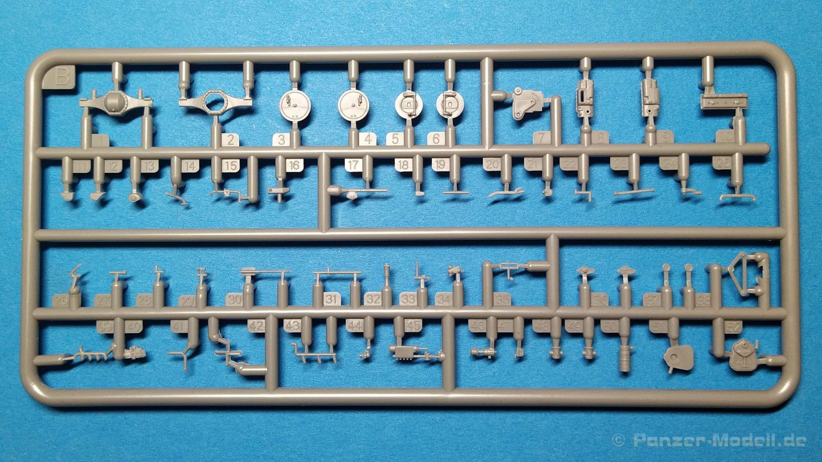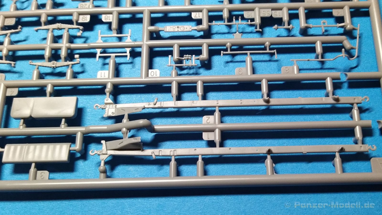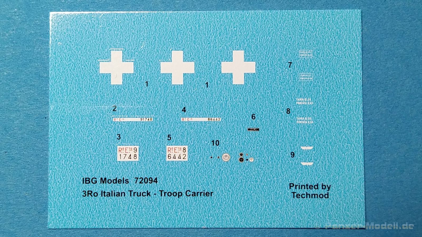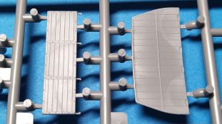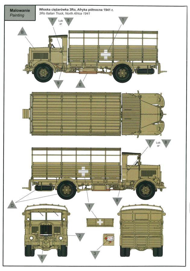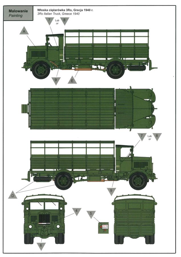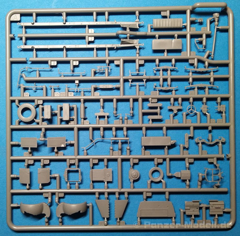 Der Bausatz, der ursprünglich als Pritsche/Planenversion im Jahre 2021 erschien, wird hier nun in der Version als abgeplanter Truppentransporter angeboten. Hauptunterschied sind jetzt die schön gestaltete offene Spriegeldarstellung und die für den Truppentransport notwendigen Sitzbänke auf der Ladefläche. Als schwerer Einheits-Lastkraftwagen (Autocarro Unificato) in der 4,5 to-Klasse wurden Fahrzeuge dieser Art in der Zeit vom Zweiten Weltkrieg bis in die 1960er-Jahre von der italienischen Armee eingesetzt. Außerdem wurden auch von der deutschen Wehrmacht bis zum Kriegsende beschlagnahmte oder neu gelieferte Lancia-3Ro-Lastwagen eingesetzt. Nun aber zum Modell. Ein Blick in den Stülpkarton (30 x 20 x 4,5cm) offenbart den folgenden Inhalt: - 1 Bauanleitung mit ausführlichen Schritt-für-Schrittanleitungen in 32 Baustufen und 2 Farb- und Markierungsvarianten am Ende - 1 Spritzling (A) in grauem Kunststoff mit Rahmen- und Karosserieteilen - 1 Spritzling (B) in grauem Kunststoff mit Achs- und Motorteilen - 1 Spritzling (C) in grauem Kunststoff mit Teilen für die Ladefläche und Fahrerkabine - 1 Spritzling (F) in grauem Kunststoff mit Spriegeln und Bordwänden der Ladefläche - 2 Spritzling (G) in grauem Kunststoff mit Teilen für Felgen, etc. - 1 Spritzling (N) in klarem Kunststoff mit Teilen für die Fenster der Kabine - 4 Spritzling (R) in grauem Kunststoff mit Teilen für Reifen, etc. - 1 Spritzling (P) in grauem Kunststoff mit Spritzwand und Scheibenrahmen. - 3 Spritzling (K) in grauem Kunststoff mit Teilen für die Sitzbänke auf der Ladefläche - 1 Platine mit Fotoätzteilen - 1 Decalbogen auf blauem Papier mit 2 verschiedenen Markierungsvarianten Für ein Modell im Maßstab 1:72 sind die 32 Baustufen schon eine Ansage. Das liegt aber haupstächlich daran, das viele Baustufen das Zusammenfügen von lediglich zwei kleinen Teilen zeigen. Dies ist aber sehr hilfreich und übersichtlicher, als eine große Explosionszeichnung mit vielen Teilezuordnungen. Der Aufbau des Bausatzes, die Detailierung und Gravierung der Teile sind IBG-typisch gut umgesetzt. Die Angüsse sind so gewählt, dass man diese gut entfernen kann. Fischhäute sind nur sehr vereinzelt an den Bauteilen zu finden, lassen sich aber schnell und unproblematisch mit einem scharfen Messer entfernen. Auf den Bauteilen sind keine nennenswerten Auswerfermarken auf später sichtbaren Stellen zu sehen. Der Bau startet mit dem Motor, gefolgt vom Getriebe. Das Fahrgestell mit Rahmen, Kühler, Achsen und Blattfedern ist als nächstes dran. Alles ist sehr schön gestaltet und geradezu eine Augenweise. Hier sind viele schöne Details umgesetzt worden. Ein möglicher Lenkeinschlag ist von den Bauteilen her so nicht vorgesehen, sollte aber durch Anpaassung der zahlreichen Einzelteile für diesen Bereich doch umsetzbar sein. Nach Komplettierung dieser Baustufen folgt die Fahrerkabine. Auch hier sind Innenseiten der Türen und das Dach detailliert ausgearbeitet. Die Türen liegen lose bei und können dementsprechend auch offen dargestellt werden. Nach Aufsetzen der Fahrerkabine auf das Fargestell folgt die Motorhaube. Auch hier sind viele Einzelteile vorgesehen, so dass eine offene Darstellung und der Blick auf den schönen Motor möglich gemacht wurden. Nach Anbringen der Kotflügel folgt die Montage der Räder. Diese bestehen jeweils aus Radhälften und den dazugehörigen Felgen, hier ist eine saubere Montage von Nöten um ein ansprechendes Ergebnis zu erhalten. Auf den Reifen sind sogar Herstellerangaben zu finden, ein Detail, das sogar bei größeren Maßstäben oft nicht umgesetzt wird. Gegen Ende folgt dann die Montage der Sitzbänke und die eigentliche Ladefläche inkl. Bordwänden und Spriegeln. Die Holzoberflächen weisen eine sehr feine Holzstruktur auf, die vielleicht ein wenig stärker ausgeprägt sein sollte um sie später nach der Lackierung noch erkennen zu können. Aber das ist schon Meckern auf hohem Niveau. Die Spriegelanlage besteht aus drei Teilen, den Seitenteilen und dem gesamten oberen Bereich und müsste so relativ einach und stabil zu montieren sein. Der Einsatz von Fotoätzteilen ist nur auf das nötigste bzw. sinnvollste beschränkt. Hier sind vor allem dünne Bleche / Rahmen als Ätzteil vorgesehen, die sehr zur feinen Detaillierung des Bausatzes beitragen. Die Bauanleitung ist zweisprachig ausgelegt. Es gibt Hinweise in polnischer und englischer Sprache. Sie ist sehr detailliert und übersichtlich aufgebaut. Zu Beginn findet man eine Übersicht der enthaltenen Decals und Fotoätzteile sowie Farbangaben für die Hersteller Vallejo, Hataka, Life Color, Mr. Hobby, und AK Interactive. Im Weiteren folgt dann eine Übersicht der enthaltenen Gießäste. Danach folgt die eigentliche Bauanleitung, die sich in 32 Baustufen gliedert. Hier wird pro Baustufe anhand von einfarbigen 3D-Zeichnungen Schritt für Schritt der Weg zum fertigen Modell dargestellt bzw. erklärt. Den Abschluss der Anleitung bilden zwei verschiedene Bemalungs- und Markierungsvarianten. Folgende Markierungs- bzw. Bemalungsvarianten sind in der Bauanleitung dargestellt: - 3Ro Italienischer Lkw, Griechenland, unbekannte Einheit, 1940, einfarbig grün - 3Ro Italienischer Lkw, Nord Afrika, unbekannte Einheit, 1941, einfarbig sandgelb Die Decals kommen auf einem hellblauen Trägerpapier daher, worauf man gut die einzelnen Elemente finden kann. Augenscheinlich fällt kein Versatz beim Druck auf. Mein Fazit: IBG bringt mit dieser Variante seiner italienischen 3Ro-Reihe wieder mal ein schön umgesetztes Lkw Modell auf den Markt. Detaillierung und Aufteilung der Bauteile wissen zu gefallen. Der Preis für die dargebotene Zusammenstellung von Spritzgussteilen und Fotoätzteilen sind absolut in Ordnung. Der Aufbau und die Detailierung des Bausatzes und der enthaltenen Bauteile lassen viel Bastelspaß erwarten und führen zu einem fein detaillierten Modell. Wenn auch die schiere Anzahl der Bauteile und der Einsatz der Fotoätzteile den Bausatz nicht gerade f