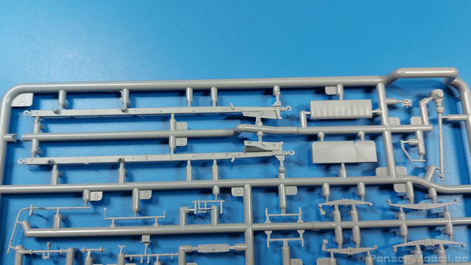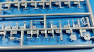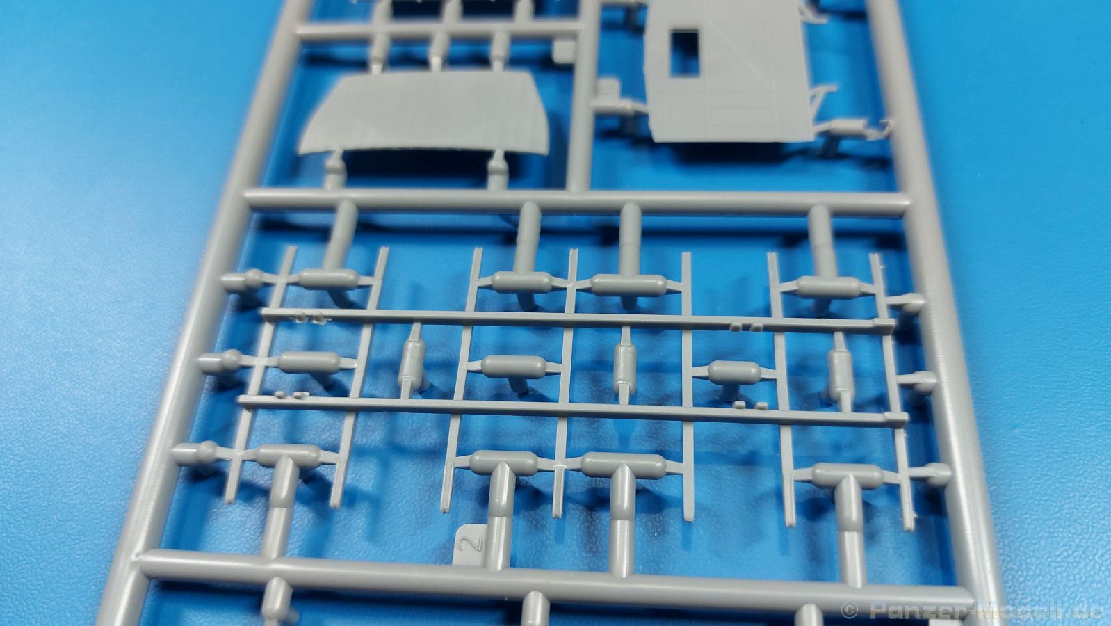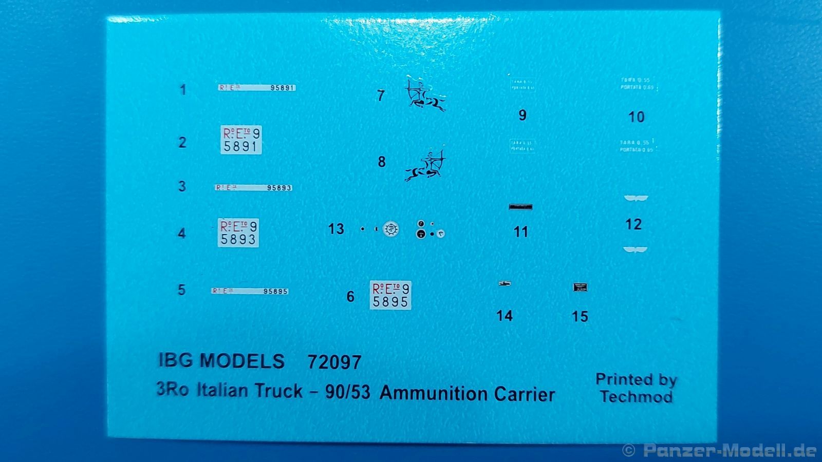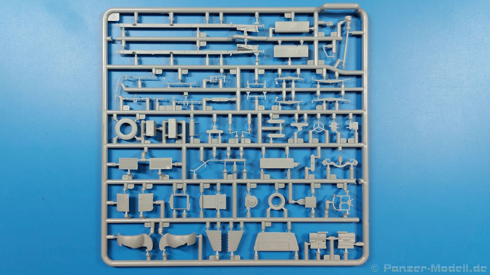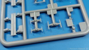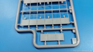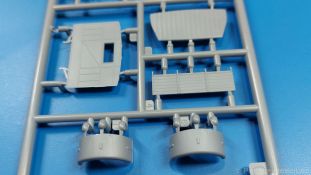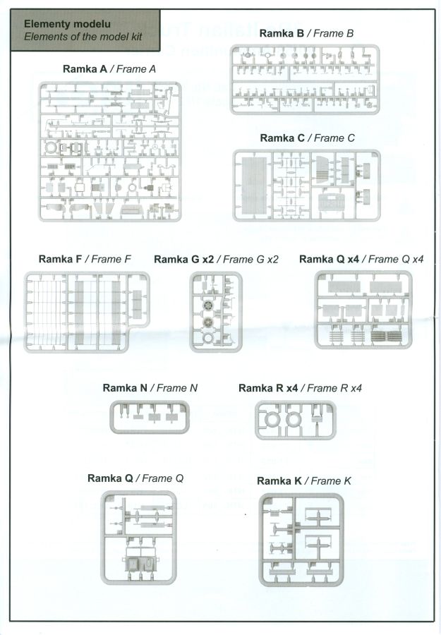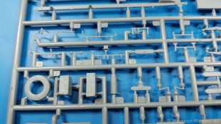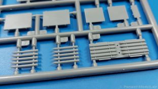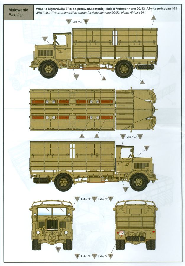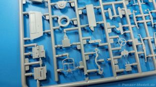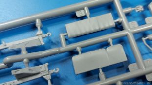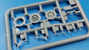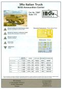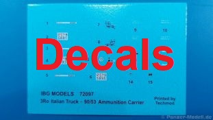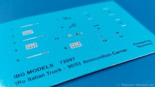 3Ro Italian Truck - 90/53 Ammunition Carrier Das Original Der Bausatz: Wie in 1:35 bekommt der 3Ro mit 90/53 90mm Flak von IBG nun auch in 1:72 einen passenden Munitions-Lkw. Der Karton mit Stülpdeckel ist 300 x 200 x 45 mm groß. Darin finden wir 16 graue, 1 klaren Spritzlinge, 1 PE-Platine, Decals und die Bauanleitung. Die Teile aus grauem Plastik sind sauber ausgespritzt, ohne Grat und Versatz. Angüsse sind so gesetzt, dass Details nicht beeinträchtigt werden. Störende Auswerferspuren sind mir so nicht aufgefallen. Angüsse sind flach gehalten, so dass man die Teile alles in allem ohne viel Nacharbeit vom Spritzling trennen können sollte. Fahrgestell: Ein eingängiges Studium der Bauanleitung kann ich nur ans Herz legen, denn der Kleine (1:72) ist dem Großen (1:35) von der Aufteilung her sehr ähnlich. Der Rahmen besteht aus separaten Längs- und Querträgern. Auch ein nicht so erfahrener Modellbauer sollte einen verwindungsfreien Rahmen hinbekommen, denn die Träger sind so geformt, dass sie nach dem Zusammenbau die entsprechende Stabilität gewährleisten. Der Kühler ist gleich im vorderen Querträger integriert. In der Vorderachse sind bereits viele Details integriert, so dass nur noch das Lenkgestänge angebaut werden müssen. Leider kann man die Räder nur in Geradeausstellung montieren. Auch die Hinterachse ist gut detailliert. Zusätzliche Spiralfedern sind bereits angegossen. Die großen Blattfedern vorn wie hinten sind sauber strukturiert. Die Räder sind gut gelungen. Das Profil ist gut getroffen. An den Seitenwänden sieht man deutlich den Herstelleraufdruck PIRELLI und die Reifengröße. Die Felgen sind mit entsprechenden Durchbrüchen versehen. Das Ersatzrad besteht nur aus Felgentrommel und Lauffläche und ruht in einem 3-teiligen Gestell am Heck des Rahmens. 2 PE Gurte sichern das Rad gegen Herausrutschen. Im vorderen Drittel des Rahmens sitzt das sehr detailreiche Getriebe, ausgestattet mit Kardanwelle und Öleinfüllstutzen. Genoppte Trittbleche für das Fahrerhaus werden auch am Rahmen befestigt. Im hinteren Querträger sitzt die Anhängekupplung mit angegossenem Kupplungsbolzen. Der mehrteilige Auspuff wird im Rahmen verlegt und mit einigen PE-Teilen gesichert. Motor: Der Dieselmotor ist ein kleines Modell für sich. Der hohe Motorblock des 5-Zylinder Diesel mit seinen Einspritzdüsen im Zylinderkopf fällt ebenso ins Auge wie die als Ölkühler ausgelegte und somit mit vielen Kühlrippen versehene Ölwanne. Lichtmaschine, Einspritzpumpe, Keilriemen, Lüfterrad, Zuluft- und Kühlleitungen, Abgaskrümmer und Öleinfüllstutzen sind weitere Details. Fahrerhaus: Die Auslegung des Fahrerhauses als Rechtslenker machte mich stutzig. In Italien gab es bis in die 1920-Jahre eine regional unterschiedliche Regelung mit Rechts- und Linksverkehr, welches eine Erklärung sein könnte, allerdings wurde der Lancia 3Ro erst ab 1938 entwickelt. Das Fahrerhaus ist viele Einzelteile aufgebrochen. Die Rückwand hat außen etliche Versteifungsrippen und einen Durchbruch für das Klarsichtfenster zur Ladefläche hin. Innen wird die durchgehende Rückenlehne angebracht. Die schmalen Seitenwände haben um unteren Ende Stangen zur Aufhängung der Trittbleche. Hier sollte man beim Hantieren aufpassen, um die Stangen nicht bereits vor der Montage des Fahrerhauses auf dem Rahmen abzubrechen. Der Boden nimmt die einteilige Sitzbank auf, deren Darstellung aber eine Trennung zwischen Fahrer- und Beifahrersitz aufweist. Der Fahrer hat tatsächlich auf dem Tank gesessen, denn rechts von seinem Sitz schaut der Einfüllstutzen heraus. Schalt- und Handbremshebel werden ebenfalls auf den Boden geklebt. Die Fahrerhausfront ist auch beidseitig detailliert. Bereits angegossen sind die Halterungen mit den Winkern. Zum Motorraum hin wird der Luftfilter mittels PE-Halterung montiert und über die Zuluftleitung mit dem Motor verbunden. Innen finden sich Kupplungs-, Brems- und Gaspedal, Lenkstange und -rad, Armaturentafel, kleine Bedienhebel und Haltebügel für den/die Beifahrer. Beidseitig detaillierte Türen können geöffnet oder geschlossen angebaut werden. Die Türgriffe innen wie außen sind bereits angegossen. Beidseitig werden Außenspiegel und Suchscheinwerfer angebracht. Das Planendach, auch innen mit Struktur, schließt das Fahrerhaus nach oben hin ab. Für die Frontscheiben gibt es kratzer- und schlierenfreie Klarsichtteile. Die Motorhaube besteht aus dem mit angegossenem Einfüllstutzen Kühlerrahmen, der mit einem PE-Gitter verfeinert wird, den Seitenblechen mit Lüftungsrippen und den 2 Haubenteilen, die über ein schönes Klavierscharnier verbunden werden. Die Aufteilung erlaubt eine geöffnete Darstellung der Motorhaube. Die Seitenteile erhalten je 3 Riegel aus PE-Teilen. Die Vorderräder werden von großen Kotflügeln mit nach vorn ausgestellten Trittflächen überdeckt. Auf den Trittflächen werden feine Begrenzungsstangen befestigt. Die ausgehöhlten Fahrscheinwerfer mit Klarsichtscheiben finden seitlich am Kühlerrahmen ihren Platz. Ladefläche: Der Boden der Ladefläche wird auf einen einteiligen Hilfsrahmen montiert. Es folgen die Frontseite, die Heckklappe und die Seitenteile. Es 7 Spriegel, deren Seiten an die Seitenteile angegossen sind. Die Oberteile der Spriegel bilden zusammen mit Längslattungen (9 Latten) ein Teil, das wie ein Dach aufgesetzt wird. Die Wölbung des Daches ist sehr gut gelungen. Den Unterschied zum normalen Transport-Lkw machen die vier Munitionskästen für Flak-Munition aus. Sie bestehen jeweils aus vier Seitenwänden, einem Zwischenboden mit aufgegossenen 90mm Patronen, einer Trennwand und zwei Deckeln. Jeden Deckel kann man geöffnet darstellen und mittels zwei PE-Stangen pro Deckel abstützen. Je Kasten gibt es zwei Einlagen aus je 5 fünf zusammengegossenen Patronen, die man bei geöffnetem Deckel einsetzen kann, um einen vollen Kasten darzustellen. Der Unterboden bekommt die Kotflügel der Hinterräder, die zusätzlich durch PE-Teile abgestützt wer