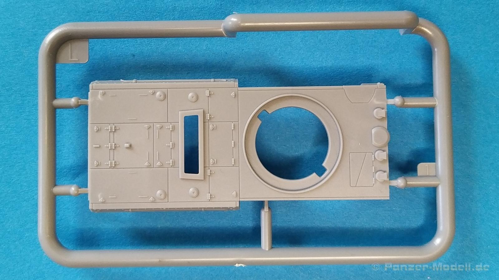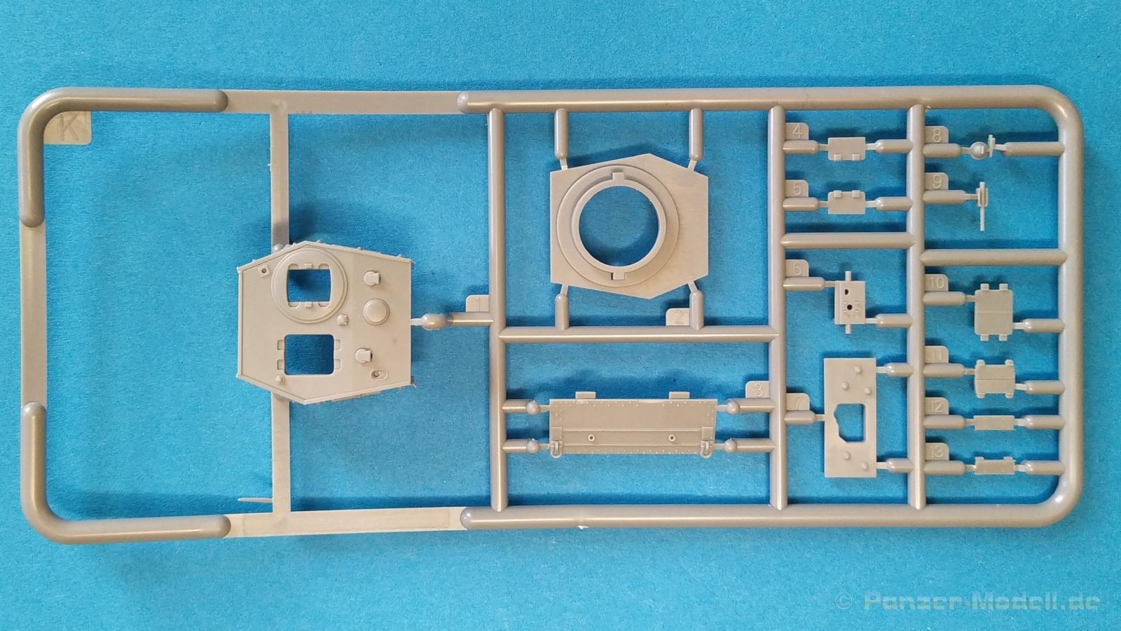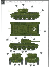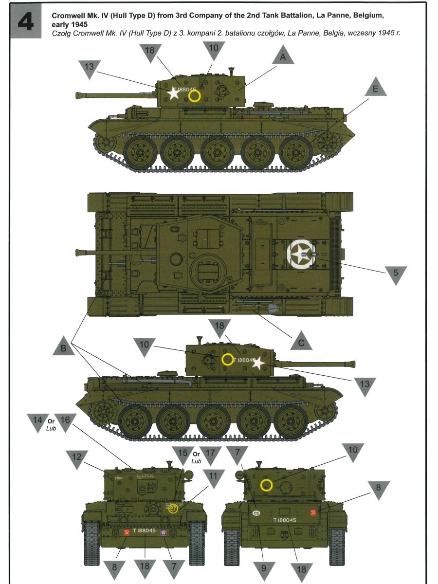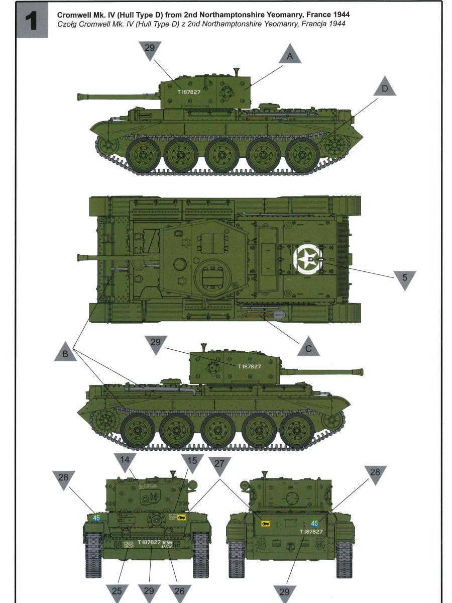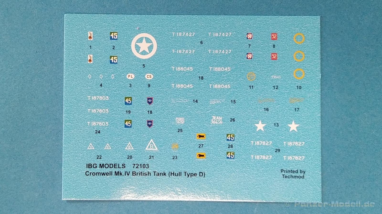 Nachdem bereits 2021 ein Cromwell-Bausatz (damals Hull Type C) erschienen war haben wir hier nun eine andere Wannenart (Hull-Type) und andere Bauteile. Hinter der Bezeichnung „Cromwell Mk. IV British Tank“ verbirgt sich die meist produzierte Version der schnellen und relativ gut bewaffneten Mk. VIII Kreuzerpanzer, die von den Briten während des zweiten Weltkrieges entwickelt wurden. Offiziell betitelt wurden diese Fahrzeuge als „A27M Cromwell Mk. IV“. Diese Fahrzeuge sind eine Kombination aus einer Centaur-Rumpfwanne und einem Rolls-Royce Meteor-Motor (A27M) der dem Fahrzeug eine hohe Geschwindigkeit und Mobilität verlieh. Charakteristisch für die hier gezeigte Wanne „Type D“ ist die Seitenluke für den MG-Schützen links vorne in der Wanne und die zweiteilige Fahrerluke rechts vorne im Wannendach. Die Besatzung bestand aus 5 Soldaten die als Bewaffnung eine 75mm-Schnellfeuerkanone und zwei MG´s zur Verfügung hatten. Bei der Kanone handelt es sich um eine aufgebohrte Version der britischen 6-Pfünder-Kanone, die ursprünglich Ende 1943 eingeführt wurde. Der Turm dieses Panzertyps war eine geschraubte Konstruktion, bei dem 51mm starke Seitenplatten auf ein geschweißtes Innengehäuse mit einer Wandstärke von 12,7mm aufgeschraubt wurden. Anhaltende technische Probleme mit der Hauptbewaffnung führten dazu, dass die Cromwell Mk. IV erst im Juni 1944 bei der Landung in der Normandie zum Einsatz kamen. Hier konnten sie leider nicht in den engen und von Hecken gesäumten Gassen der Einsatzräume ihre im Vergleich zu den eingesetzten Sherman-Panzern deutlich bessere Mobilität zum Einsatz bringen. Um das Problem mit den einengenden Hecken und Buschwerken in den Griff zu bekommen wurden an der Vorderseite „Heckenscheren“ aus Stahlklingen befestigt, womit die Fahrzeuge in der Lage waren Hindernisse unter Panzerschutz zu beseitigen und sich den Weg zu bahnen. Dieses markante Bauteil ist erfreulicherweise auch im Bausatz enthalten, wird aber bei den gezeigten Markierungsvarianten nicht benötigt. Nun aber zum eigentlichen vorliegenden Modell. Der Stülpkarton (30 x 20 x 4,5cm) offenbart den folgenden Inhalt: - 1x achtseitige Bauanleitung mit ausführlichen Schritt-für-Schrittanleitungen in 8 Baustufen und 4 Farb- und Markierungsvarianten am Ende - 1x Spritzling (A) in grauem Kunststoff mit Teilen der Unterwanne - 2x Spritzling (B) in grauem Kunststoff mit Teilen für Laufrollen, Antriebsrädern, Staukisten, etc. - 1x Spritzling (L) in grauem Kunststoff mit Teilen der Oberwanne - 1x Spritzling (E) in grauem Kunststoff mit Teilen für Bugplatte und Funker-MG - 1x Spritzling (G) in grauem Kunststoff mit Teilen für „Heckenschneider“ und Hauptbewaffnung - 1x Spritzling (J) in grauem Kunststoff mit Teilen für die Kettenbleche - 1x Spritzling (F) in grauem Kunststoff mit Teilen des Wannenhecks - 1x Spritzling (K) in grauem Kunststoff mit Teilen des Turmes - 1x Spritzling (J) in grauem Kunststoff mit Teilen für Laufrollen, Antriebsrädern, etc. - 1x separates Laufwerk links - 1x separates Laufwerk rechts - 1x Fotoätzplatine mit Teilen wie z. B. Lüftergitter, Lampenschutzbügel, etc. - 1x Decalbogen mit vier verschiedenen Markierungsvarianten Wie von IBG gewohnt ist die Detailierung und Gravierung der Teile sehr gut. Die Abspritzung der Bauteile ist tadellos. Alle Angüsse sind so gewählt, dass man diese gut entfernen kann. Auf den Bauteilen sind keine nennenswerten Auswerfermarken an später sichtbaren Stellen zu sehen. Ein Highlight vieler Panzerbausätze von IBG sind auch die hier die in einem Stück gefertigten Ketten mit angegossenen Hälften der Laufrollen. Diese können somit schon mal komplett bemalt werden, bevor die zweite Hälfte der Laufrollen, Antriebs- und Spannräder ergänzt werden. Die angegossenen Laufräderhälften bei den Kettenlaufwerken hören sich nach „einfacher Darstellung“ an, ist es aber absolut nicht. Kettenstruktur, Verschraubungen, und Kettenführungszähne sind sehr fein ausgeführt. Fotoätzteile kommen nur für wenige und sinnvolle Teile zum Einsatz. Sie sind aber nicht optional zu Plastikteilen zu verwenden, sondern werden immer zum Bau benötigt. U.a. müssen Lampenschutzbügel, Kettenblechhalter und das charakteristische Lüftergitter auf dem Wannenheck aus diesem Material gebaut werden. Im Turmdach lassen sich die Luken der Besatzung offen oder geschlossen darstellen. Dafür liegen geschlossene einteilige und geteilte offene Versionen der Luken bei. In der Wanne geht das leider nicht, da die Luken nur geschlossen dargestellt sind. Das Rohr der Hauptbewaffnung ist erfreulicherweise zusammen mit offener Rohrmündung in einem Stück hergestellt. Hier muss also nichts nachträglich aufgebohrt werden oder umständlich aus mehreren Teilen zusammengesetzt werden. Die Bauanleitung ist zweisprachig ausgelegt. Es gibt Hinweise in polnischer und englischer Sprache. Sie ist sehr übersichtlich aufgebaut. Auf der ersten Seite findet man eine Übersicht der enthaltenen Decals und Fotoätzteile. Außerdem sind hier auch Farbangaben in tabellarischer Form für die Hersteller Vallejo, Hataka, Life Color, Mr. Hobby, und AK Interactive aufgeführt. Auf der nächsten Seite finden wir eine Übersicht der insgesamt elf enthaltenen Spritzlinge und zwei separate Laufwerksseiten. Nun folgt die eigentliche Bauanleitung, die sich in nur 8 Baustufen gliedert. Hier wird pro Baustufe anhand von einfarbigen 3D-Zeichnungen Schritt für Schritt der Weg zum fertigen Modell dargestellt bzw. erklärt. Der Zusammenbau startet mit den Kettenlaufwerken links und rechts. Hier müssen lediglich die äußeren Hälften der Laufrollen, Antriebsräder und Spannrollen montiert werden. Hier ergibt es Sinn, die einzelnen Teile zuerst zu bemalen und dann zu komplettieren. Im Anschluss werden die fertigen Laufwerke dann an der Unterwanne angebracht und diese dann noch mit Wannenheck und front ergänzt. Am Wannenheck müssen versionsspezifisch noch zwei nicht benötigte angegossene H