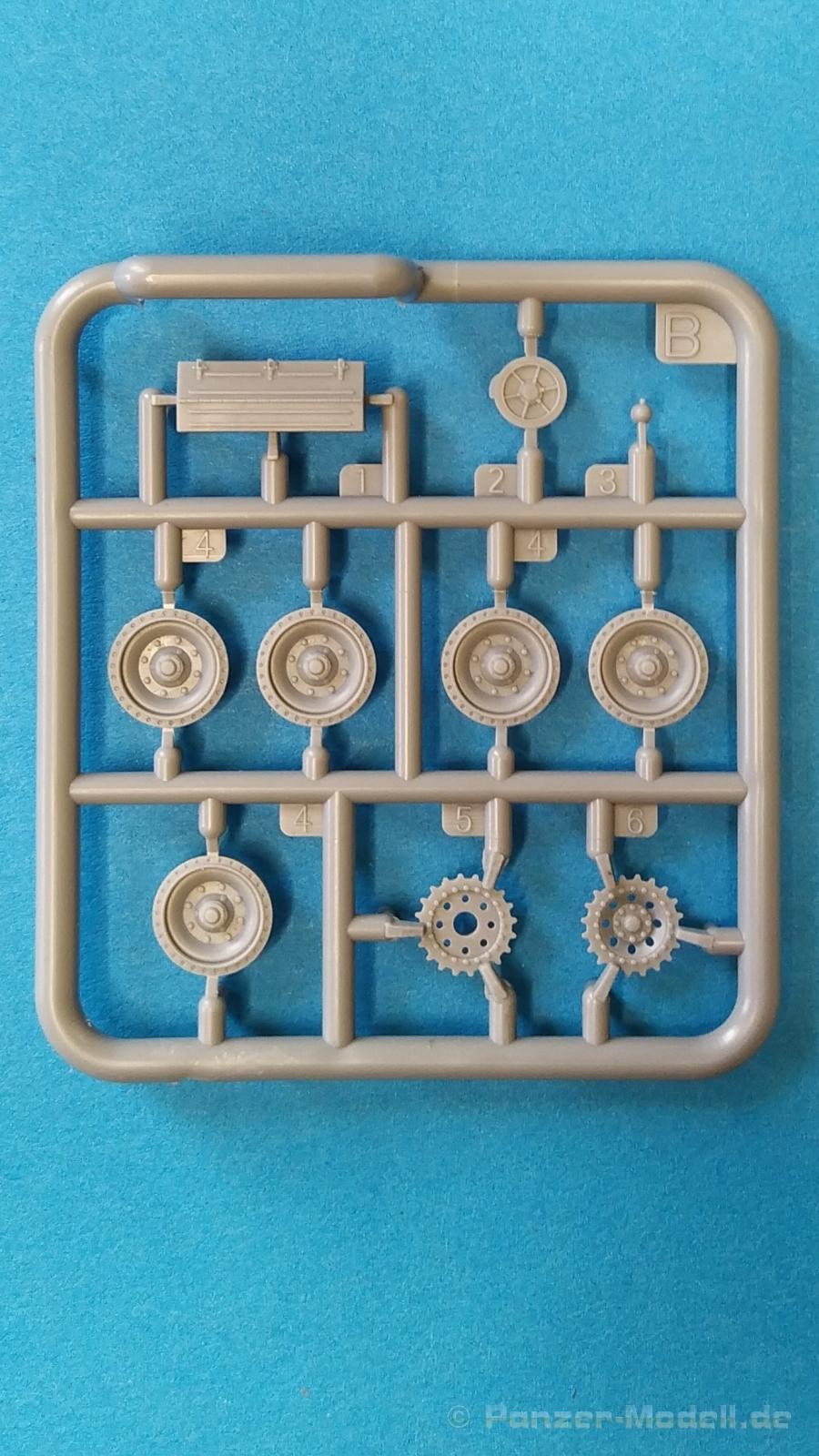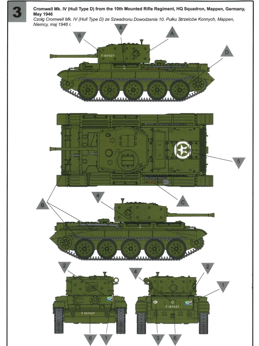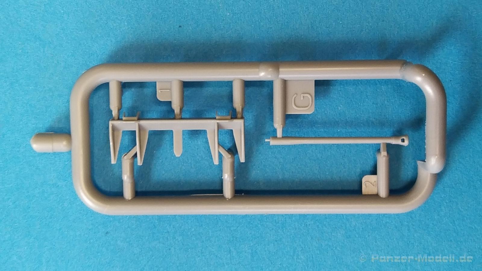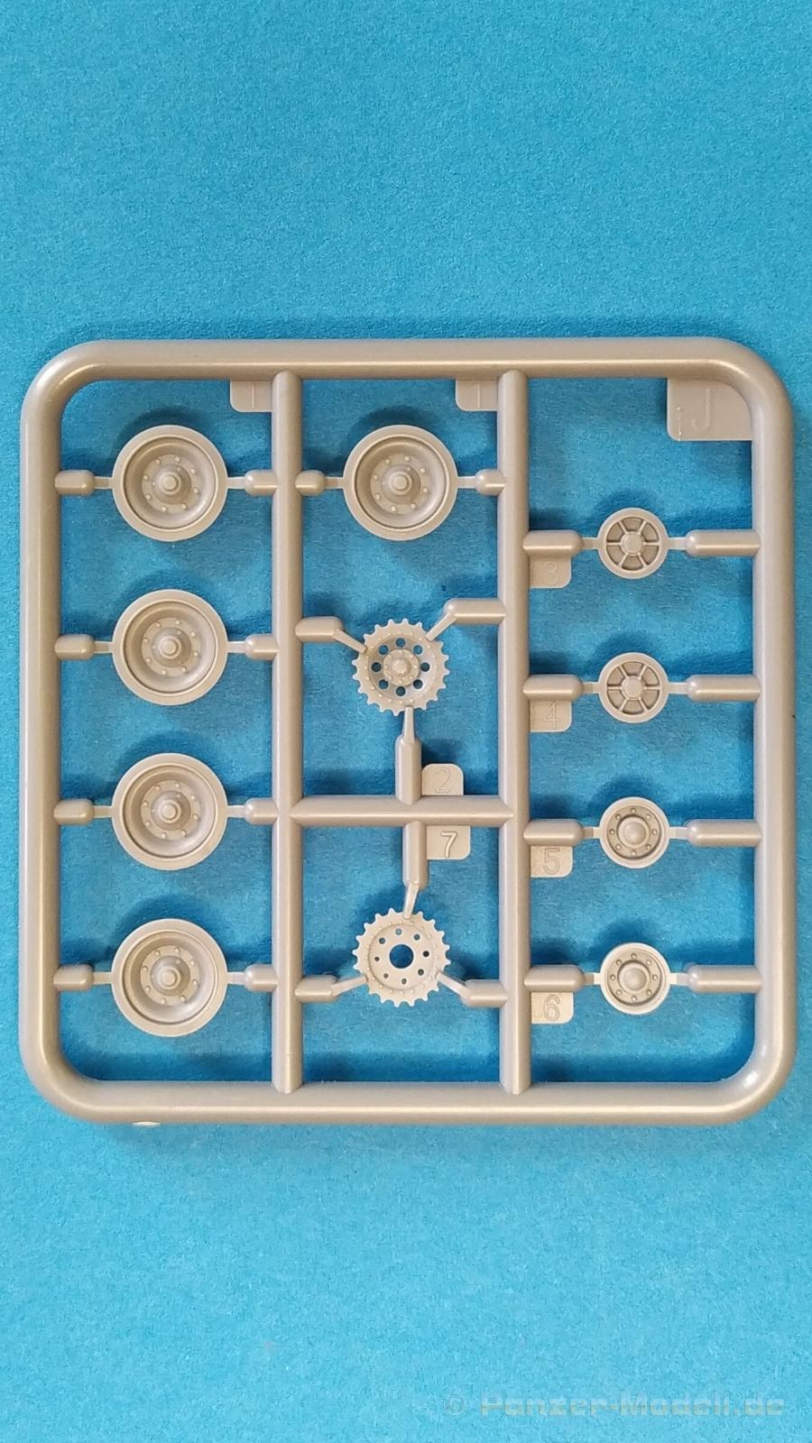 Nachdem bereits 2021 ein Cromwell-Bausatz (damals Hull Type C) erschienen war haben wir hier nun eine andere Wannenart (Hull-Type) und andere Bauteile. Hinter der Bezeichnung „Cromwell Mk. IV British Tank“ verbirgt sich die meist produzierte Version der schnellen und relativ gut bewaffneten Mk. VIII Kreuzerpanzer, die von den Briten während des zweiten Weltkrieges entwickelt wurden. Offiziell betitelt wurden diese Fahrzeuge als „A27M Cromwell Mk. IV“. Diese Fahrzeuge sind eine Kombination aus einer Centaur-Rumpfwanne und einem Rolls-Royce Meteor-Motor (A27M) der dem Fahrzeug eine hohe Geschwindigkeit und Mobilität verlieh. Charakteristisch für die hier gezeigte Wanne „Type D“ ist die Seitenluke für den MG-Schützen links vorne in der Wanne und die zweiteilige Fahrerluke rechts vorne im Wannendach. Die Besatzung bestand aus 5 Soldaten die als Bewaffnung eine 75mm-Schnellfeuerkanone und zwei MG´s zur Verfügung hatten. Bei der Kanone handelt es sich um eine aufgebohrte Version der britischen 6-Pfünder-Kanone, die ursprünglich Ende 1943 eingeführt wurde. Der Turm dieses Panzertyps war eine geschraubte Konstruktion, bei dem 51mm starke Seitenplatten auf ein geschweißtes Innengehäuse mit einer Wandstärke von 12,7mm aufgeschraubt wurden. Anhaltende technische Probleme mit der Hauptbewaffnung führten dazu, dass die Cromwell Mk. IV erst im Juni 1944 bei der Landung in der Normandie zum Einsatz kamen. Hier konnten sie leider nicht in den engen und von Hecken gesäumten Gassen der Einsatzräume ihre im Vergleich zu den eingesetzten Sherman-Panzern deutlich bessere Mobilität zum Einsatz bringen. Um das Problem mit den einengenden Hecken und Buschwerken in den Griff zu bekommen wurden an der Vorderseite „Heckenscheren“ aus Stahlklingen befestigt, womit die Fahrzeuge in der Lage waren Hindernisse unter Panzerschutz zu beseitigen und sich den Weg zu bahnen. Dieses markante Bauteil ist erfreulicherweise auch im Bausatz enthalten, wird aber bei den gezeigten Markierungsvarianten nicht benötigt. Nun aber zum eigentlichen vorliegenden Modell. Der Stülpkarton (30 x 20 x 4,5cm) offenbart den folgenden Inhalt: - 1x achtseitige Bauanleitung mit ausführlichen Schritt-für-Schrittanleitungen in 8 Baustufen und 4 Farb- und Markierungsvarianten am Ende - 1x Spritzling (A) in grauem Kunststoff mit Teilen der Unterwanne - 2x Spritzling (B) in grauem Kunststoff mit Teilen für Laufrollen, Antriebsrädern, Staukisten, etc. - 1x Spritzling (L) in grauem Kunststoff mit Teilen der Oberwanne - 1x Spritzling (E) in grauem Kunststoff mit Teilen für Bugplatte und Funker-MG - 1x Spritzling (G) in grauem Kunststoff mit Teilen für „Heckenschneider“ und Hauptbewaffnung - 1x Spritzling (J) in grauem Kunststoff mit Teilen für die Kettenbleche - 1x Spritzling (F) in grauem Kunststoff mit Teilen des Wannenhecks - 1x Spritzling (K) in grauem Kunststoff mit Teilen des Turmes - 1x Spritzling (J) in grauem Kunststoff mit Teilen für Laufrollen, Antriebsrädern, etc. - 1x separates Laufwerk links - 1x separates Laufwerk rechts - 1x Fotoätzplatine mit Teilen wie z. B. Lüftergitter, Lampenschutzbügel, etc. - 1x Decalbogen mit vier verschiedenen Markierungsvarianten Wie von IBG gewohnt ist die Detailierung und Gravierung der Teile sehr gut. Die Abspritzung der Bauteile ist tadellos. Alle Angüsse sind so gewählt, dass man diese gut entfernen kann. Auf den Bauteilen sind keine nennenswerten Auswerfermarken an später sichtbaren Stellen zu sehen. Ein Highlight vieler Panzerbausätze von IBG sind auch die hier die in einem Stück gefertigten Ketten mit angegossenen Hälften der Laufrollen. Diese können somit schon mal komplett bemalt werden, bevor die zweite Hälfte der Laufrollen, Antriebs- und Spannräder ergänzt werden. Die angegossenen Laufräderhälften bei den Kettenlaufwerken hören sich nach „einfacher Darstellung“ an, ist es aber absolut nicht. Kettenstruktur, Verschraubungen, und Kettenführungszähne sind sehr fein ausgeführt. Fotoätzteile kommen nur für wenige und sinnvolle Teile zum Einsatz. Sie sind aber nicht optional zu Plastikteilen zu verwenden, sondern werden immer zum Bau benötigt. U.a. müssen Lampenschutzbügel, Kettenblechhalter und das charakteristische Lüftergitter auf dem Wannenheck aus diesem Material gebaut werden. Im Turmdach lassen sich die Luken der Besatzung offen oder geschlossen darstellen. Dafür liegen geschlossene einteilige und geteilte offene Versionen der Luken bei. In der Wanne geht das leider nicht, da die Luken nur geschlossen dargestellt sind. Das Rohr der Hauptbewaffnung ist erfreulicherweise zusammen mit offener Rohrmündung in einem Stück hergestellt. Hier muss also nichts nachträglich aufgebohrt werden oder umständlich aus mehreren Teilen zusammengesetzt werden. Die Bauanleitung ist zweisprachig ausgelegt. Es gibt Hinweise in polnischer und englischer Sprache. Sie ist sehr übersichtlich aufgebaut. Auf der ersten Seite findet man eine Übersicht der enthaltenen Decals und Fotoätzteile. Außerdem sind hier auch Farbangaben in tabellarischer Form für die Hersteller Vallejo, Hataka, Life Color, Mr. Hobby, und AK Interactive aufgeführt. Auf der nächsten Seite finden wir eine Übersicht der insgesamt elf enthaltenen Spritzlinge und zwei separate Laufwerksseiten. Nun folgt die eigentliche Bauanleitung, die sich in nur 8 Baustufen gliedert. Hier wird pro Baustufe anhand von einfarbigen 3D-Zeichnungen Schritt für Schritt der Weg zum fertigen Modell dargestellt bzw. erklärt. Der Zusammenbau startet mit den Kettenlaufwerken links und rechts. Hier müssen lediglich die äußeren Hälften der Laufrollen, Antriebsräder und Spannrollen montiert werden. Hier ergibt es Sinn, die einzelnen Teile zuerst zu bemalen und dann zu komplettieren. Im Anschluss werden die fertigen Laufwerke dann an der Unterwanne angebracht und diese dann noch mit Wannenheck und front ergänzt. Am Wannenheck müssen versionsspezifisch noch zwei nicht benötigte angegossene H