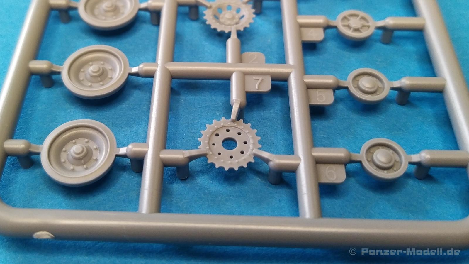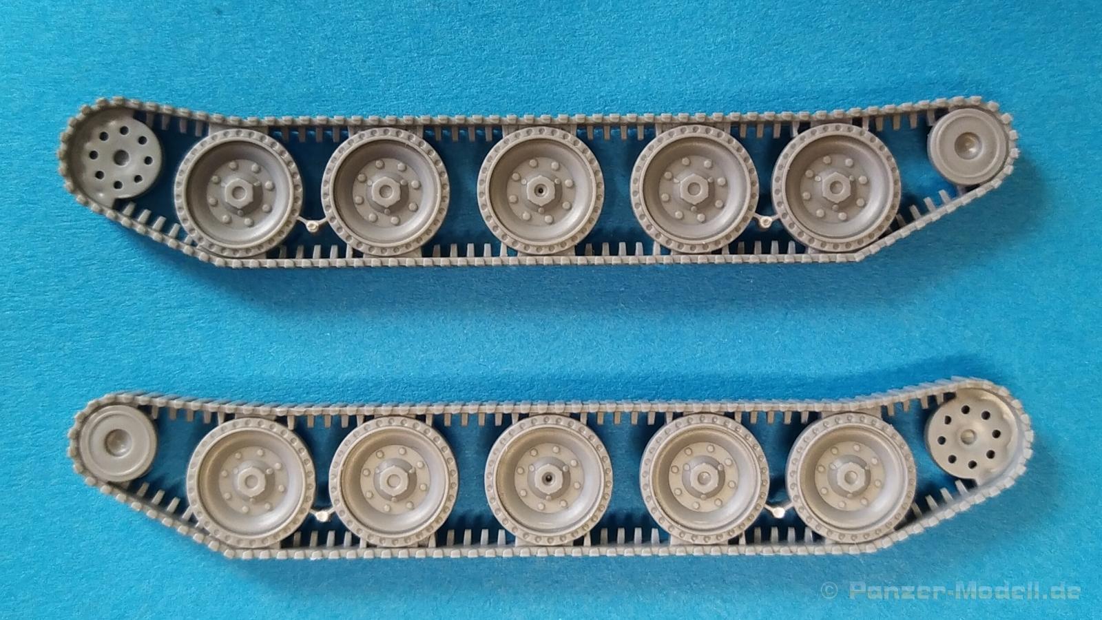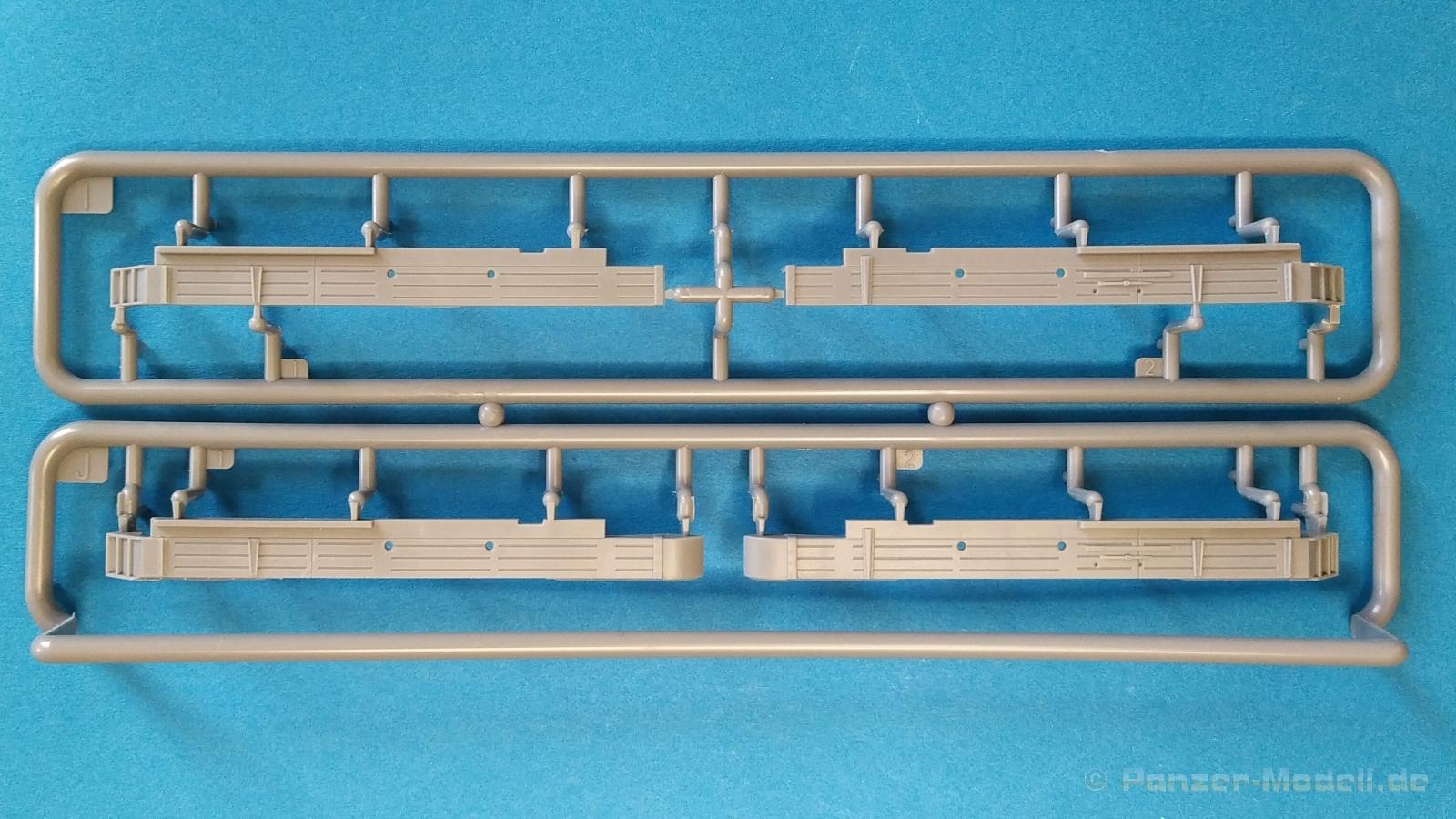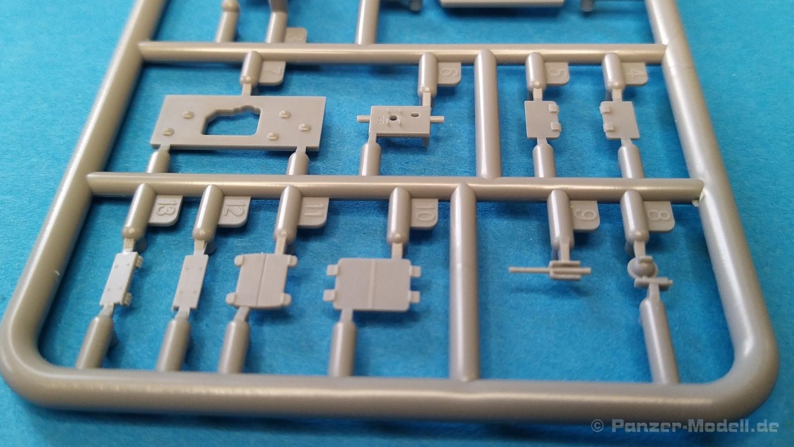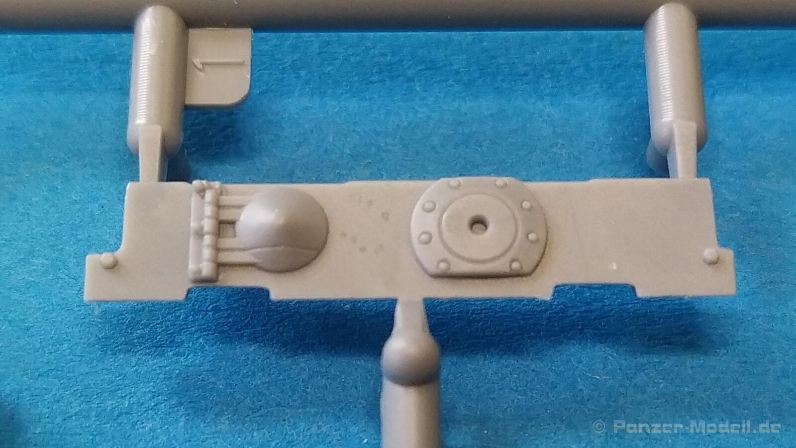 Nachdem bereits 2021 ein Cromwell-Bausatz (damals Hull Type C) erschienen war haben wir hier nun eine andere Wannenart (Hull-Type) und andere Bauteile. Hinter der Bezeichnung „Cromwell Mk. IV British Tank“ verbirgt sich die meist produzierte Version der schnellen und relativ gut bewaffneten Mk. VIII Kreuzerpanzer, die von den Briten während des zweiten Weltkrieges entwickelt wurden. Offiziell betitelt wurden diese Fahrzeuge als „A27M Cromwell Mk. IV“. Diese Fahrzeuge sind eine Kombination aus einer Centaur-Rumpfwanne und einem Rolls-Royce Meteor-Motor (A27M) der dem Fahrzeug eine hohe Geschwindigkeit und Mobilität verlieh. Charakteristisch für die hier gezeigte Wanne „Type D“ ist die Seitenluke für den MG-Schützen links vorne in der Wanne und die zweiteilige Fahrerluke rechts vorne im Wannendach. Die Besatzung bestand aus 5 Soldaten die als Bewaffnung eine 75mm-Schnellfeuerkanone und zwei MG´s zur Verfügung hatten. Bei der Kanone handelt es sich um eine aufgebohrte Version der britischen 6-Pfünder-Kanone, die ursprünglich Ende 1943 eingeführt wurde. Der Turm dieses Panzertyps war eine geschraubte Konstruktion, bei dem 51mm starke Seitenplatten auf ein geschweißtes Innengehäuse mit einer Wandstärke von 12,7mm aufgeschraubt wurden. Anhaltende technische Probleme mit der Hauptbewaffnung führten dazu, dass die Cromwell Mk. IV erst im Juni 1944 bei der Landung in der Normandie zum Einsatz kamen. Hier konnten sie leider nicht in den engen und von Hecken gesäumten Gassen der Einsatzräume ihre im Vergleich zu den eingesetzten Sherman-Panzern deutlich bessere Mobilität zum Einsatz bringen. Um das Problem mit den einengenden Hecken und Buschwerken in den Griff zu bekommen wurden an der Vorderseite „Heckenscheren“ aus Stahlklingen befestigt, womit die Fahrzeuge in der Lage waren Hindernisse unter Panzerschutz zu beseitigen und sich den Weg zu bahnen. Dieses markante Bauteil ist erfreulicherweise auch im Bausatz enthalten, wird aber bei den gezeigten Markierungsvarianten nicht benötigt. Nun aber zum eigentlichen vorliegenden Modell. Der Stülpkarton (30 x 20 x 4,5cm) offenbart den folgenden Inhalt: - 1x achtseitige Bauanleitung mit ausführlichen Schritt-für-Schrittanleitungen in 8 Baustufen und 4 Farb- und Markierungsvarianten am Ende - 1x Spritzling (A) in grauem Kunststoff mit Teilen der Unterwanne - 2x Spritzling (B) in grauem Kunststoff mit Teilen für Laufrollen, Antriebsrädern, Staukisten, etc. - 1x Spritzling (L) in grauem Kunststoff mit Teilen der Oberwanne - 1x Spritzling (E) in grauem Kunststoff mit Teilen für Bugplatte und Funker-MG - 1x Spritzling (G) in grauem Kunststoff mit Teilen für „Heckenschneider“ und Hauptbewaffnung - 1x Spritzling (J) in grauem Kunststoff mit Teilen für die Kettenbleche - 1x Spritzling (F) in grauem Kunststoff mit Teilen des Wannenhecks - 1x Spritzling (K) in grauem Kunststoff mit Teilen des Turmes - 1x Spritzling (J) in grauem Kunststoff mit Teilen für Laufrollen, Antriebsrädern, etc. - 1x separates Laufwerk links - 1x separates Laufwerk rechts - 1x Fotoätzplatine mit Teilen wie z. B. Lüftergitter, Lampenschutzbügel, etc. - 1x Decalbogen mit vier verschiedenen Markierungsvarianten Wie von IBG gewohnt ist die Detailierung und Gravierung der Teile sehr gut. Die Abspritzung der Bauteile ist tadellos. Alle Angüsse sind so gewählt, dass man diese gut entfernen kann. Auf den Bauteilen sind keine nennenswerten Auswerfermarken an später sichtbaren Stellen zu sehen. Ein Highlight vieler Panzerbausätze von IBG sind auch die hier die in einem Stück gefertigten Ketten mit angegossenen Hälften der Laufrollen. Diese können somit schon mal komplett bemalt werden, bevor die zweite Hälfte der Laufrollen, Antriebs- und Spannräder ergänzt werden. Die angegossenen Laufräderhälften bei den Kettenlaufwerken hören sich nach „einfacher Darstellung“ an, ist es aber absolut nicht. Kettenstruktur, Verschraubungen, und Kettenführungszähne sind sehr fein ausgeführt. Fotoätzteile kommen nur für wenige und sinnvolle Teile zum Einsatz. Sie sind aber nicht optional zu Plastikteilen zu verwenden, sondern werden immer zum Bau benötigt. U.a. müssen Lampenschutzbügel, Kettenblechhalter und das charakteristische Lüftergitter auf dem Wannenheck aus diesem Material gebaut werden. Im Turmdach lassen sich die Luken der Besatzung offen oder geschlossen darstellen. Dafür liegen geschlossene einteilige und geteilte offene Versionen der Luken bei. In der Wanne geht das leider nicht, da die Luken nur geschlossen dargestellt sind. Das Rohr der Hauptbewaffnung ist erfreulicherweise zusammen mit offener Rohrmündung in einem Stück hergestellt. Hier muss also nichts nachträglich aufgebohrt werden oder umständlich aus mehreren Teilen zusammengesetzt werden. Die Bauanleitung ist zweisprachig ausgelegt. Es gibt Hinweise in polnischer und englischer Sprache. Sie ist sehr übersichtlich aufgebaut. Auf der ersten Seite findet man eine Übersicht der enthaltenen Decals und Fotoätzteile. Außerdem sind hier auch Farbangaben in tabellarischer Form für die Hersteller Vallejo, Hataka, Life Color, Mr. Hobby, und AK Interactive aufgeführt. Auf der nächsten Seite finden wir eine Übersicht der insgesamt elf enthaltenen Spritzlinge und zwei separate Laufwerksseiten. Nun folgt die eigentliche Bauanleitung, die sich in nur 8 Baustufen gliedert. Hier wird pro Baustufe anhand von einfarbigen 3D-Zeichnungen Schritt für Schritt der Weg zum fertigen Modell dargestellt bzw. erklärt. Der Zusammenbau startet mit den Kettenlaufwerken links und rechts. Hier müssen lediglich die äußeren Hälften der Laufrollen, Antriebsräder und Spannrollen montiert werden. Hier ergibt es Sinn, die einzelnen Teile zuerst zu bemalen und dann zu komplettieren. Im Anschluss werden die fertigen Laufwerke dann an der Unterwanne angebracht und diese dann noch mit Wannenheck und front ergänzt. Am Wannenheck müssen versionsspezifisch noch zwei nicht benötigte angegossene H