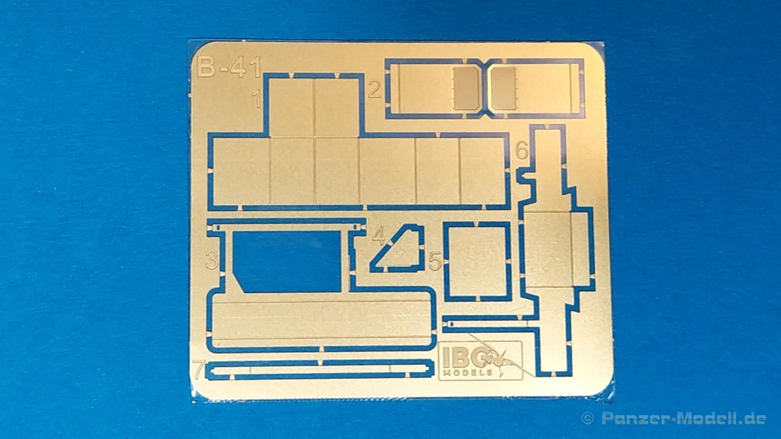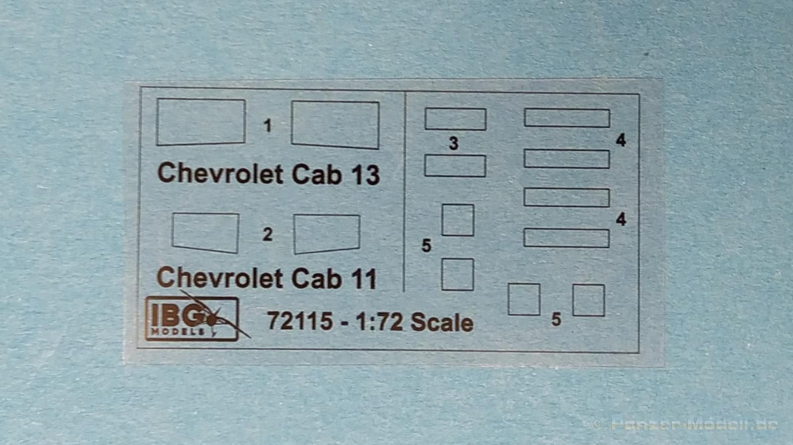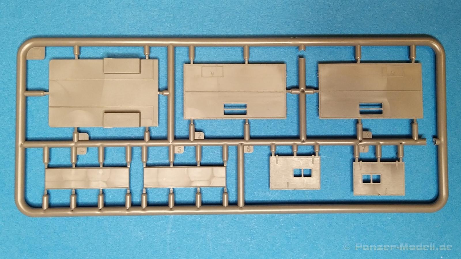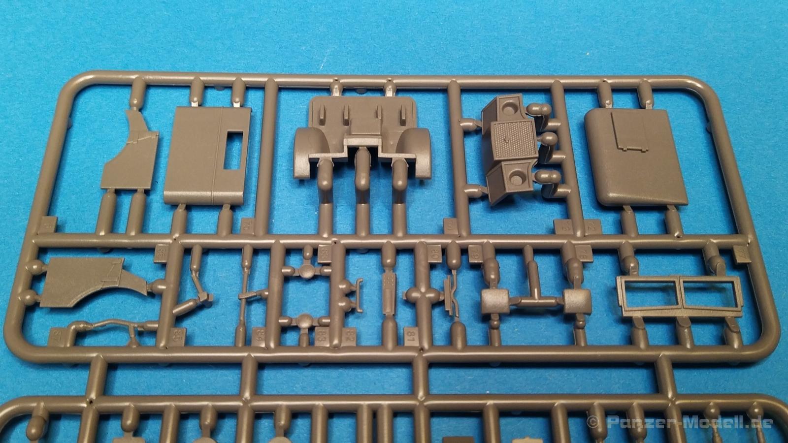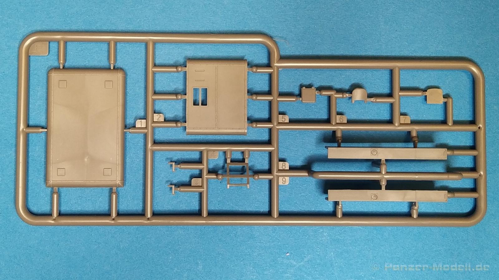 Die von IBG gewohnte Qualität in Detailierung und Gravierung der Teile ist auch bei diesem Bausatz wieder zu bewundern. Die Abspritzung der Bauteile ist tadellos. Alle Angüsse sind so gewählt, dass man diese gut entfernen kann. Nennenswerte Auswerfermarken an später sichtbaren Stellen sind nicht zu finden. Es gibt ältere vom Grundbausatz stammende Spritzlinge (ohne Bezeichnung) und neue Bauteile (Spritzlinge mit Bezeichnung). Wichtige und entscheidende Bauteile dieser Version wie die Räder, Rahmen und der Kofferaufbau wurden als neue Teile / Spritzlinge beigelegt. Dankenswerterweise ist der neue verlängerte Leiterrahmen als ein zusammenhängendes Bauteil konstruiert. So ist ein Ausrichten von Einzelteilen nicht nötig und der weitere Aufbau steht so auf einem soliden geraden „Fundament“. Genauso wie bei der Version „Office Lorry“ besitzt die Fahrerkabine auch hier eine Inneneinrichtung mit Pedalerie und Lenkrad. Konstruktionsbedingt lassen sich die Türen leider auch nicht geöffnet darstellen um später einen Blick darauf beim fertigen Modell zu ermöglichen. Auch die bekannte einfache Motornachbildung ist wieder vorhanden. Fotoätzteile kommen erst beim Bau des Kofferaufbaus und der Reserveradhalterung zum Einsatz. Sie sind aber nicht optional zu Plastikteilen zu verwenden, sondern werden immer zum Bau benötigt. Im Innenraum muss z.B. ein Regal aus diesem Material hergestellt werden. Und auch die Reserveradhalterung ist ein Modell am Modell aus PE-Teilen. Dünnwandige Schmutzfänger unter der Kabine und vorgenannte Dinge bewirken aber einen sehr hohen Grad an Feinheit und Detaillierung. Beim Kofferaufbau kann man die Hecktüren offen oder geschlossen bauen. Hier könnte man evtl. auch das Kofferdach lose auflegen um später einen besseren Blick auf den Innenraum zu erhalten. Alle Fenster des Bausatzes liegen als vorgezeichnete markierte Elemente auf einem Klarsichtfilm bei. IBG-typisch ist die übersichtliche Bauanleitung zweisprachig in polnisch und englisch ausgelegt. Auf der ersten Seite findet man eine Übersicht der enthaltenen Decals, Fotoätzteile, Klarsichtfilms und der insgesamt acht enthaltenen Spritzlinge. Mit einer Tabelle mit Farbangaben für die Hersteller Vallejo, Hataka, Life Color, Mr. Hobby, Lifecolor und AK Interactive endet die Einleitung. Auf der nächsten Seite beginnt auch schon die eigentliche Bauanleitung, die sich in 17 Baustufen gliedert. Einfarbige 3D-Zeichnungen pro Baustufe zeigen Schritt für Schritt der Weg zum fertigen Modell. Der Zusammenbau startet in Baustufe 1 mit dem Bau der Vorderachse, gefolgt von der Hinterachse in Baustufe 2. Die Motornachbildung wird in Baustufe 3 behandelt. Dann geht’s auch schon an den Zusammenbau der Fahrerkabine. Die Arbeiten dazu laufen bis in Baustufe 6. Dankenswerterweise wird am Ende eines Teilbereichs (z.B. Fahrerkabine) immer eine Zeichnung des fertigen Zustandes mit dargestellt. Mit dem Fahrgestell bzw. Leiterrahmen und den dazugehörigen Anbauteilen wie Achsaufhängung, Tanks, Stoßstange, etc. beschäftigen sich die Baustufen 7 bis 10. Den Abschluss bildet hier in Baustufe 10 die Montage der Räder. Ab der Baustufe 11 beschäftigen wir uns dann mit der Kabine und hier dann auch das erste Mal mit den enthaltenen Fotoätzteilen. Ein Regal muss dazu sauber und ordentlich gefaltet werden um eine korrekte „gerade“ Form zu erhalten. Alle anderen „Einbauten“ wie z.B. die Sitz- bzw. Liegebänke sind aus Plastikteilen zusammenzusetzen. Hier ist es bestimmt von Vorteil eine Teilbemalung des Kofferaufbauinnenraums durchzuführen, bevor man am Schluss dort nur schwer an Details herankommt. In den folgenden Baustufen werden dann nach und nach die Wände es Kofferaufbaus mit Details und Fenstern versehen und das ganze am Ende der Baustufe 14 mit dem Einbau der Türen komplettiert. In Baustufe 15 werden noch Teile unter dem Aufbau ergänzt und im Folgenden mit der sehr filigranen Reserveradhalterung schließlich in Baustufe 17 mit dem Fahrgestell vereinigt. Das Ende der Bauanleitung zeigt dann noch eine Zeichnung des fertig zusammengebauten Modells. Zu guter Letzt folgt auf der Rückseite der Anleitung ein Bemalungs- und Markierungsvorschlag: 1. Chevrolet C60L, ohne Kennzeichen, unbekannte Einheit, unbekannter Ort, unbekannter Zeitpunkt, einfarbig oliv drab Der mit nur zwei roten Kreuzen sehr übersichtliche Decalbogen kommt auf einem hellblauen Trägerpapier daher, augenscheinlich fällt kein Versatz beim Druck der Rotkreuzmarkierungen auf. Fahrzeugkennzeichen sind leider Fehlanzeige. Mein Fazit: Schlag auf Schlag folgen bei IBG Models weitere Versionen der bekannten Canadian Military Pattern Trucks (CMP) aus der Zeit des zweiten Weltkrieges im Maßstab 1:72. Ich bin gespannt welche Versionen noch erscheinen. Bei diesem Bausatz wurden Teile des bekannten Grundbausatzes mit neuen Teilen für den Aufbau und feiner detaillierten Rädern zu einer neuen Fahrzeugvariante zusammengestellt. Hier nun in der Variante des „San-Koffers“, der sicherlich auf vielen Dioramen seinen Platz finden wird. Die Detaillierung des Kofferaufbaus mit einigen Fotoätzteilen ist hervorragend, wenn auch z. B. die zu „faltende“ Reserveradhalterung für den ein oder anderen Modellbauer etwas abschreckend ist. Aber zu dem Bausatzpreis kann man sich ruhig einmal genauer mit dem Thema beschäftigen. Der Preis für die dargebotene Zusammenstellung und Qualität von Spritzgussteilen und Fotoätzteilen sind absolut ok. Die zu verwendenden Fotoätzteile machen den Bausatz sicherlich eher für den fortgeschrittenen Modellbauer geeignet. Für den aufgerufenen Preis von 15,50 Euro eine absolute Kaufempfehlung!
