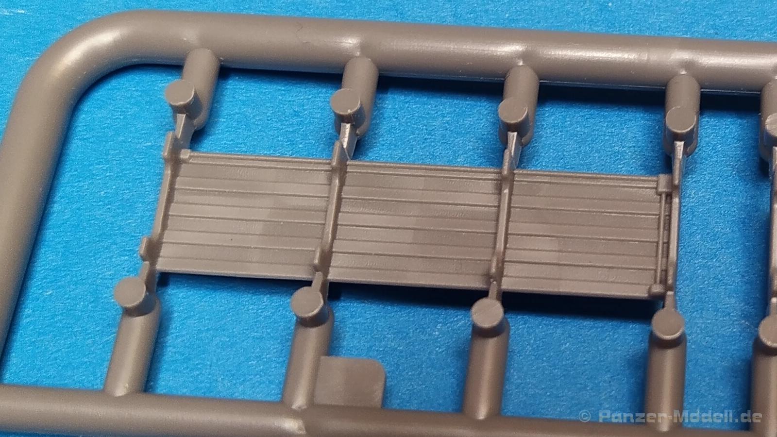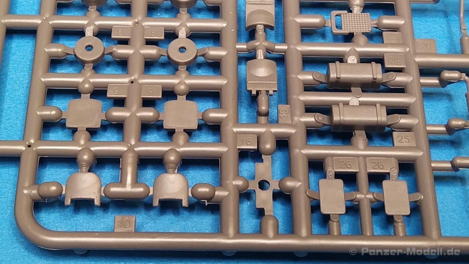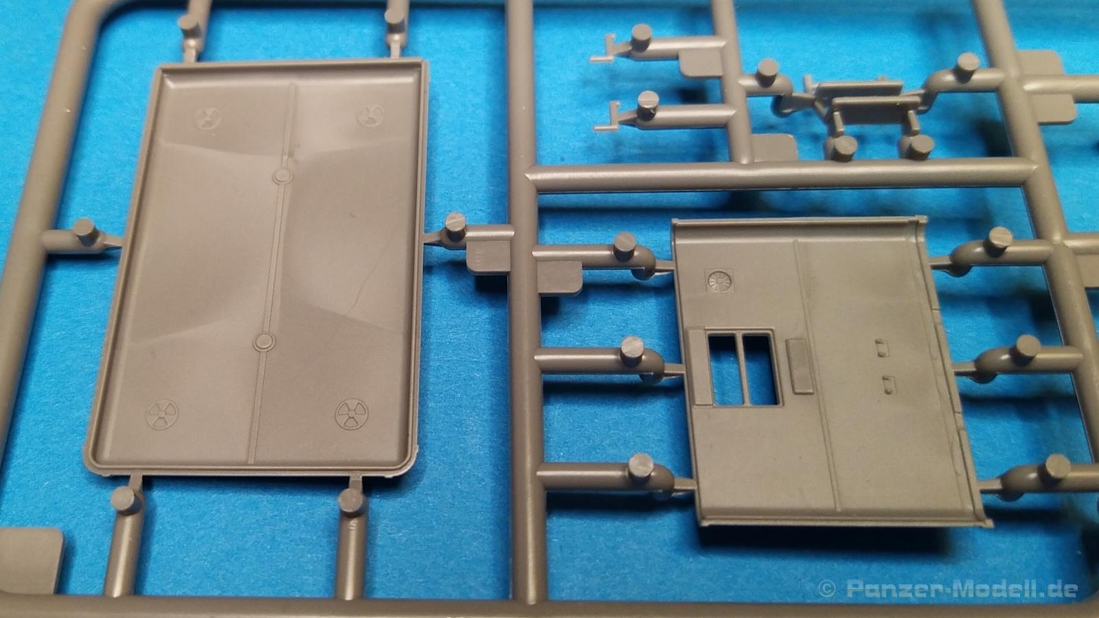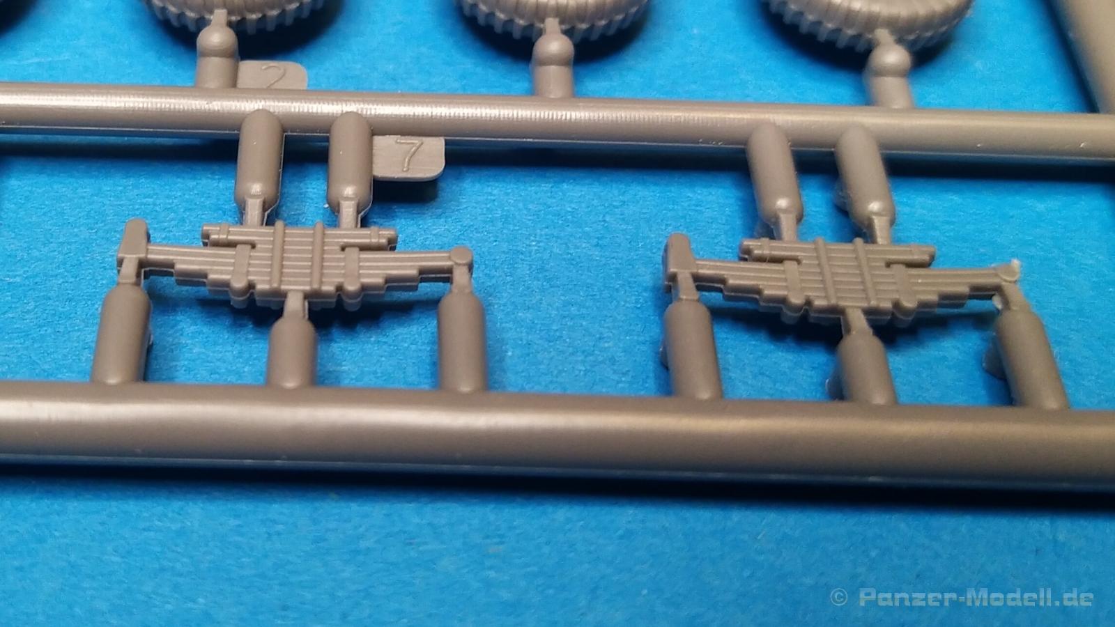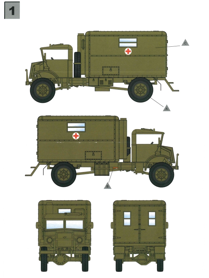 Die von IBG gewohnte Qualität in Detailierung und Gravierung der Teile ist auch bei diesem Bausatz wieder zu bewundern. Die Abspritzung der Bauteile ist tadellos. Alle Angüsse sind so gewählt, dass man diese gut entfernen kann. Nennenswerte Auswerfermarken an später sichtbaren Stellen sind nicht zu finden. Es gibt ältere vom Grundbausatz stammende Spritzlinge (ohne Bezeichnung) und neue Bauteile (Spritzlinge mit Bezeichnung). Wichtige und entscheidende Bauteile dieser Version wie die Räder, Rahmen und der Kofferaufbau wurden als neue Teile / Spritzlinge beigelegt. Dankenswerterweise ist der neue verlängerte Leiterrahmen als ein zusammenhängendes Bauteil konstruiert. So ist ein Ausrichten von Einzelteilen nicht nötig und der weitere Aufbau steht so auf einem soliden geraden „Fundament“. Genauso wie bei der Version „Office Lorry“ besitzt die Fahrerkabine auch hier eine Inneneinrichtung mit Pedalerie und Lenkrad. Konstruktionsbedingt lassen sich die Türen leider auch nicht geöffnet darstellen um später einen Blick darauf beim fertigen Modell zu ermöglichen. Auch die bekannte einfache Motornachbildung ist wieder vorhanden. Fotoätzteile kommen erst beim Bau des Kofferaufbaus und der Reserveradhalterung zum Einsatz. Sie sind aber nicht optional zu Plastikteilen zu verwenden, sondern werden immer zum Bau benötigt. Im Innenraum muss z.B. ein Regal aus diesem Material hergestellt werden. Und auch die Reserveradhalterung ist ein Modell am Modell aus PE-Teilen. Dünnwandige Schmutzfänger unter der Kabine und vorgenannte Dinge bewirken aber einen sehr hohen Grad an Feinheit und Detaillierung. Beim Kofferaufbau kann man die Hecktüren offen oder geschlossen bauen. Hier könnte man evtl. auch das Kofferdach lose auflegen um später einen besseren Blick auf den Innenraum zu erhalten. Alle Fenster des Bausatzes liegen als vorgezeichnete markierte Elemente auf einem Klarsichtfilm bei. IBG-typisch ist die übersichtliche Bauanleitung zweisprachig in polnisch und englisch ausgelegt. Auf der ersten Seite findet man eine Übersicht der enthaltenen Decals, Fotoätzteile, Klarsichtfilms und der insgesamt acht enthaltenen Spritzlinge. Mit einer Tabelle mit Farbangaben für die Hersteller Vallejo, Hataka, Life Color, Mr. Hobby, Lifecolor und AK Interactive endet die Einleitung. Auf der nächsten Seite beginnt auch schon die eigentliche Bauanleitung, die sich in 17 Baustufen gliedert. Einfarbige 3D-Zeichnungen pro Baustufe zeigen Schritt für Schritt der Weg zum fertigen Modell. Der Zusammenbau startet in Baustufe 1 mit dem Bau der Vorderachse, gefolgt von der Hinterachse in Baustufe 2. Die Motornachbildung wird in Baustufe 3 behandelt. Dann geht’s auch schon an den Zusammenbau der Fahrerkabine. Die Arbeiten dazu laufen bis in Baustufe 6. Dankenswerterweise wird am Ende eines Teilbereichs (z.B. Fahrerkabine) immer eine Zeichnung des fertigen Zustandes mit dargestellt. Mit dem Fahrgestell bzw. Leiterrahmen und den dazugehörigen Anbauteilen wie Achsaufhängung, Tanks, Stoßstange, etc. beschäftigen sich die Baustufen 7 bis 10. Den Abschluss bildet hier in Baustufe 10 die Montage der Räder. Ab der Baustufe 11 beschäftigen wir uns dann mit der Kabine und hier dann auch das erste Mal mit den enthaltenen Fotoätzteilen. Ein Regal muss dazu sauber und ordentlich gefaltet werden um eine korrekte „gerade“ Form zu erhalten. Alle anderen „Einbauten“ wie z.B. die Sitz- bzw. Liegebänke sind aus Plastikteilen zusammenzusetzen. Hier ist es bestimmt von Vorteil eine Teilbemalung des Kofferaufbauinnenraums durchzuführen, bevor man am Schluss dort nur schwer an Details herankommt. In den folgenden Baustufen werden dann nach und nach die Wände es Kofferaufbaus mit Details und Fenstern versehen und das ganze am Ende der Baustufe 14 mit dem Einbau der Türen komplettiert. In Baustufe 15 werden noch Teile unter dem Aufbau ergänzt und im Folgenden mit der sehr filigranen Reserveradhalterung schließlich in Baustufe 17 mit dem Fahrgestell vereinigt. Das Ende der Bauanleitung zeigt dann noch eine Zeichnung des fertig zusammengebauten Modells. Zu guter Letzt folgt auf der Rückseite der Anleitung ein Bemalungs- und Markierungsvorschlag: 1. Chevrolet C60L, ohne Kennzeichen, unbekannte Einheit, unbekannter Ort, unbekannter Zeitpunkt, einfarbig oliv drab Der mit nur zwei roten Kreuzen sehr übersichtliche Decalbogen kommt auf einem hellblauen Trägerpapier daher, augenscheinlich fällt kein Versatz beim Druck der Rotkreuzmarkierungen auf. Fahrzeugkennzeichen sind leider Fehlanzeige. Mein Fazit: Schlag auf Schlag folgen bei IBG Models weitere Versionen der bekannten Canadian Military Pattern Trucks (CMP) aus der Zeit des zweiten Weltkrieges im Maßstab 1:72. Ich bin gespannt welche Versionen noch erscheinen. Bei diesem Bausatz wurden Teile des bekannten Grundbausatzes mit neuen Teilen für den Aufbau und feiner detaillierten Rädern zu einer neuen Fahrzeugvariante zusammengestellt. Hier nun in der Variante des „San-Koffers“, der sicherlich auf vielen Dioramen seinen Platz finden wird. Die Detaillierung des Kofferaufbaus mit einigen Fotoätzteilen ist hervorragend, wenn auch z. B. die zu „faltende“ Reserveradhalterung für den ein oder anderen Modellbauer etwas abschreckend ist. Aber zu dem Bausatzpreis kann man sich ruhig einmal genauer mit dem Thema beschäftigen. Der Preis für die dargebotene Zusammenstellung und Qualität von Spritzgussteilen und Fotoätzteilen sind absolut ok. Die zu verwendenden Fotoätzteile machen den Bausatz sicherlich eher für den fortgeschrittenen Modellbauer geeignet. Für den aufgerufenen Preis von 15,50 Euro eine absolute Kaufempfehlung!