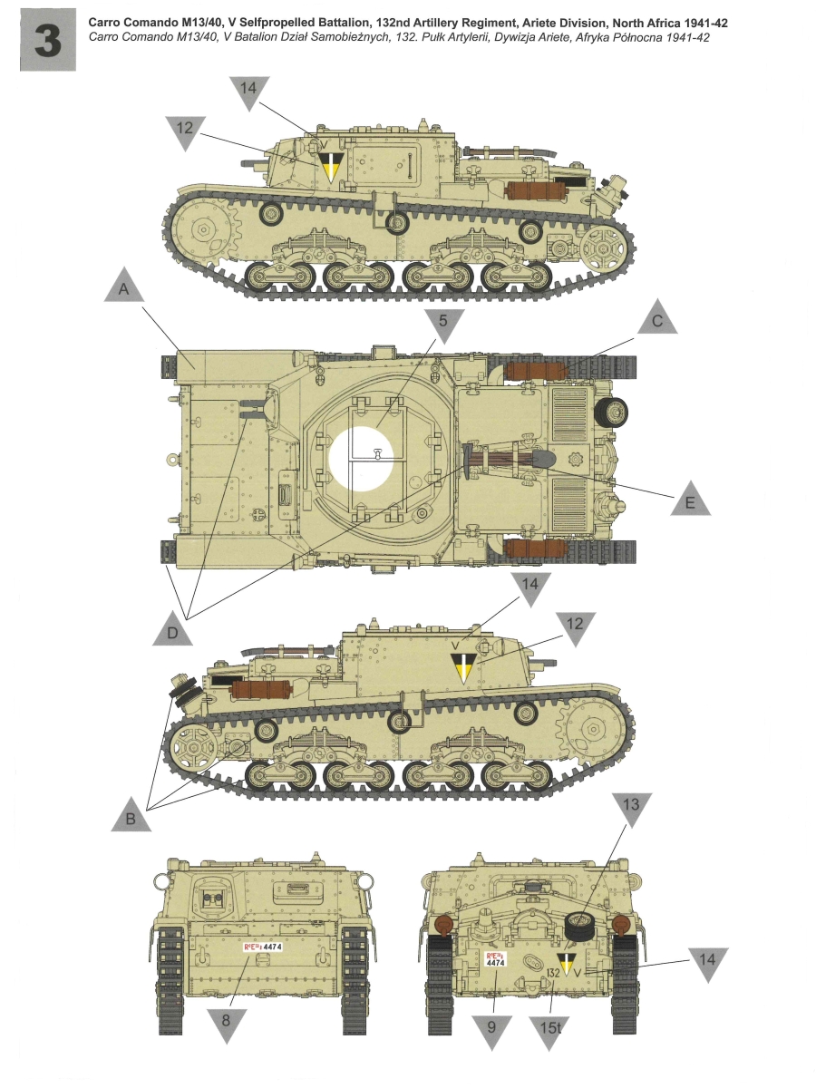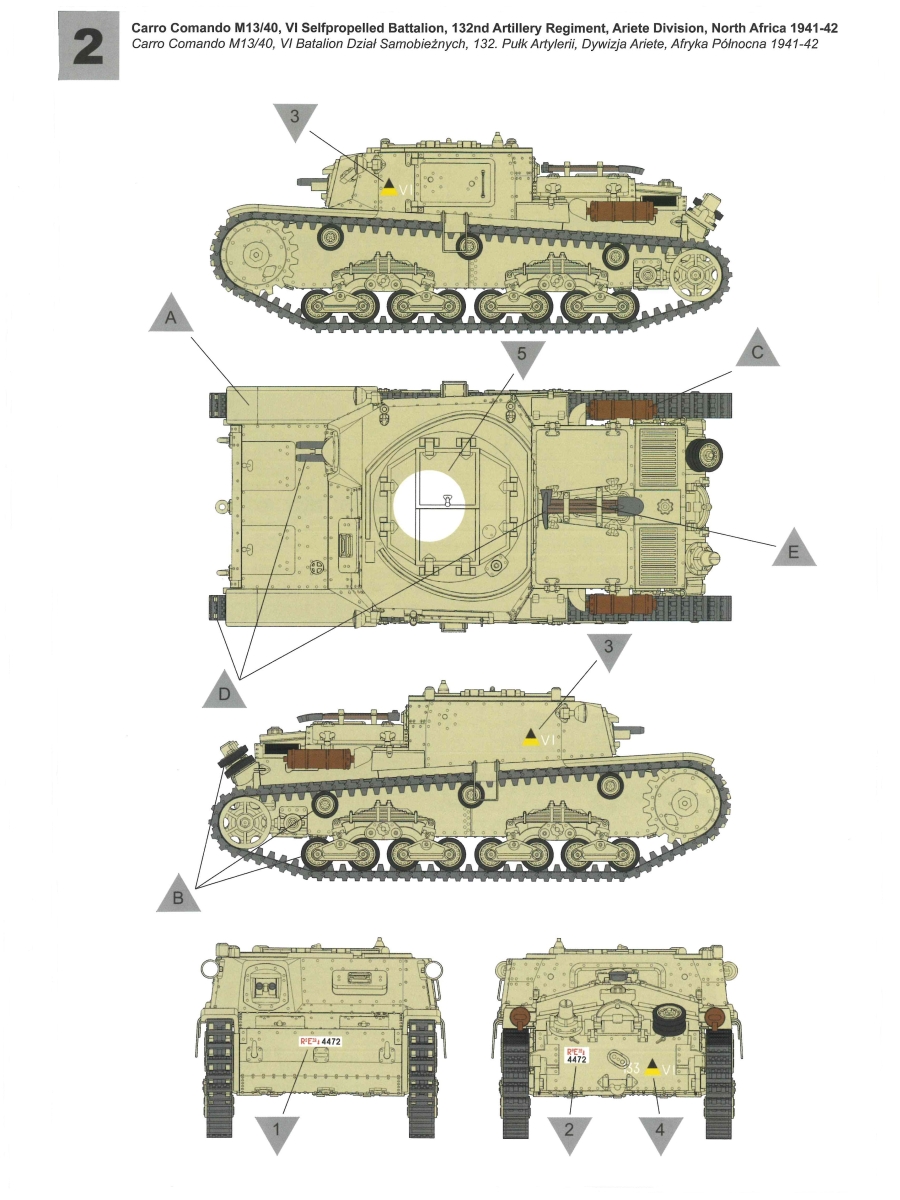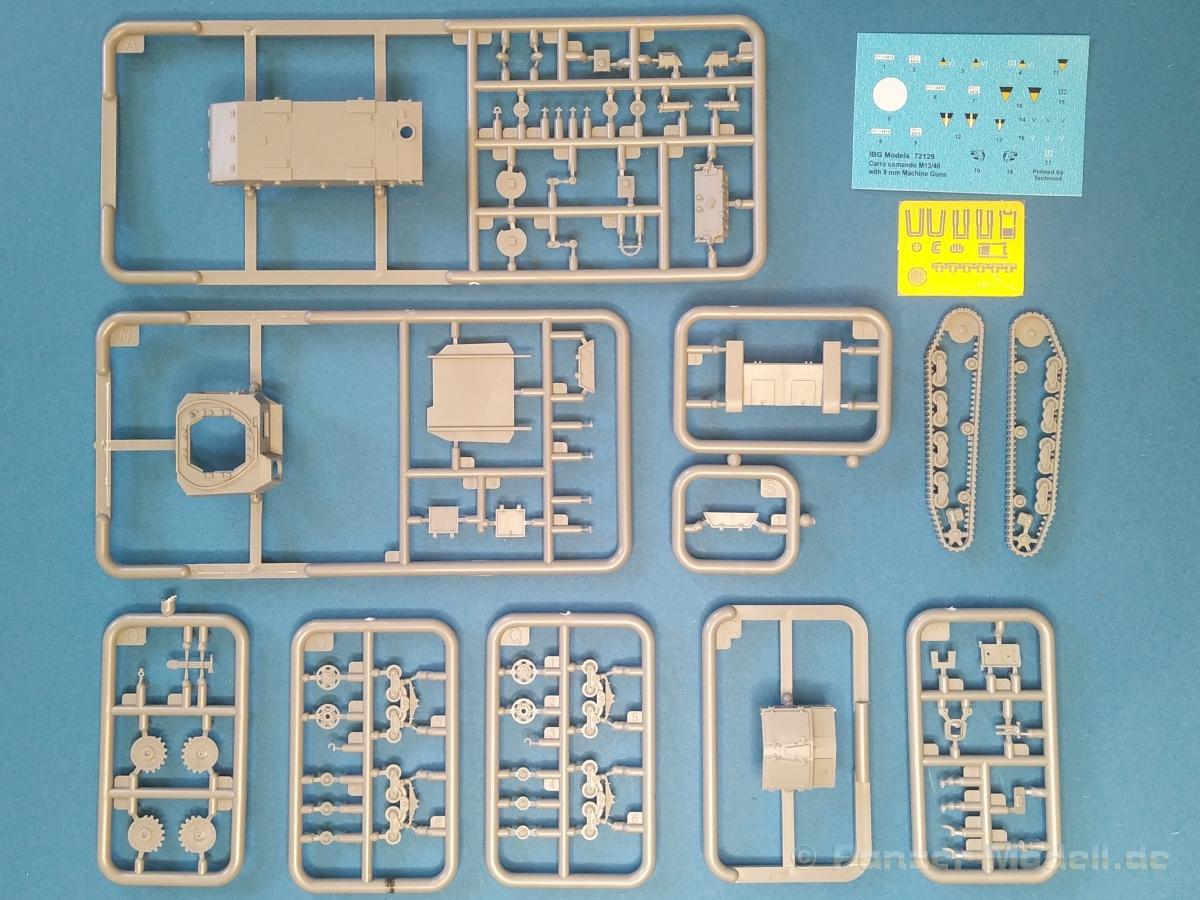 Carro Comando M13-40 w 8mm Machine Guns Unter der Bausatz-Nr. 72129 bringt uns IBG Models eine weitere Variante des italienischen Panzer M13/40 aus dem Zweiten Weltkrieges auf den Markt. Hierbei handelt es sich um den „Carro Comando“ (übersetzt Kommandowagen / Führungsfahrzeug) M13/40 mit 8mm Maschinengewehren. Der auch als Semovente Comando M40 bezeichnete Panzer war ein M13/40-Panzer, dessen Turm entfernt und durch eine große mehrteilige Luke ersetzt wurde. Die Wanne beherbergte neben den auch bei der Kampfpanzervariante verbauten Doppel-MGs zusätzliche Funkgeräte und andere Kommunikationsgeräte. Diese Fahrzeuge wurden als Führungsfahrzeuge u. a. in den Artillerieregimentern neben den Selbstfahrlafetten Semovente M75/18 eingesetzt. (Semovente übersetzt selbstfahrend). Gewicht, Panzerung und Leistungsparameter entsprachen der Kampfpanzerversion. Die vierköpfige Besatzung hatte durch Wegfall des Turmes als Bewaffnung aber nur die zwei 8mm Breda-MGs in der Wanne zur Verfügung. Da die Basis des Fahrzeuges die gleiche wie bei der Kampfpanzervariante M13/40 war, gab es auch hier die gleichen Defizite. Die Bauweise mit genieteten Platten und die Untermotorisierung waren merkliche Nachteile gegenüber Fahrzeugen der Alliierten und Deutschen. Trotz vieler Mängel wurden diese Führungsfahrzeuge mangels Alternativen aber bis zum Kriegsende eingesetzt. Nun aber zum hier gezeigten Modell. Ein Blick in den Stülpkarton (30 x 20 x 4,5cm) offenbart den folgenden Inhalt: