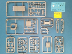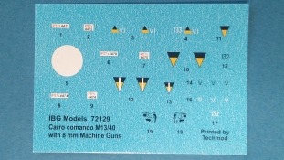 Ein kleiner Nassschiebebilderbogen, von der Firma Techmod beigesteuert, kommt auf einem kleinen hellblauen Trägerpapier daher. Alle Elemente sind ohne Versatz und speziell bei den Kennzeichen sehr feindetailliert und gut lesbar gedruckt. Mein Fazit: IBG präsentiert uns mit diesem Bausatz eine weitere Variante des markanten Fahrzeuges M13/40 der italienischen Streitkräfte aus der Zeit des Zweiten Weltkrieges. Und das in gewohnter sehr guter Machart. Der Aufbau und die Detailierung des Bausatzes und der enthaltenen Bauteile lassen ein fein detailliertes Modell erwarten, und das bei einer überschaubaren Anzahl von Teilen. Die dargebotene Zusammenstellung von Spritzgussteilen und Fotoätzteilen zum Preis von 17,50 Euro sind vollkommen ok und daher eine absolute Kaufempfehlung.