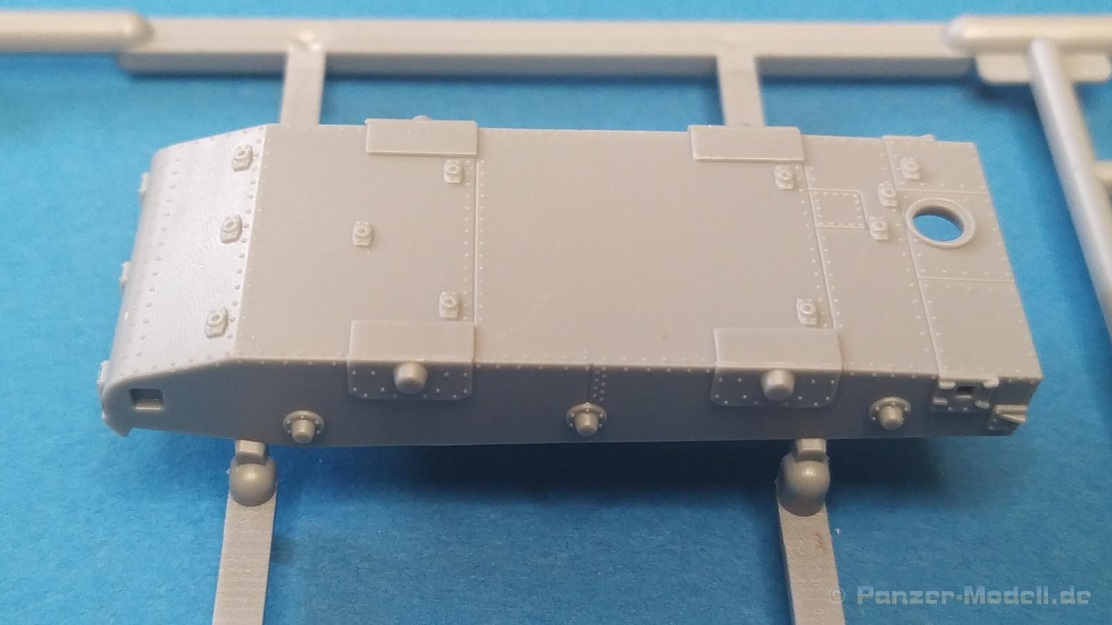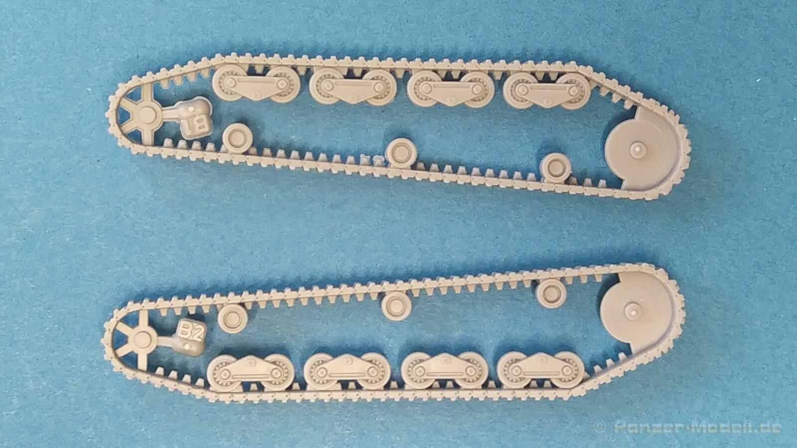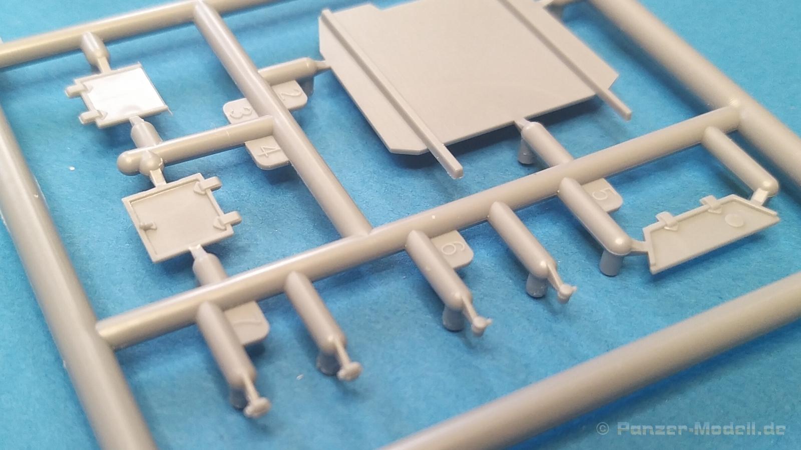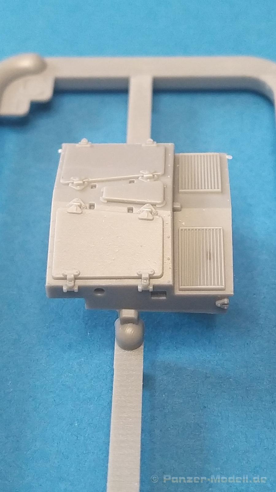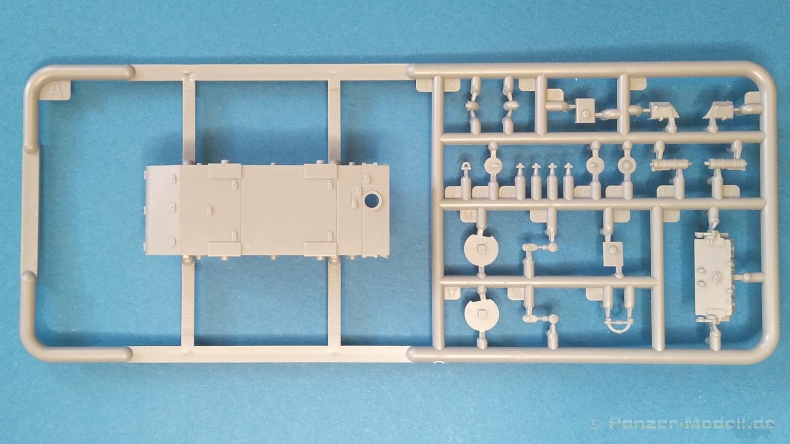 Ähnlich wie bei der Kampfpanzervariante (Nr. 72125) ist die gewohnt hohe IBG-Qualität auch bei diesem Bausatz wieder vor zu finden. Auswerfermarken auf später sichtbaren Stellen, Grat oder Fischhäute an den Bauteilen sind auch hier Fehlanzeige. Die Proportionen des Originals mit vielen Ecken und Kanten werden gut wiedergegeben. Die bei diesem Fahrzeugtyp bzw. der Bauweise markanten Nieten sind gut ausgeführt und wissen von der Darstellung zu gefallen. Wie von der vorangegangenen Version des Bausatzes bekannt sind die Ketten auch hier wieder in einem Stück gegossen und mit einer Hälfte der Laufrollen versehen. Der Zusammenbau wird dadurch wesentlich vereinfacht ohne dabei aber auf Details verzichten zu müssen. Fotoätzteile sind nur für wirklich wichtige Bauteile vorgesehen. Sie sind aber nicht optional zu Plastikteilen zu verwenden, sondern werden immer zum Bau benötigt. Die Fahrersichtluke sowie die Luken auf der Panzerkastenoberseite können offen oder geschlossen verbaut werden. Wenn man vorsichtig mit Kleber umgeht, bleiben der Bug-MG´s beweglich. Die Art und der Aufbau der Bauanleitung ist, wie von IBG gewohnt, wiedermal vorbildlich. Die wenigen Seiten lassen dank der detaillierten Darstellungen keine Fragen offen. Alle Hinweise sind in polnischer und englischer Sprache vorhanden. Auf der ersten Seite findet man eine Übersicht der enthaltenen Decals und Fotoätzteile. Gefolgt von den Farbangaben in tabellarischer Form für die Hersteller Vallejo, Hataka, Life Color, Mr. Hobby, AK Interactive und Mission Models. Die Übersicht der enthaltenen Spritzlinge folgt dann auf der nächsten Seite. Im Anschluss startet der Zusammenbau, der sich in nur 8 Baustufen gliedert. Hier wird pro Baustufe anhand von schwarz-weißen 3D-Zeichnungen der Weg zum fertigen Modell dargestellt bzw. erklärt. Der Bau des Modells startet in den Baustufen 1 und 2 mit der Komplettierung des rechten und linken Kettenlaufwerkes. Hier müssen nur noch die zweiten Hälften von Laufrollen, Antriebsrad und Spannrolle an die in einem Stück gegossenen Ketten angebracht werden. In Baustufe 3 wird die Wanne aus einer nahezu einteiligen Unterwanne und dreiteiliger Oberwanne zusammensetzt. Im Anschluss wird das Panzerkastenoberteil mit Anbauteilen wie dem Doppel-MG ergänzt um es dann in Baustufe 5 auf die Wanne zu setzten. Nach Anbringen der Spannradhalterung und einiger Staukisten können in Baustufe 6 schon die Laufwerke an der Wanne befestigt werden. In Baustufe 7 und der letzten Baustufe 8 werden weitere Anbauteile wie Aufstiegshilfen, Auspufftöpfe, Werkzeuge, etc. angebracht. Danach folgt eine Seite mit weiteren verfügbaren Bausätzen des Herstellers IBG im Maßstab 1:72. Den Abschluss der Bauanleitung bilden dann die 3 Bemalungs- und Markierungsvorschläge. Folgende Markierungs- bzw. Bemalungsvarianten werden gezeigt: