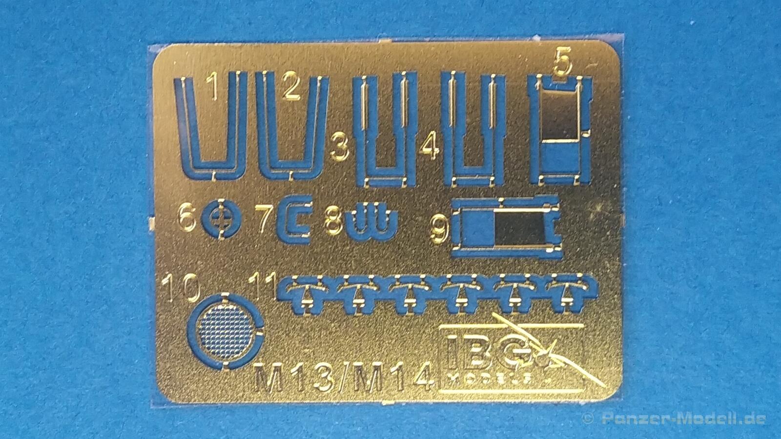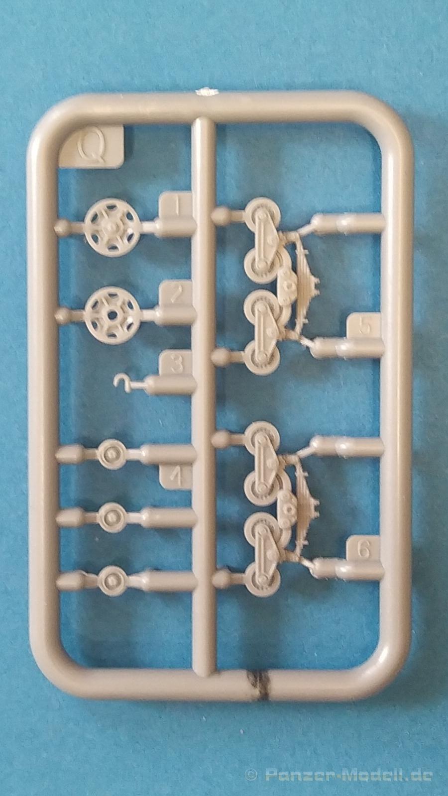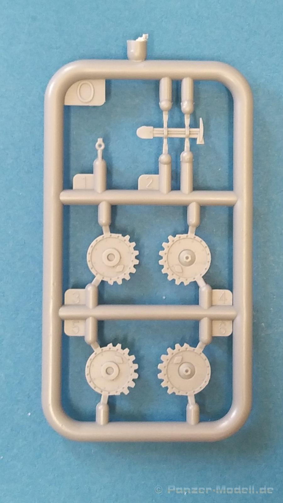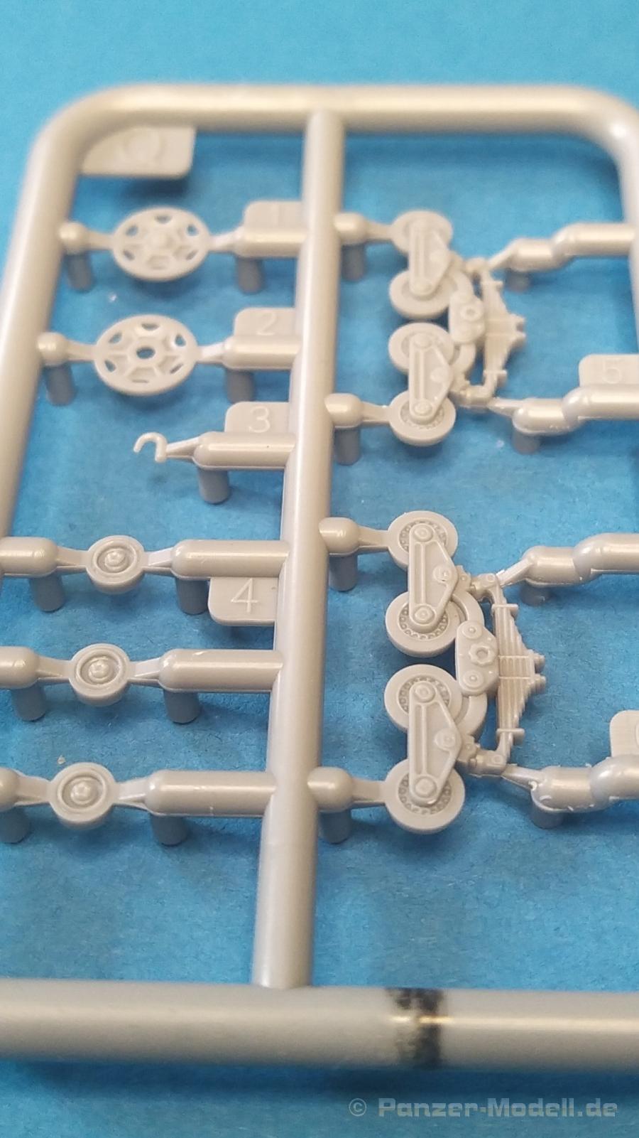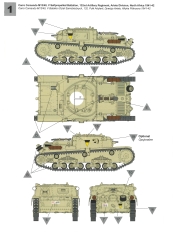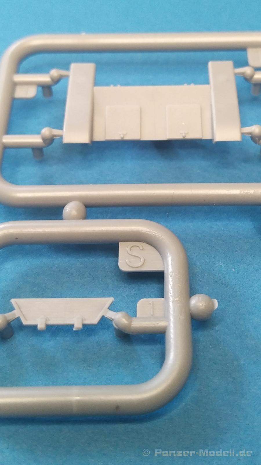 Ähnlich wie bei der Kampfpanzervariante (Nr. 72125) ist die gewohnt hohe IBG-Qualität auch bei diesem Bausatz wieder vor zu finden. Auswerfermarken auf später sichtbaren Stellen, Grat oder Fischhäute an den Bauteilen sind auch hier Fehlanzeige. Die Proportionen des Originals mit vielen Ecken und Kanten werden gut wiedergegeben. Die bei diesem Fahrzeugtyp bzw. der Bauweise markanten Nieten sind gut ausgeführt und wissen von der Darstellung zu gefallen. Wie von der vorangegangenen Version des Bausatzes bekannt sind die Ketten auch hier wieder in einem Stück gegossen und mit einer Hälfte der Laufrollen versehen. Der Zusammenbau wird dadurch wesentlich vereinfacht ohne dabei aber auf Details verzichten zu müssen. Fotoätzteile sind nur für wirklich wichtige Bauteile vorgesehen. Sie sind aber nicht optional zu Plastikteilen zu verwenden, sondern werden immer zum Bau benötigt. Die Fahrersichtluke sowie die Luken auf der Panzerkastenoberseite können offen oder geschlossen verbaut werden. Wenn man vorsichtig mit Kleber umgeht, bleiben der Bug-MG´s beweglich. Die Art und der Aufbau der Bauanleitung ist, wie von IBG gewohnt, wiedermal vorbildlich. Die wenigen Seiten lassen dank der detaillierten Darstellungen keine Fragen offen. Alle Hinweise sind in polnischer und englischer Sprache vorhanden. Auf der ersten Seite findet man eine Übersicht der enthaltenen Decals und Fotoätzteile. Gefolgt von den Farbangaben in tabellarischer Form für die Hersteller Vallejo, Hataka, Life Color, Mr. Hobby, AK Interactive und Mission Models. Die Übersicht der enthaltenen Spritzlinge folgt dann auf der nächsten Seite. Im Anschluss startet der Zusammenbau, der sich in nur 8 Baustufen gliedert. Hier wird pro Baustufe anhand von schwarz-weißen 3D-Zeichnungen der Weg zum fertigen Modell dargestellt bzw. erklärt. Der Bau des Modells startet in den Baustufen 1 und 2 mit der Komplettierung des rechten und linken Kettenlaufwerkes. Hier müssen nur noch die zweiten Hälften von Laufrollen, Antriebsrad und Spannrolle an die in einem Stück gegossenen Ketten angebracht werden. In Baustufe 3 wird die Wanne aus einer nahezu einteiligen Unterwanne und dreiteiliger Oberwanne zusammensetzt. Im Anschluss wird das Panzerkastenoberteil mit Anbauteilen wie dem Doppel-MG ergänzt um es dann in Baustufe 5 auf die Wanne zu setzten. Nach Anbringen der Spannradhalterung und einiger Staukisten können in Baustufe 6 schon die Laufwerke an der Wanne befestigt werden. In Baustufe 7 und der letzten Baustufe 8 werden weitere Anbauteile wie Aufstiegshilfen, Auspufftöpfe, Werkzeuge, etc. angebracht. Danach folgt eine Seite mit weiteren verfügbaren Bausätzen des Herstellers IBG im Maßstab 1:72. Den Abschluss der Bauanleitung bilden dann die 3 Bemalungs- und Markierungsvorschläge. Folgende Markierungs- bzw. Bemalungsvarianten werden gezeigt: