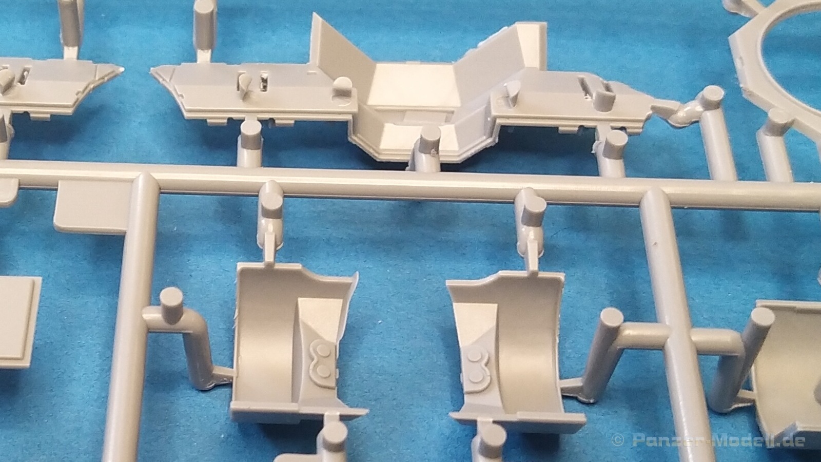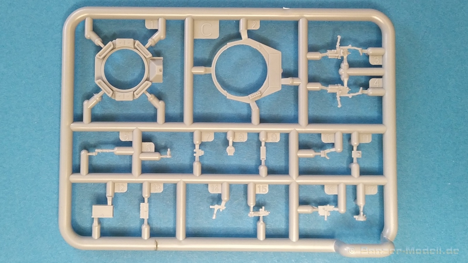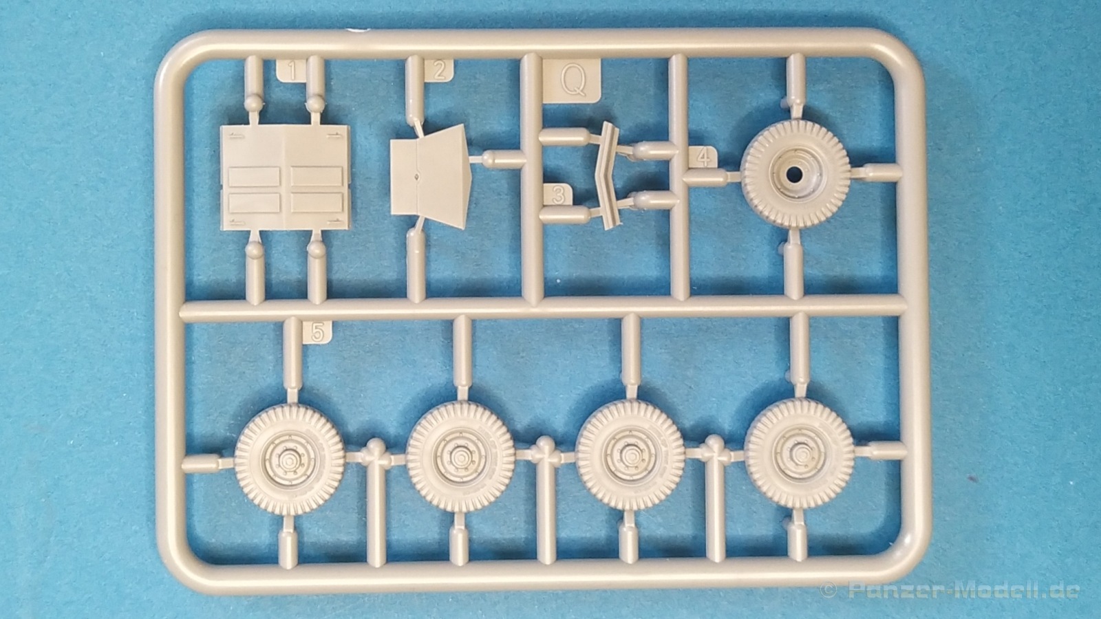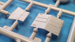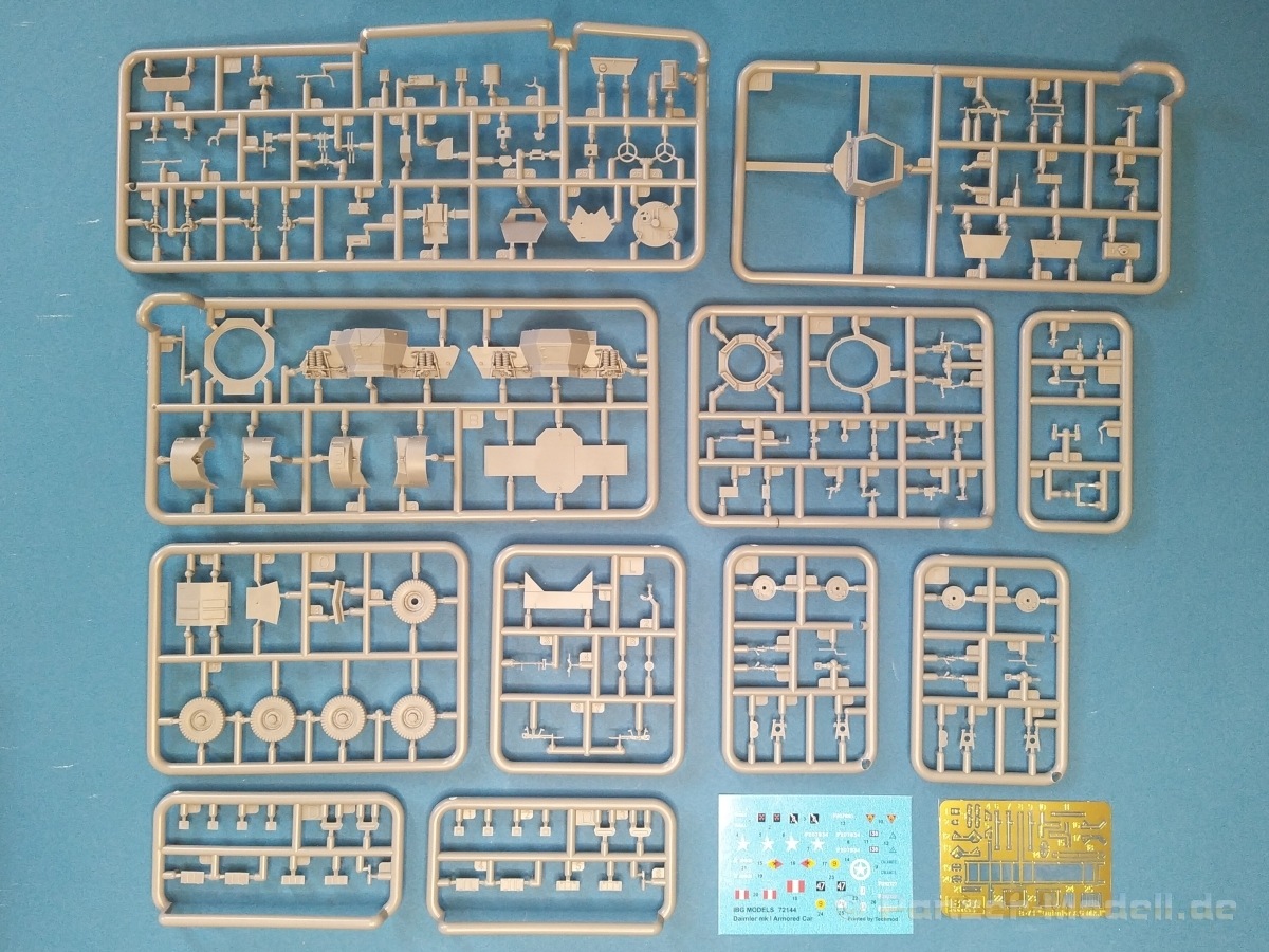 Nach Öffnen des Kartons finden wir wiedermal, wie von IBG gewohnt, sehr gut ausgeführte Spritzlinge in grauer Farbe ohne Grat oder Fischhäute an den Bauteilen. Nennenswerte Auswerfermarken sind auf später sichtbaren Stellen nicht zu finden. Die Details sind scharfkantig fein ausgeführt und die Proportionen des Originalfahrzeuges werden gut wiedergegeben. Die bei diesem Radfahrzeug markanten Räder sind bis auf die innenliegende Bremse einteilig ausgeführt ohne dabei auf Details verzichten zu müssen. Das Profil ist sehr gut wiedergegeben. Der Panzerkastenaufbau links und rechts sind zusammen mit großen Teilen der Federn und Radaufhängungen jeweils ein zusammenhängendes Bauteil. Ein entscheidender Vorteil um die Ausrichtung der Räder beim Bau zu vereinfachen. Erfreulicherweise gibt es für das Fahrgestell und den Turm eine detaillierte Inneneinrichtung. So schaut man bei der offenen Darstellung der Turmluke nicht in ein leeres Fahrzeug. Hier wurden Lenkräder, Munitionshalterungen, Turmbühne, Sitzplätze, Funkgerät und sichtbare Teile der Bewaffnung im Turm umgesetzt. Die Fahrersichtluke kann genauso wie die Turmluke offen oder geschlossen montiert werden. Fotoätzteile sind nur für wirklich wichtige und filigrane Bauteile vorgesehen. Sie sind aber nicht optional zu Plastikteilen zu verwenden, sondern werden immer zum Bau benötigt und sorgen für zusätzliche Detaillierung. Die Darstellungen in der beiliegenden Bauanleitung lassen keine Fragen offen. Alle Hinweise sind wie gewohnt in polnischer und englischer Sprache vorhanden. Anders wie bei anderen Bausätzen des Herstellers, findet man diesmal erfreulicherweise auf der ersten Seite der Bauanleitung einen kurzen historischen Abriss zum Originalfahrzeug. Die zweite Seite zeigt eine Übersicht der enthaltenen Spritzlinge, Decals und Fotoätzteile. Eine gesonderte Darstellung des Innenraumes von Turm und Fahrgestell mit Farbangaben und zugehöriger Tabelle für die Hersteller Vallejo, Hataka, Life Color, Mr. Hobby, AK Interactive und Mission Models folgt auf Seite drei. Im Anschluss startet der Zusammenbau, der sich in 26 Baustufen gliedert. Hier wird pro Baustufe anhand von schwarz-weißen 3D-Zeichnungen der Weg zum fertigen Modell dargestellt bzw. erklärt. Der Bau des Modells startet in den Baustufen 1 und 2 mit der Komplettierung des Innenraums auf der Grundplatte des Fahrgestells. Die folgenden Baustufen zeigen das Anbringen der Teile des Panzerkastens. Hier ist es sinnvoll schon den Innenraum zu bemalen bevor er durch Dach und weitere Aufbauten nicht mehr erreicht werden kann. In Baustufe 6 und 7 wird die Radaufhängung montiert. Die eigentlich einteiligen Räder werden mit einem separaten Innenteil bzw. angedeuteter Bremse in Baustufe 8 ergänzt. Die Baustufen 9 bis 12 zeigen die Montage der Schutzbleche bzw. Radabdeckungen. Hier ist sorgfältiges Arbeiten gefragt. Fotoätzeile müssen rechtwinklig gebogen werden um damit dann die großen Plastikteile zu ergänzen, die dann wiederrum am Panzeraufbau angebracht werden sollen. Die Räder sollen in Baustufe 13 zusammen mit einem Satz Schmutzfänger montiert werden. Für die Lackierung würde ich sie hier aber noch nicht anbringen. Die folgenden Baustufen zeigen dann das Anbringen diverser kleiner und großer Anbauteile wie z.B. Kanister, Kisten etc. bis das Fahrzeug ohne Turm in Baustufe 17 nahezu komplett ist. Ab Baustufe 18 wird der Turm montiert. Nach Einbau des Funkgerätes im Turmheck auf dem Turmunterteil folgt im Weiteren der Einbau der Bewaffnung, Blende und Innendetaillierung des Turmoberteils. Baustufe 24 und 25 zeigen das Anbringen weiterer Details außen am Turm. Der Bau des Modells endet mit Aufsetzen des Turmes in Baustufe 26 und einer nachfolgenden 3D-Ansicht des fertig montierten Modells. Den Abschluss der Bauanleitung bilden dann die 4 Bemalungs- und Markierungsvorschläge. Folgende Markierungs- bzw. Bemalungsvarianten werden gezeigt: