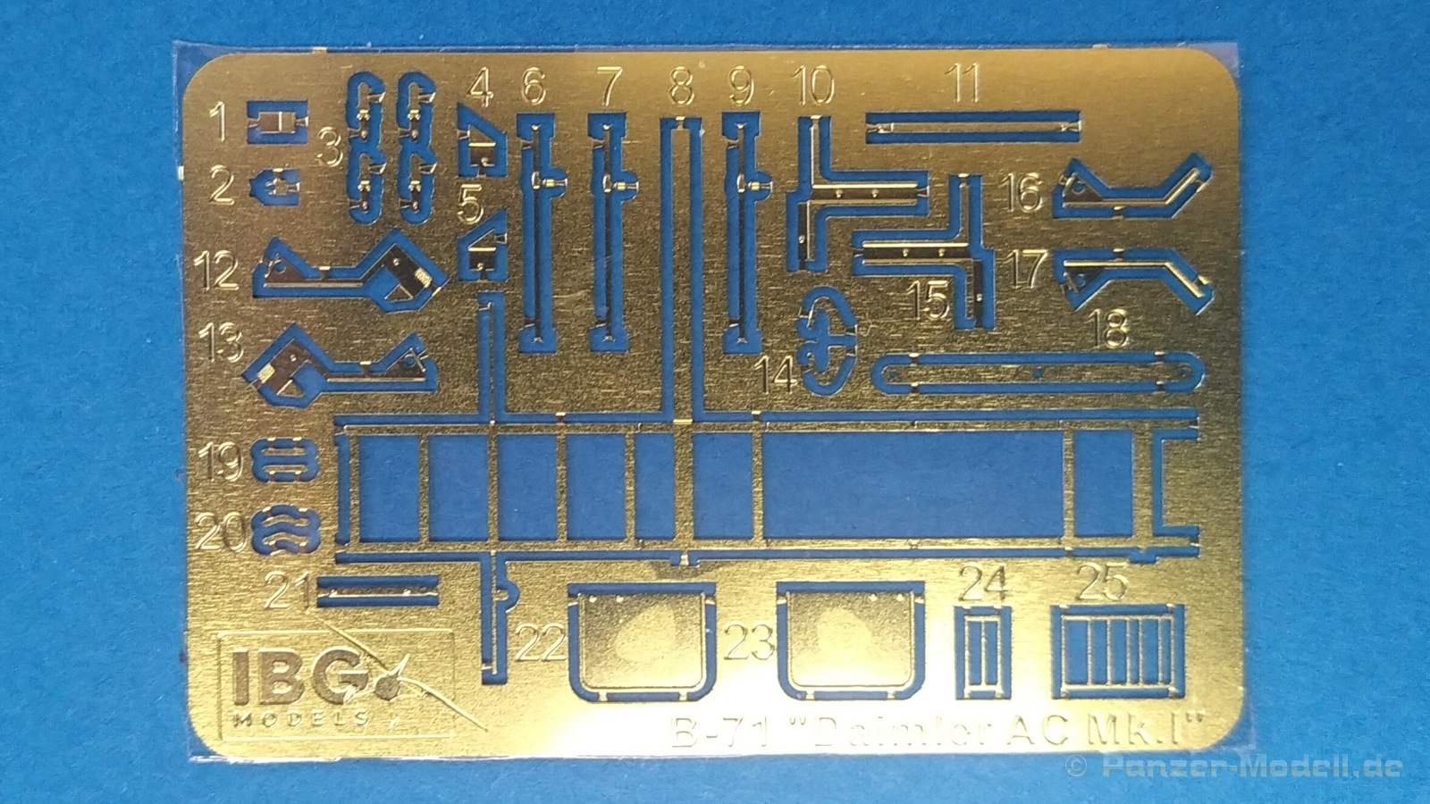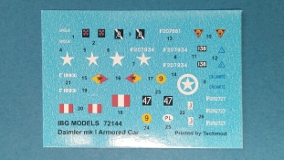 Die von Techmod produzierten Nassschiebebilder kommen wie gewohnt auf einem kleinen hellblauen Trägerpapier daher. Die einzelnen Elemente sind farbintensiv, ohne Versatz und sehr feindetailliert gedruckt.Mein Fazit: IBG hat mit diesem Bausatz eines der bekanntesten britischen Aufklärungsfahrzeuge aus der Zeit des zweiten Weltkrieges im kleinen Maßstab herausgebracht. In gewohnter sehr guter Machart wird uns hier ein Fahrzeug mit kompletter Inneneinrichtung geboten. Der Preis für die dargebotene Zusammenstellung von Spritzgussteilen, Fotoätzteilen und der Innendetaillierung sind vollkommen ok. Der Aufbau und die Detailierung des Bausatzes und der enthaltenen Bauteile lassen ein fein detailliertes Modell erwarten, und das bei einer überschaubaren Anzahl von Teilen. Hier und da muss besondere Sorgfalt bei der Verarbeitung der Fotoätzteile an den Tag gelegt werden. Deshalb ist dieser Bausatz sicherlich auch nicht für den Anfänger gedacht. Für den aufgerufenen Preis von 15,95 Euro eine absolute Kaufempfehlung!