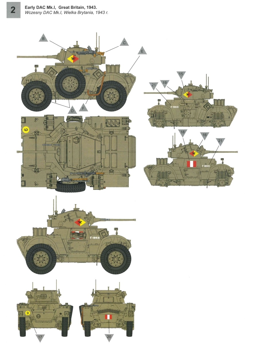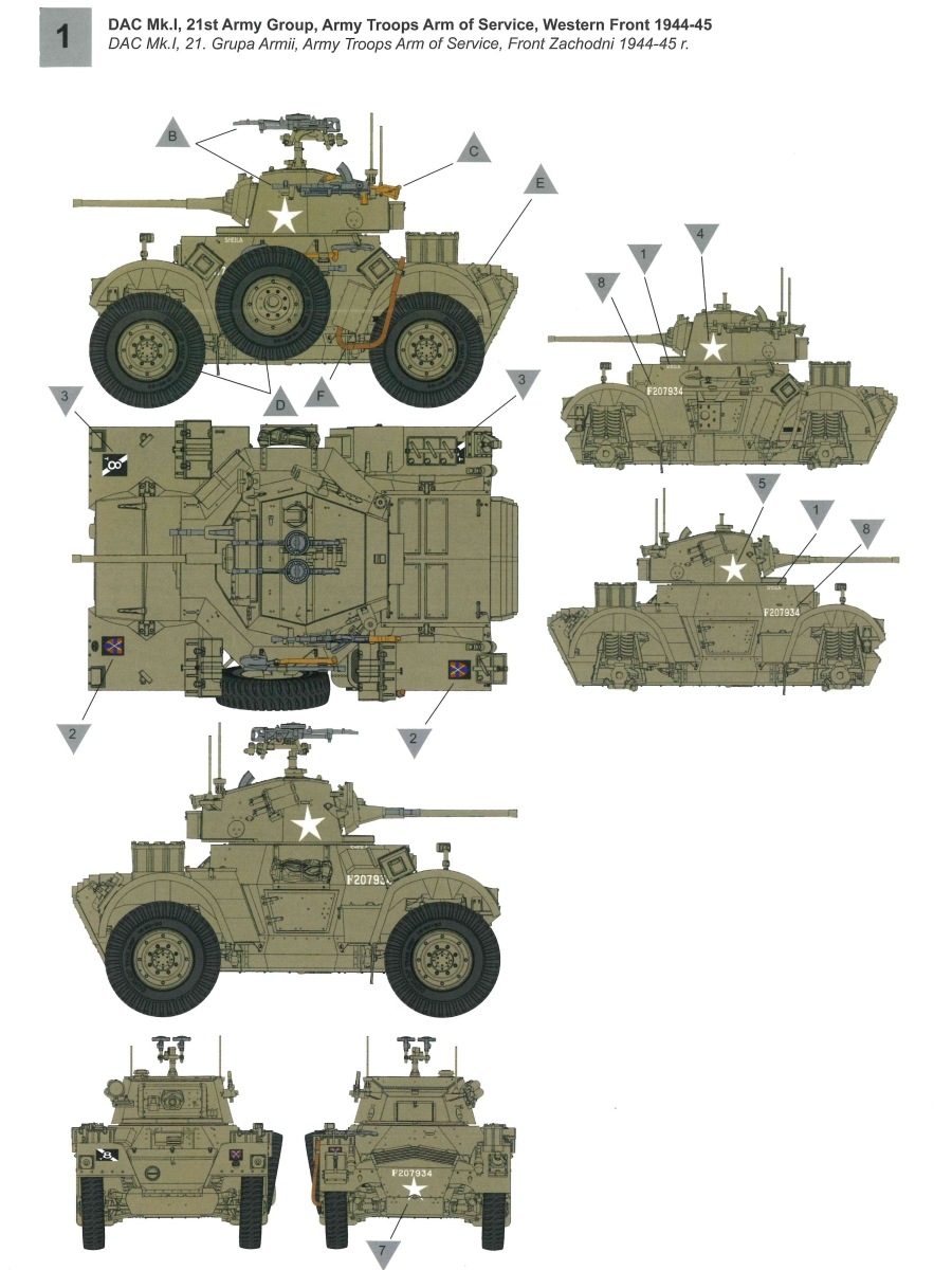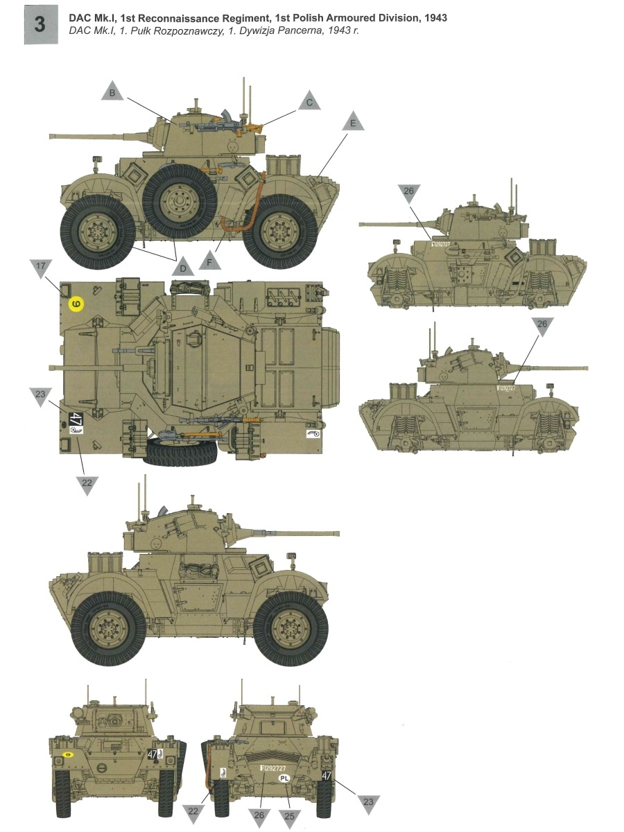 DAC Mk. I British Armoured Car IBG Models hat unter der Bausatz-Nr. 72144 den britischen Panzerwagen „DAC MK. I British Armoured Car“ im Maßstab 1:72 herausgebracht. Hinter der Bezeichnung verbirgt sich das Aufklärungsfahrzeug Daimler Armoured Car in der Version Mark I. Dieser britische Panzerwagenentwurf aus dem Zweiten Weltkrieg stammt wie schon die „kleinere“ Variante Daimler Dingo Scout Car aus dem Hause Birmingham Small Arms Ltd. (BSA), die später in der Firma Daimler Company Ltd. aufgenommen wurde. Es war eine Parallelentwicklung und stellte eine vergrößerte Version des gleichen Grundrisses mit Einbau eines stärkeren Motors und eines Turmes ähnlich dem leichten Panzer Mark VII dar. Zu seinerzeit stellten diese Fahrzeuge mit Ihren 95 PS Motoren im Heck, einer Viskokupplung, einem Wilson-Vorwahlgetriebe und einem H-Antrieb mit Kardanwellen zu allen einzelaufgehängten Rädern ein sehr fortschrittliches Designkonzept dar. Dieses Design und die Robustheit gepaart mit der Zuverlässigkeit machten diesen Fahrzeugtyp ideal für Aufklärungs- und Begleitschutzeinsätze. Die ersten Prototypen wurden ab 1939 hergestellt, die Serienfertigung verzögerte sich allerdings bis Mitte 1941, da es Probleme mit dem Getriebe durch das höhere Gewicht im Vergleich zum Dingo Scout Car gab. Die Daimler Company baute insgesamt knapp 2700 dieser Panzerwagen. Das 7,6 Tonnen schwere Fahrzeug war 4 Meter lang, knapp 2,50m breit und 2,30m hoch und bot seiner dreiköpfigen Besatzung einen Panzerschutz hinter geschweißten Panzerplatten in einer Stärke von 7 bis 16mm. Als Bewaffnung stand eine 2 Pfünder Quickfirekanone (QF) mit einem achsparallelen 7,92mm Besa-MG zur Verfügung. Zusätzlich gab es auch noch ein leichtes Bren-MG im Kaliber 303. Angetrieben von einem Daimler 4,1 Liter Sechszylinder Benzin-Motor mit 95 PS erreichte das allradgetriebene Fahrzeug eine Geschwindigkeit von bis zu 80 km/h. Mit einer Tankfüllung konnte eine Reichweite von bis zu 320km erzielt werden. Einsätze während des Zweiten Weltkrieges sahen diese Fahrzeuge in Nordafrika, Europa und auch Asien. In den 1950er und 1960er Jahren wurden ehemalige britische Fahrzeuge in Mitgliedsstaaten des Commonwealth exportiert und viele Jahre weiter betrieben. Nun aber zum hier gezeigten Modell. Ein Blick in den Stülpkarton (30 x 20 x 4,5cm) offenbart den folgenden Inhalt: