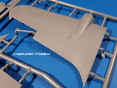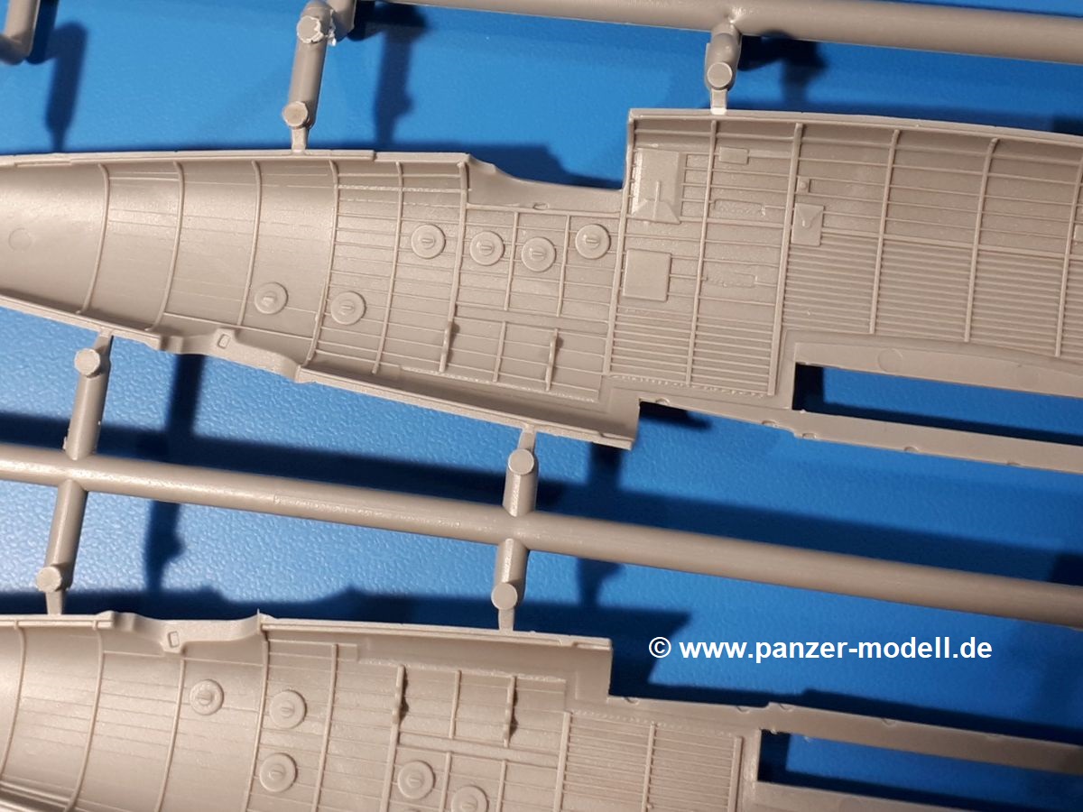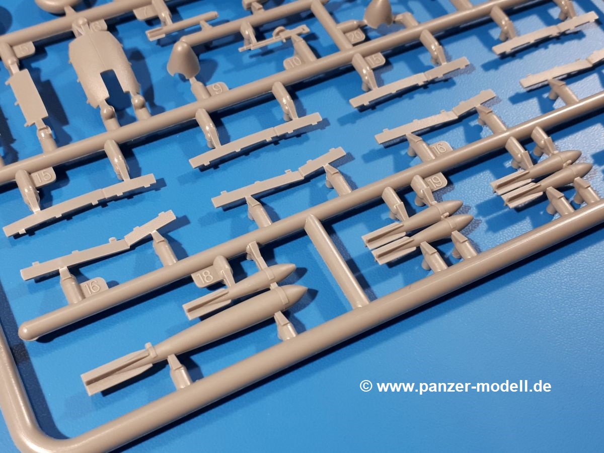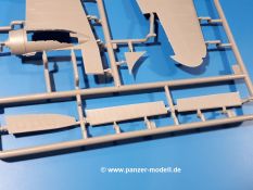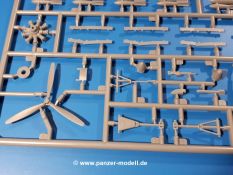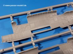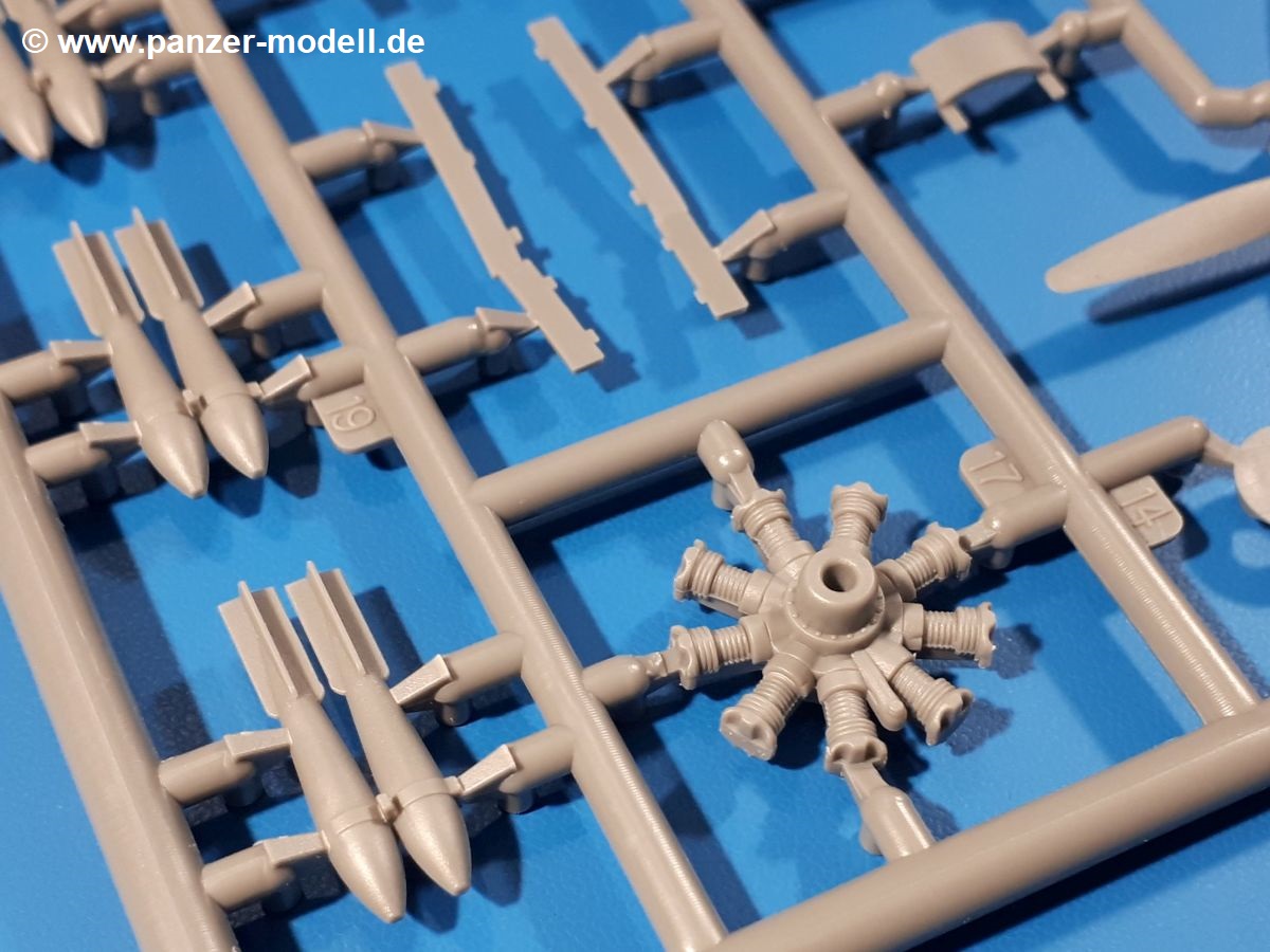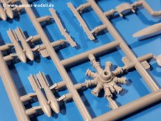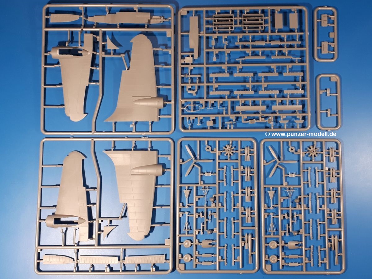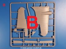 Die Teile aus hellgrauem Plastik sind sauber ausgespritzt, ohne Grat und Versatz. Insgesamt macht auch dieser Bausatz einen sehr guten Eindruck. Feine Gravuren und sehr gut ausgearbeitete Details fallen ins Auge. Erfreulich kleine Angüsse werden sich leicht entfernen und versäubern lassen. Die Klarsichtteile machen ihrem Namen alle Ehre, denn sie sind klar und schlierenfrei. Die Verstrebungen der Kanzel treten gut hervor und erleichtern das spätere Lackieren erheblich.Da es sich bei diesem Modell um eine B-Version mit Doppelleitwerk handelt, befinden sich im Bausatz andere Rumpfhälften und die Spritzlinge für das Doppelleitwerk. Die Spritzlinge A-E, J und die PE-Teile kennen wir bereits aus dem IBG Bausatz 72511. Auch wenn wir einen neuen Rumpf haben, hat hier IBG wieder allerlei Details in dieses Modell hineingestopft. Der Innenraum kann sich wirklich sehen lassen. So sind innen in den sichtbaren Bereichen alle Spanten zu sehen. Dazu kommen MG-Trommelmagazine und etliche Bedienelemente. Kleinere Details sind mittels PE dargestellt, wie z.B. das Steuerhorn und Bedienhebel des Piloten, Sitzgurte und Einbaubleche. Die insgesamt 3 Bord-MGs sind mit MG-Zieleinrichtungen aus PE ausgestattet. Die Bombenschächte sind voll ausgestattet mit Innenverkleidungen und insgesamt 16, jeweils in Paaren angeordneten, 50-kg Bomben in den Flügelschächten und 2 300-kg und 2 weiteren 50-kg Bomben im Rumpfbombenschacht. Man kann zwischen geöffneten und geschlossenen Bombenschachtklappen wählen. Die Fahrwerksschächte erhalten auch Auskleidungen aus PE, die Fahrwerksbeine werden ausgeklappt eingeklebt. Da keine Besatzung im Bausatz enthalten ist, macht es Sinn, die Maschine auf dem Flugplatz abgestellt darzustellen. Die beiden 8-Zylinder Kolbenmotoren weisen Kühlrippen auf und erhalten aus PE Zuleitungen. Die 3-Blatt Propeller bekommen noch konische Naben. Flügel und Rumpf haben vielen versenkte Gravuren der Blechstösse.Die Decals sind seidenmatt glänzend fast ohne Trägerrand. Der Decalbogen reicht für zwei Maschinen: