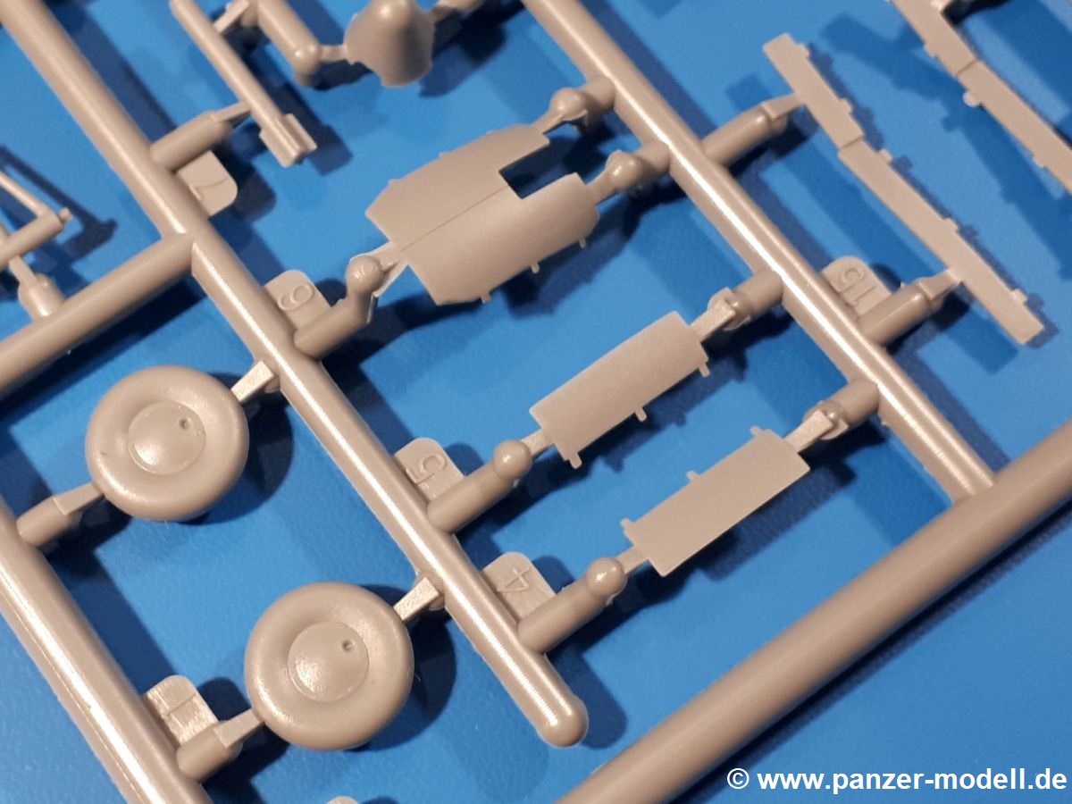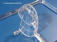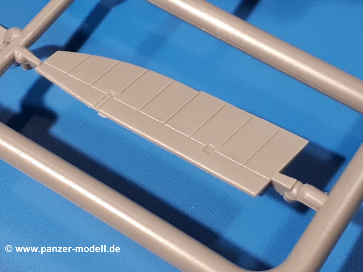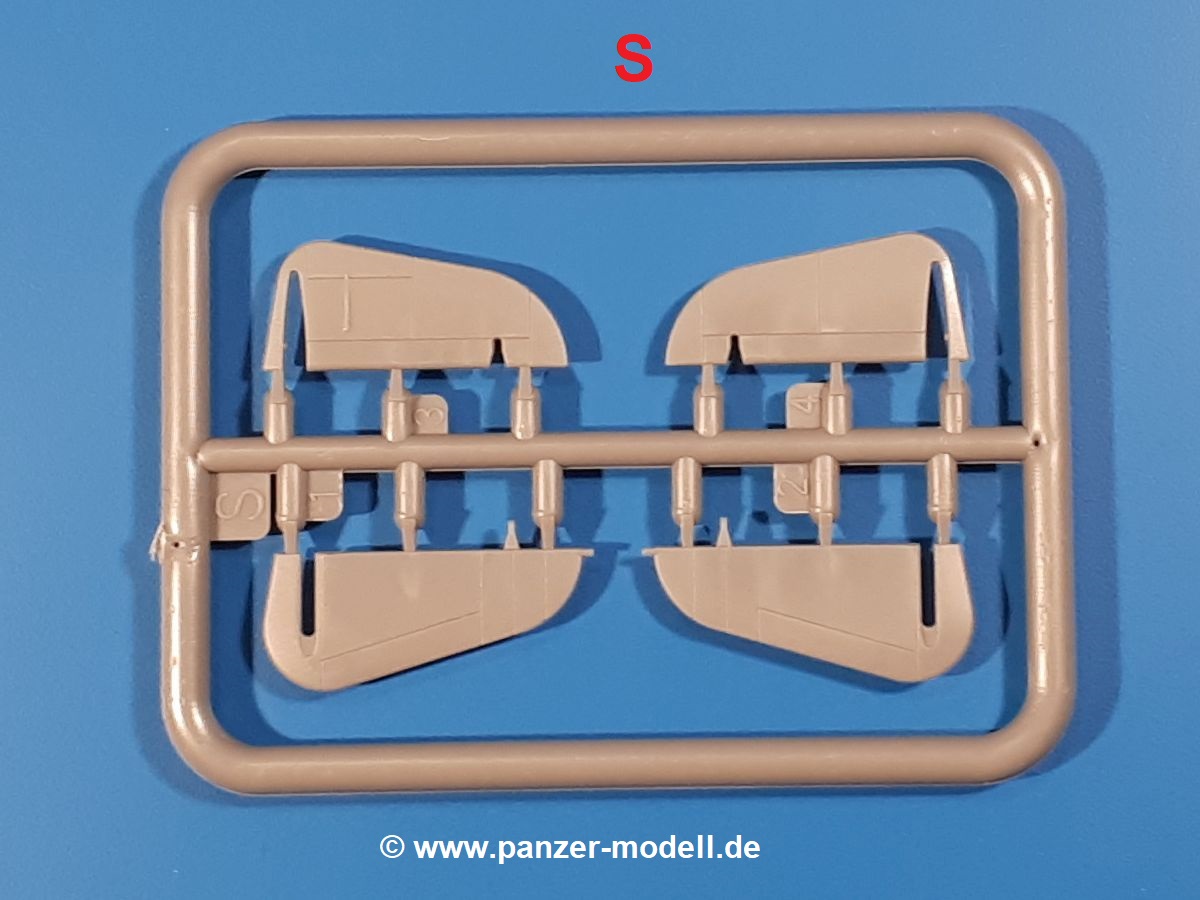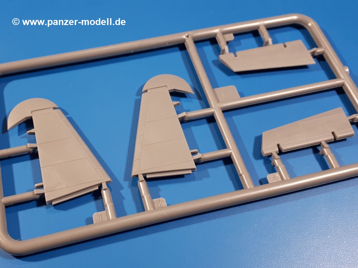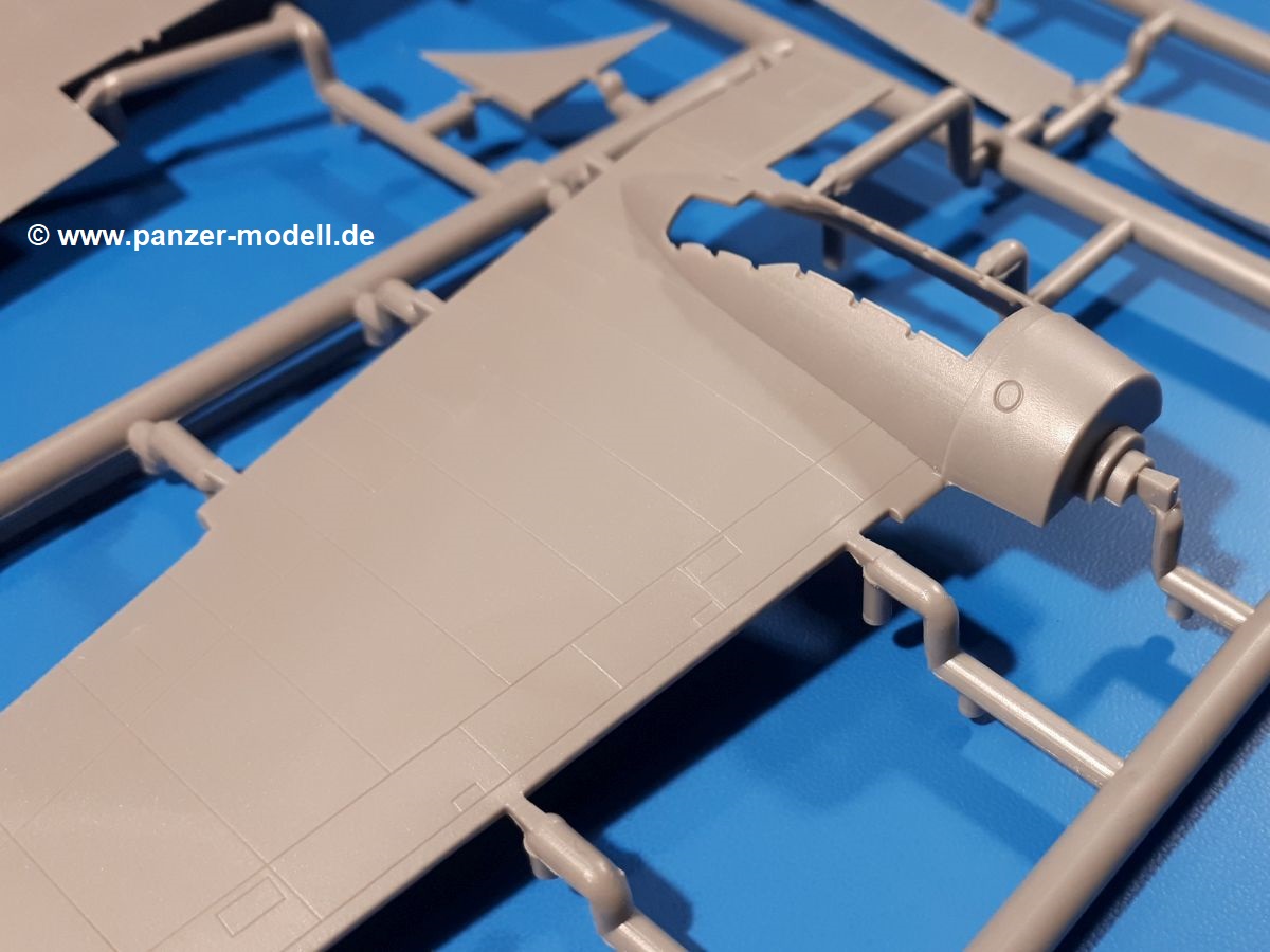 Die Teile aus hellgrauem Plastik sind sauber ausgespritzt, ohne Grat und Versatz. Insgesamt macht auch dieser Bausatz einen sehr guten Eindruck. Feine Gravuren und sehr gut ausgearbeitete Details fallen ins Auge. Erfreulich kleine Angüsse werden sich leicht entfernen und versäubern lassen. Die Klarsichtteile machen ihrem Namen alle Ehre, denn sie sind klar und schlierenfrei. Die Verstrebungen der Kanzel treten gut hervor und erleichtern das spätere Lackieren erheblich.Da es sich bei diesem Modell um eine B-Version mit Doppelleitwerk handelt, befinden sich im Bausatz andere Rumpfhälften und die Spritzlinge für das Doppelleitwerk. Die Spritzlinge A-E, J und die PE-Teile kennen wir bereits aus dem IBG Bausatz 72511. Auch wenn wir einen neuen Rumpf haben, hat hier IBG wieder allerlei Details in dieses Modell hineingestopft. Der Innenraum kann sich wirklich sehen lassen. So sind innen in den sichtbaren Bereichen alle Spanten zu sehen. Dazu kommen MG-Trommelmagazine und etliche Bedienelemente. Kleinere Details sind mittels PE dargestellt, wie z.B. das Steuerhorn und Bedienhebel des Piloten, Sitzgurte und Einbaubleche. Die insgesamt 3 Bord-MGs sind mit MG-Zieleinrichtungen aus PE ausgestattet. Die Bombenschächte sind voll ausgestattet mit Innenverkleidungen und insgesamt 16, jeweils in Paaren angeordneten, 50-kg Bomben in den Flügelschächten und 2 300-kg und 2 weiteren 50-kg Bomben im Rumpfbombenschacht. Man kann zwischen geöffneten und geschlossenen Bombenschachtklappen wählen. Die Fahrwerksschächte erhalten auch Auskleidungen aus PE, die Fahrwerksbeine werden ausgeklappt eingeklebt. Da keine Besatzung im Bausatz enthalten ist, macht es Sinn, die Maschine auf dem Flugplatz abgestellt darzustellen. Die beiden 8-Zylinder Kolbenmotoren weisen Kühlrippen auf und erhalten aus PE Zuleitungen. Die 3-Blatt Propeller bekommen noch konische Naben. Flügel und Rumpf haben vielen versenkte Gravuren der Blechstösse.Die Decals sind seidenmatt glänzend fast ohne Trägerrand. Der Decalbogen reicht für zwei Maschinen: