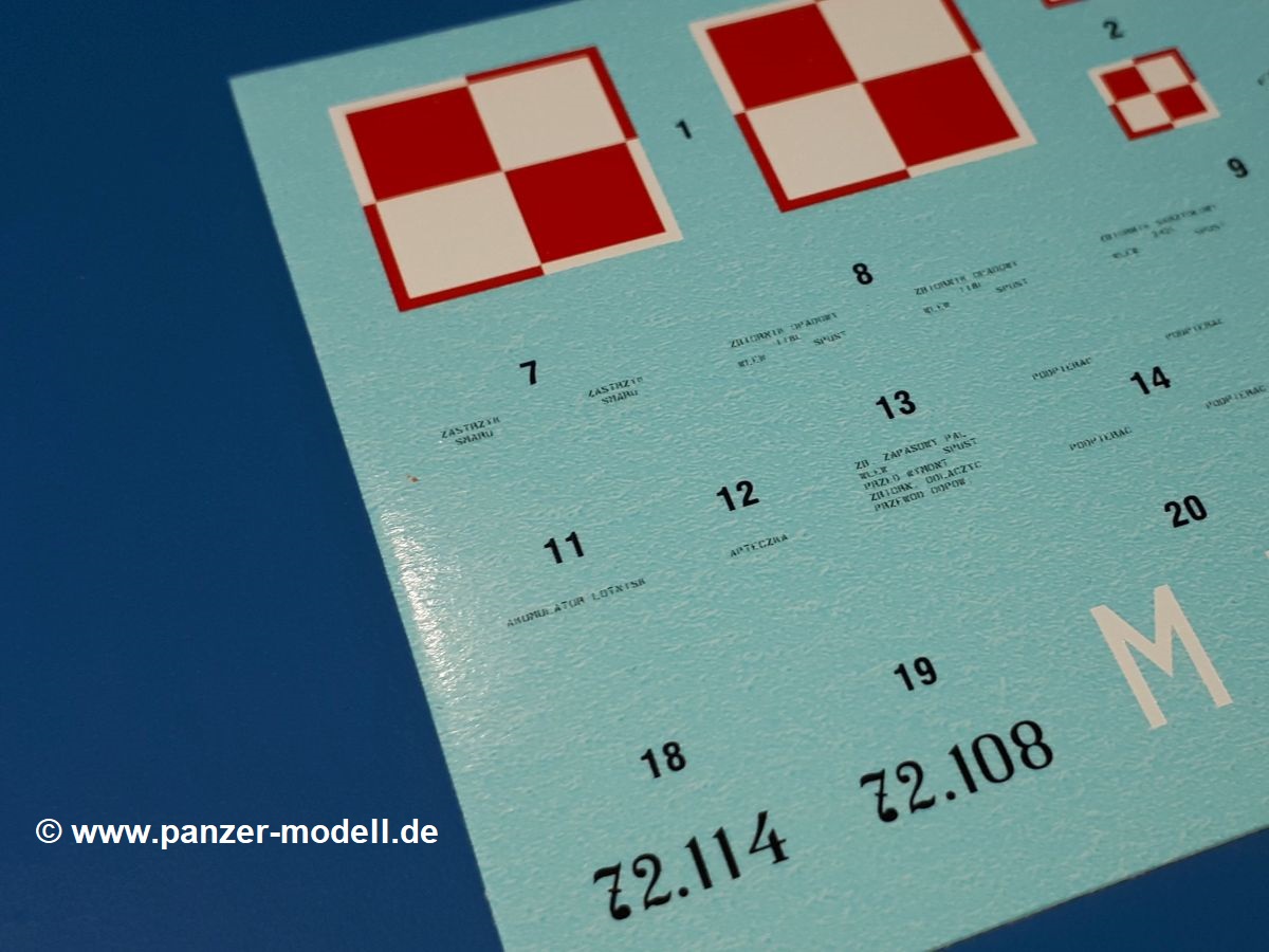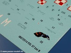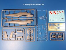 Man muss beachten, dass es auch Decals für den Innenraum gibt wie z.B. die Instrumententafel. Die Anbringung dieser Decals wird in den jeweiligen Bauschritten mittels auf der Spitze stehenden Dreiecken und der Decal-Nr. gezeigt.Die 12-seitige Bauanleitung im meist schwarz-weißen A4 Format enthält kurze Beschreibungen oder Anleitungen in Polnisch und in Englisch. Auf der ersten Seite finden wir die Angaben der Farbnummern für Vallejo Model Color, Hataka, Life Color, MR Hobby und AK Interactive, die PE-Platine und den Decalbogen. Die 2. Seite zeigt uns die Spritzlingübersicht. Auf 7 weiteren Seiten wird der Bau in 23 Schritten leicht verständlich gezeigt. Für die Anbringung der Wartungs-/Sicherheitshinweise (Decals) gibt es einen Extra-Seite. Die letzten beiden Seiten in Farbe geben Bemalungshinweise und zeigen die Anbringung der großen Decals.Der Preis liegt bei im deutschen Handel wie bei um die 23,00 EUR!