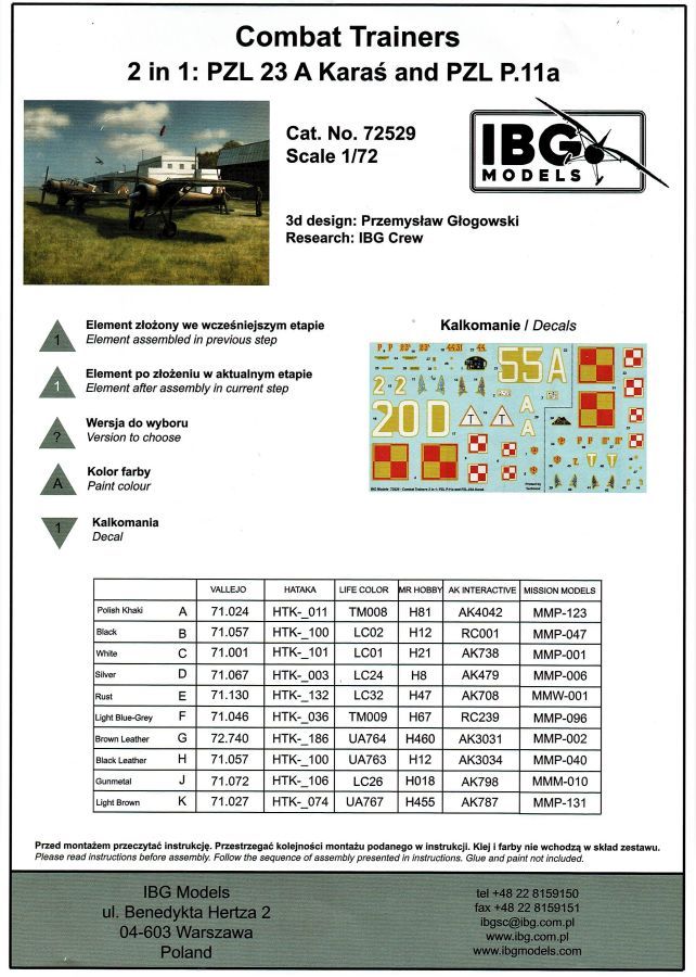 Die 12-seitige Bauanleitung im A4 Format ist in schwarz-weiß mit farbigen Akzenten gehalten. Kurze Beschreibungen oder Anleitungen sind in Polnisch und in Englisch gehalten. Auf der ersten Seite finden wir etwas zur Geschichte des Flugzeuges in Polnisch und in Englisch. Seite 2 zeigt uns die Teileübersicht, allerdings ist die Folie für die Cockpitfenster nicht aufgeführt. Zu Beginn von Seite 3 finden wir eine Bemalungstabelle mit Farbnummern für Valejo, Hataka, Life Color, Mr. Hobby, AK Interactive und Mission Models sowie ein paar Zeichenerklärungen. 14 Bauschritte führen einen zum fertigen Modell in sinnvoll aufgeteilten, leicht verständlichen Schritten mit ausreichend großen Zeichnungen. Einzelne Baugruppen, die in einem späteren Bauschritt verbaut werden, erhalten eine weiße Nummer in einem Dreieck. Bei Verwendung der Baugruppe erscheint das Dreieck wieder, dann in schwarzer Schrift. Am Ende der Bauschritte gibt es noch 1 Zeichnung des fertigen Modells in 3 Ansichten. Wieder einmal zwei Exoten die den Weg in die heimische Vitrine finden könnten. Bei dem Preis dürfte die Kaufentscheidung sicher leicht fallen