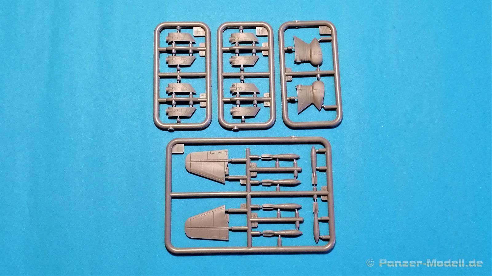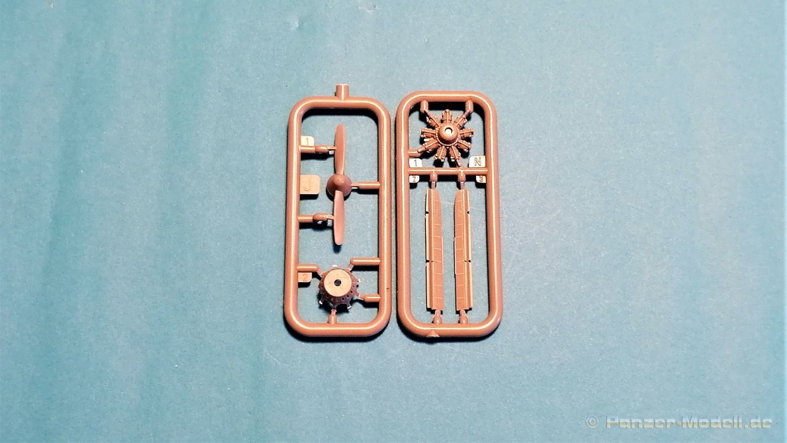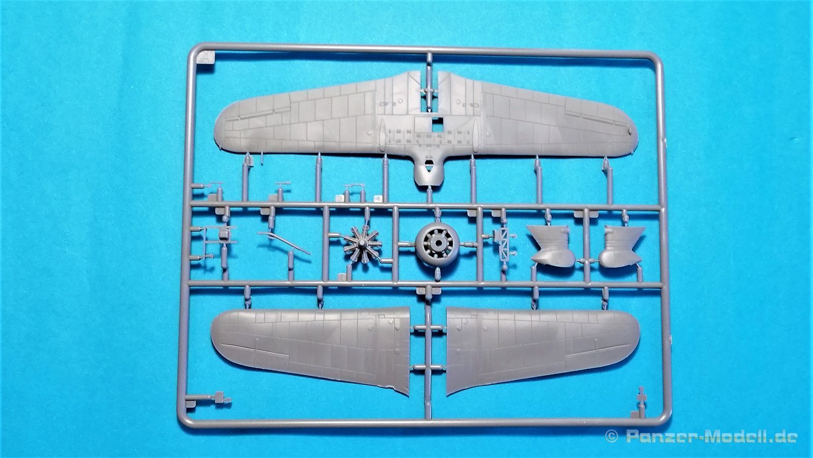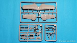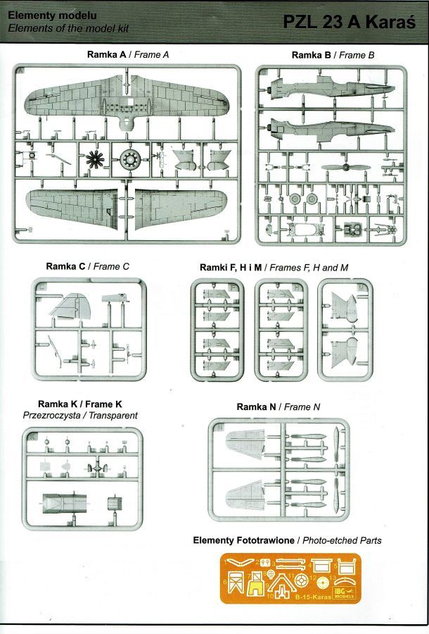 In der Stülpbox befinden sich insgesamt 15 Rahmen in mittelgrauem Plastik, zwei Rahmen mit Klarteilen, zwei Ätzplatinen und ein Decalsheet. Die Bauanleitung steht für beide Maschinen und ist in Heftform gehalten. PZL.23A Karas Der PZL.23A ist ein alter Bekannter, der bereits 2017 unter der Nr. 72507 zum ersten Mal aufgelegt wurde. Ein “Ausgepackt” dieses leichten Bombers findet sich im Archiv. Deswegen gibt es an dieser Stelle nur einen kurzen Abriß. Insgesamt macht dieser Bausatz immer noch einen sehr guten Eindruck. Der Guß ist einwandfrei mit sehr schönen und zum Teil extrem feinen Gravuren. Details sind ebenfalls einwandfrei ausgearbeitet. Die Angüsse sind sehr klein gehalten, dürften sich aber leicht entfernen und versäubern lassen. Absolut schlierenfrei sind die Klarteile, mit für meinen Geschmack etwas zu prominenten Verstrebungen. Für die Lackierung dürfte es aber von Vorteil sein. Die Bauanleitung führt in 13 Schritten (vollflächige Computergrafiken) zum fertigen Flugzeug. Die PE-Teile fallen teilweise sehr fein und filigran aus. Damit ist dieser Bausatz nicht unbedingt für Anfänger geeignet. Erfahrung im Umgang mit Pes ist hier gefragt. Zwei Bemalungsvorschläge sind aufgeführt:
