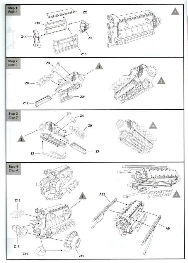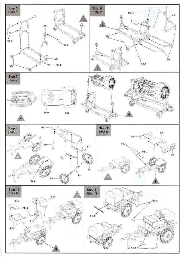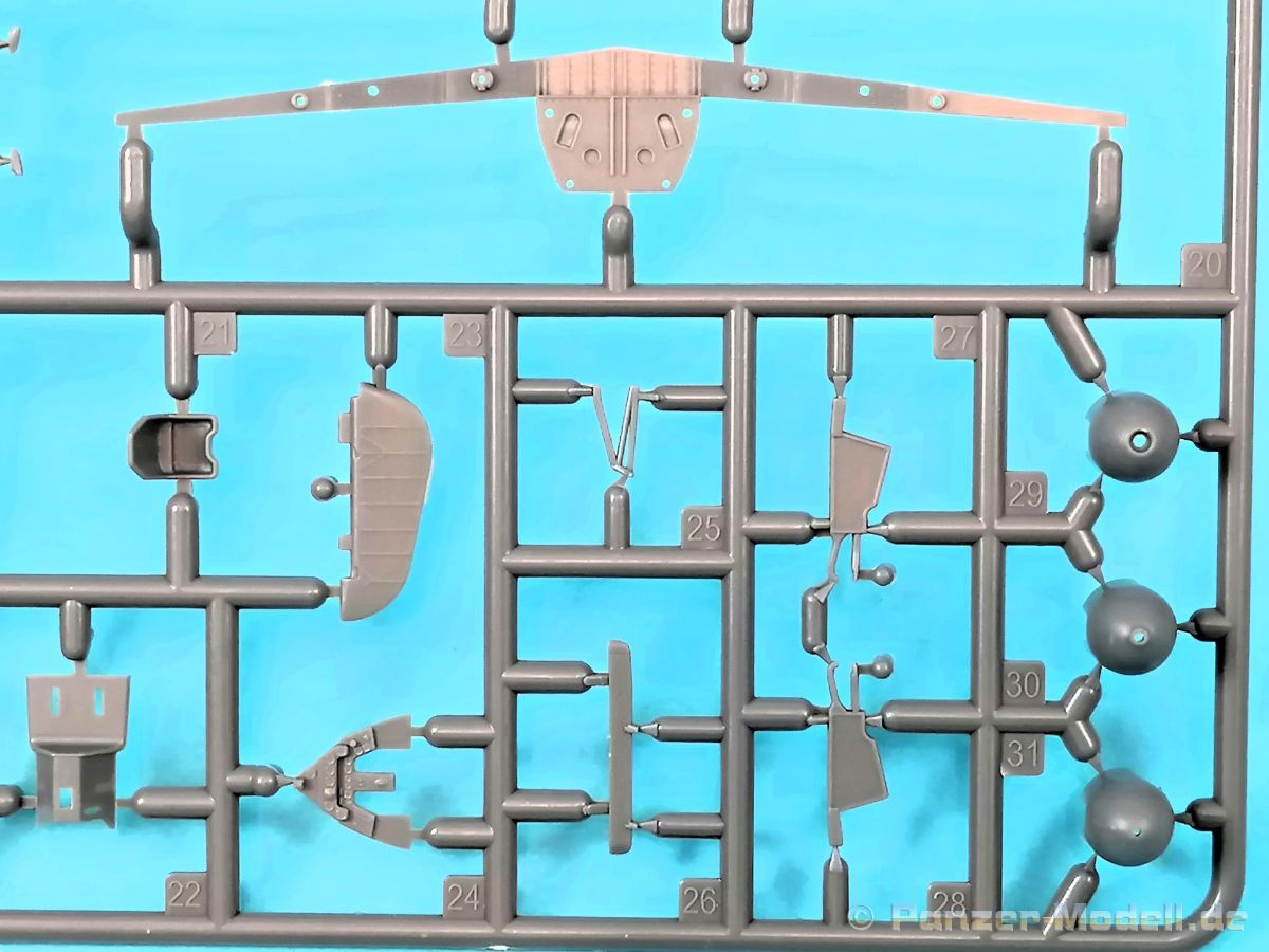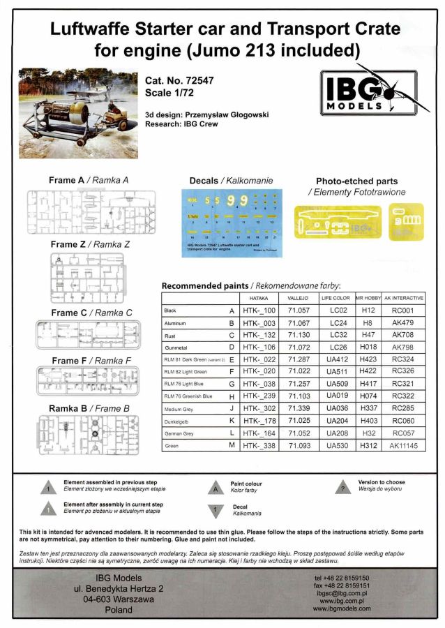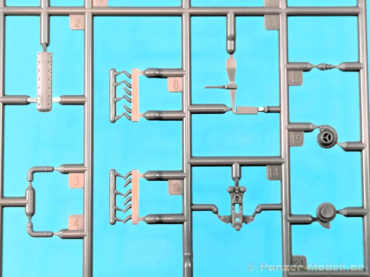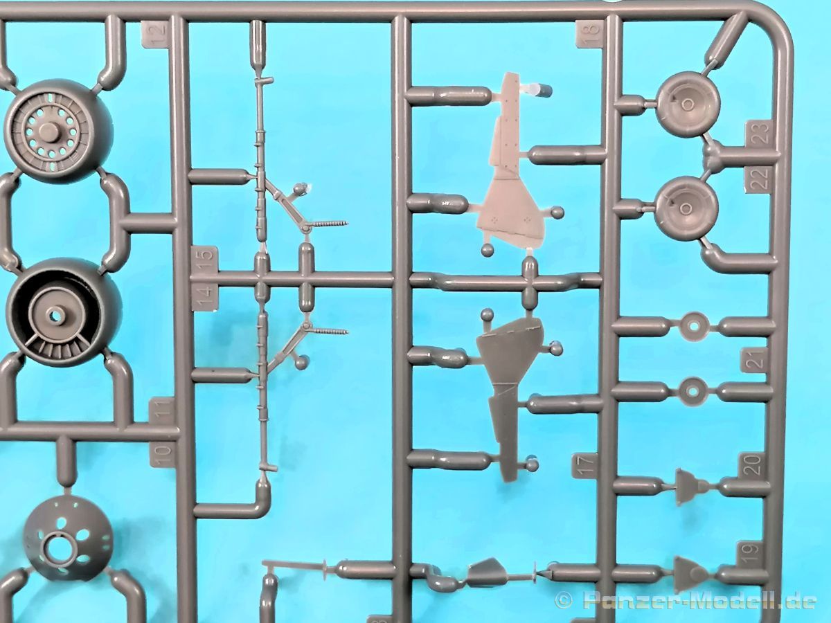 Erfreulich, wenn ein Hersteller nicht nur Flugzeuge im Modell herausbringt, sondern auch Zubehör für diesen Bereich in dem doch so einiges fehlt. IBG hat mit dem o.g. Kit etwas Abhilfe geschaffen. Gerade für Flugzeugbauer, die gerne ihre Exponate in einem kleinen Dio mit einer Wartungsszene präsentieren wollen dürfte das Gebotene durchaus willkommen sein. Der mittlerweile für IBG typische Top-Opener enthält fünf unterschiedlich große Spritzlinge, einen Decalbogen, zwei winzige PE-Platinen und die obligate Bauanleitung. Die Rahmen A, B und Z sind alte Bekannte und bereits in den Kits der Fw 190 enthalten. Allerdings beherbergen diese Spritzlinge alle notwendigen Teile zum Bau des “Jumo 213”. Der große Rest wandert in die Vorratskiste! Das Transportgestell wird mit den Teilen von Rahmen C realisiert und für den Bau des Starterwagens liegt der Rahmen F bei. Alle Rahmen mit den Bauteilen sind absolut sauber gespritzt. Versatz und/oder Grat ist nicht vorhanden. Auch Formtrennnähte konnte ich nur minimal an wenigen Stellen ausmachen. Die Angüsse sind geschickt auf den Rahmen gesetzt und die Teile weisen einen trotz ihrer Filigranität sehr hohen und scharfen Detaillierungsgrad auf. Spritzguß vom Feinsten; eigentlich wie gewohnt von IBG. Die Bauanleitung im A4 Format ist in schwarz-weiß mit farbigen Akzenten gehalten und umfasst lediglich vier Seiten. Auf der ersten Seite sind die Rahmen, die Decals und die PEs gelistet. Dazu die recht umfangreichen Farbtabellen von Hataka, Vallejo, Life Color, Mr. Hobby und AK Interactive. Auch einige Piktogramme finden wir hier. Auf Seite zwei ist der Bau des Jägermotors in vier Schritten dokumentiert und findet seinen Abschluß in der Montage der Motorträger. Zwei weitere Schritte sind dem Transportgestell, mit einigen PEs veredelt, gewidmet, nach dessen Zusammenbau der Motor problemlos eingesetzt werden kann. Schlußendlich kommt noch der Starterwagen zum Zuge, dessen Bau sich über weitere vier Schritte erstreckt. Den gesamten Raum der vierten Seite nehmen Bemalungshinweise des LW-Zubehörs ein. Bei der Genauigkeit der Anleitung sollten auch keine Fragen auftreten. Ein kleines, schönes Set mit Potential. Auch das Preis/Leistungsverhältnis geht in Ordnung.