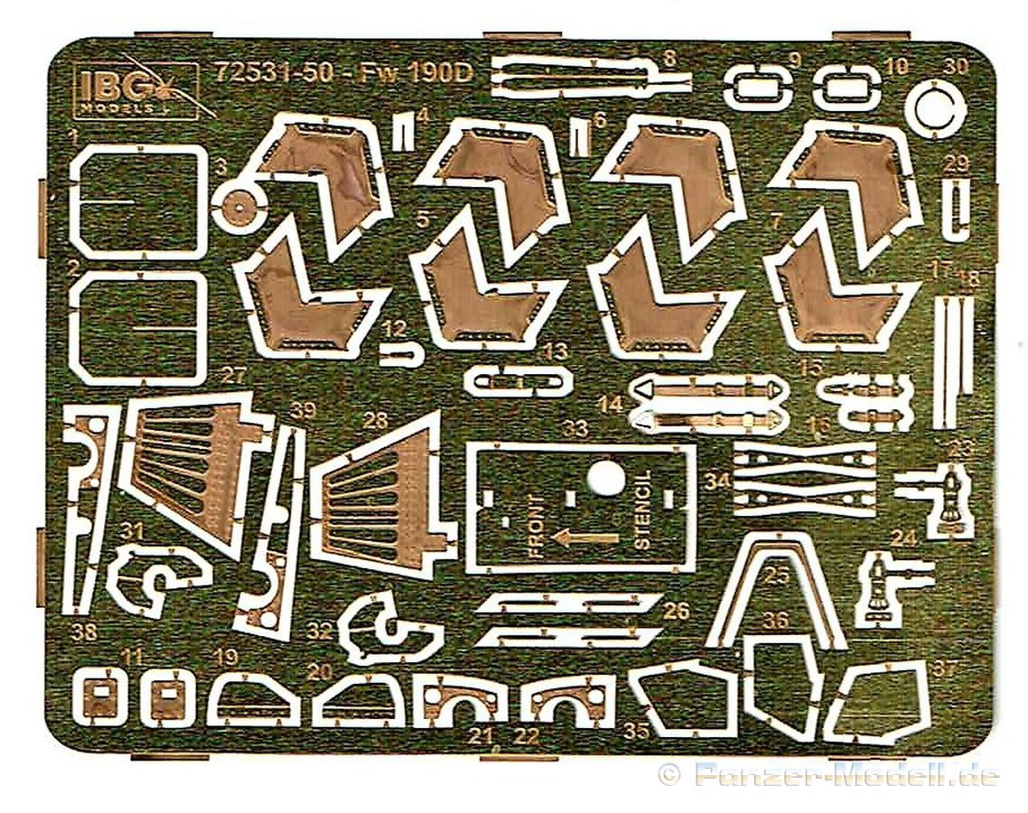 Der Jagdverband 44 (JV 44) war eine Jagdfliegereinheit die mit Me 262 ausgerüstet war und vom Februar bis zum April 1945 elf Wochen lang bestand. In den Phasen des Starts und der Landung waren die Turbos triebwerksbedingt schwerfällig und dadurch äußerst verwundbar. Diesen Umstand machten sich alliierte Jäger gerne zu nutze und fingen die Strahlflugzeuge in diesen Phasen gerne ab. Abhilfe sollte die Platzschutzstaffel JV 44 schaffen. Kurz vor dem Start der Me 262 sollte der Platzschutz starten und den Luftraum um den Fliegerhorst von feindlichen Jagdfliegern säubern. Unter dem Schwarmführer Leutnant Heinz Sachsenberg entstand der sogenannte „Sachsenbergschwarm“ (später auch „Papageistaffel“. Ausgenommen die Rote 2.). Alle Piloten wurden seinerzeit von Generalleutnant Adolf Galland persönlich für die Platzschutzstaffel ausgewählt. Geflogen wurde mit Fw 190 D-9 (drei) und Fw D-11 (zwei). Um nicht irrtümlich von der eigenen Flak beschossen zu werden erhielten die Fws einen ganzflächigen Unterbodenanstrich in Rot mit weißen Streifen durch die Wartungsmannschaften. Auffällig waren auch die Embleme und Sprüche mit denen die Maschinen versehen waren. Dazu aber w.u. mehr. Liegeplätze waren München-Riem und später Ainring in Oberbayern. Werfen wir zunächst einen Blick in den Karton mit Stülpdeckel. Dieser enthält 17 Rahmen in einem hellgrauen Material. Neun davon entfallen auf eine D-9 und weitere acht auf eine D-11 die uns erstmals als Bausatz vorliegt. Dazu kommen zwei identische PE-Platinen, sehr umfangreiche Decals und die obligate Bauanleitung. Nicht zu vergessen die absolut klaren unterschiedlich ausgeformten Kanzeln. Alle Rahmen mit den Bauteilen sind absolut sauber gespritzt. Versatz und/oder Grat ist nicht vorhanden. Die Angüsse sind geschickt auf den Rahmen gesetzt und die Teile weisen einen sehr hohen und scharfen Detaillierungsgrad auf. IBG hat sich auch die Mühe gemacht alle Unterschiede der Jäger darzustellen. Die Spritzlinge A, B, Z und Y sind für beide Maschinen identisch. Ersetzt wurden bei der D-11 Spritzling E durch G (Rumpfhälften), J durch M (Flügeloberseiten) K durch N (Flügel- und Rumpfunterseiten, Propeller) und S und R durch T (Motorhauben). In direktem Vergleich sind die Änderungen sehr gut zu erkennen. Im Bildteil sind im zweiten Block nur die für eine D-11 geänderten Teile fotografisch festgehalten. Fangen wir doch mal bei dem Triebwerk an. Für diesen Maßstab ist der Jumo 213A-1 recht schön wiedergegeben. Es sind einige, teils winzige Aggregate zu verbauen bis man den Motor mit den Motorträgern verbinden kann. Sehr schön gemacht und umgesetzt. Detailfanatiker werden sich hier sicher auch noch austoben… Leider verschwindet fast alles unter der ebenfalls toll gemachten Motorabdeckung und eine Option diese offen darzustellen gibt es nicht. Das Cockpit ist ebenfalls gut und ausreichend gestaltet und besitzt die nötige Ausstattung incl. dem Gurtzeug für den Piloten. Die Gerätebretter und Seitenkonsolen können sowohl mit dem Pinsel bemalt oder aber mit Decals belegt werden. Jeder nach seinem Gusto. Ein paar Ätzteile werten den Führerraum weiter Allerdings zeigt sich der Motor später durch die Öffnungen in den Fahrwerksschächten. Auch in diesem Fall hat IBG gute Recherchearbeit betrieben. Rumpf und Tragflächen sind mit einer Unzahl von fein ausgeführten Panellinien und Nietenreihen überzogen. Für manche etwas irritierend, aber es gibt genügend Fotos auf denen diese Details deutlich zu sehen sind. Top umgesetzt. Sehr schöne Idee ist auch der Spant, der vor dem Cockpitbereich eingebaut wird. Dieser wird bei dem späteren Einbau der Tragflächen eine große Hilfe sein da die Flächen dann im richtigen Winkel zum Rumpf liegen. Leider ist das Pitotrohr am rechten oberen Flügel mit angegossen. Lieber abtrennen und erst am Ende des Baus wieder ankleben. Für die Komplettierung der Radschächte kommen weitere Ätzteile zum Einsatz. Diverse Ruderflächen sind einzeln beigelegt und können in der vom Modellbauer gewünschten Stellung fixiert werden. Stifte für die Kontrolle eines ausgefahrenen Fahrwerks sind ebenfalls vorhanden und auf der Oberseite der Tragflächen einzubauen. Ein Detail das immer wieder bei anderen Kits vernachlässigt wurde. Punkten kann auch das gesamte Fahrwerk und wenn ich mich nicht täusche sind die Reifen dezent abgeplattet. Lediglich Bremsleitungen können ergänzt werden. Die Kanzel/n ist/sind schlierenfrei, angenehm dünn gespritzt und werden mit einer Kopfstütze sowie einer Strebe komplettiert. Die Klarheit ist bei allen mitgelieferten Kanzeln sehr gut. Durch die Feinheit der Teile sollte einer Lackierung mit dem Airbrush der Vorzug gegeben werden. Bei einer Pinselbemalung besteht eventuell die Gefahr zu viele Details in Farbe zu ersticken. Die Bauanleitung im A4 Format ist in schwarz-weiß mit farbigen Akzenten gehalten. Kurze Beschreibungen oder Anleitungen sind in Polnisch und in Englisch. Auf der ersten Seite finden wir etwas zur Geschichte des Flugzeuges in allgemeiner Form und auf Seite drei und vier die Teileübersicht. Auf Seite zwei die übliche Bemalungstabelle mit Farbnummern für Valejo, Hataka, Life Color, Mr. Hobby und AK Interactive sowie die Abbildungen der Decals. Insgesamt 22 Abschnitte sind für die D-9 vorgesehen, während die D-11 mit 20 auskommt. Alle Bauschritte führen einen zum fertigen Modell in sinnvoll aufgeteilten, leicht verständlichen Schritten mit ausreichend großen Zeichnungen und Farbangaben wo notwendig. Optionale Teile sind in der Anleitung in den jeweiligen Abschnitten mit angeführt. Einzelne Baugruppen, die in einem späteren Bauschritt verbaut werden, erhalten eine weiße Nummer in einem Dreieck. Bei Verwendung der Baugruppe erscheint das Dreieck wieder, dann in schwarzer Schrift. Dreiecke mit der Spitze nach unten verweisen auf Decals. Am Ende der Baus gibt es noch eine Zeichnung des fertigen Modells aus drei Blickwinkeln; mit offener oder geschlosse