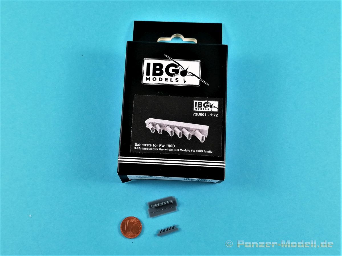 Mit der Nummer 72U001 (Exhausts for Fw 190D) gibt es zur weiteren Verfeinerung der ohnehin schon schönen Fw 190er Modelle eine komplett im 3D Druck hergestellte Auspuffanlage. Alles gut verpackt in einer geräumigen Standardschachtel. Die Abgasanlage ist absolut fehlerfrei gedruckt. Hervorstechend sind die offenen Auspuffstutzen, die im Spritzguß so nicht dargestellt werden können. Der Zurüstsatz kann absolut überzeugen. Verwendbar für alle Modelle, die diese durchaus sichtbar aufwerten. Ein Bauplan liegt nicht bei, da lediglich die Teile des Kits ersetzt werden. Klein, aber fein! Sehr empfehlenswert!